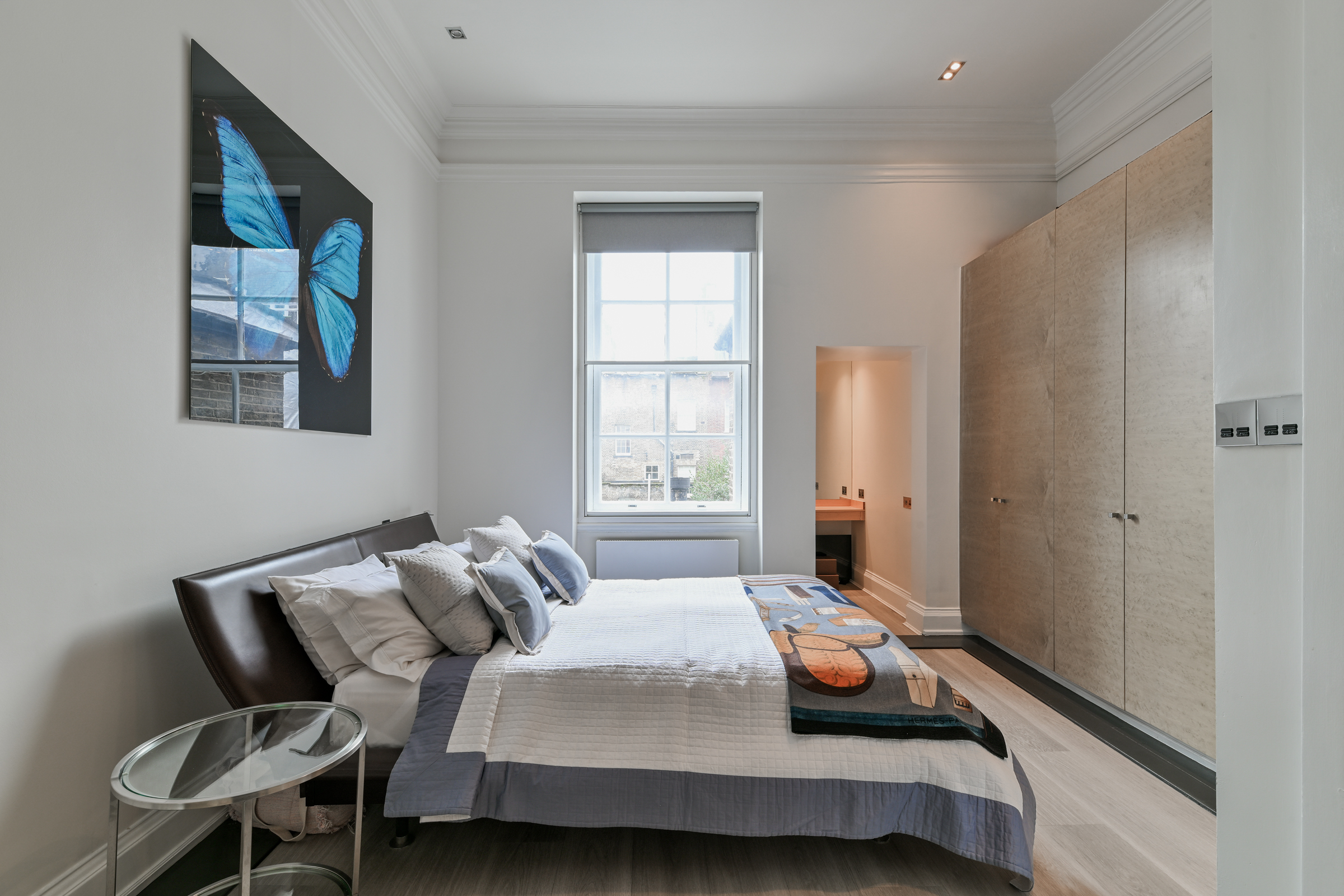 The principal bedroom sits quietly to the rear of the apartment and is generous in scale, with built-in storage running along one wall. It is served by a large bathroom finished in a crisp contemporary style, with both a bath and separate shower. The second room is currently arranged as a study or guest bedroom and opens directly onto the flat roof, which provides an unexpected additional outdoor aspect and a pleasing sense of flexibility.