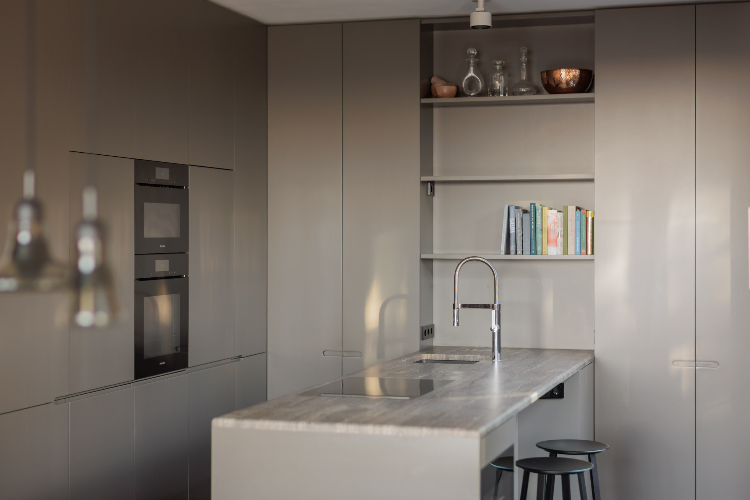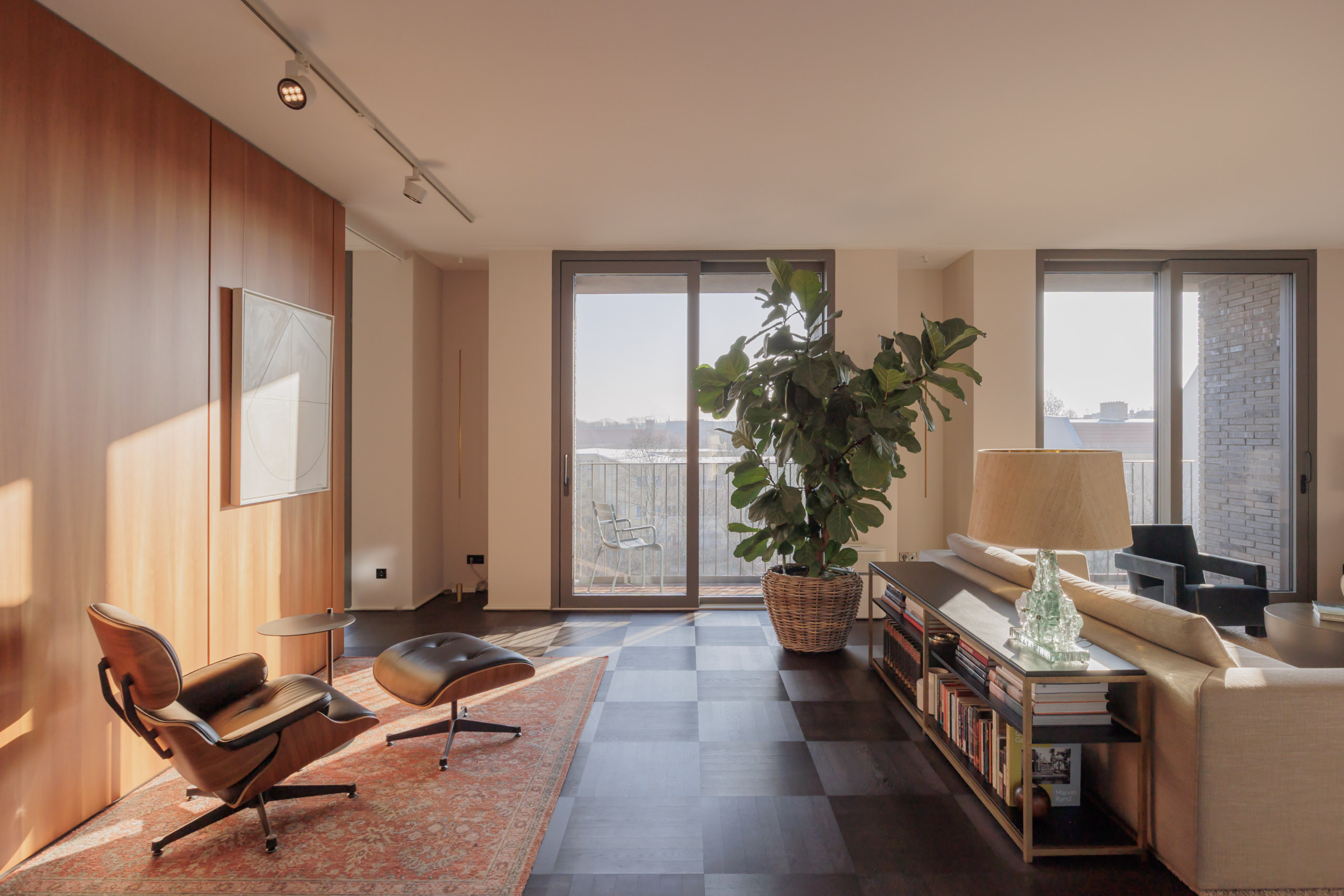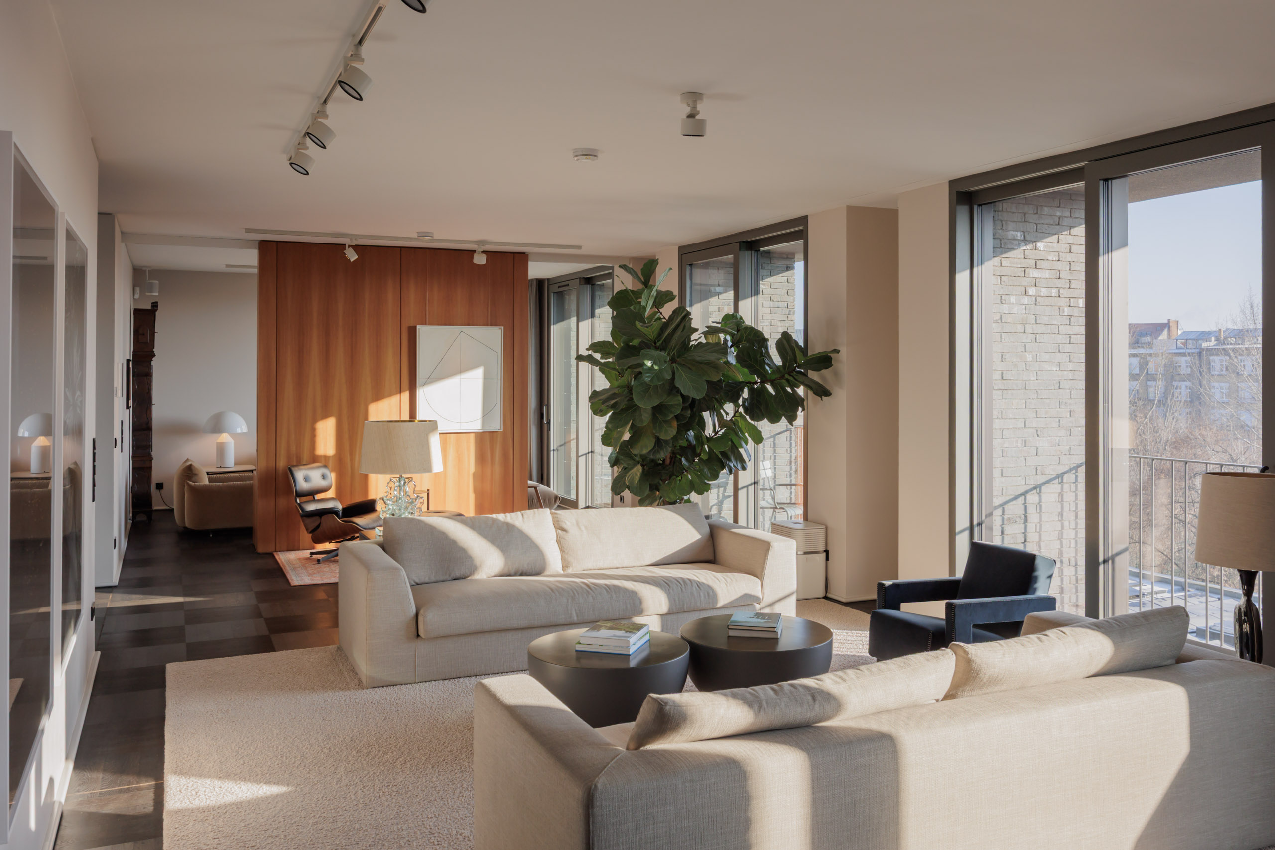 Seven balconies extend the living space outdoors and offer a variety of orientations, allowing for different light conditions throughout the day as well as open views across the city, including towards the Berlin TV Tower. Carefully selected materials — including custom woodwork, natural stone, and bespoke built-ins — give the apartment a consistent design language and a calm, timeless elegance.