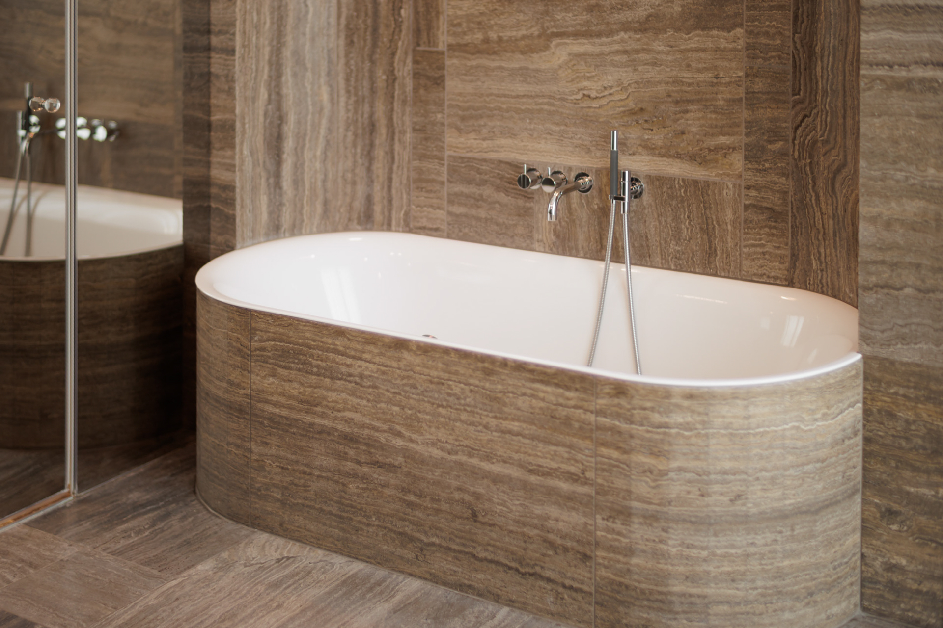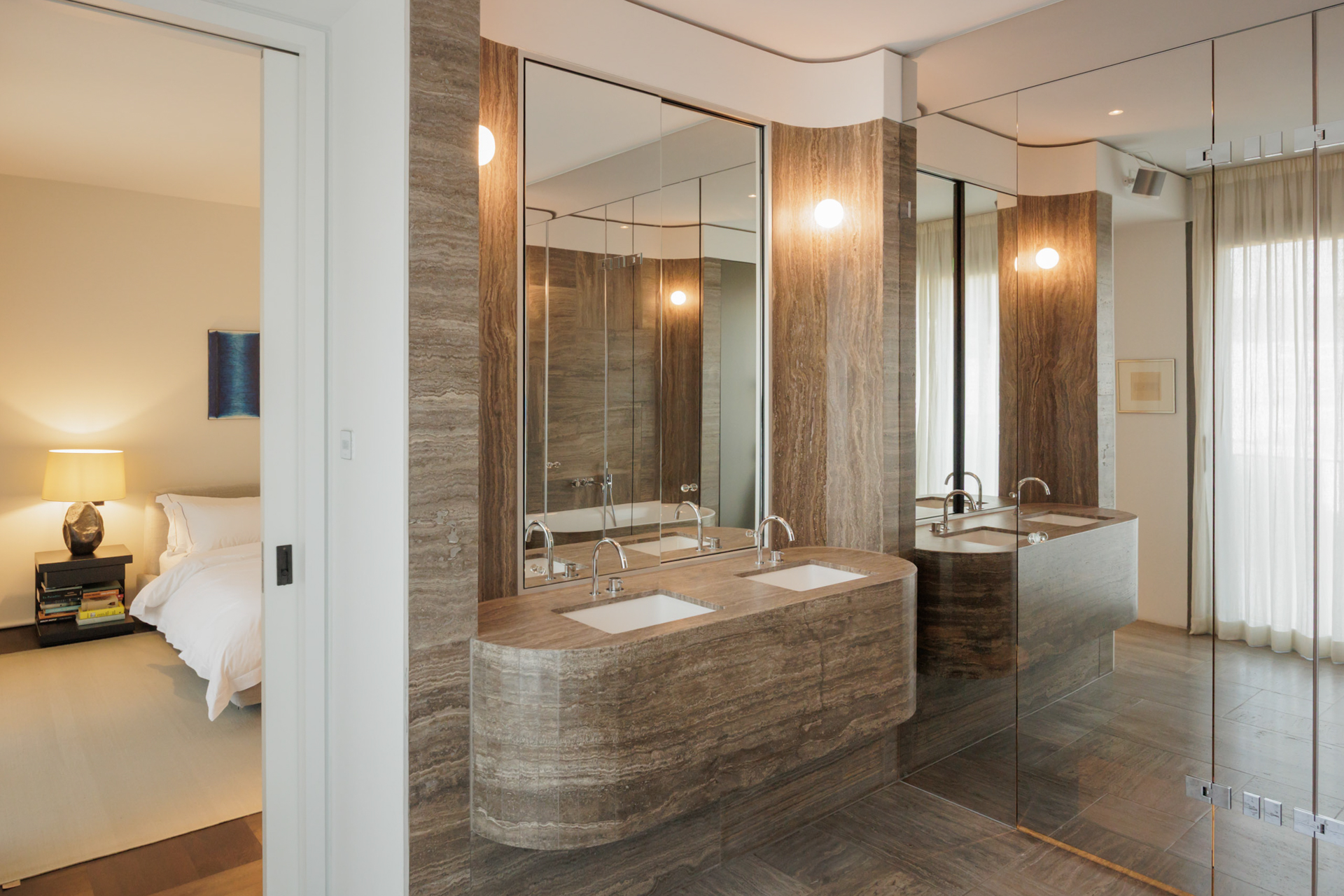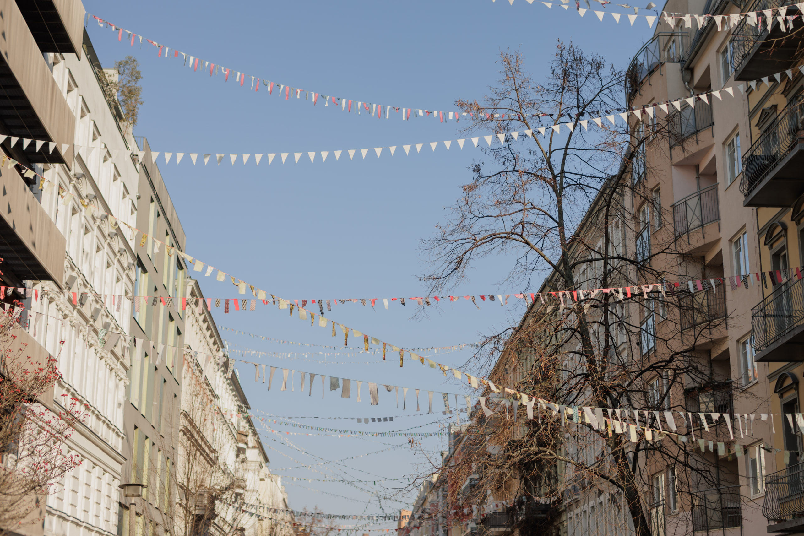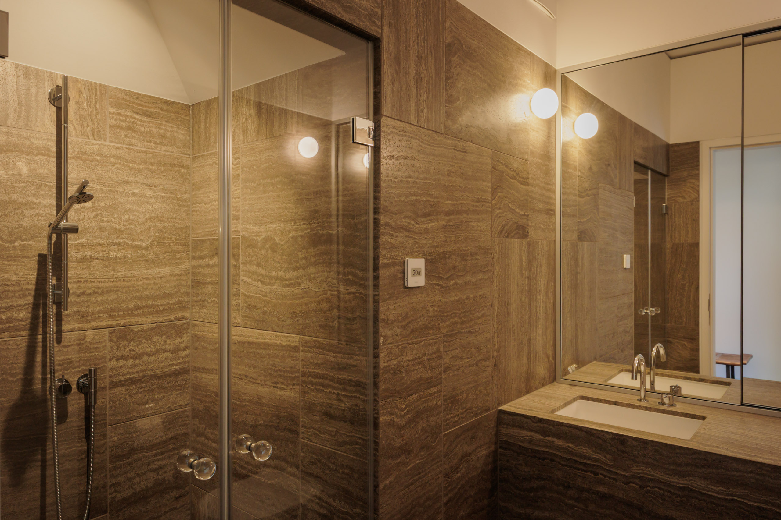 Seven balconies extend the living space outdoors and offer a variety of orientations, allowing for different light conditions throughout the day as well as open views across the city, including towards the Berlin TV Tower. Carefully selected materials — including custom woodwork, natural stone, and bespoke built-ins — give the apartment a consistent design language and a calm, timeless elegance.