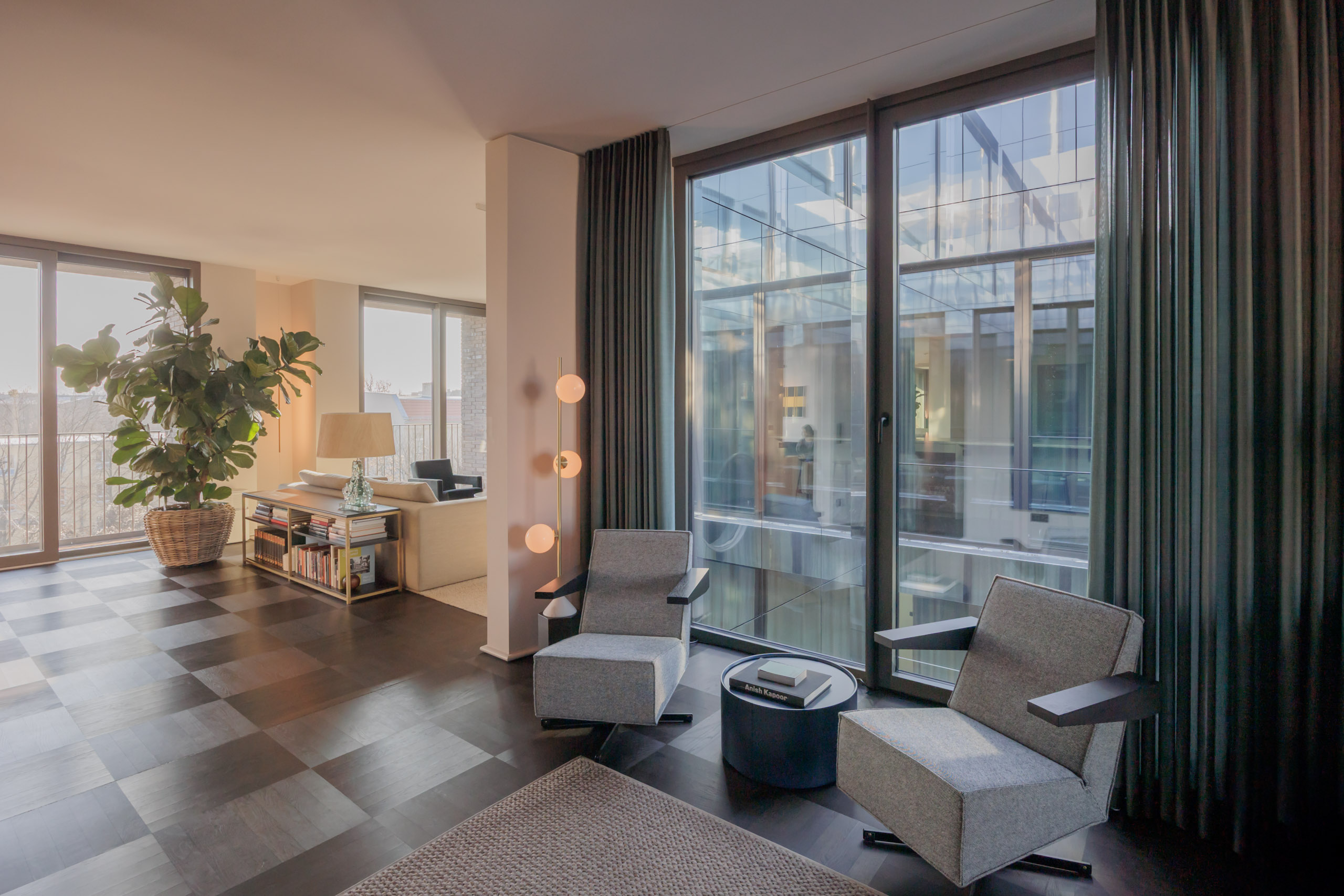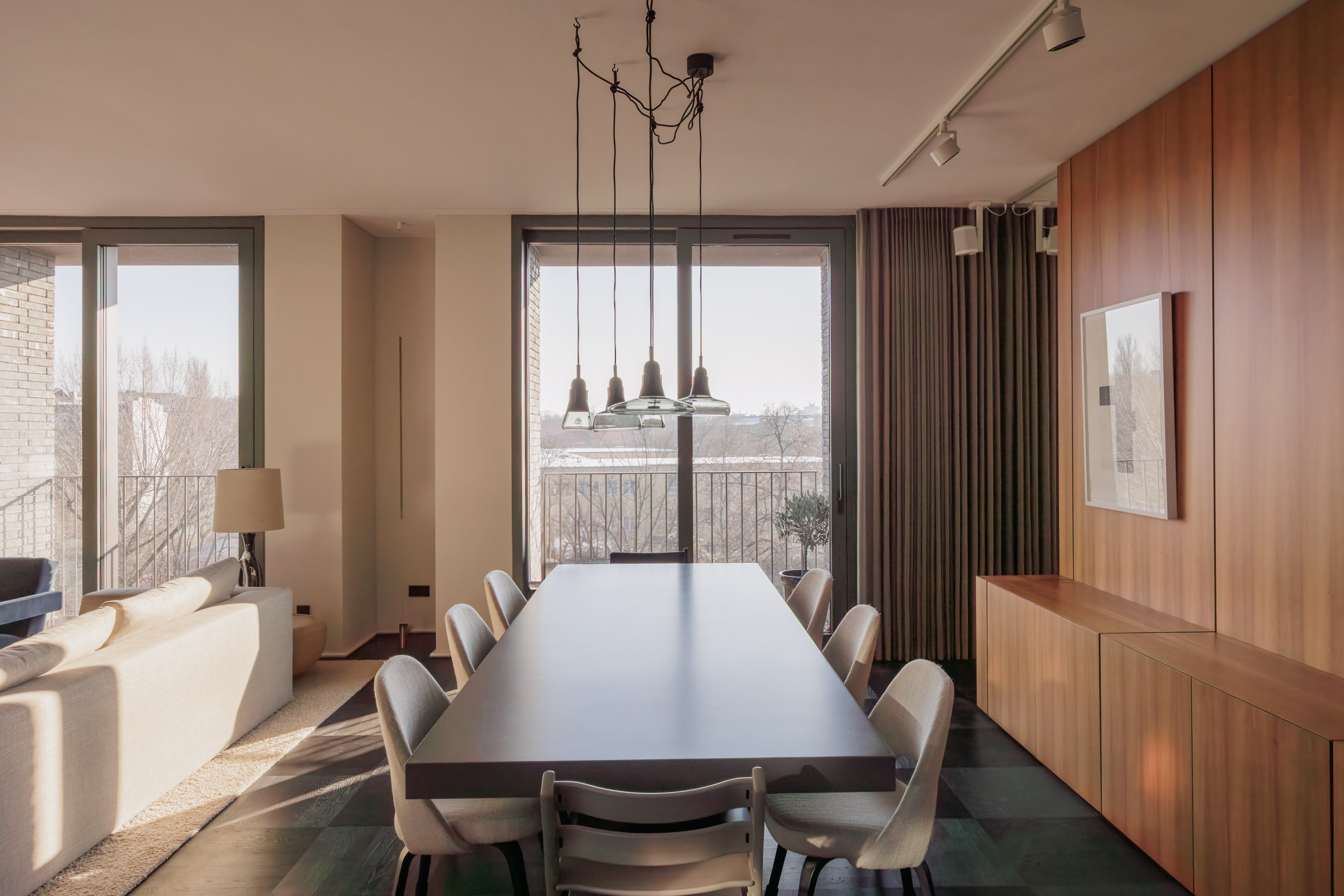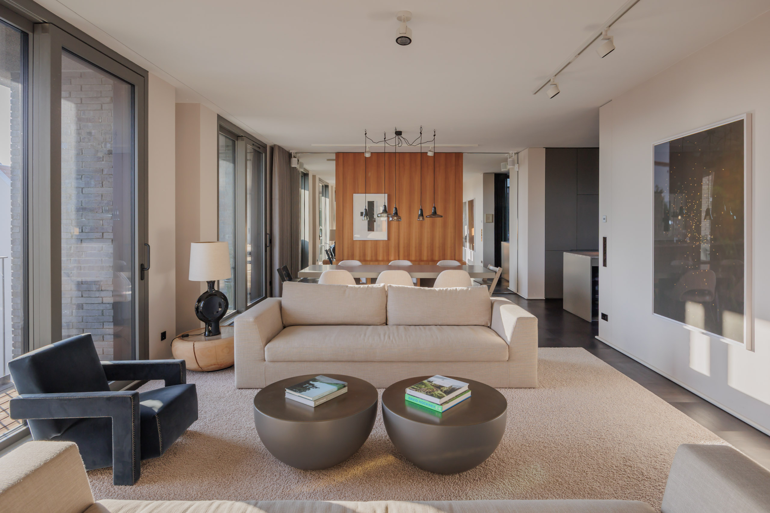 The spacious living and dining area forms the center of the home, with fluid transitions between the different zones. Large windows on both sides of the apartment provide exceptional natural light throughout the day and create a bright and open atmosphere. The custom-made kitchen with high-end appliances and a central island serves as the social heart of the space and integrates seamlessly into the overall architectural concept.