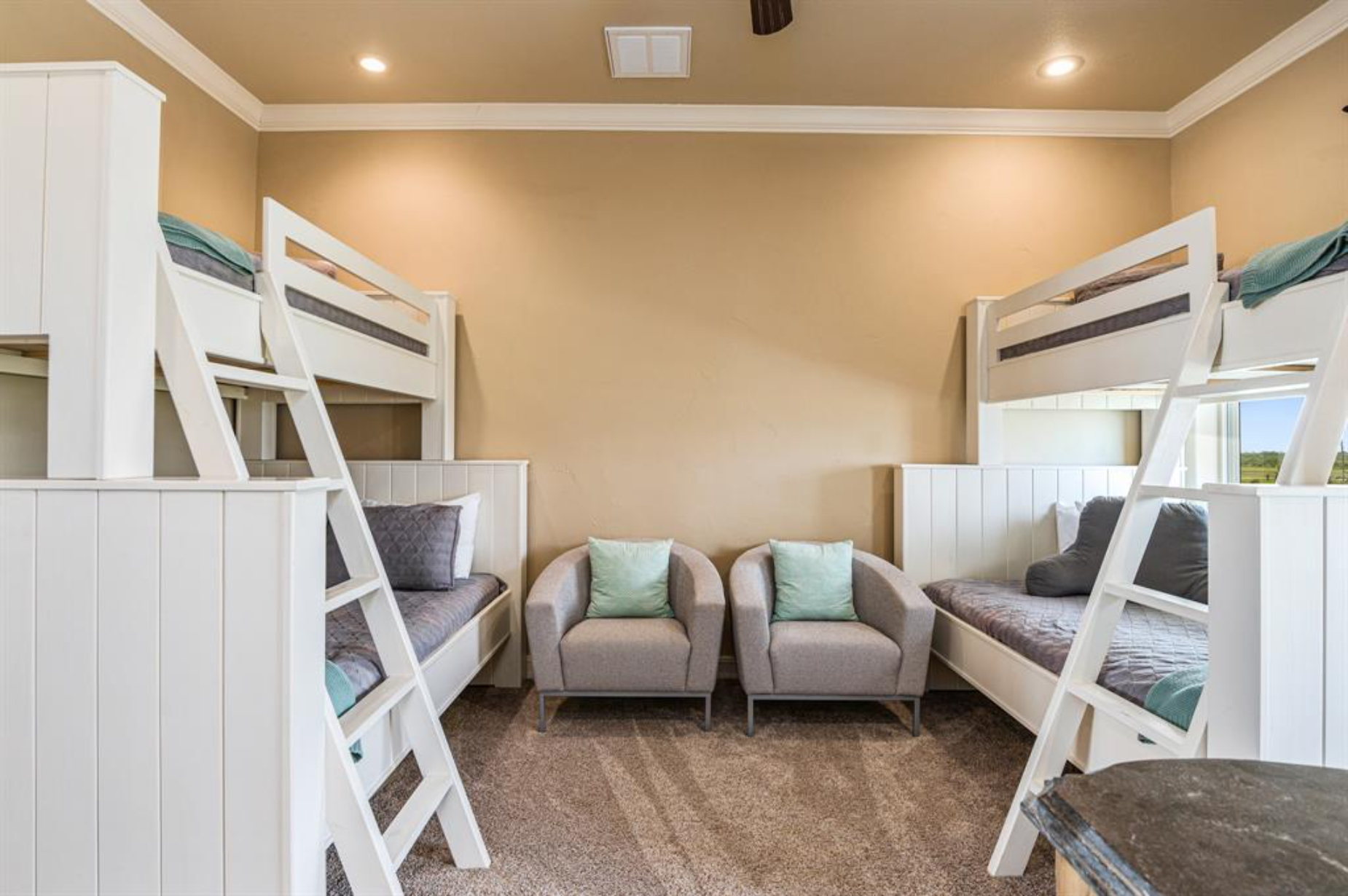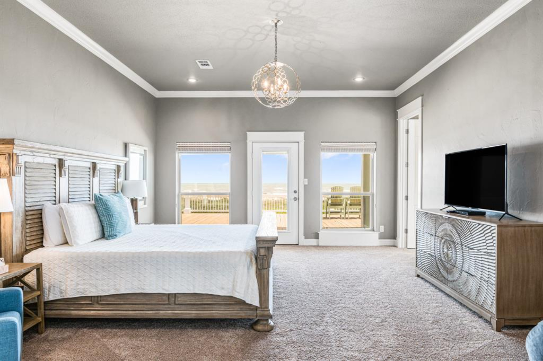 Gorgeous waterfront estate overlooking the Gulf of Mexico, set on 166+ feet of pristine beach frontage. Wake up to breathtaking sunrises and sweeping panoramic ocean views from your expansive beachfront deck, an ideal setting for morning coffee or evening gatherings. Nestled within the gated community of Rancho Carribe in Crystal Beach, this private coastal retreat offers the ultimate in luxury and relaxation. Step inside to a grand entryway that opens into a spacious living area, where walls of windows frame endless views of the waves and fill the home with natural light. Soaring ceilings, elegant fixtures, and a soft, neutral palette create a refined yet inviting atmosphere. The home features four generously sized bedrooms, each with its own bathroom, comfortably accommodating up to 16 guests, perfect for hosting family and friends. Designed for both everyday living and entertaining, the property includes whole-home audio and lighting control, automatic roll-down shutters, a cozy gas fireplace, and outdoor stadium lighting. High-impact windows, a large underground propane tank, and a full alarm system provide added peace of mind.
