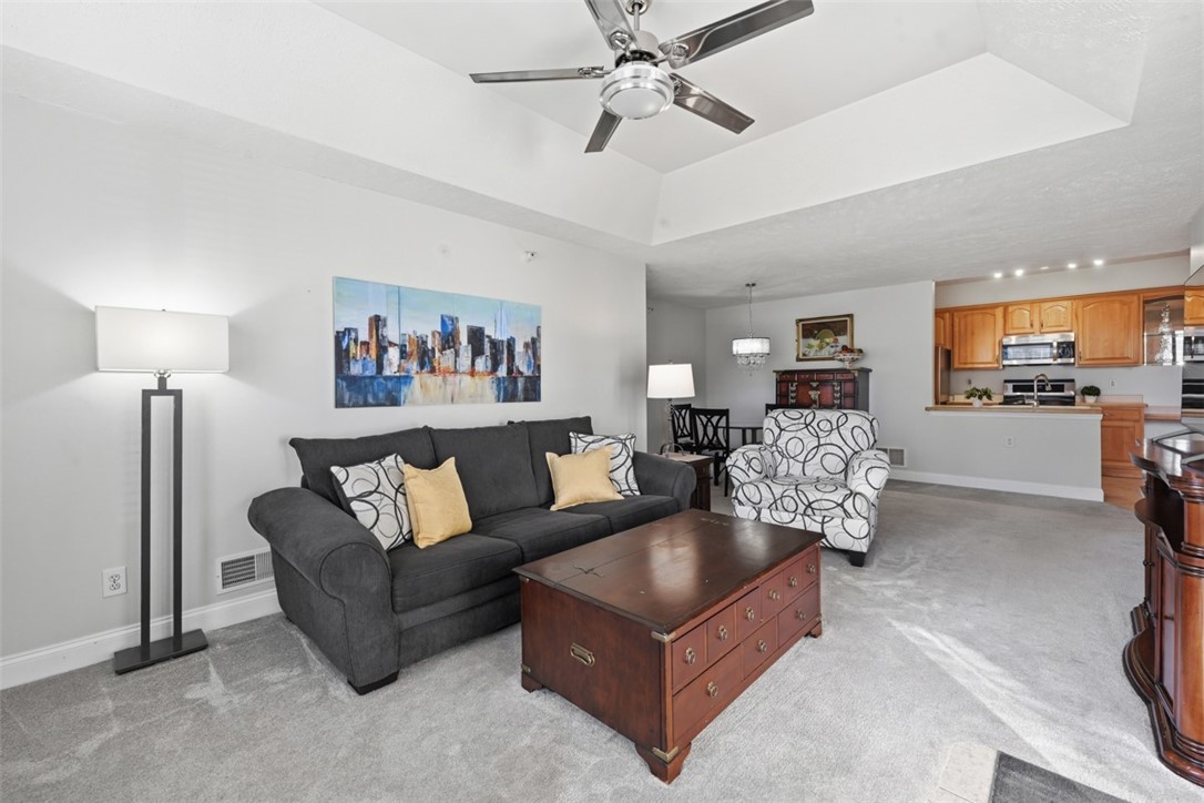 Low-maintenance living at its best! This ground-level condo offers a bright, open layout featuring a tray ceiling and large window that fills the main living space with natural light. The living room flows seamlessly into the dining area and galley-style kitchen, creating an ideal setup for everyday living and entertaining. A full laundry room adds extra convenience. The generously sized bedroom and full bath with a new walk-in shower provide comfort and functionality. Enjoy fresh air and relaxation on the semi-covered porch just outside your door. Major updates include a furnace (2019), washer (2024), and dishwasher (2025). Perfectly situated with quick access to I-79, making commuting a breeze, while shopping, dining, and entertainment are just minutes away. Take advantage of the fantastic Adams Pointe community amenities, including a pool, fitness center, theater, basketball courts, walking trails, and more!