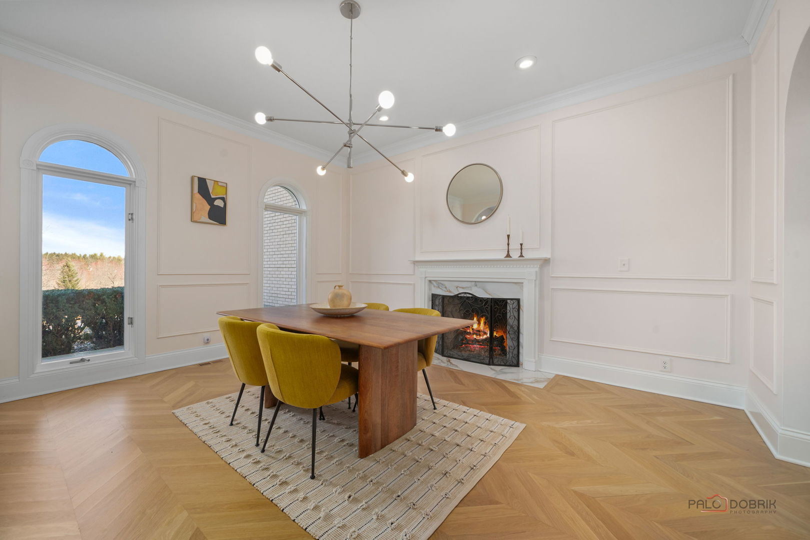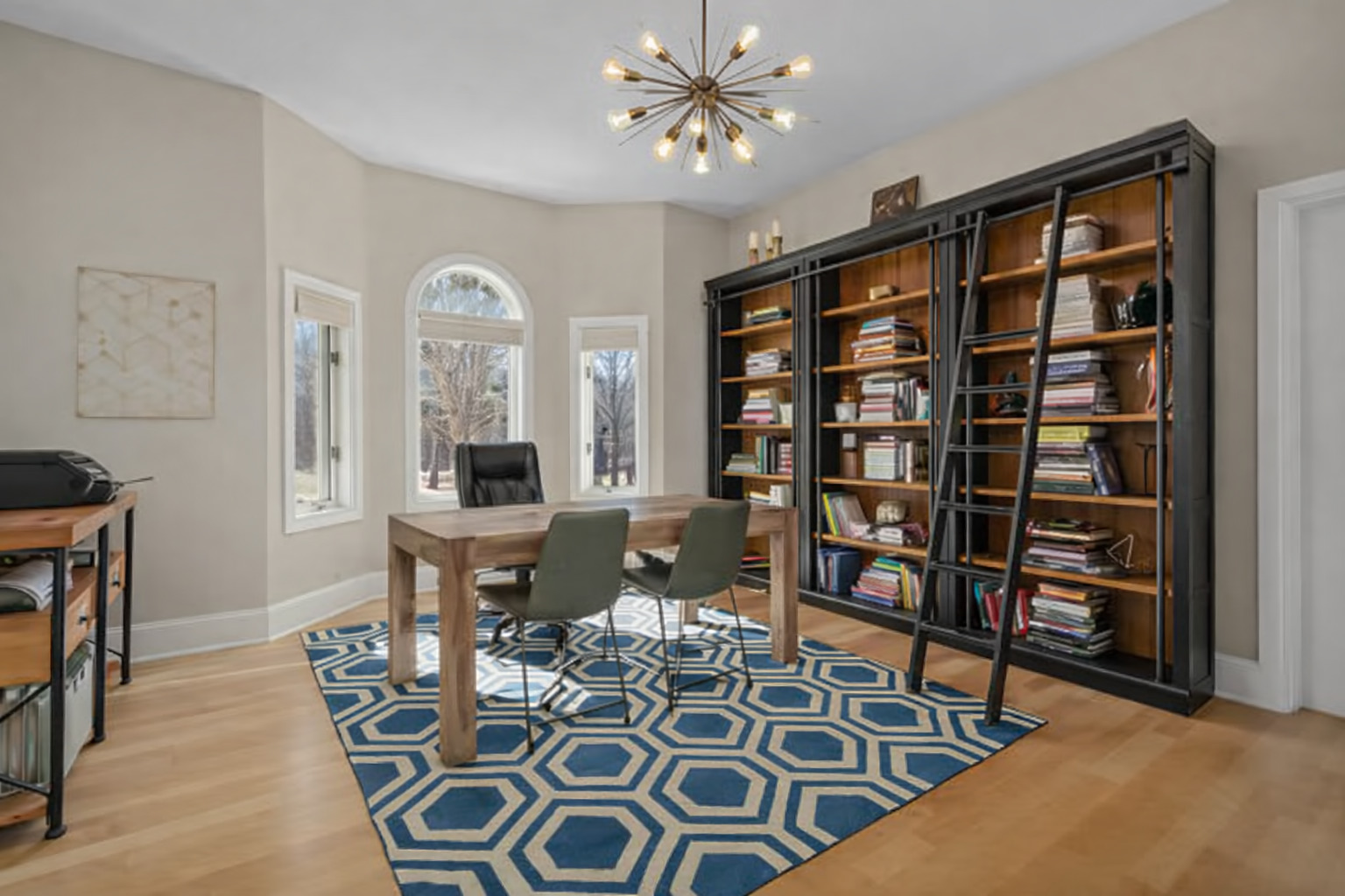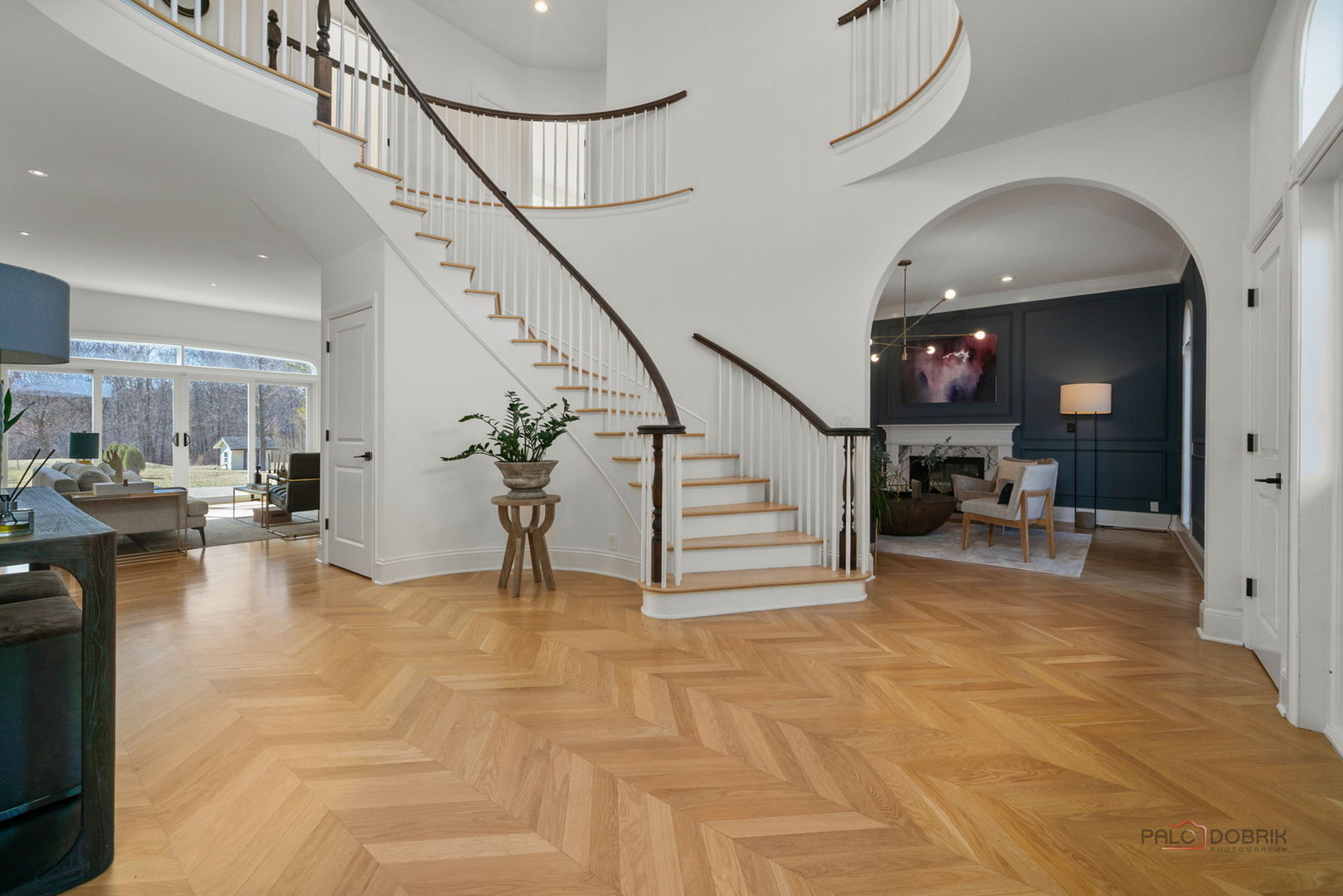 This elegant two-story brick residence offers approximately 6,800 square feet of refined living space and was comprehensively renovated in 2021. Set on 37.5 acres, the property is approached by a winding, tree-lined drive extending from a private gated entrance to the home. Three ponds enhance the picturesque setting and provide tranquil views throughout the grounds. Upon entry, a grand two-story foyer with a sweeping circular staircase creates a striking first impression. Oak flooring extends throughout both the first and second levels. Flanking the foyer, the formal living room features paneled walls, crown molding, and a marble-hearth, two-sided fireplace. Opposite, the dining room also showcases a marble fireplace and connects to the kitchen via a butler's pantry. The kitchen is both functional and well-appointed, featuring contemporary white and blue cabinetry, stainless steel appliances, and quartz countertops with a waterfall-edge island and matching backsplash. An octagonal breakfast room with arched windows surrounds the space with natural light. Adjacent to the kitchen, a spacious mudroom with built-in cabinetry leads to the laundry room and attached three-car garage. Through an arched opening, the family room offers expansive windows and a sliding glass door leading to a concrete aggregate patio overlooking the grounds. A private home office with a bay window is located just beyond. A notable feature on the main level is the children's playroom, situated next to a first-floor bedroom with an en-suite bath. This flexible space may serve as a primary suite, guest accommodations, or an in-law arrangement. The second level includes three additional bedrooms. The primary suite features a fireplace and private access to a catwalk leading to a balcony with views of the ponds. The catwalk continues to a secondary bedroom, ideal for use as a nursery. The primary bath is appointed with terrazzo tile flooring, a walk-in shower with a frameless glass enclosure, a walnut vanity with a granite countertop and dual vessel sinks, and a freestanding tub positioned beneath a window. The remaining bedrooms share a generously sized hall bath, complete with dual vanities, a walk-in shower with a frameless glass enclosure, and a freestanding tub. The lower level is thoughtfully divided into two distinct areas. One side is designed for recreation and entertaining, offering a large space suitable for a billiards room or home theater, along with French doors leading to a wine cellar with built-in storage. The opposite side features a private apartment with its own entrance, including a living room, kitchen, bedroom, office, bathroom, and laundry area. This space is well-suited for an in-law arrangement, guests, nanny suite, or potential rental use, with direct access to a covered carport beneath the main-level deck. There is a pole barn on the property, ideal for a workshop, vehicle storage, or potential equestrian use. An artist had a vision to make this home a masterpiece and loved the peaceful surroundings of this landscape. The property's expansive acreage and natural setting offer a rare opportunity for privacy, recreation, and an estate tailored to a variety of lifestyles.