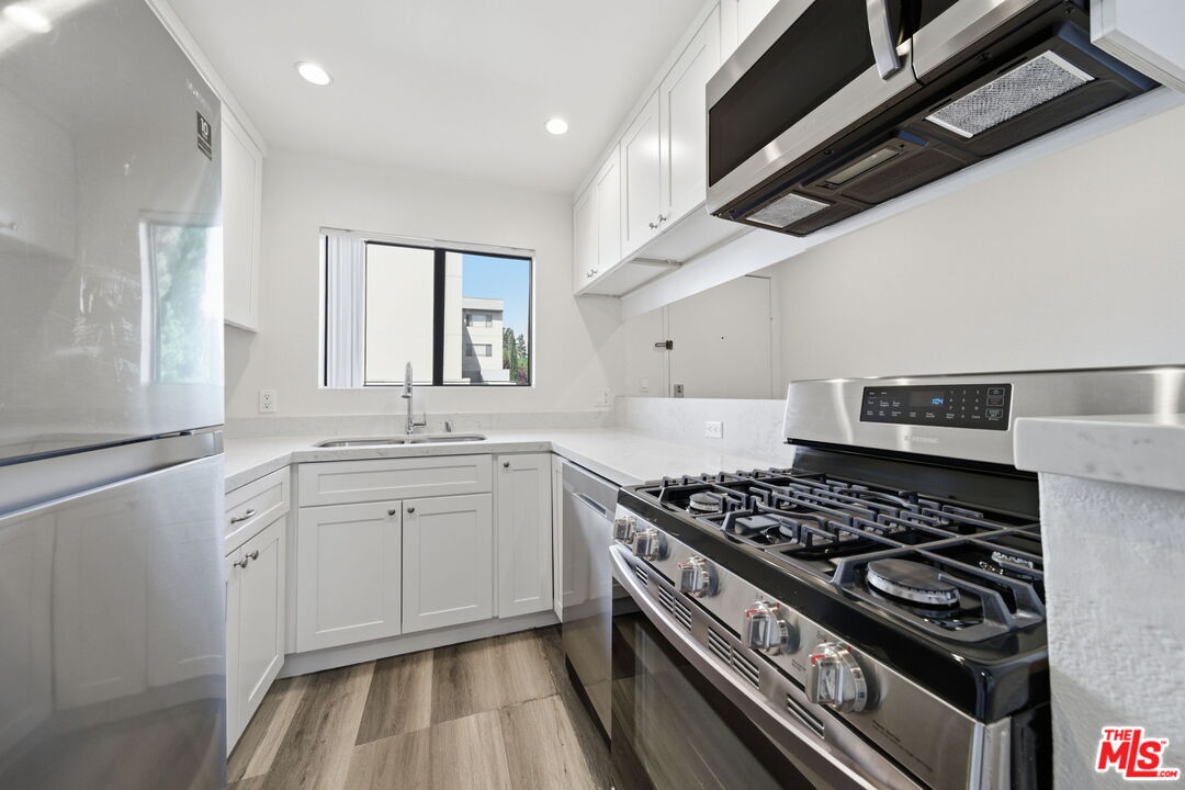 LARGE Light & Bright remodeled one bedroom REAR CORNER UNIT in a secured gated building. Kitchen has quartz countertops. The living room has a fireplace and patio.. Huge primary bedroom with an extra large walk-in closet and spacious 2nd patio. Wood laminate floor throughout. Central-AC and extra closet space in the unit. One parking spot in a gated garage. This is a small 10 unit building in the heart of Valley Glen in Van Nuys. PET FRIENDLY.