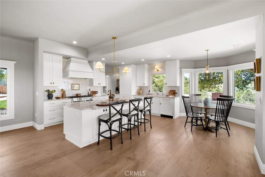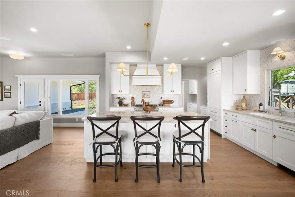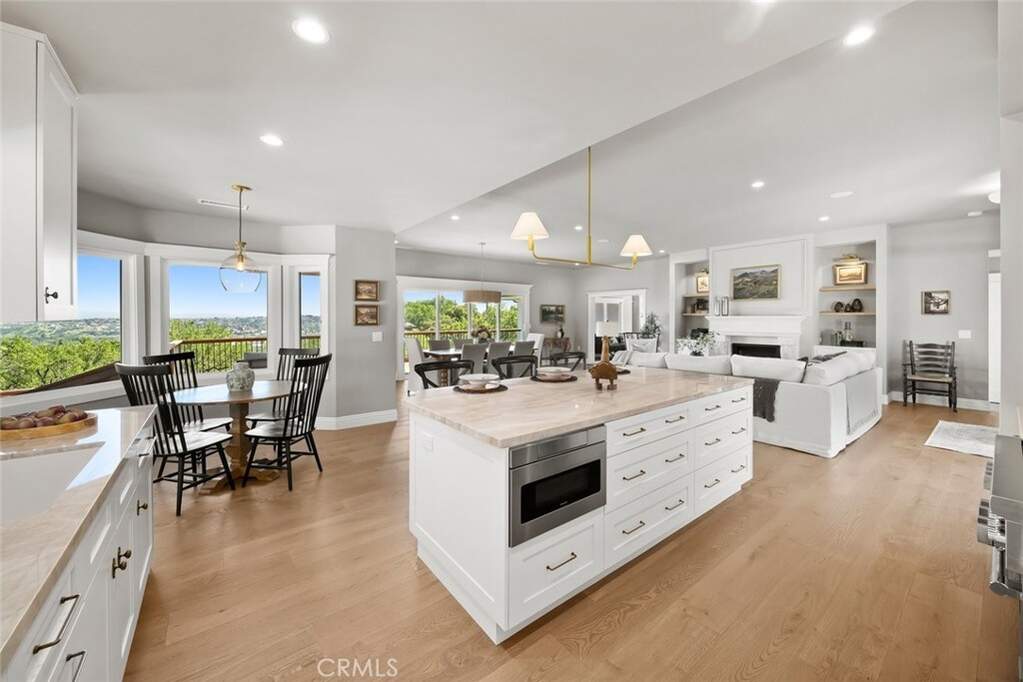 Capturing one of Paso Robles most breathtaking panoramas, this newly renovated residence is a seamless blend of timeless design and contemporary luxury. Thoughtfully reimagined inside and out, every detail reflects elevated craftsmanship and refined living. A beautifully finished paver and concrete driveway with ample parking is complemented by a detached two-car garage with private office complete with air conditioning and aesthetics matching the main home. The grounds are equally captivating. Lush, professionally designed landscaping with a full sprinkler system surrounds the home, while a serene terrace shaded by a majestic oak tree invites gathering and relaxation beside a charming outdoor fireplace. Inside, the main residence unfolds into an open-concept living space. The living room centers around a striking fireplace with an intricately detailed surround and custom built-ins. The dining area opens directly to an expansive deck, where sweeping vistas of Paso Robles create an unforgettable backdrop. The kitchen is both elegant and functional, featuring custom European-style cabinetry, quartzite countertops, a designer tile backsplash, and a generous island with seating. Premium appliances include a six-burner gas range and a fully integrated, paneled refrigerator for a seamless aesthetic. A sunlit breakfast nook offers tranquil views toward the terrace and eastern hills. Designed for both entertaining and retreat, a stylish game room with wet bar flows effortlessly to the backyard, where an in-ground pool and outdoor shower create a private resort experience. The primary suite is a sanctuary, complete with sitting area oriented toward the views, spa-inspired ensuite bath with soaking tub, walk-in shower, and private water closet. A custom walk-in closet with a discreet wall safe adds stylish functionality. Two additional spacious bedrooms enjoy direct backyard access and share a beautifully appointed full bath. A thoughtfully designed laundry center and a stylish powder room complete the home. Additional features include wide-plank hardwood flooring, marble tile accents, a built-in Sonos sound system, and dedicated hookup for a Samsung Frame TV. Major upgrades include new electrical, plumbing, HVAC, and roof-ensuring peace of mind for years to come. Bold in design yet effortlessly livable, this exceptional property offers a rare opportunity to own a meticulously curated home in one of Paso Robles most scenic settings.