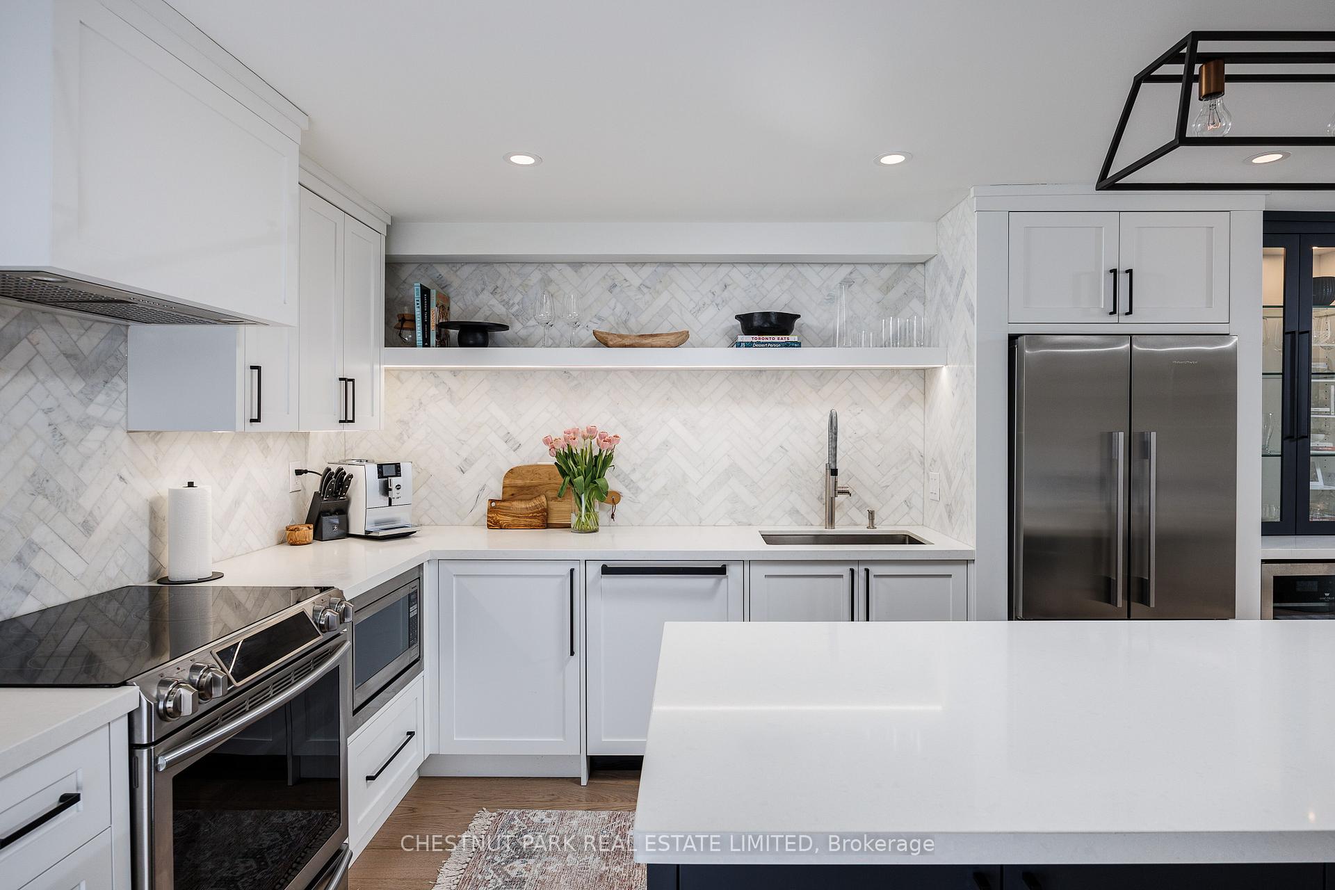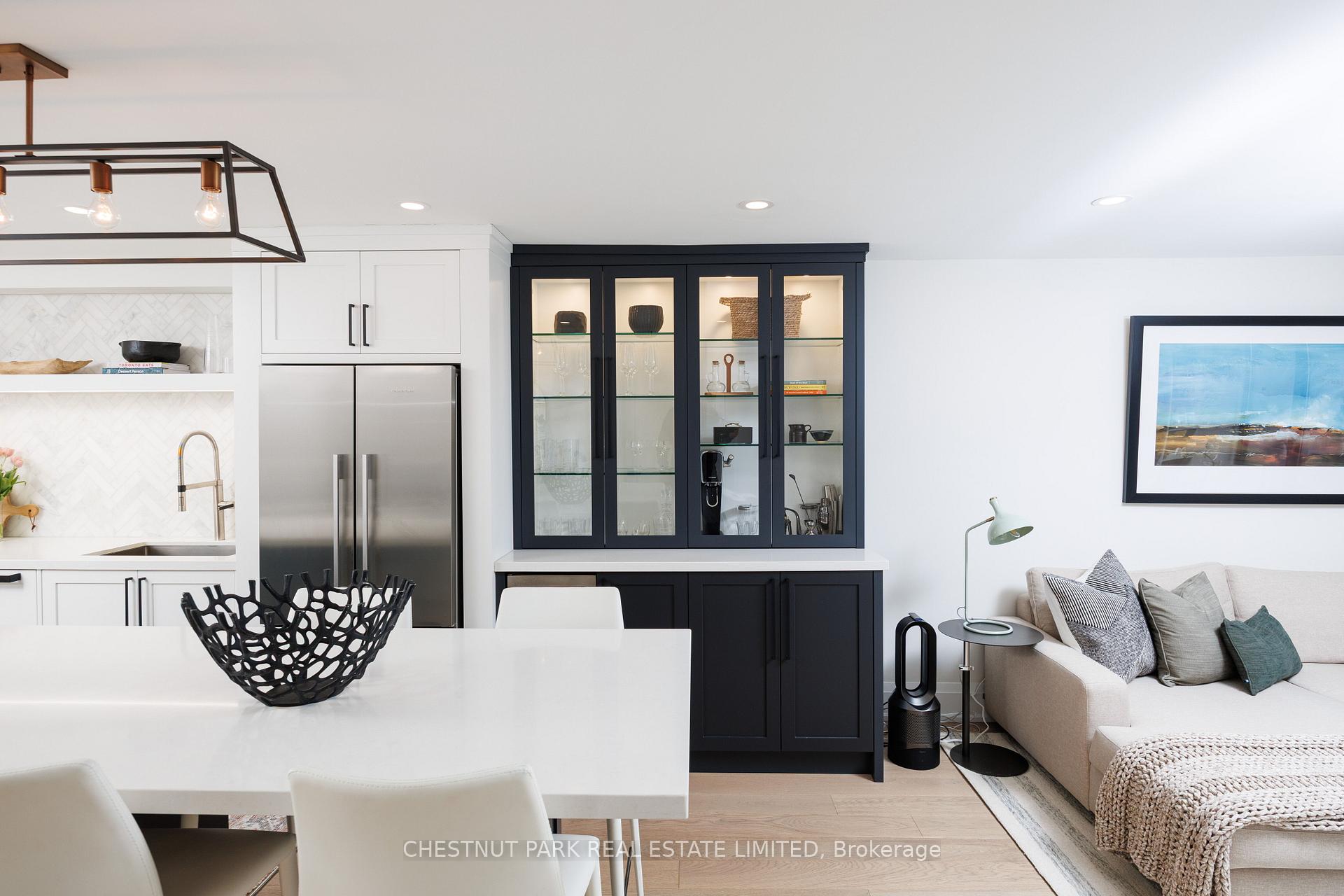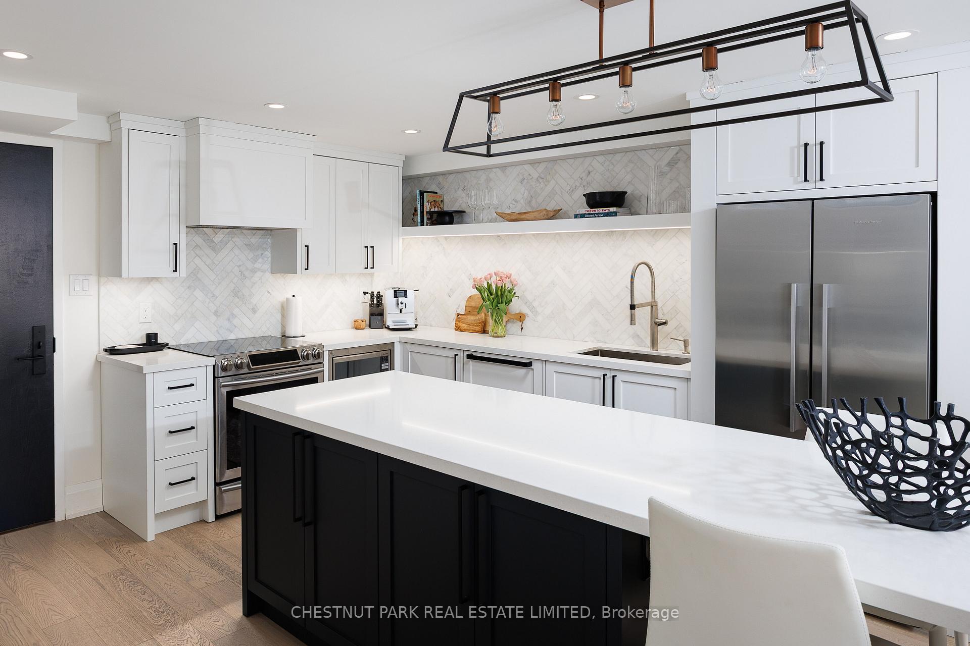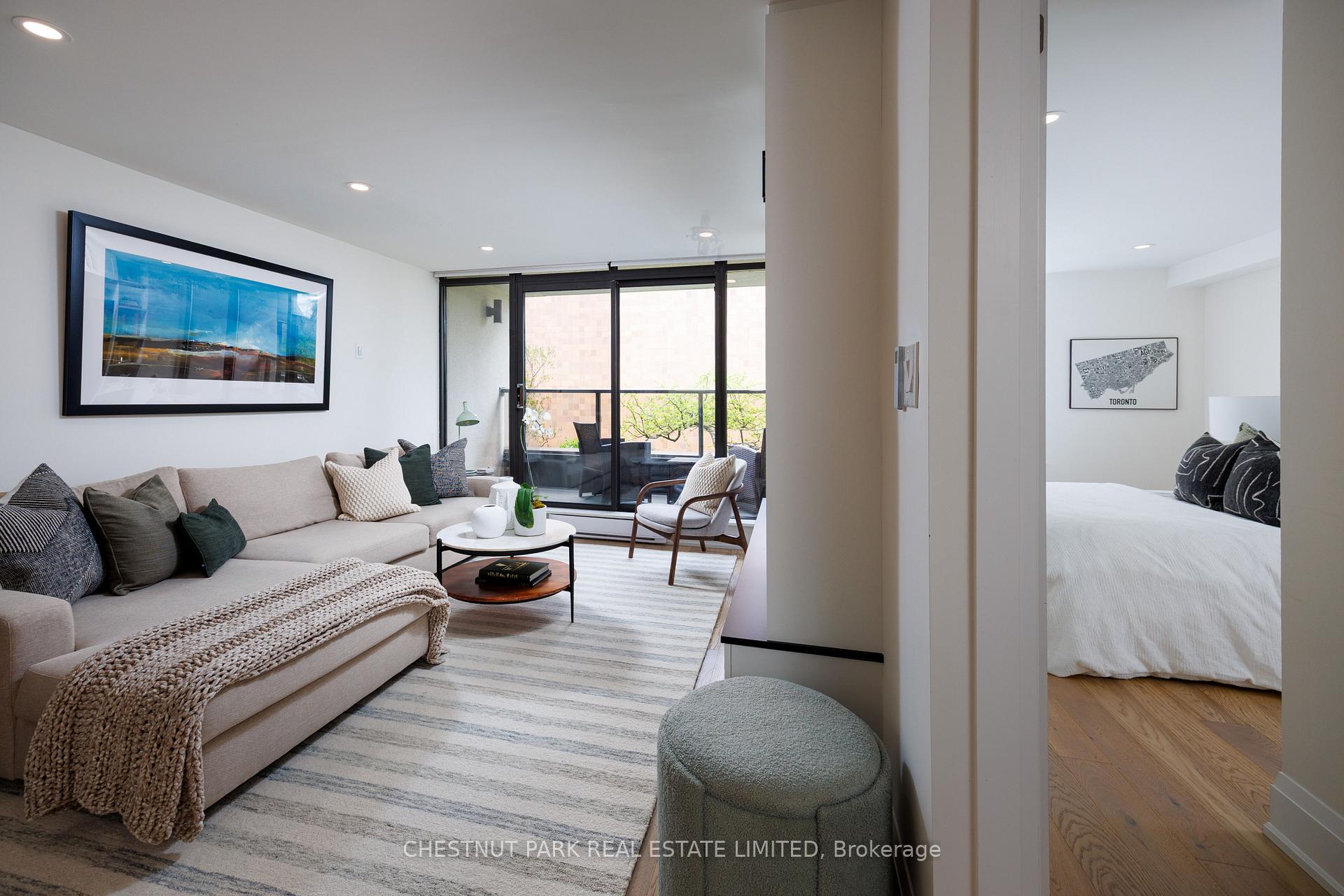 40 Oaklands is a quietly admired boutique building in the heart of Summerhill - known for its strong sense of community, exceptional walkability, and discreet, secure atmosphere. One-bedroom suites here are seldom available, and true single-level living with no interior stairs is especially rare. Beautifully renovated by RTG Designs in 2017, this thoughtfully designed suite centres around a custom kitchen with an oversized island and integrated dining extension, opening to a bright living area with tailored built-ins and a walk-out to a private east-facing balcony set among the trees. Custom millwork continues throughout, including a built-in sideboard with wine fridge, media centre, and bookshelves. The spacious bedroom features a walk-in closet and access to a carefully finished bathroom with heated marble basketweave floors and classic white subway tile. Wide-plank white oak floors run throughout. A generous laundry and storage room adds everyday practicality rarely found in suites of this scale. Includes parking and locker. Easily accessed from the lobby yet quietly positioned within the building-an ideal combination of convenience and privacy. The Oaklands is a well-managed, pet-friendly boutique residence with part-time concierge (1-9 pm), visitor parking, bike storage, and car wash. EV charging installation permitted. Maintenance fees include cable and internet. Low property taxes. A calm, turnkey home just steps to Summerhill's shops, restaurants, parks, and transit-within one of the neighbourhood's most special boutique buildings. All existing appliances, light fixtures, window coverings per Schedule B.