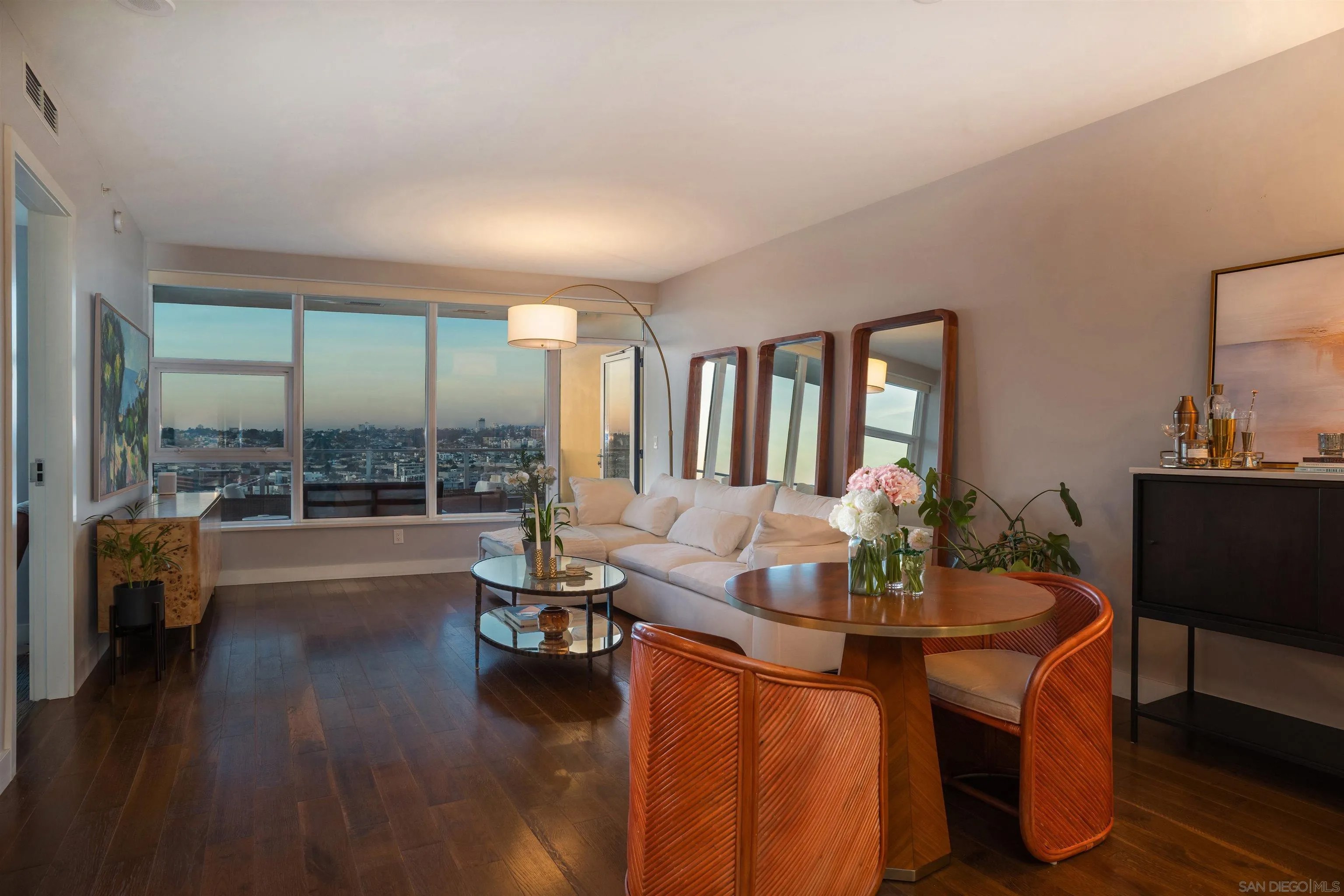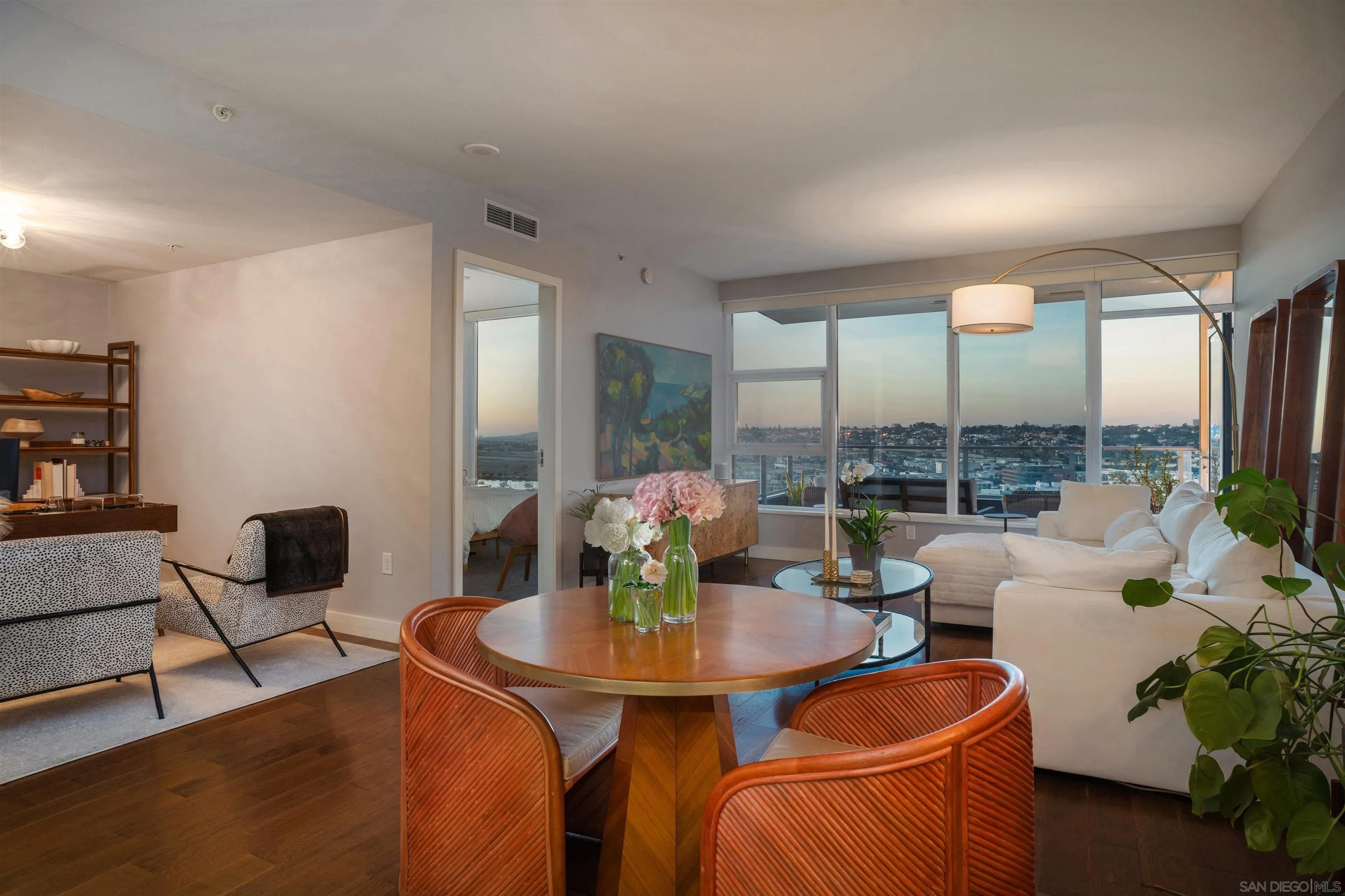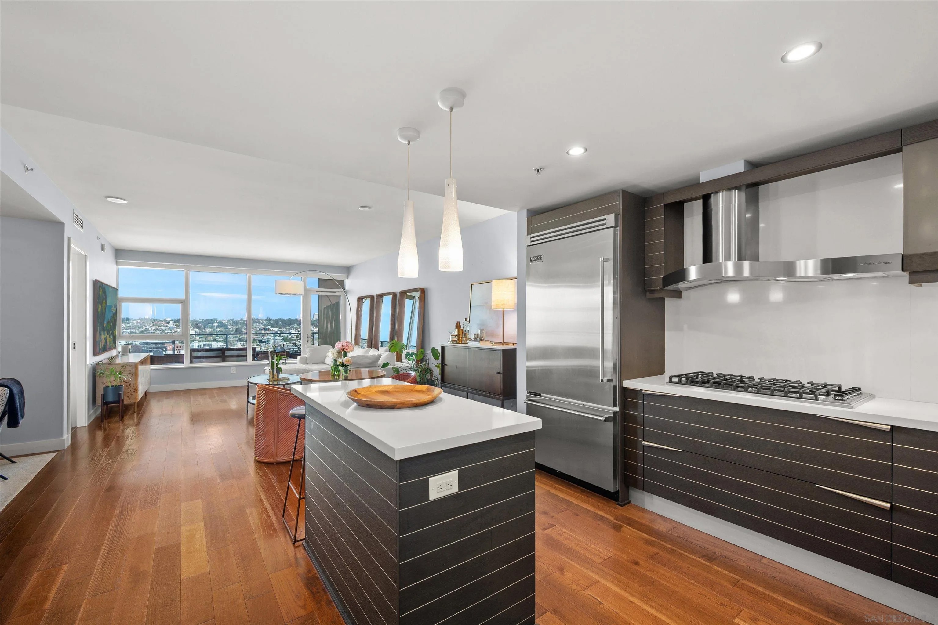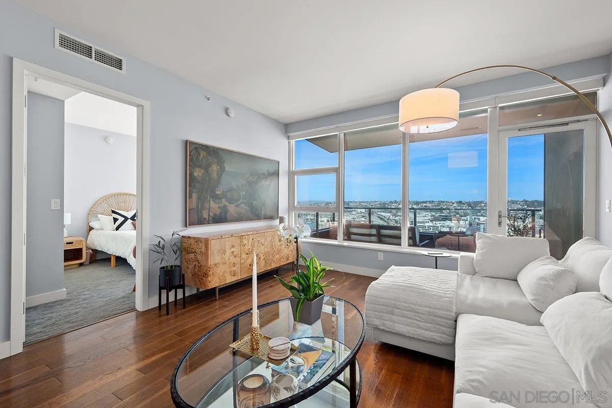 Experience elevated waterfront living at its finest in this impeccably appointed Bayside residence. Sweeping views of San Diego Bay, the harbor, and the city skyline greet you from virtually every room. The generous balcony, ready for outdoor living, captures panoramic bay views from above, with sailboats, sunsets, the Embarcadero, and Point Loma in full display beneath an endless stretch of blue sky. Inside, warm hardwood floors flow through the open-concept great room, anchored by a chef's kitchen that makes no compromises. All Viking appliances, including built-in wine refrigeration, a professional gas cooktop with stainless hood, sleek dark Snaidero Italian cabinetry with horizontal ribbing, and a quartz island with pendant lighting set the tone for a space that is equally suited to quiet mornings and dinner parties. The living and dining areas extend naturally from the kitchen, framing the skyline through floor-to-ceiling glass. Both bedrooms capture light and views with equal generosity. The primary suite offers a serene retreat, with an ensuite spa bath featuring dual vanities, a soaking tub with marble slab surround, and a separate glass-enclosed marble shower. The second bedroom, bright with windows overlooking the bay and cityscape, adapts effortlessly as a guest room, home office, or both. A second full bath with tub and a dedicated in-unit laundry closet with full-size upgraded stacked machines round out the practical comforts. Addtional features include: electronic smart shades on every window (blackout in the bedrooms, sheer sun shades in the living room) controlled by remote or voice command through the smart home system, a Nest thermostat for precision climate control, two side-by-side parking spaces with EV charger, and an extra-large storage unit. With access to Bayside's premier amenities and an address at the water's edge, this residence delivers the quintessential San Diego metropolitan lifestyle. Common areas went through an extensive renovation in 2025. Widely regarded as one of the top buildings in all of San Diego, Bayside enjoys some of the most luxurious amenities Downtown. 24-hour security, resort-style pool and spa, outdoor kitchen with BBQs, fully-equipped exercise room, sauna and steam rooms, theatre, resident lounge with billiards & full kitchen, conference room, and a unique wine lounge including an oversized wine-chiller for a unique entertainment venue. All this in addition to the coveted lifestyle amenities coastal metropolitan living offers with the Embarcadero, Waterfront Park, and Little Italy all merely steps from your door! Farmers Market and numerous bars and restaurants all nearby! PLUS: Some of the most reasonable HOA dues for a premier tower in all of Downtown San Diego.
