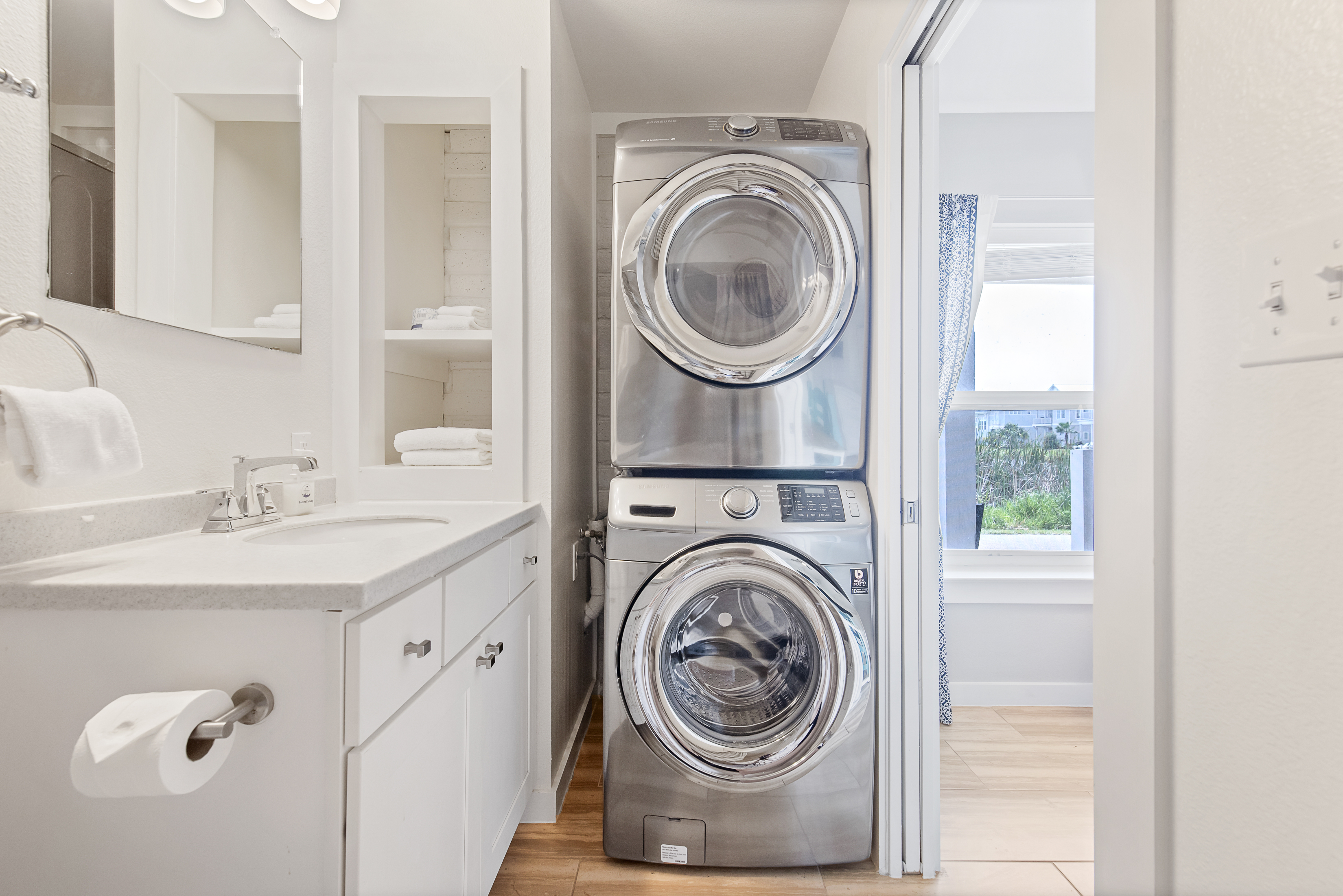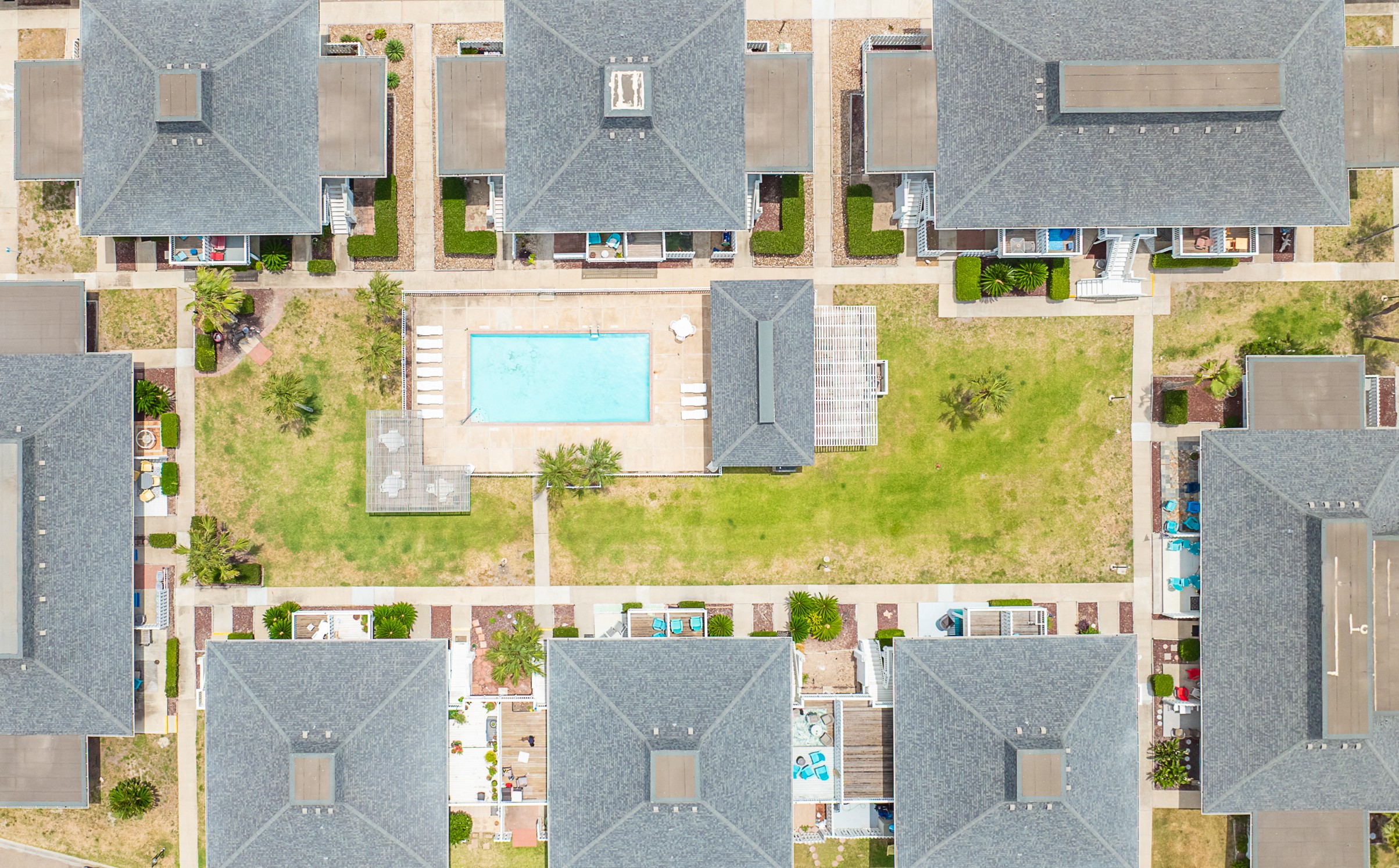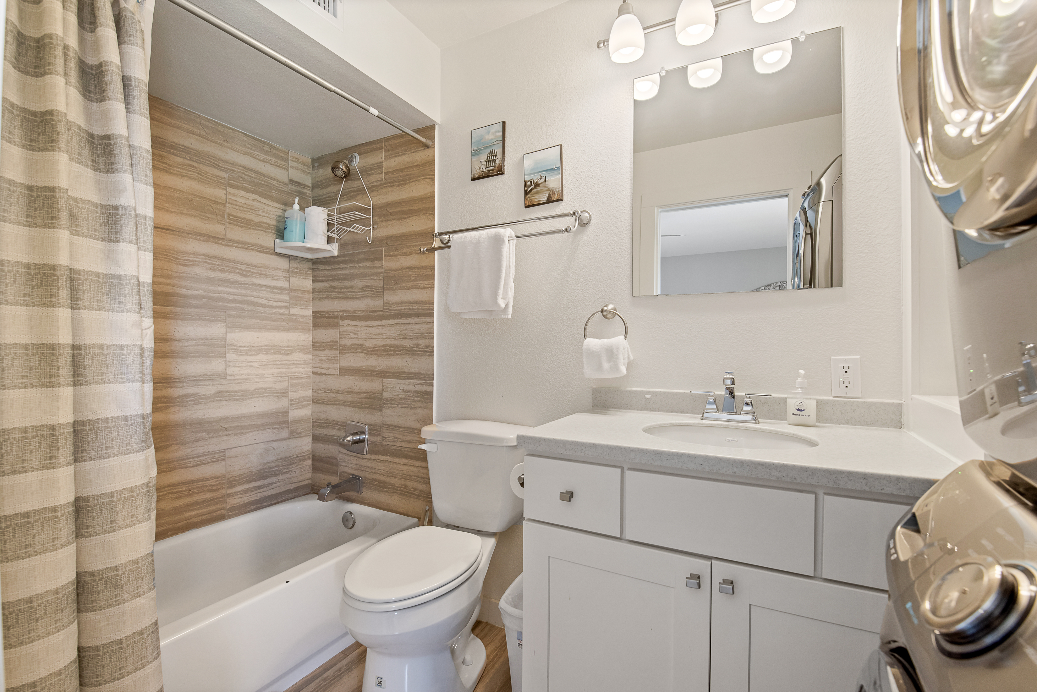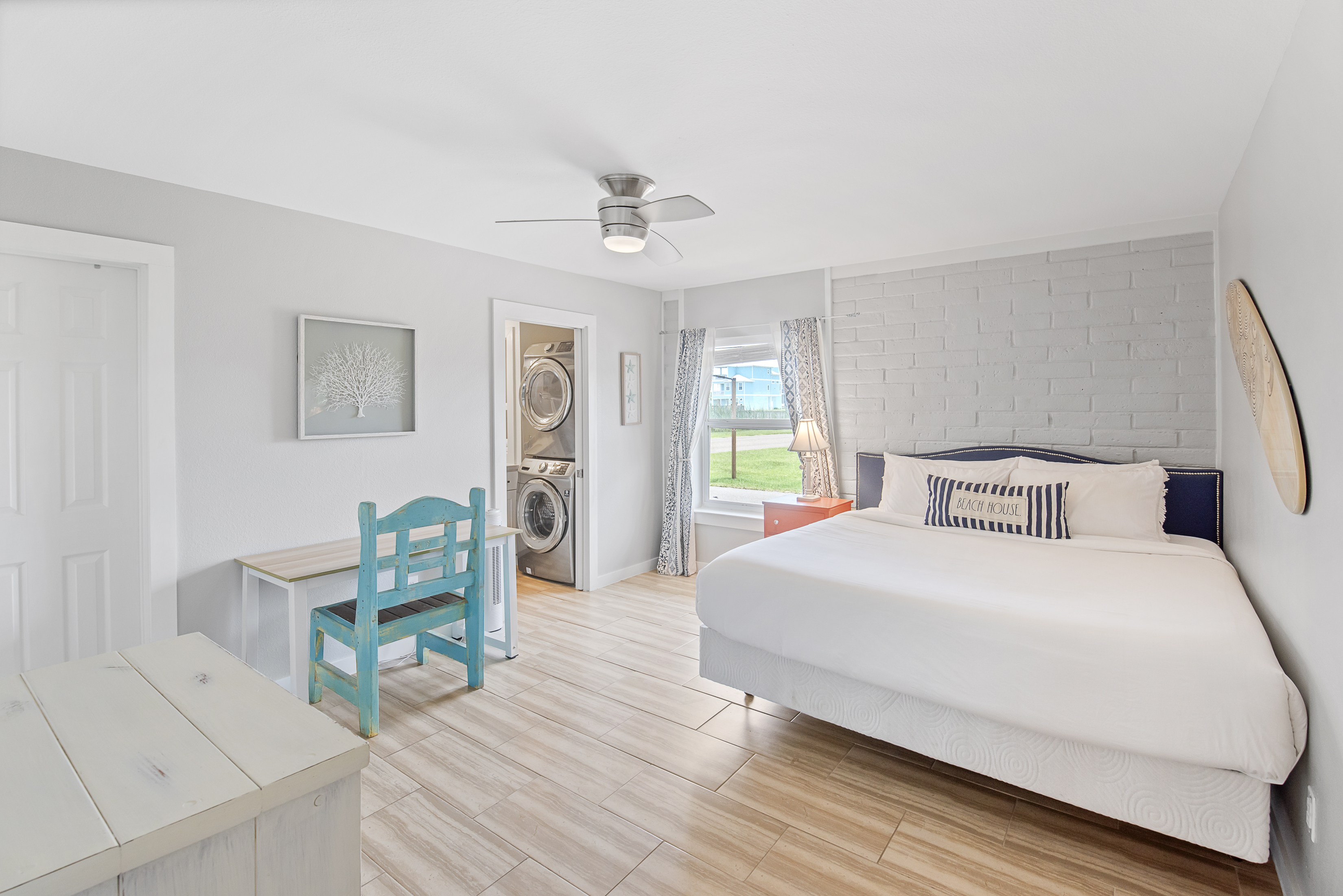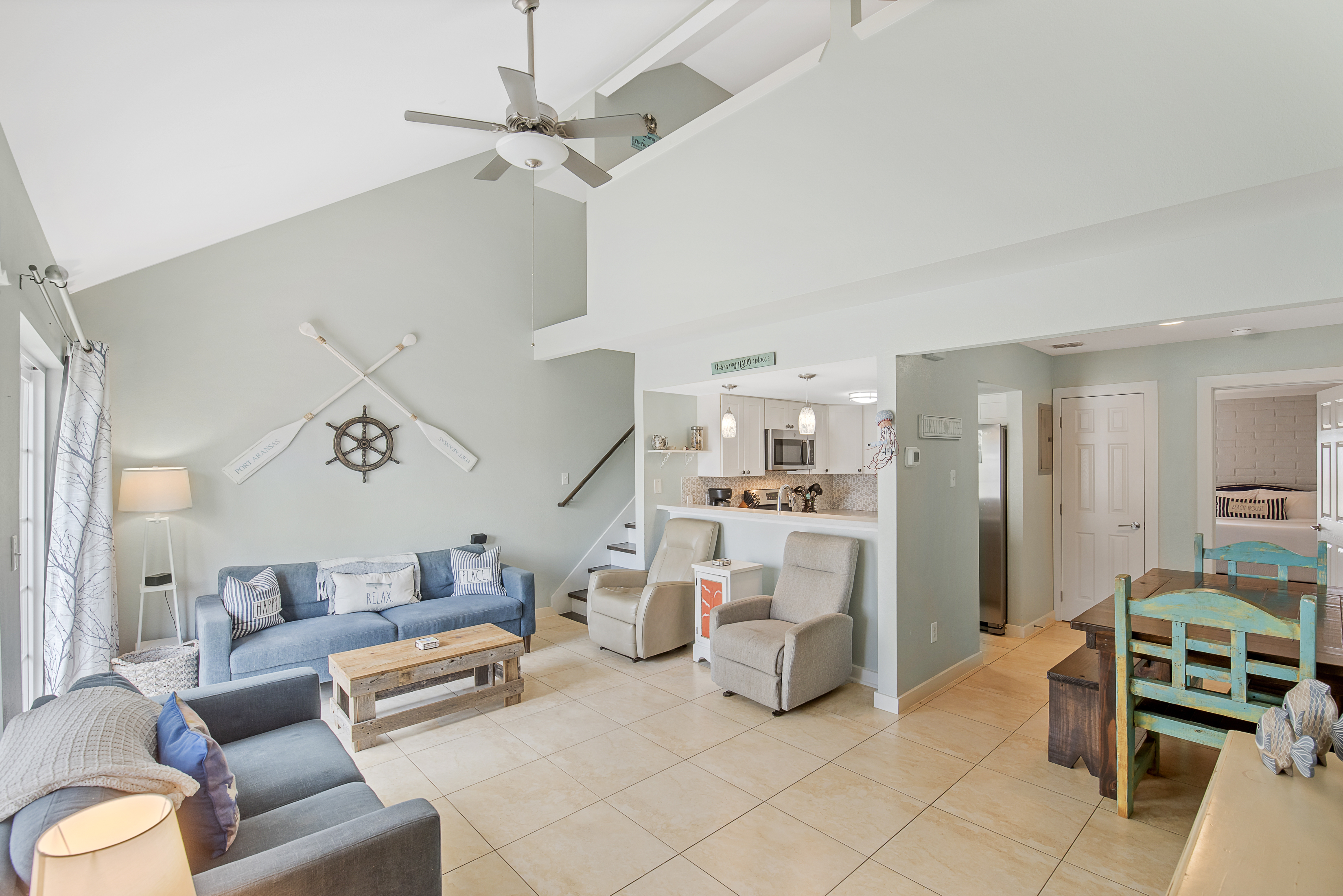 Discover the perfect Mustang Island beach getaway at El Cortez, located just three miles south of Port Aransas and a short walk or golf cart ride to the beach via the golf cart–accessible beach boardwalk. This beautifully designed two-story condo on Mustang Island features an open floor plan, stylish ocean-inspired décor, and comfortable living spaces perfect for a relaxing Port Aransas vacation.The inviting living room offers cozy seating and a wall-mounted TV, while the fully equipped kitchen with Corian countertops and stainless steel appliances makes meal prep easy after a day at the beach. Step outside to the private patio and enjoy refreshing Gulf Coast breezes.The main-floor primary suite features a King bed, ample storage, and an ensuite bath with a tiled tub/shower and full-size stackable washer and dryer. Upstairs, the loft-style bedroom includes a Twin-over-Full bunk and a Queen bed. Great for group. The third bedroom offers a King bed and a private ensuite bath with a tiled shower. Relax on the private balcony overlooking the peaceful pond.El Cortez on Mustang Island amenities include a shared pool just steps away, covered grilling areas, and convenient golf cart access to the beach. Located next to Cinnamon Shore and just minutes from downtown Port Aransas, you'll be close to popular restaurants, shopping, fishing charters, nightlife, and golf.Whether you're searching for a Mustang Island vacation rental, Port Aransas beach condo, or the perfect coastal getaway near the beach, this island retreat offers the best of beach living.