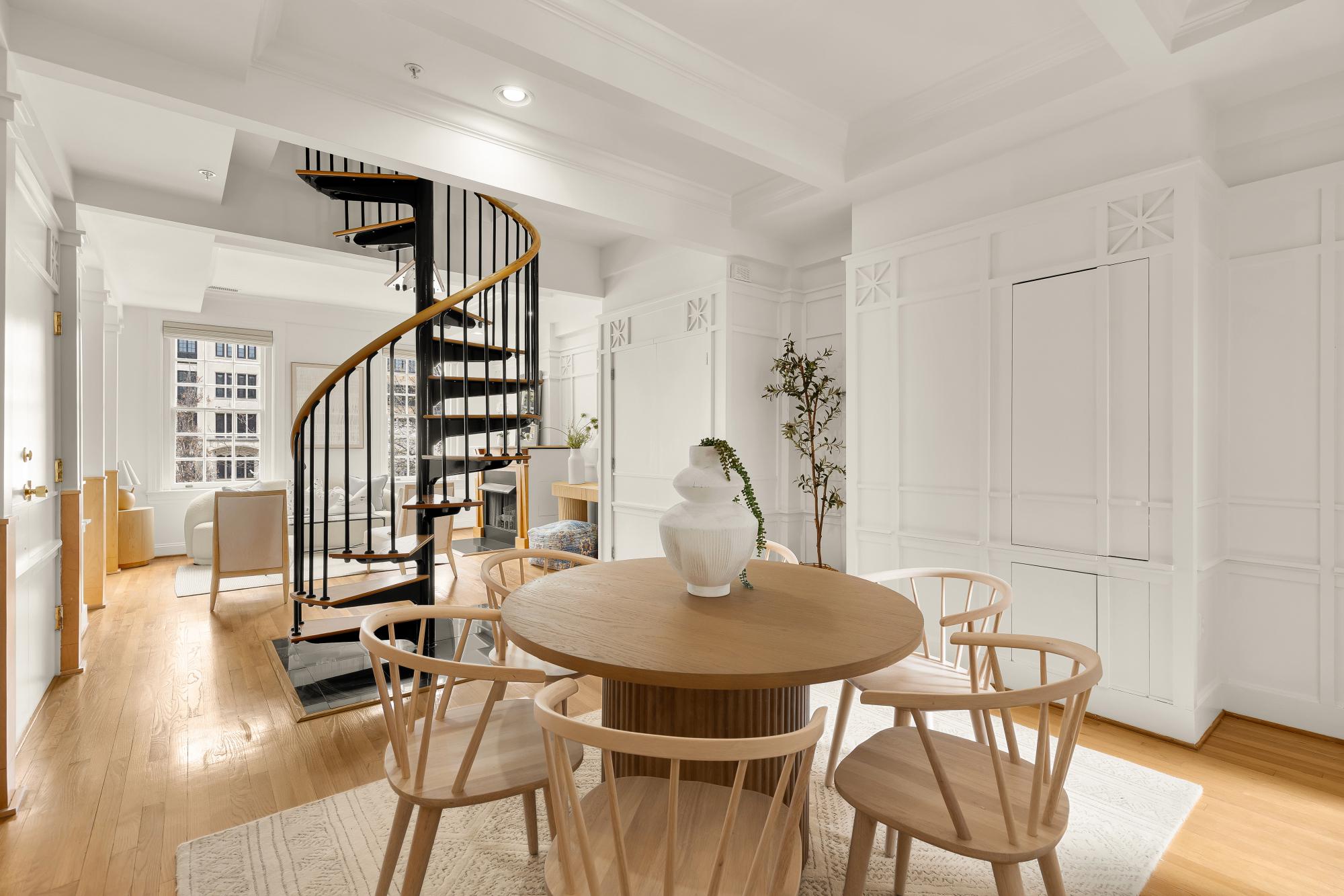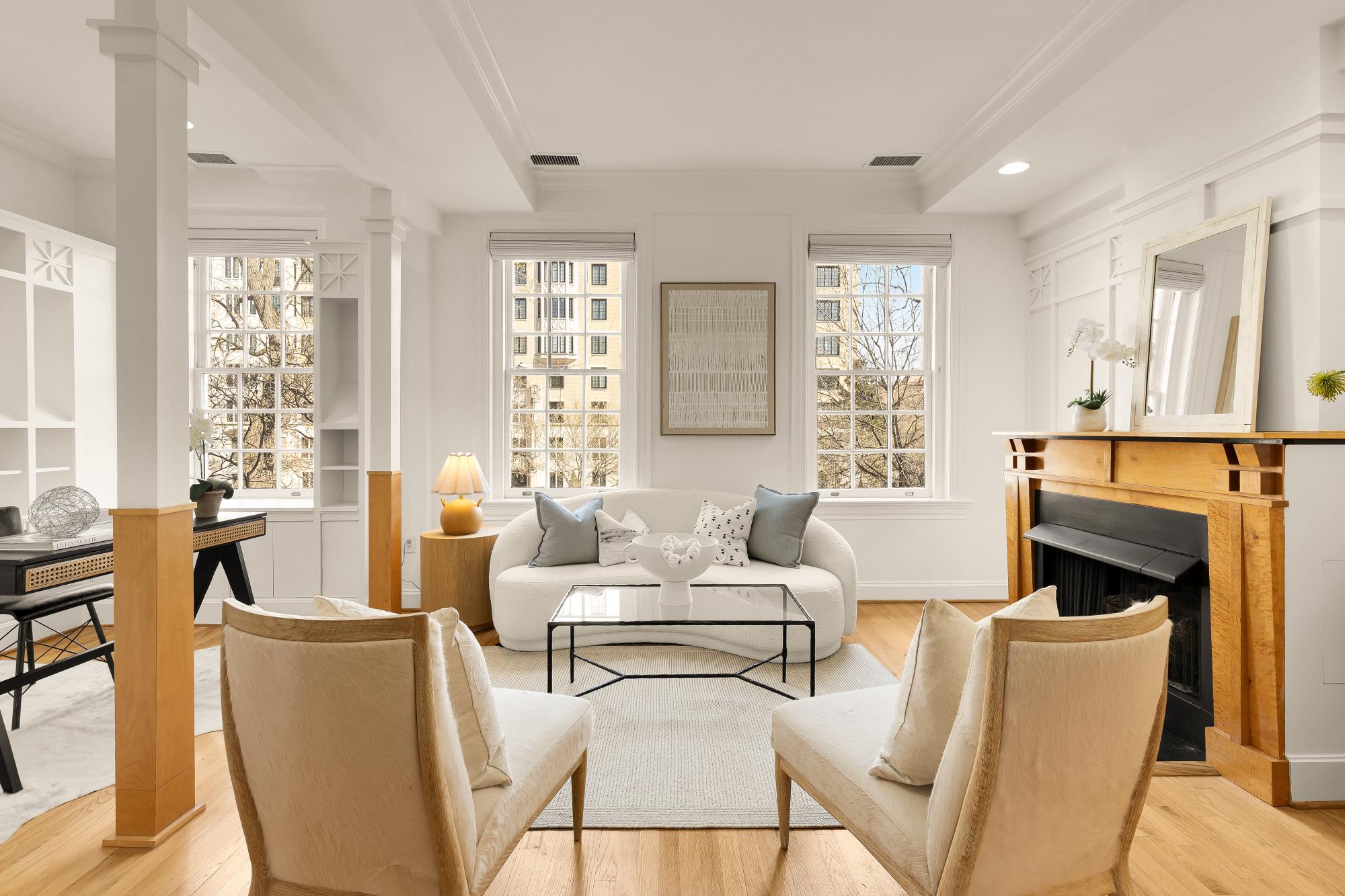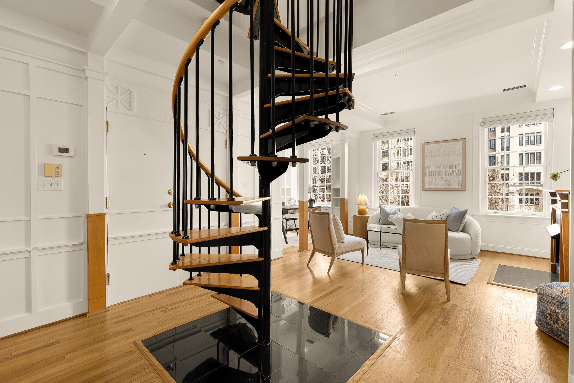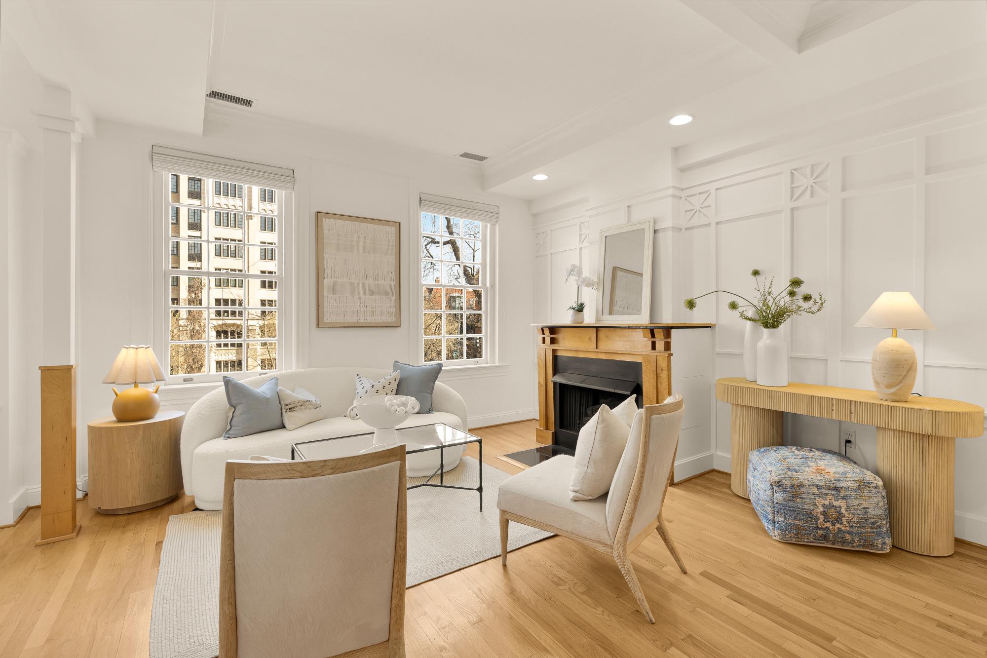 Elegant in scale and rich in volume! An impressive two-level residence at The Madeleine blends historic character with thoughtful modern updates in the heart of Dupont Circle. Originally part of the distinguished O’Donohue House, this boutique Victorian building offers timeless architecture with refined contemporary living and spectacular views. Unit 5 spans almost 1,400 square feet across two levels, with 2 bedrooms, 2.5 bathrooms, and a beautifully flowing layout ideal for both daily living and entertaining. The main level offers dramatic ceilings, expansive living and dining spaces, abundant natural light, and a kitchen with quartz countertops, under-cabinet lighting, and newer appliances. A versatile office off the living room with built-ins around. A stylish powder room and balcony complete the main level. Upstairs, both bedrooms offer ensuite bath access, including a spacious primary suite with generous closet space. The second bedroom is well-sized and positioned for privacy, while the upper level also includes in-unit laundry. Architectural details including fireplaces, original trim, and oversized windows add warmth and distinction throughout. Recent improvements include new flooring, a new banister, fresh paint, updated recessed lighting. The roof was replaced in 2023, and a newer HVAC system. The building is set behind a landscaped front garden, creating a welcoming approach, adding to its overall charm. Perfectly positioned between Dupont Circle and Logan Circle, this exceptional location is just moments from Meridian Hill Park, Mitchell Park, Rock Creek Park, Whole Foods, Trader Joe’s, Le Diplomate, Barcelona, Hank’s Oyster Bar, and the Dupont Circle Metro. Monthly garage parking is available nearby at Colonial Garage.