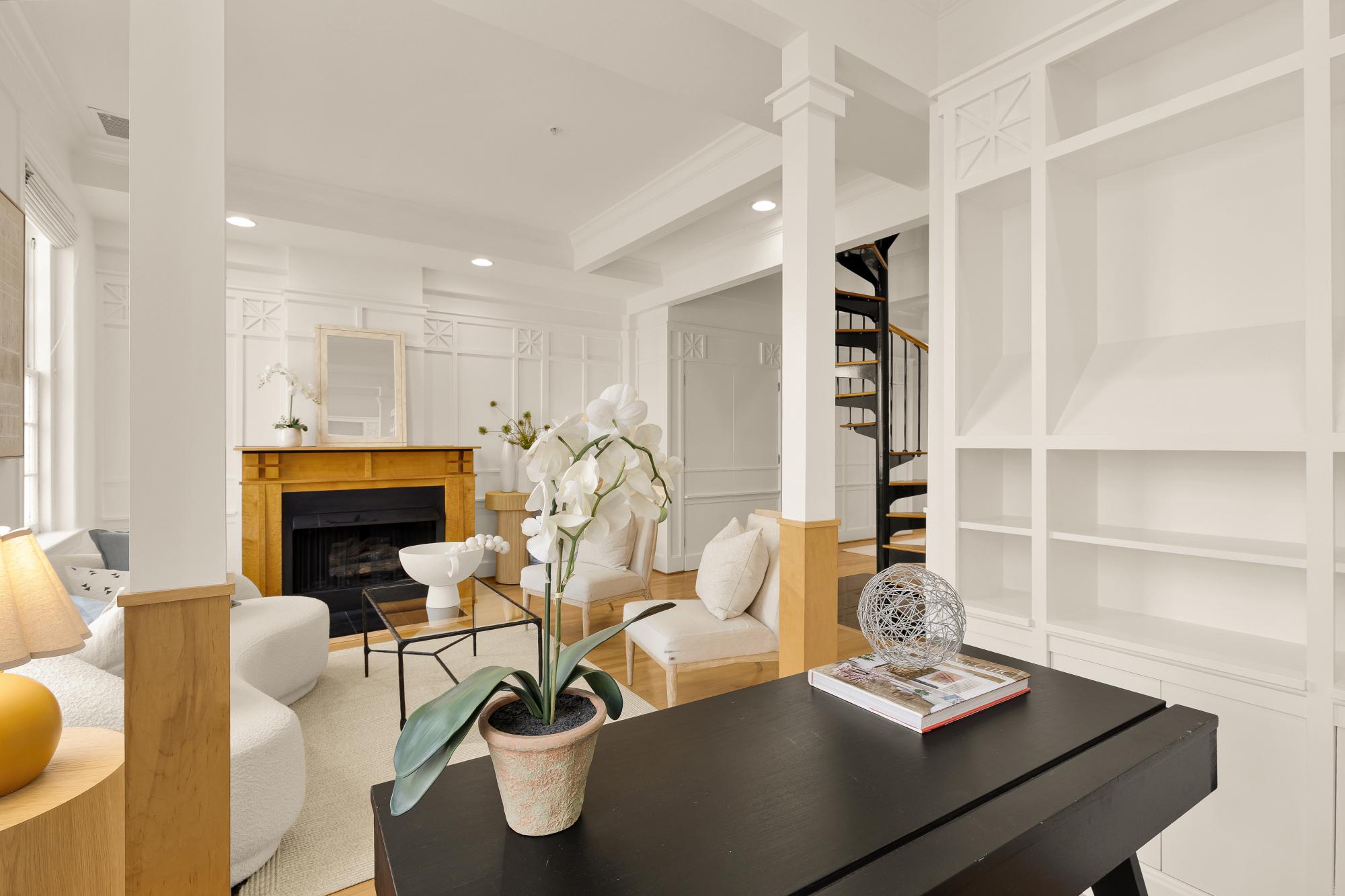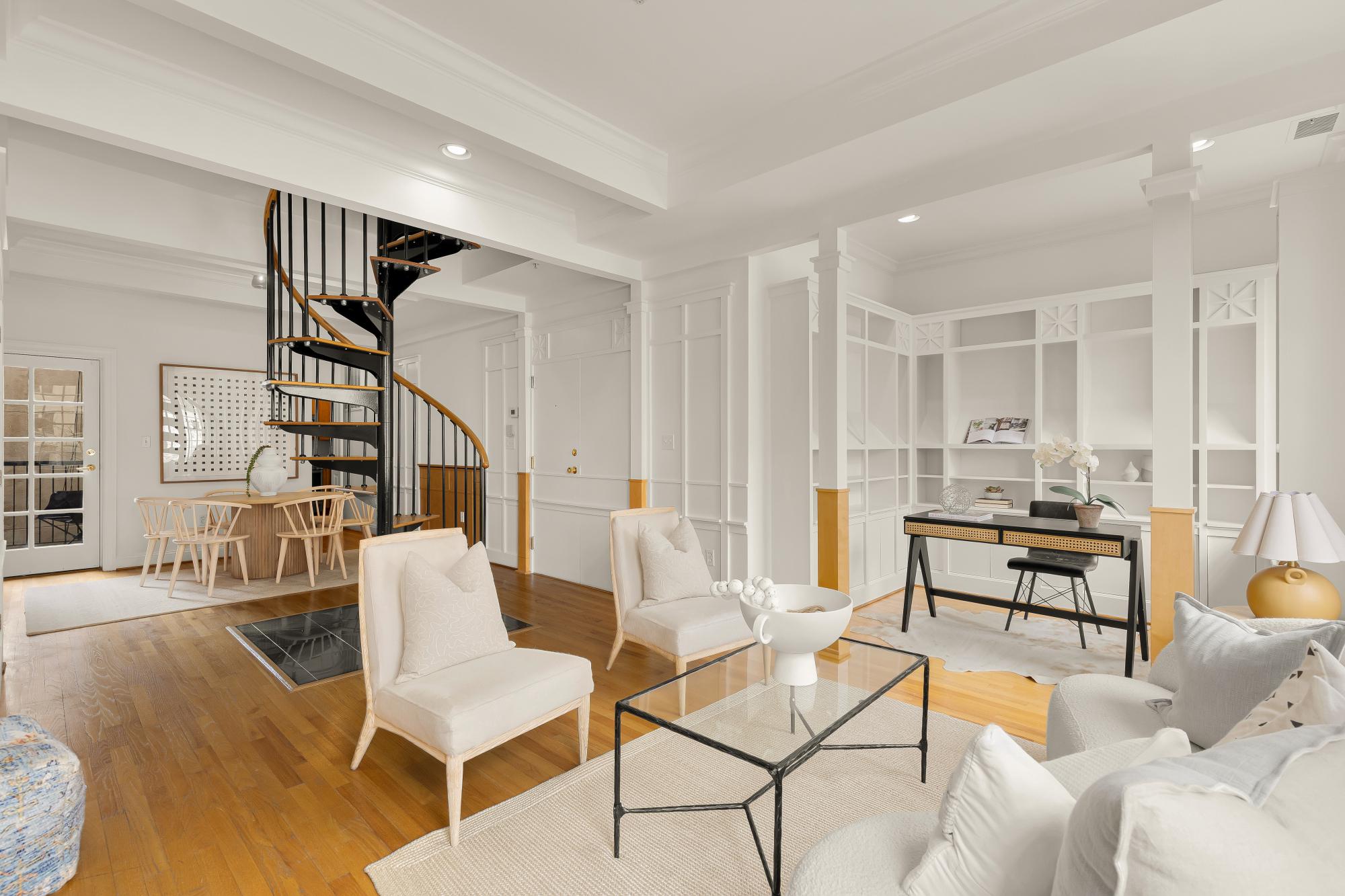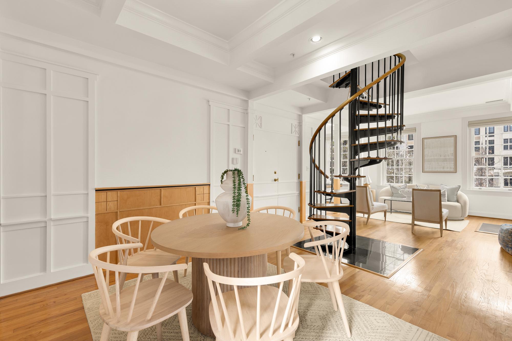 Elegant in scale and rich in volume! An impressive two-level residence at The Madeleine blends historic character with thoughtful modern updates in the heart of Dupont Circle. Originally part of the distinguished O’Donohue House, this boutique Victorian building offers timeless architecture with refined contemporary living and spectacular views. Unit 5 spans almost 1,400 square feet across two levels, with 2 bedrooms, 2.5 bathrooms, and a beautifully flowing layout ideal for both daily living and entertaining. The main level offers dramatic ceilings, expansive living and dining spaces, abundant natural light, and a kitchen with quartz countertops, under-cabinet lighting, and newer appliances. A versatile office off the living room with built-ins around. A stylish powder room and balcony complete the main level. Upstairs, both bedrooms offer ensuite bath access, including a spacious primary suite with generous closet space. The second bedroom is well-sized and positioned for privacy, while the upper level also includes in-unit laundry. Architectural details including fireplaces, original trim, and oversized windows add warmth and distinction throughout. Recent improvements include new flooring, a new banister, fresh paint, updated recessed lighting. The roof was replaced in 2023, and a newer HVAC system. The building is set behind a landscaped front garden, creating a welcoming approach, adding to its overall charm. Perfectly positioned between Dupont Circle and Logan Circle, this exceptional location is just moments from Meridian Hill Park, Mitchell Park, Rock Creek Park, Whole Foods, Trader Joe’s, Le Diplomate, Barcelona, Hank’s Oyster Bar, and the Dupont Circle Metro. Monthly garage parking is available nearby at Colonial Garage.