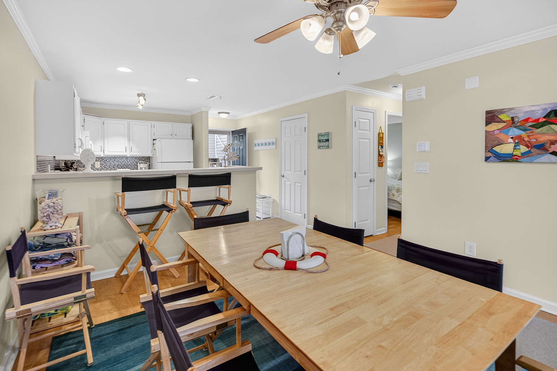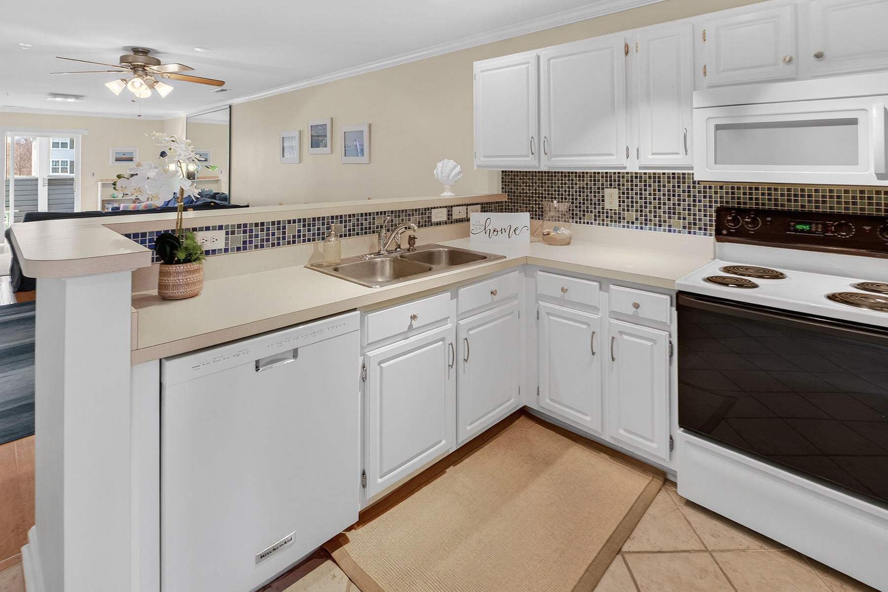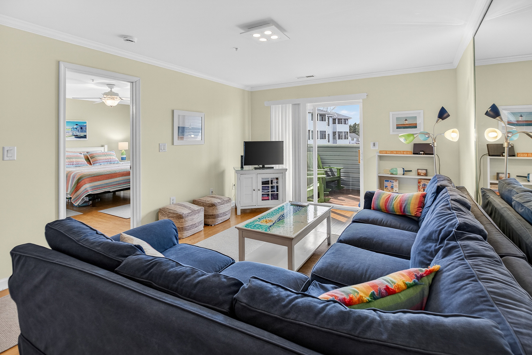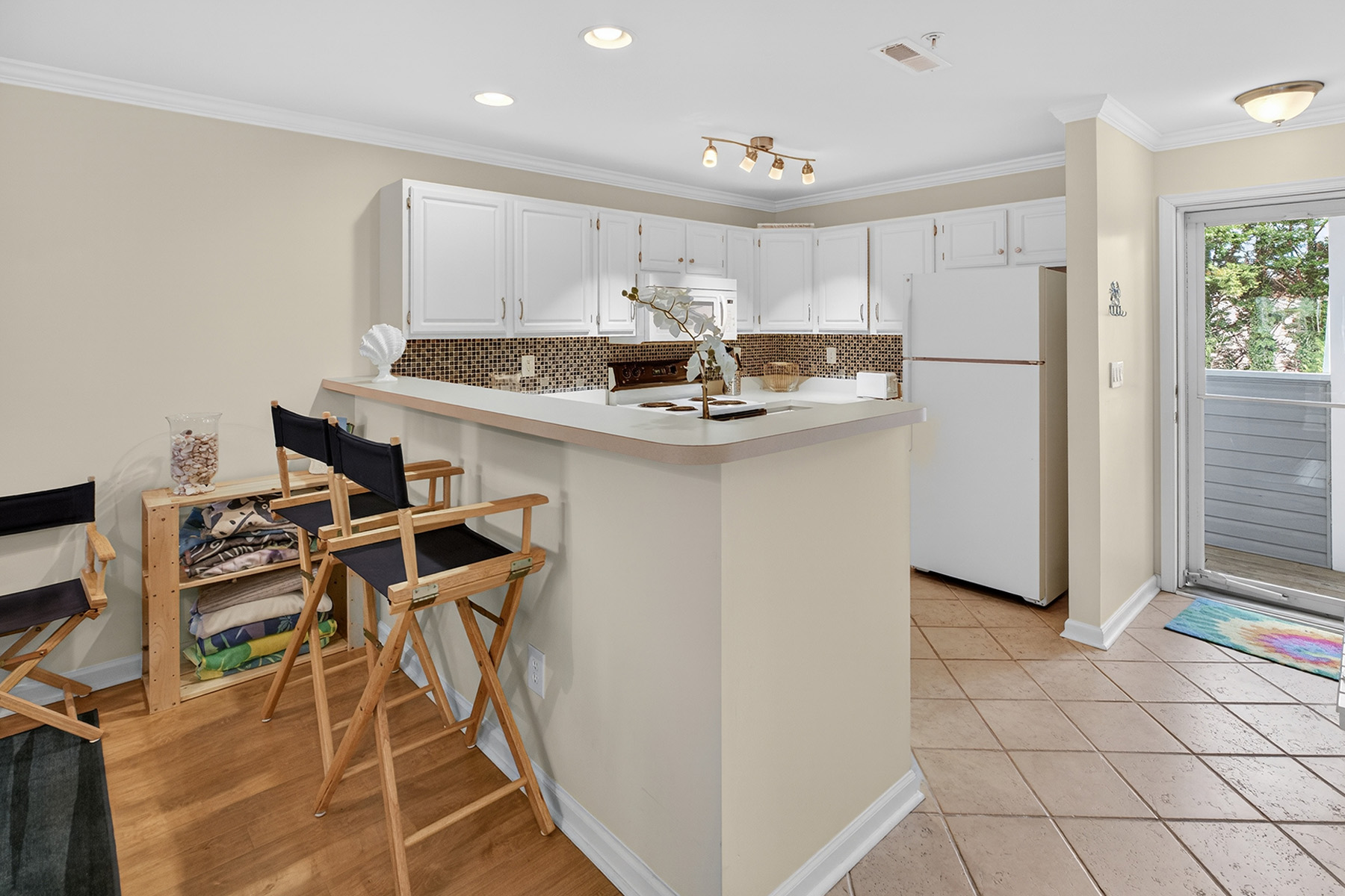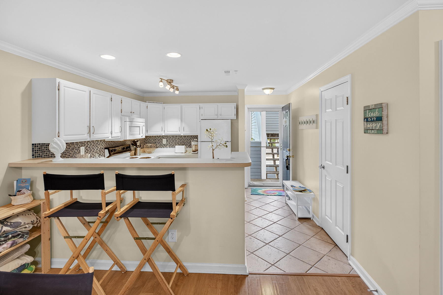 The clean, functional, and stylish kitchen has white cabinetry, ample counter space, and a breakfast bar that opens to the living area. The airy living room has direct access to a private screened porch overlooking the water.
