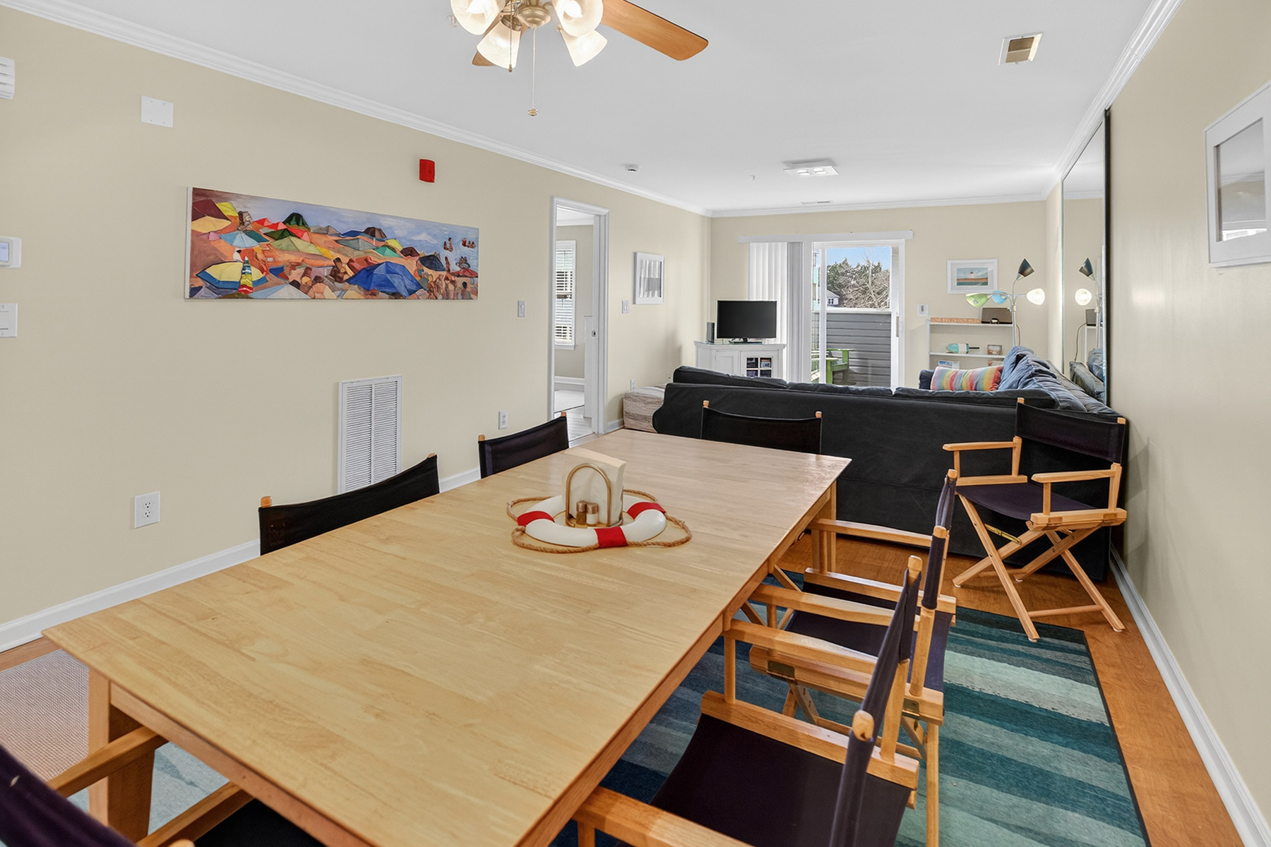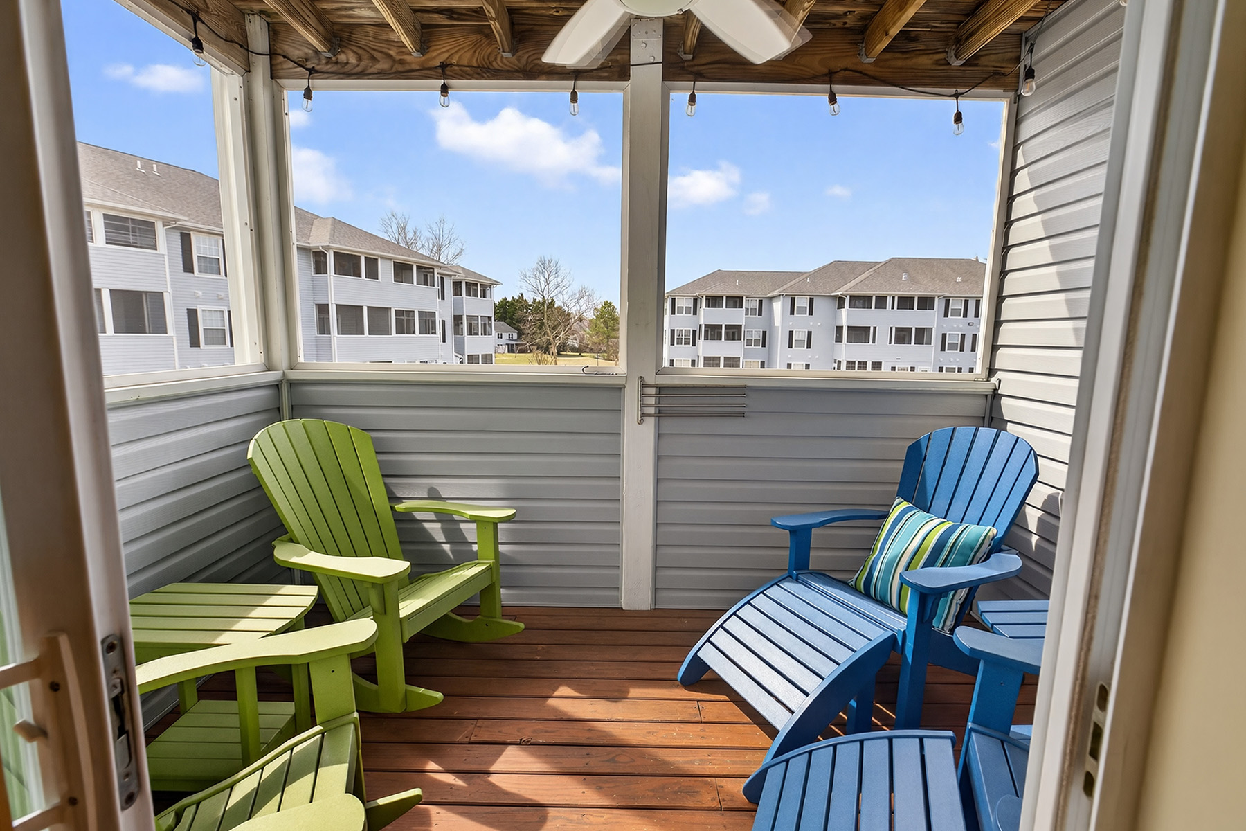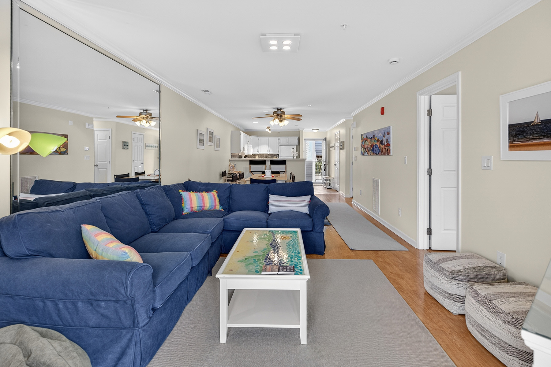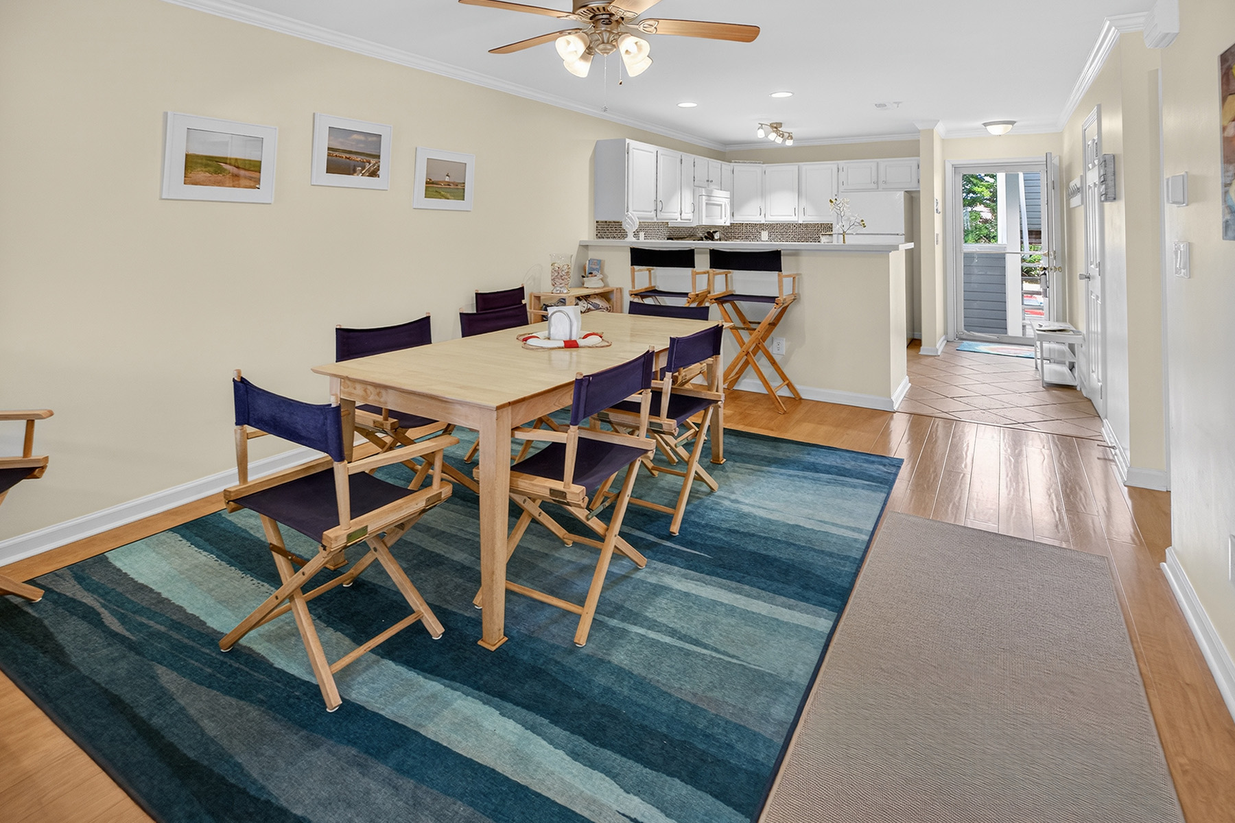 The clean, functional, and stylish kitchen has white cabinetry, ample counter space, and a breakfast bar that opens to the living area. The airy living room has direct access to a private screened porch overlooking the water.
