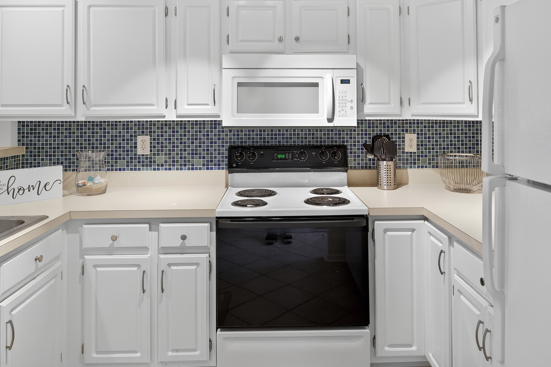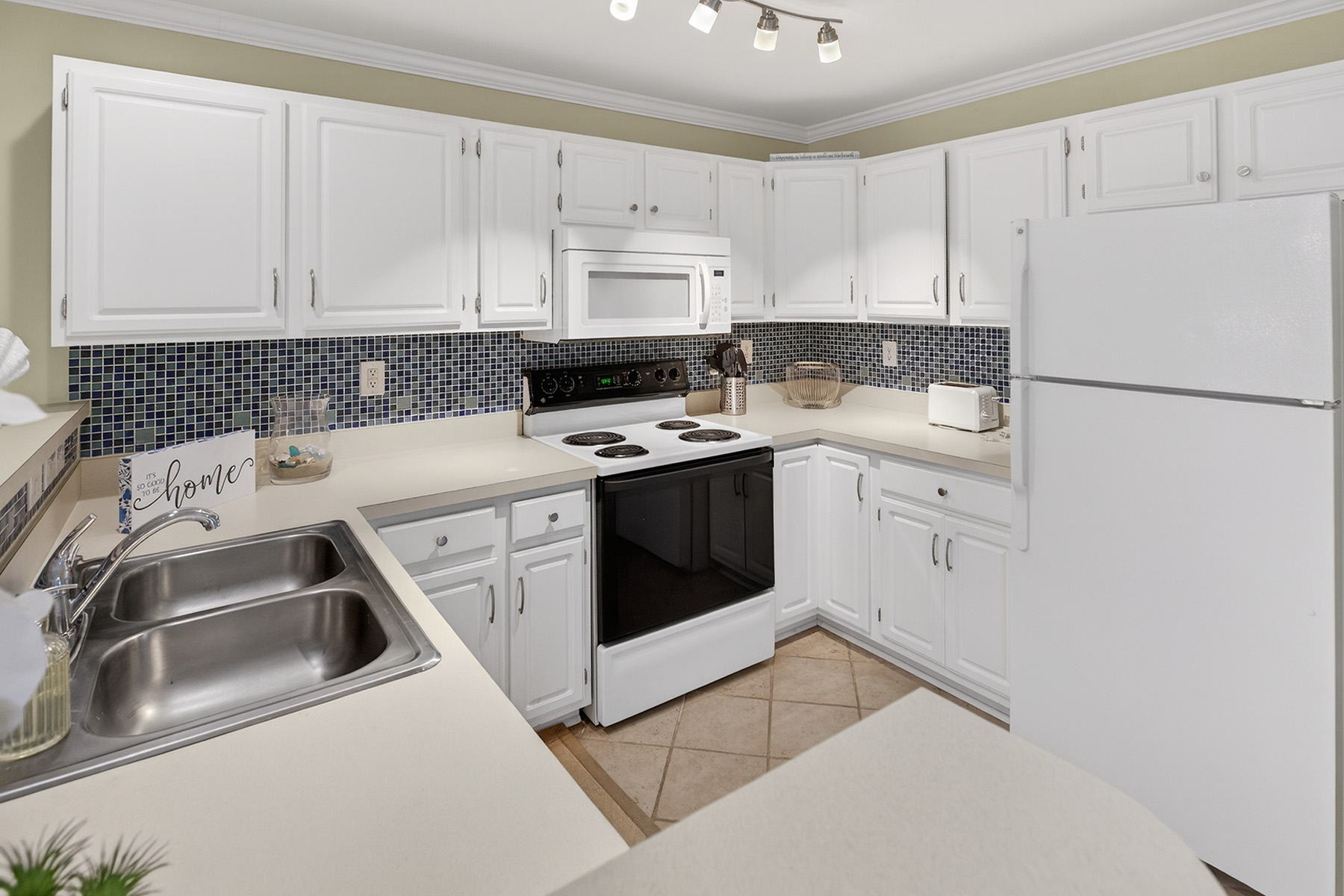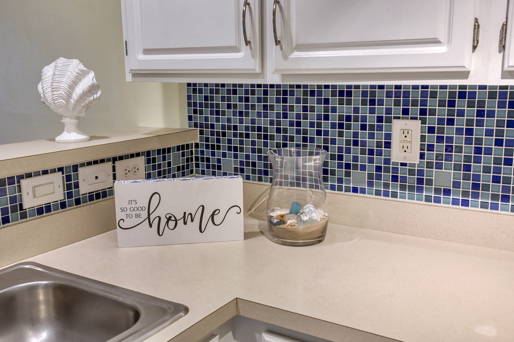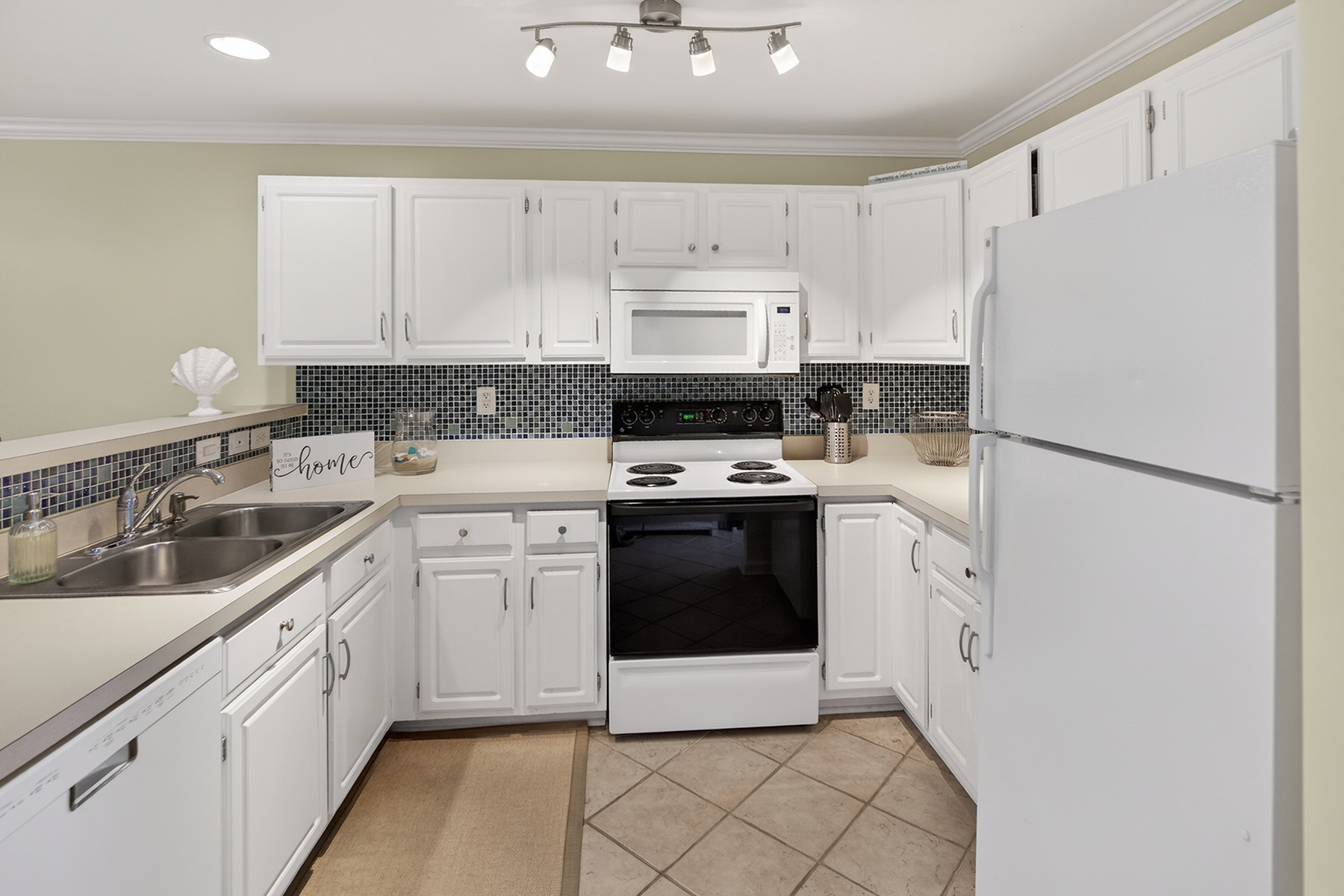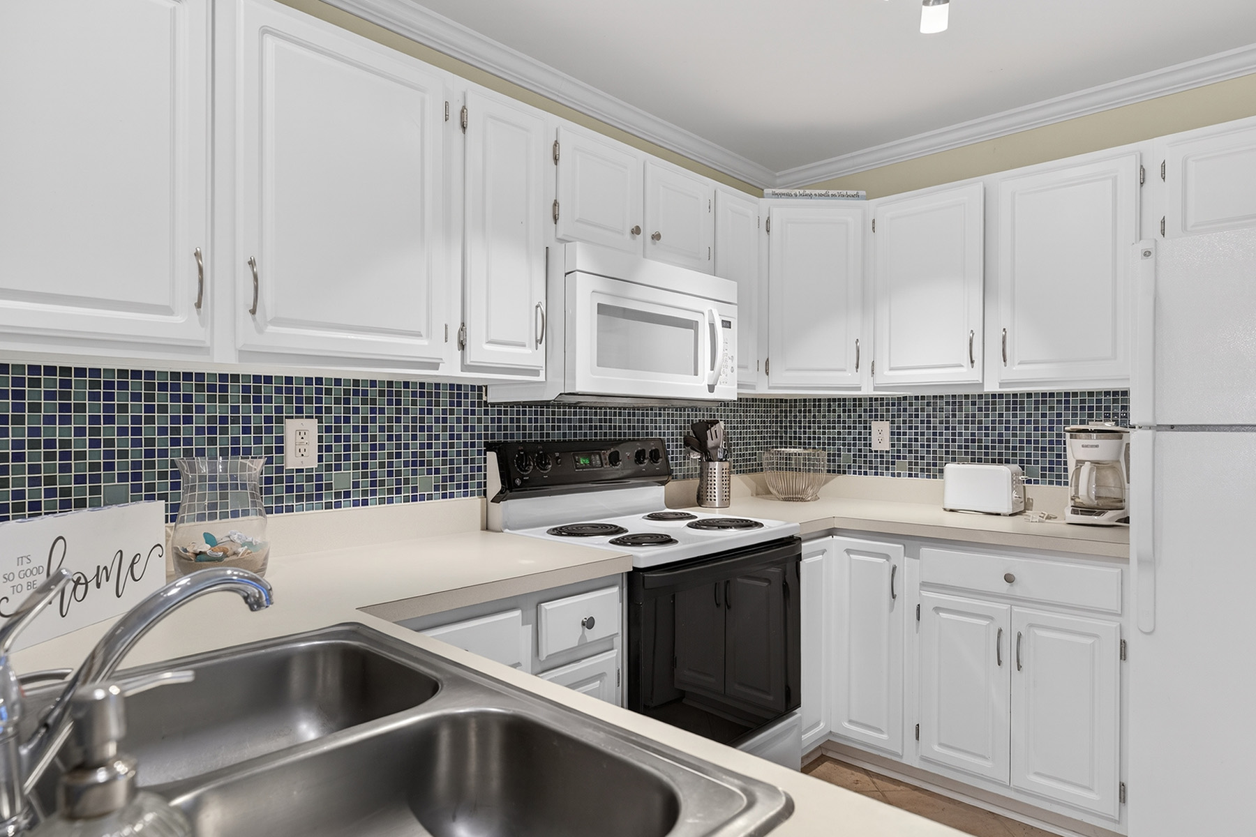 The clean, functional, and stylish kitchen has white cabinetry, ample counter space, and a breakfast bar that opens to the living area. The airy living room has direct access to a private screened porch overlooking the water.