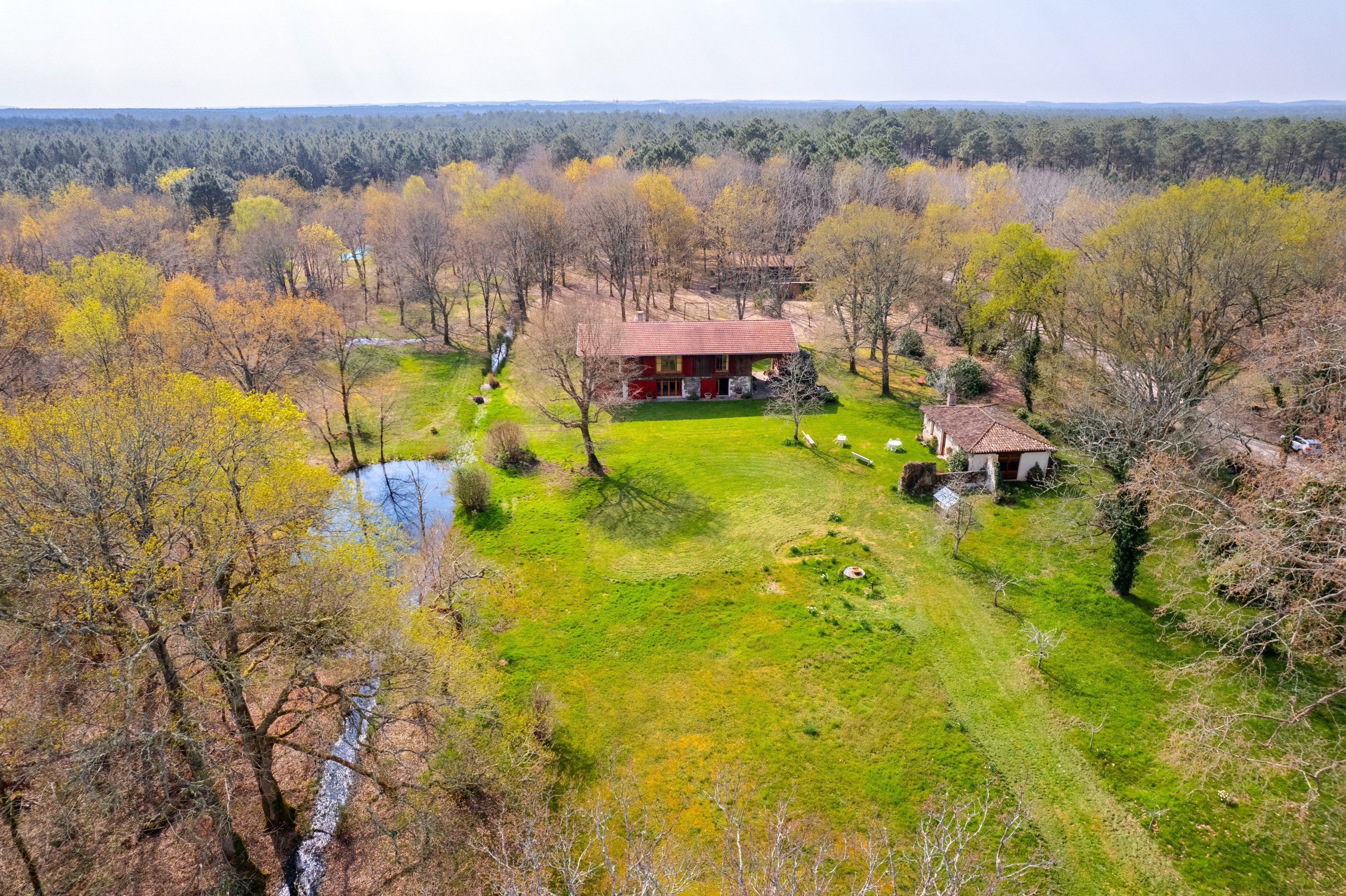 ARÈS – FOREST ESTATE WITH SWIMMING POOL SET ON 7 HECTARES Ideally located in the heart of a preserved forest environment in Arès, this rare property offers a truly unique lifestyle where nature and serenity take center stage. Nestled within approximately 7 hectares of land, the home provides an opportunity to embrace a contemporary way of living while remaining deeply connected to a rural setting. Offering around 300 sqm of living space over two levels, the house is defined by its bright volumes and fluid layout. The entrance opens onto a vast living room with fireplace – the heart of the home – extended by a beautiful open-plan kitchen. The sleeping area features five bedrooms and two bathrooms. A utility room completes the functional spaces. Outside, the property blends seamlessly into an exceptional natural environment, enhanced by a large swimming pool. A 70 sqm outbuilding to be fitted out, along with a barn, further increases the property’s potential. Just 15 minutes from the ocean beaches and 5 minutes from the shops of Arès, the property offers a rare balance between peaceful seclusion and coastal proximity. - We like: the rare location, absolute tranquility, the exceptional land size, and the many possibilities offered by the outbuildings. Contact: Cap Ferret Pyla Sotheby's International Realty +33 556 606 832 Inspiring prestige real estate, experts in luxury property, Bassin d'Arcachon, from Cap Ferret to Pyla sur Mer. contact@capferretpylasothebysrealty.com