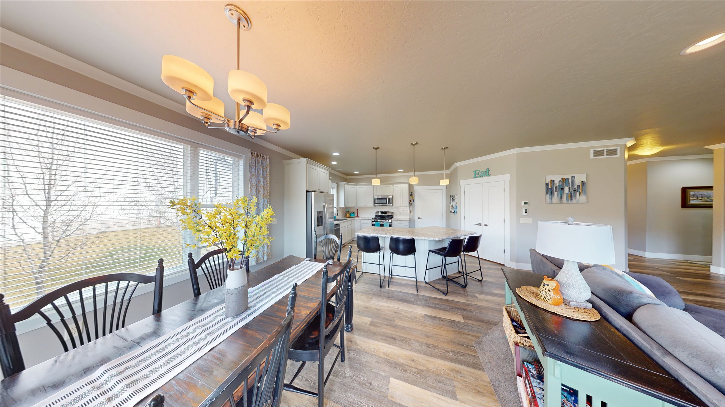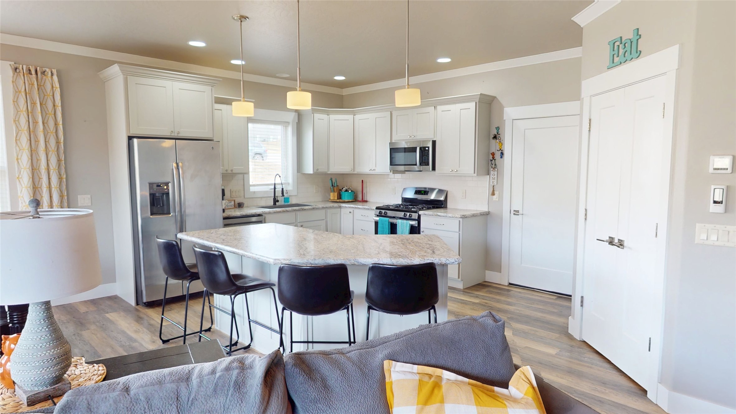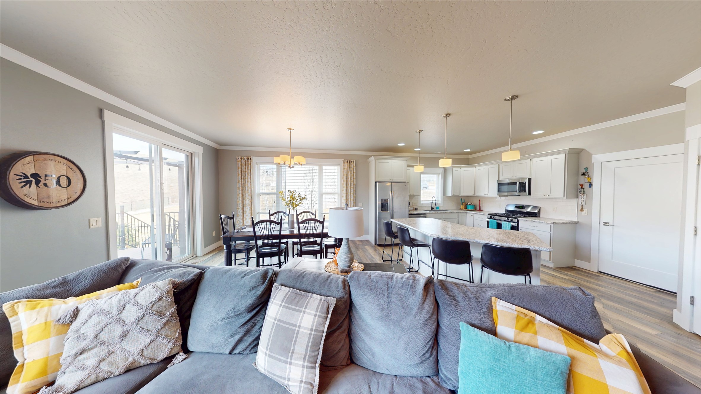Welcome to this beautifully designed ranch-style home in the highly sought-after Upper Linda Vista neighborhood! Built in 2017, this spacious 4-bedroom, 2-bath home offers 1,744 sq ft on the main level and 1,744 sq ft full daylight basement with room to grow. The main level features 9-foot ceilings and crown molding throughout, creating an open, airy feel. The living room, kitchen, and dining area are seamlessly connected - perfect for entertaining. The large kitchen island offers space for stools and storage in the kitchen, while oversized rooms provide plenty of space for gatherings. A cozy gas fireplace adds warmth, and expansive windows fill the home with natural light while showcasing views of the landscaped backyard and open space beyond. The main floor includes a generous primary suite with a well-sized closet and private bath featuring double sinks and a shower. Two additional bedrooms, a full bathroom, and a spacious front entry with a convenient wall tree complete the main level. Step outside to a fully landscaped 13,045 sq ft lot filled with vibrant perennials for seasonal color. Enjoy direct access to the open space and nearby walking trails from your fenced backyard. A pergola is ready for your outdoor retreat, and a garden area awaits your personal touch. Underground sprinklers are installed in the front and side yards, with the backyard prepped for future installation. The mostly unfinished daylight basement offers incredible potential, already featuring a completed 4th bedroom and space for a 5th bedroom, 3rd bathroom (plumbed), large family room, office, and two storage areas. Just bring your vision to finish it to your taste. Additional highlights include air conditioning, an attached two-car garage, and extra parking. This home combines comfort, space, and future potential in one of the area's most desirable locations - don't miss it!