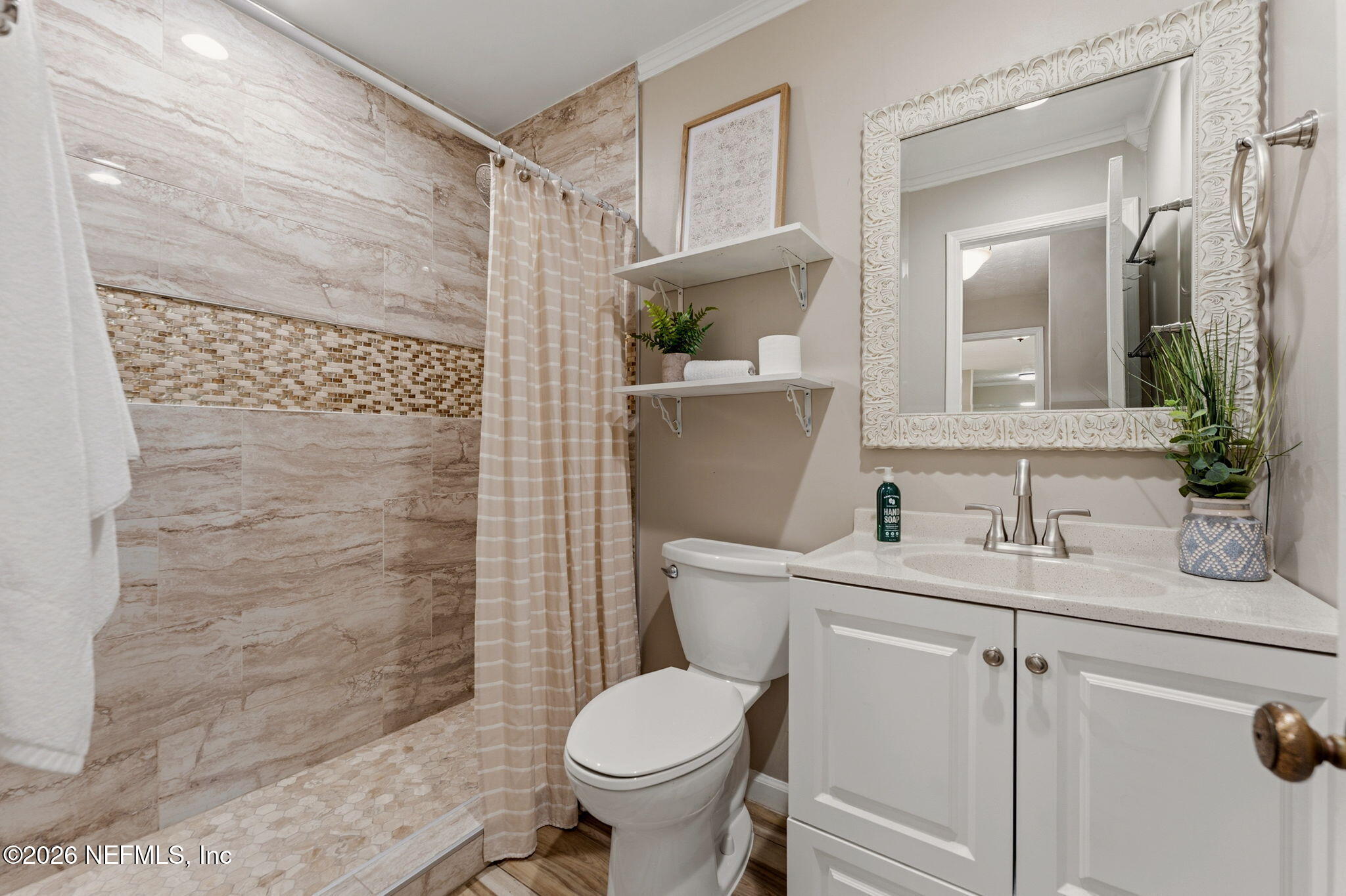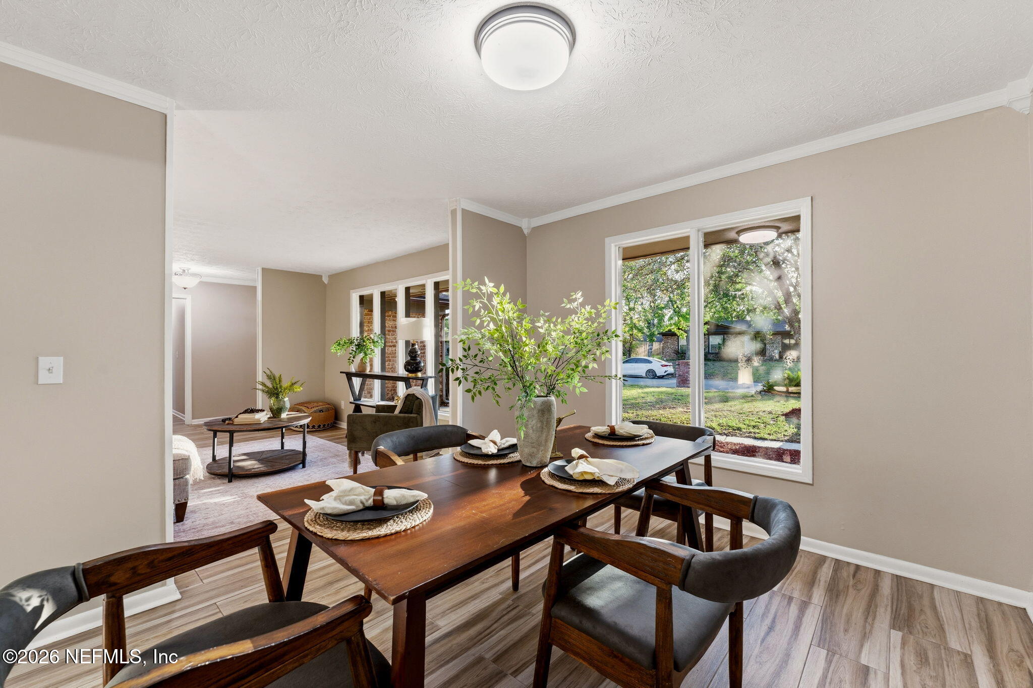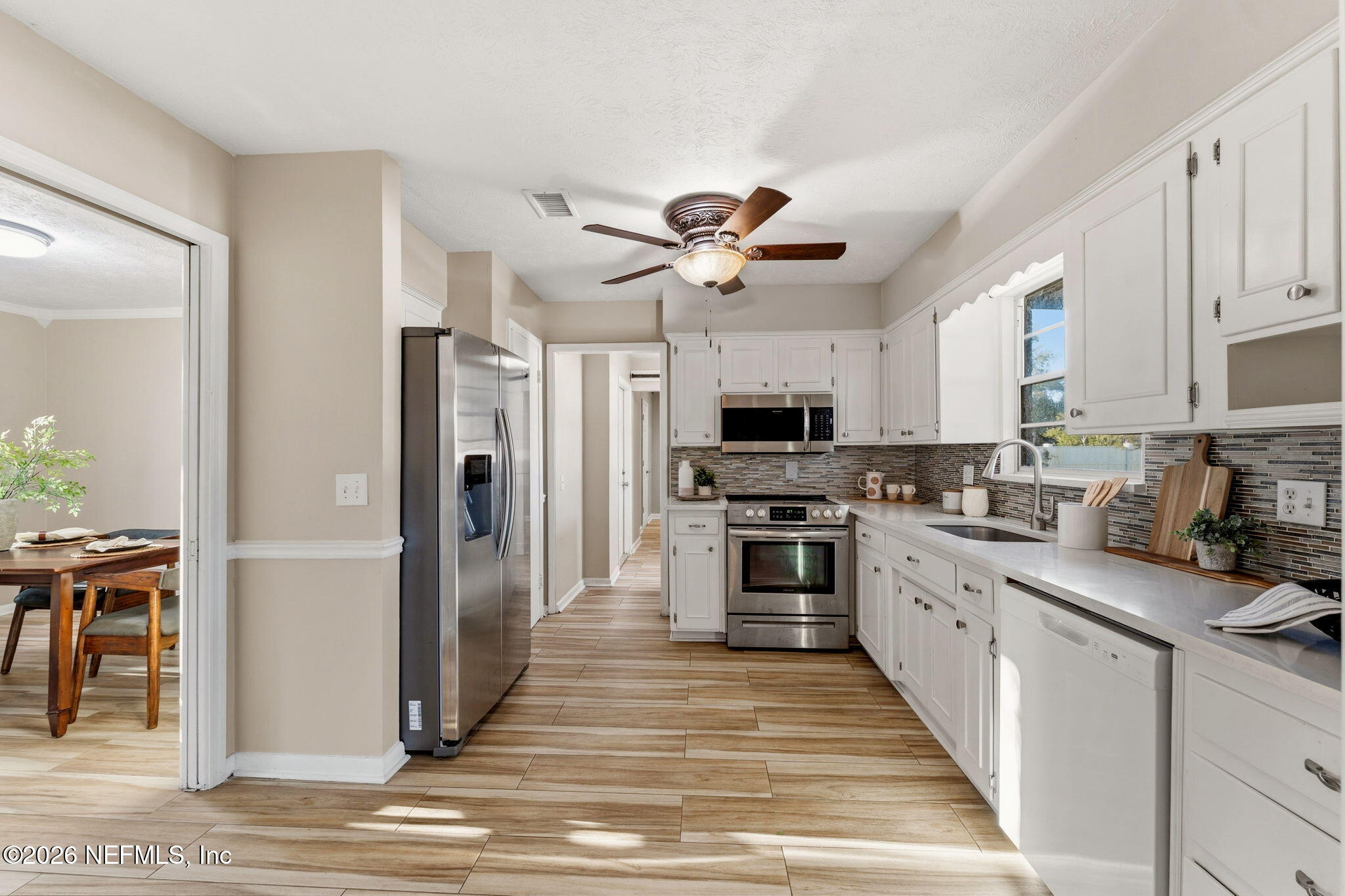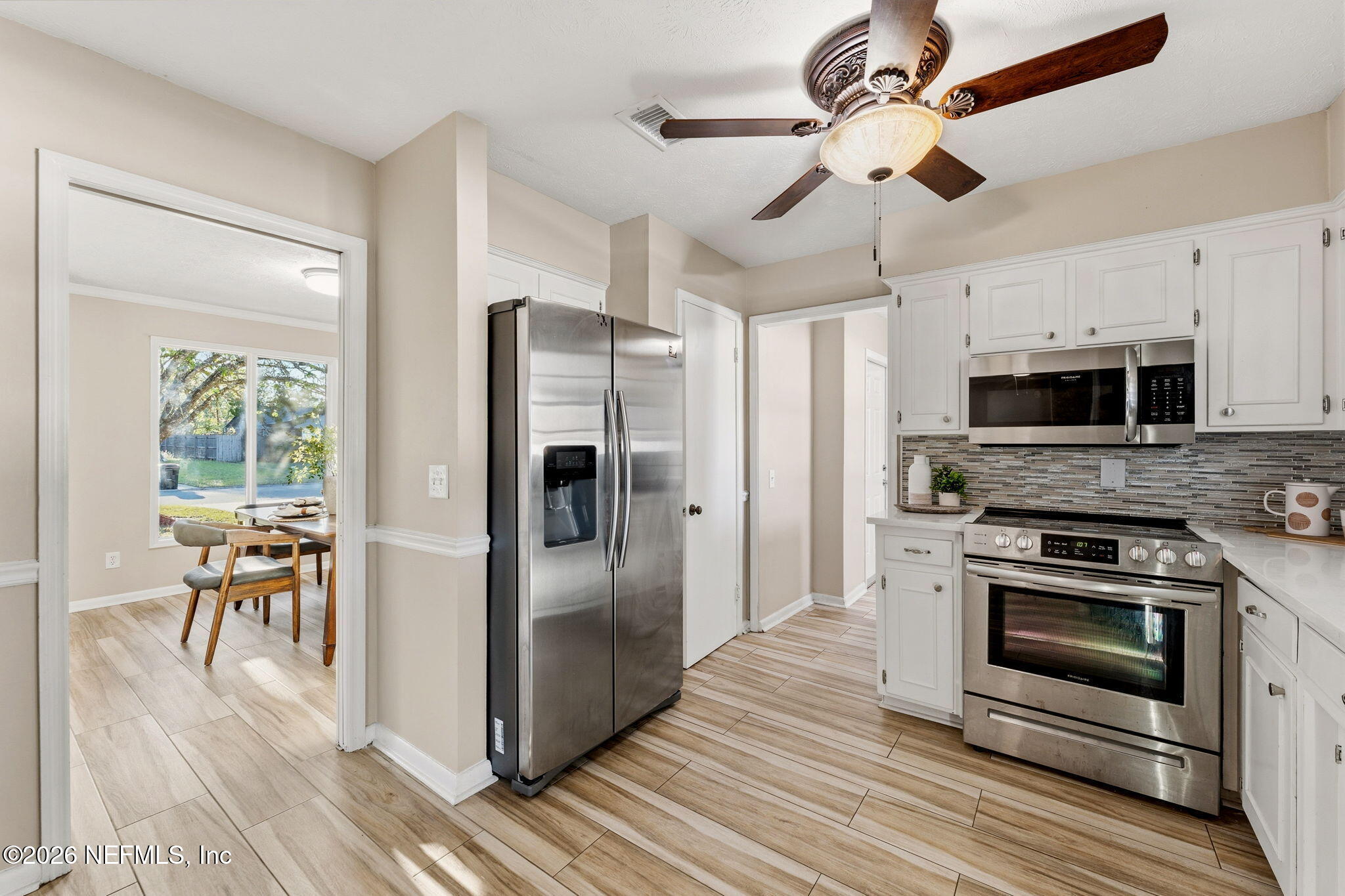 Welcome home to easy Florida living in the heart of Orange Park! This inviting 3-bedroom, 2-bath home is designed for both comfort and connection, featuring a cozy brick fireplace and multiple living spaces including a formal living room, spacious family room, and a separate dining room--perfect for gathering with family and friends. The beautifully updated bathrooms offer modern walk-in showers, while wood plank tile floors add style and durability throughout. At the heart of the home, the kitchen with stainless steel appliances flows effortlessly into everyday living. Step outside and unwind on the large screened-in porch--ideal for morning coffee, evening relaxation, or weekend entertaining--overlooking a generously sized vinyl-fenced backyard with plenty of room to play, garden, or host. With an inside laundry room, mudroom, and no HOA or CDD fees, this home offers the space, flexibility, and lifestyle you've been looking for.