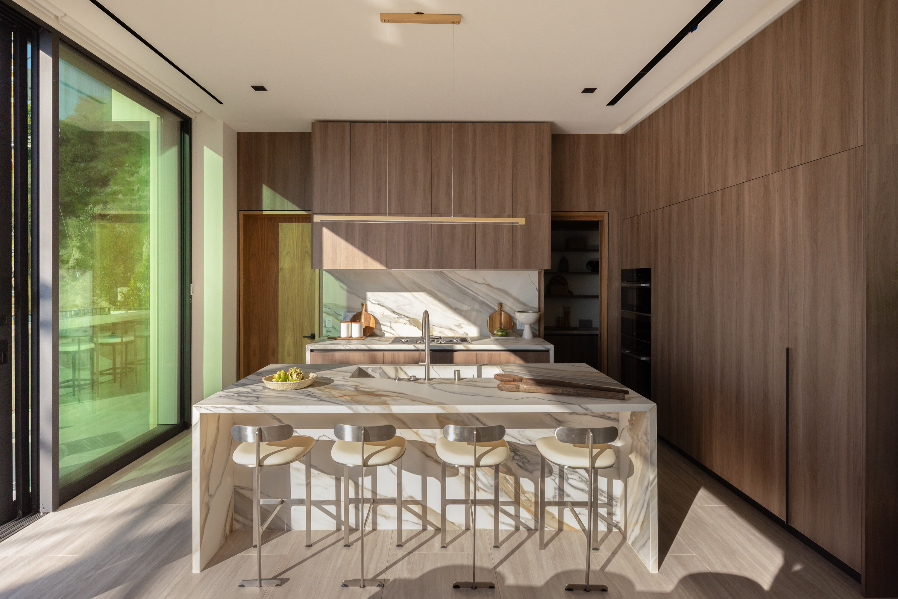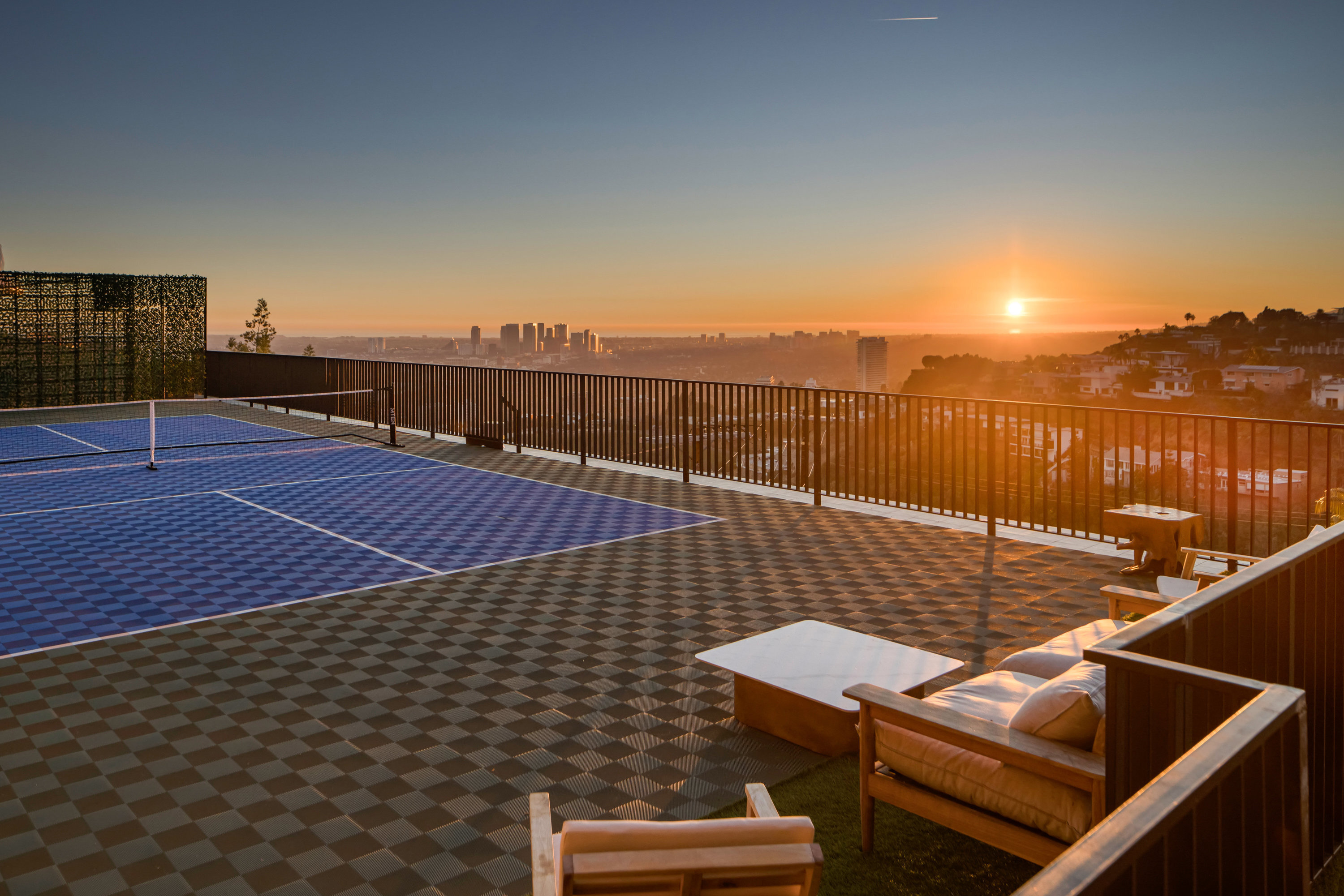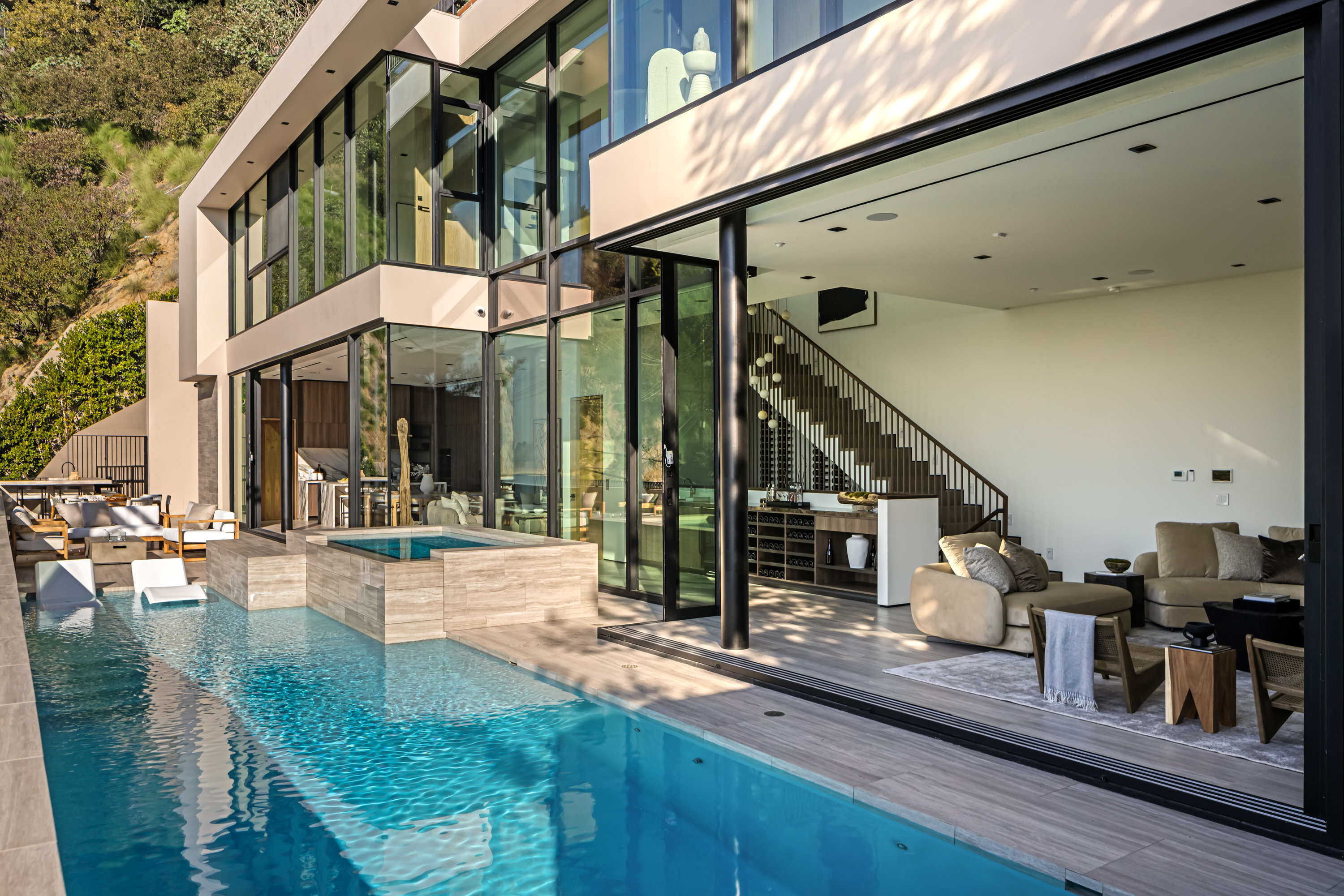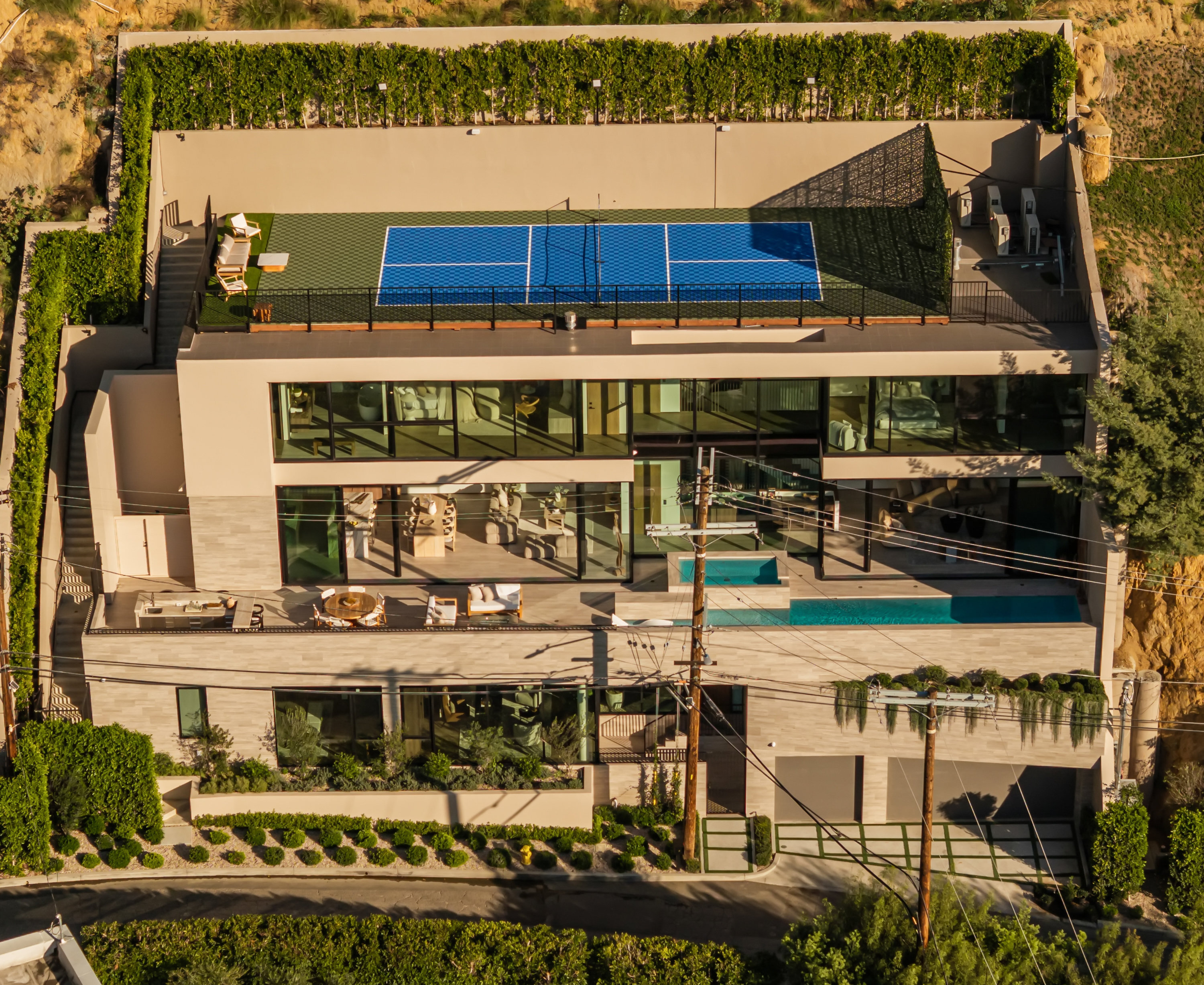 This newly constructed Classic Modern Hollywood Hills residence spans approximately 6,000 square feet and reflects a level of quality, design, and execution rarely found in new construction. Conceived and built by well known, experienced, design-driven team, the home emphasizes thoughtful architecture, refined materials, and seamless livability throughout. The floor plan offers four bedrooms plus a dedicated office, anchored by wide-plank walnut floors and travertine stone that bring warmth and cohesion to the interiors. The kitchen is outfitted with a full suite of Miele appliances. Floor-to-ceiling Fleetwood doors and windows frame sweeping ocean and city views while creating effortless indoor-outdoor flow. Every element of the home was carefully considered, from the proportions of the living spaces to the precision of the finishes. Amenities include an elevator, full smart-home integration, generous storage, wet bar, and wine refrigeration. A three-car garage with additional driveway parking an uncommon luxury in the Hills adds both convenience and functionality. Outdoor spaces are equally well executed, featuring a pool and spa, outdoor kitchen, full bar, fire pit, and a private pickleball court, all designed to maximize privacy, views, and year-round entertaining. This is a highly refined, turnkey offering that blends architectural integrity with modern luxury living in one of Los Angeles' most sought-after settings.