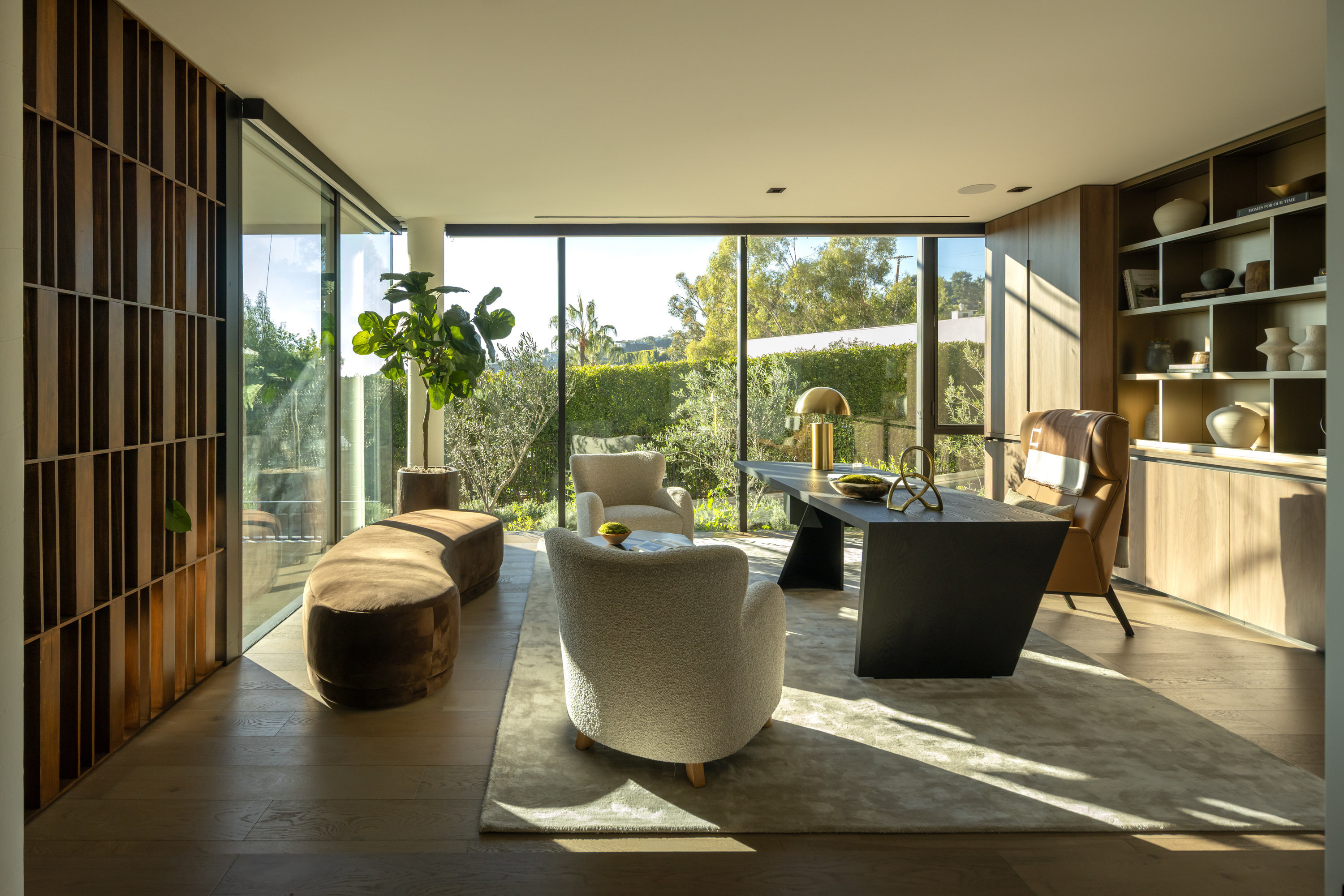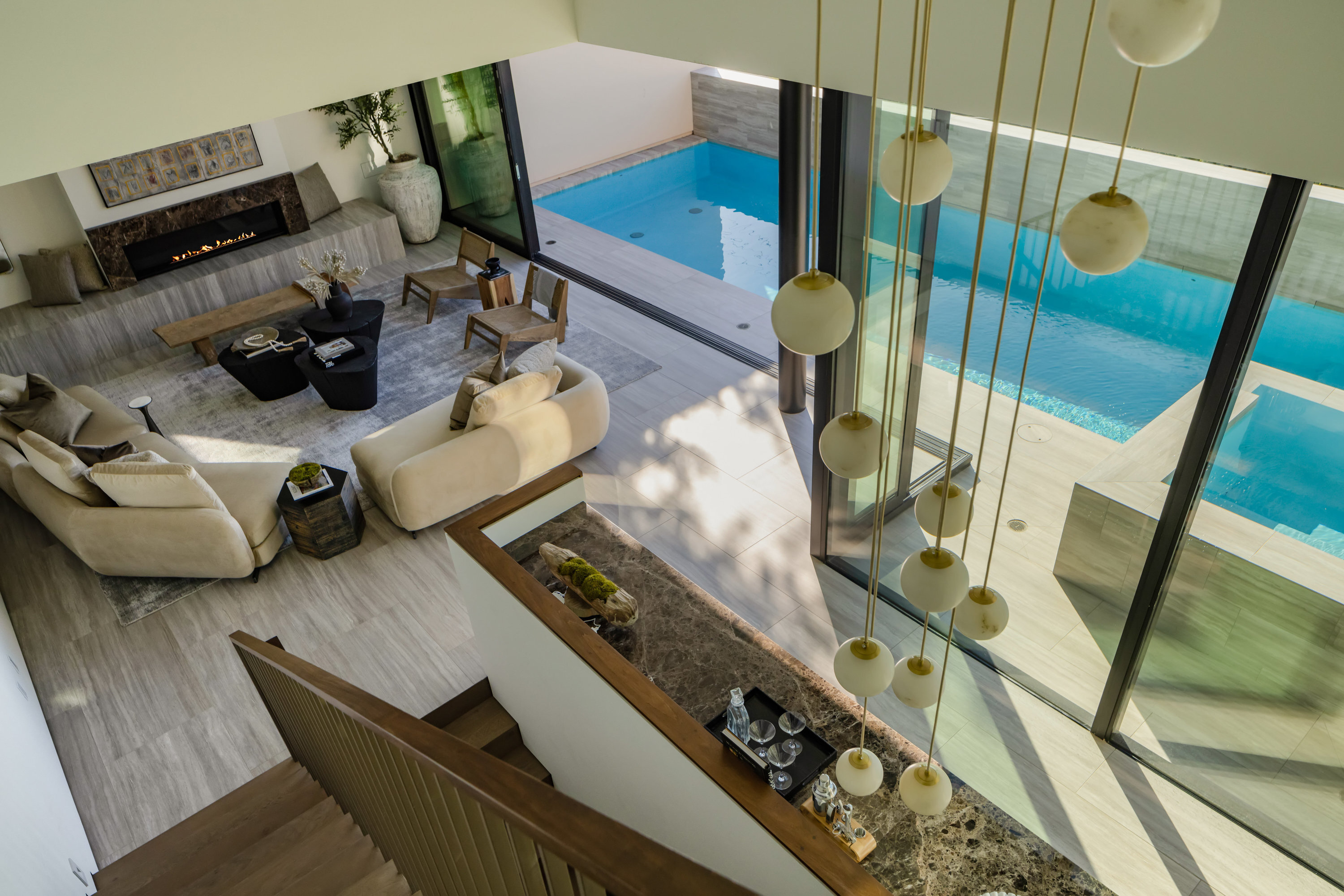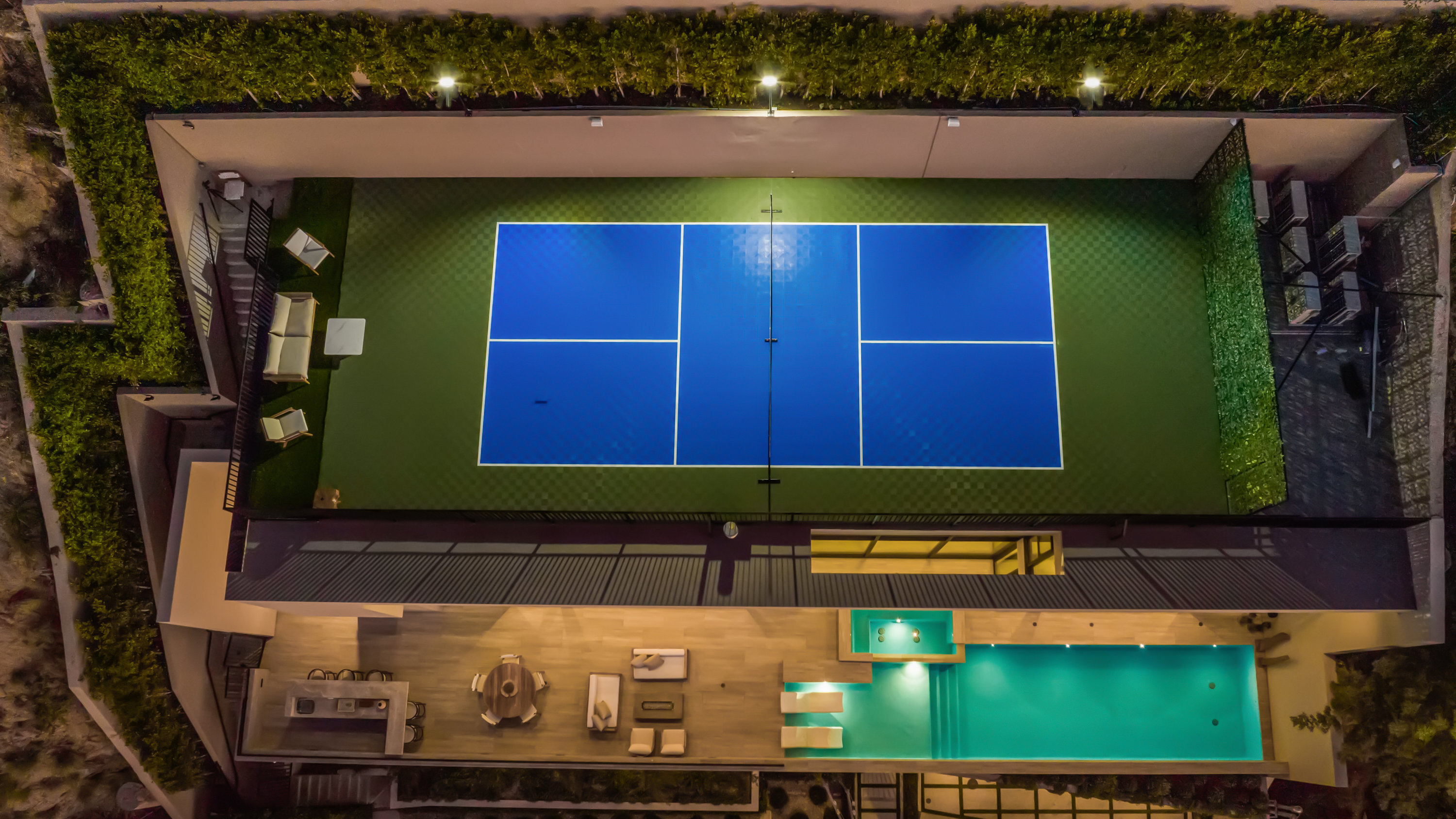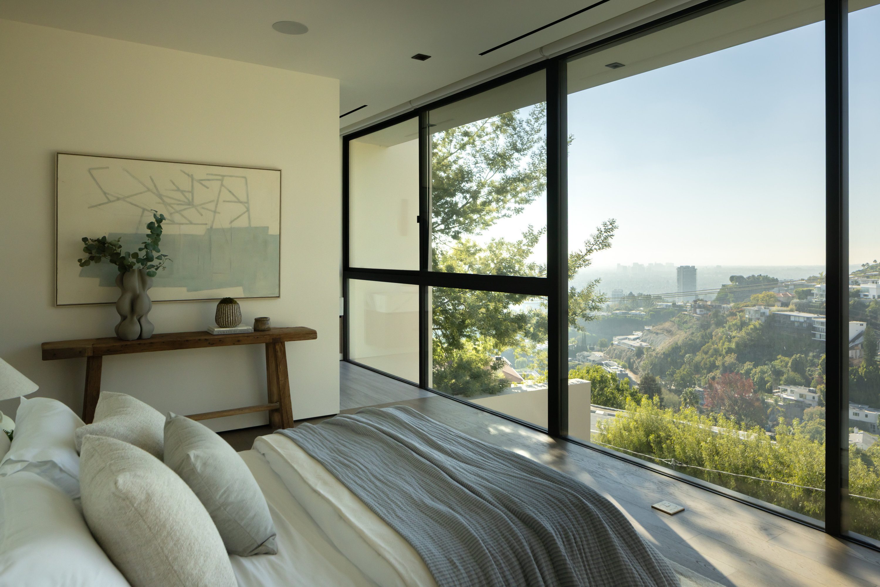 This newly constructed Classic Modern Hollywood Hills residence spans approximately 6,000 square feet and reflects a level of quality, design, and execution rarely found in new construction. Conceived and built by well known, experienced, design-driven team, the home emphasizes thoughtful architecture, refined materials, and seamless livability throughout. The floor plan offers four bedrooms plus a dedicated office, anchored by wide-plank walnut floors and travertine stone that bring warmth and cohesion to the interiors. The kitchen is outfitted with a full suite of Miele appliances. Floor-to-ceiling Fleetwood doors and windows frame sweeping ocean and city views while creating effortless indoor-outdoor flow. Every element of the home was carefully considered, from the proportions of the living spaces to the precision of the finishes. Amenities include an elevator, full smart-home integration, generous storage, wet bar, and wine refrigeration. A three-car garage with additional driveway parking an uncommon luxury in the Hills adds both convenience and functionality. Outdoor spaces are equally well executed, featuring a pool and spa, outdoor kitchen, full bar, fire pit, and a private pickleball court, all designed to maximize privacy, views, and year-round entertaining. This is a highly refined, turnkey offering that blends architectural integrity with modern luxury living in one of Los Angeles' most sought-after settings.
