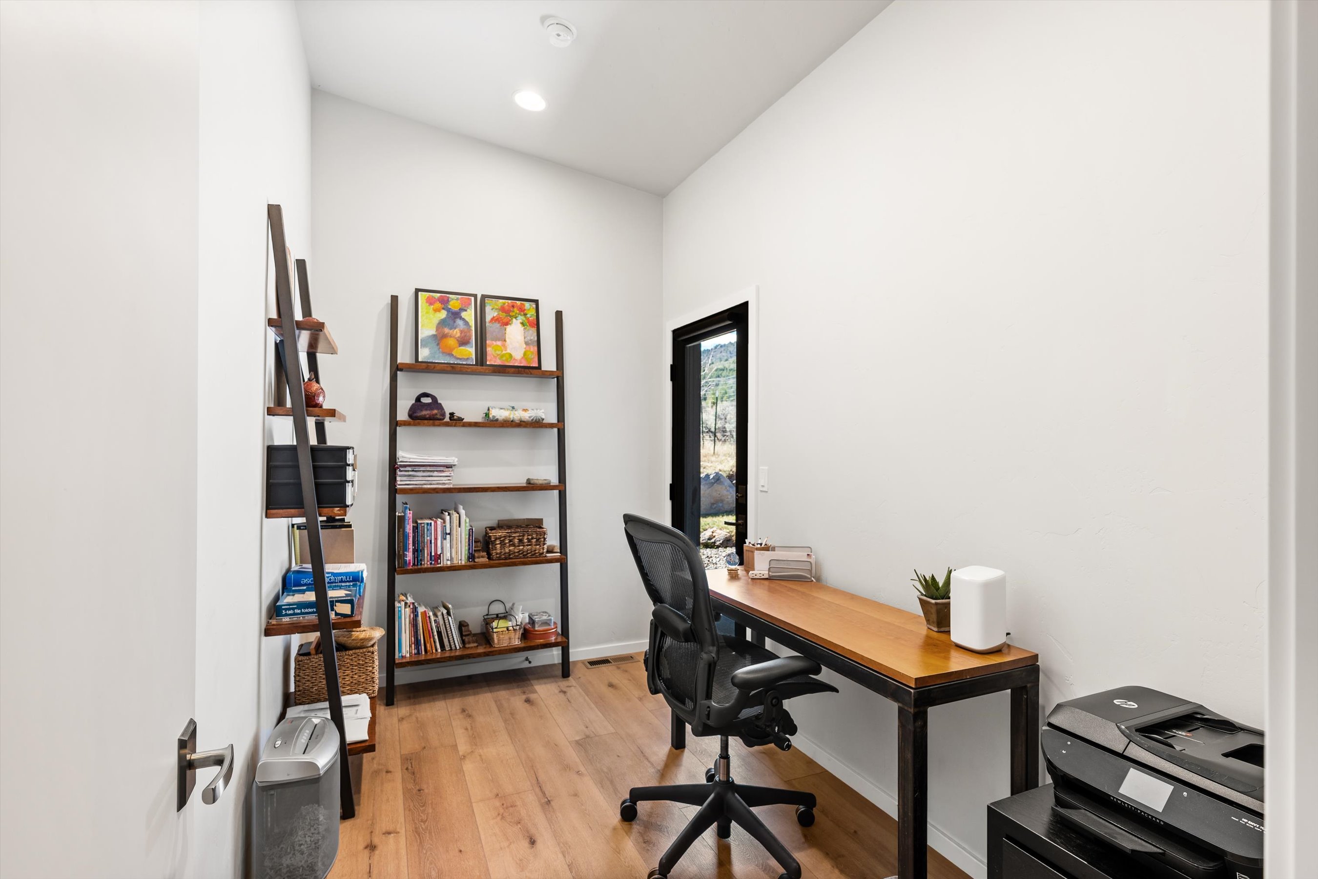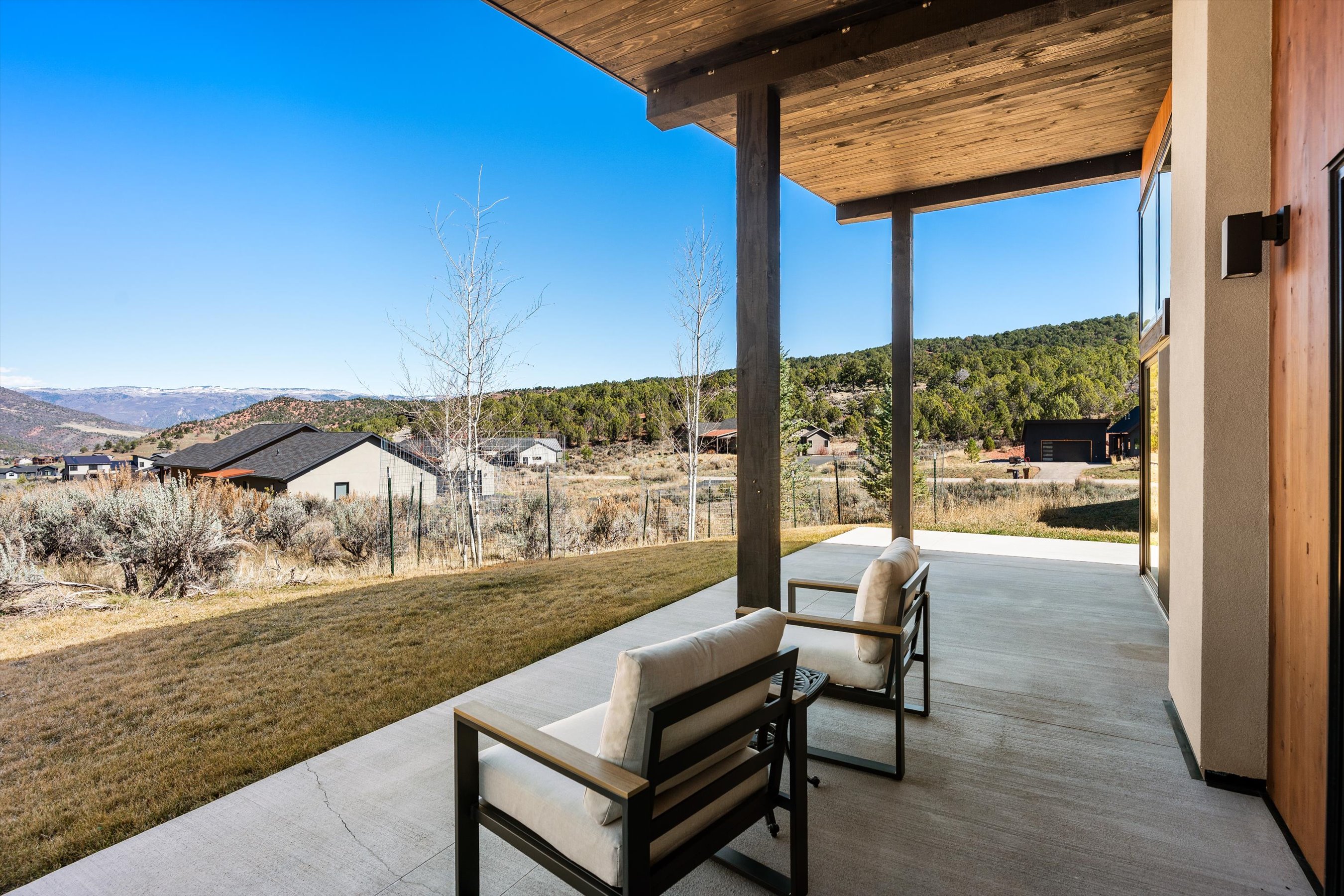 Stylish Contemporary home with panoramic mountain views from inside or from multiple covered decks. Large windows and vaulted ceilings create abundant light while back of the subdivision setting and over an acre lot provide privacy. Features include gourmet kitchen with modern cabinetry, single level living, luxury master suite with steam shower, custom walk-in closet, and covered deck. Private study, oversize 2 car garage, metal roof, landscaping with irrigation, central air conditioning, and easy access to hiking and biking trails.