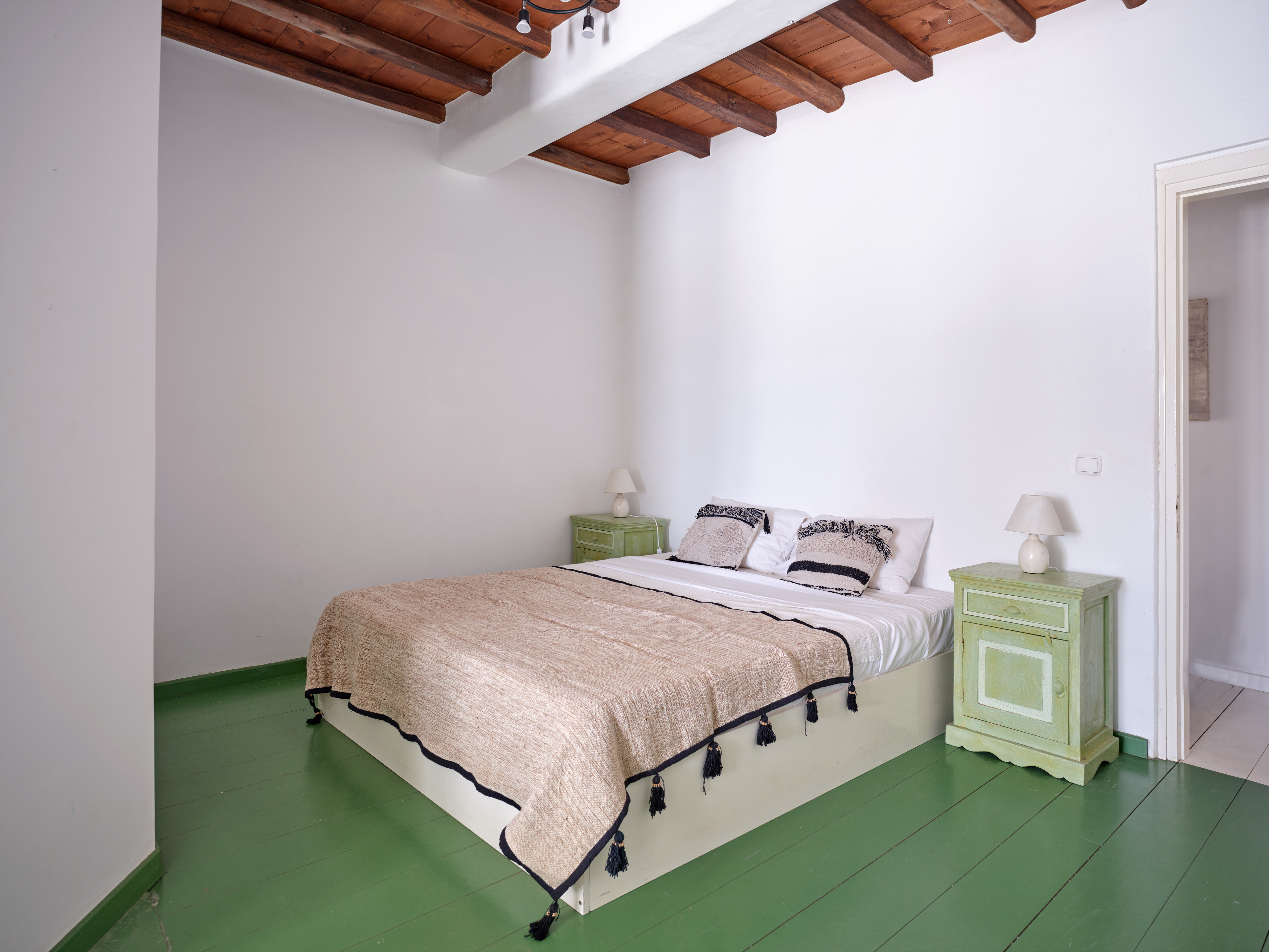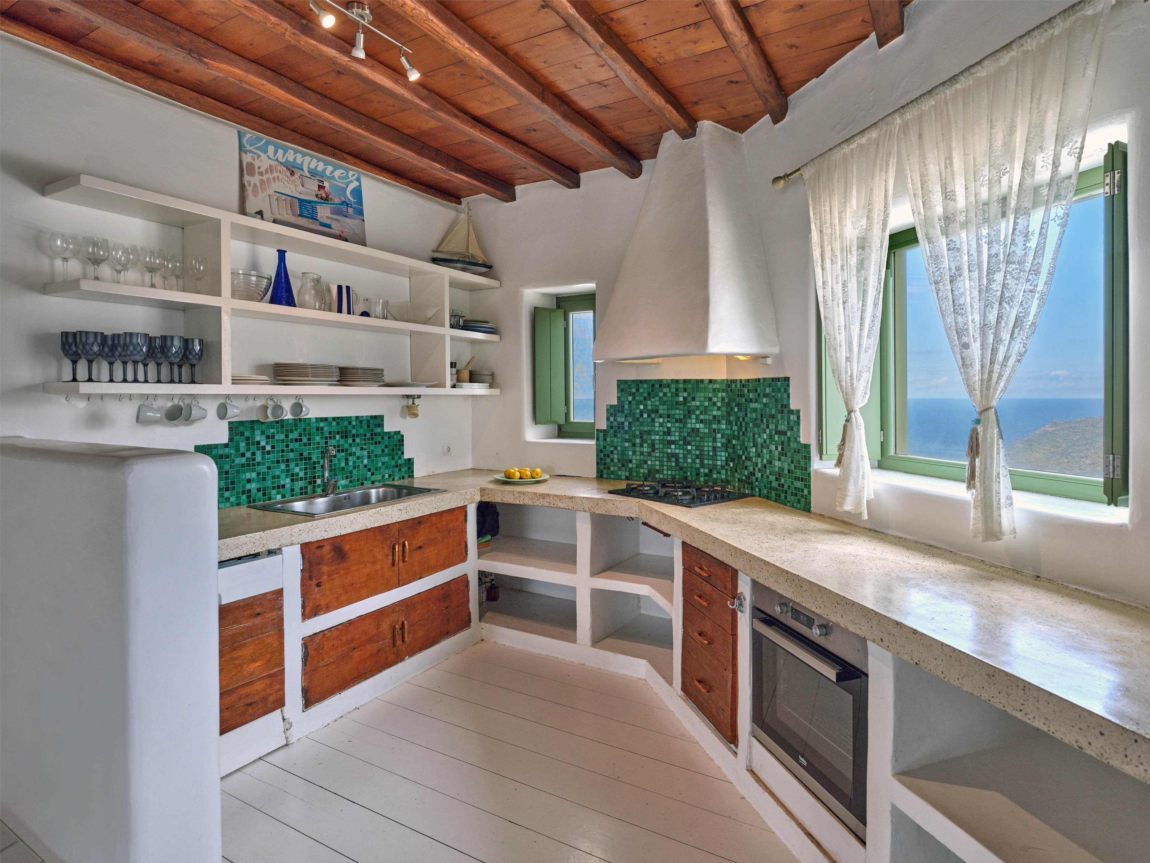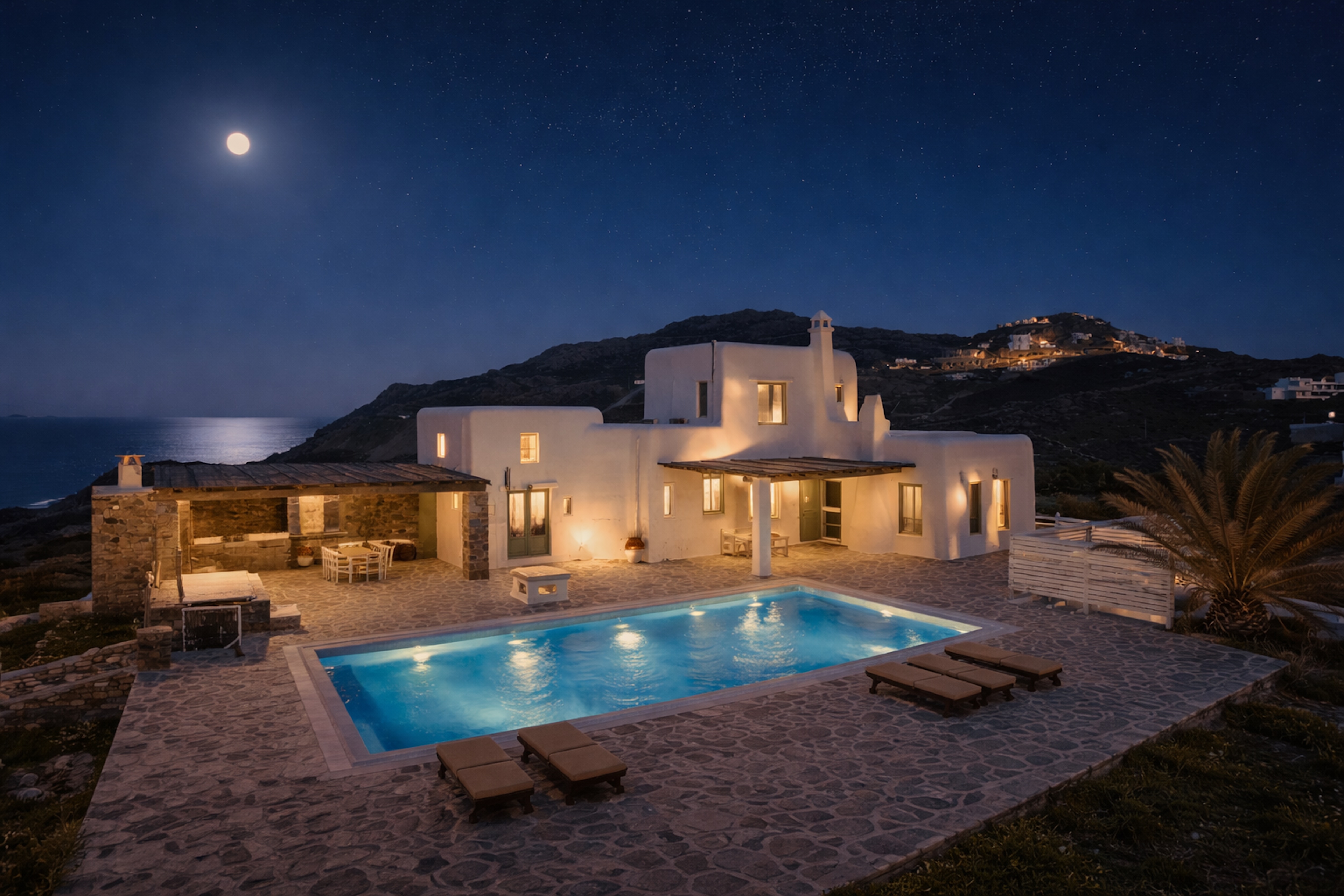 The main residence forms the heart of the villa, offering an elegant living room, a fully equipped kitchen, a guest bathroom and four beautifully appointed en-suite bedrooms, including a charming loft suite. Outdoors, a shaded pergola-covered patio sets the scene for long, unhurried afternoons, with generous seating, a barbecue for al fresco dining, and a swimming pool that gazes out over the sea.