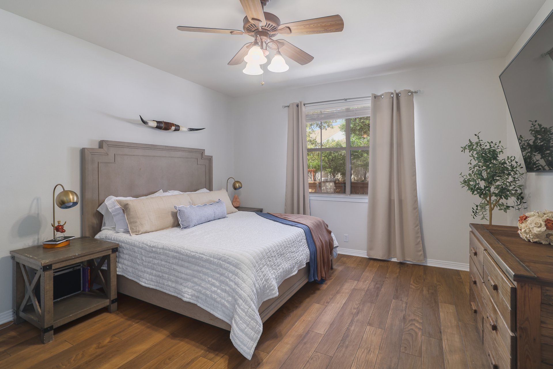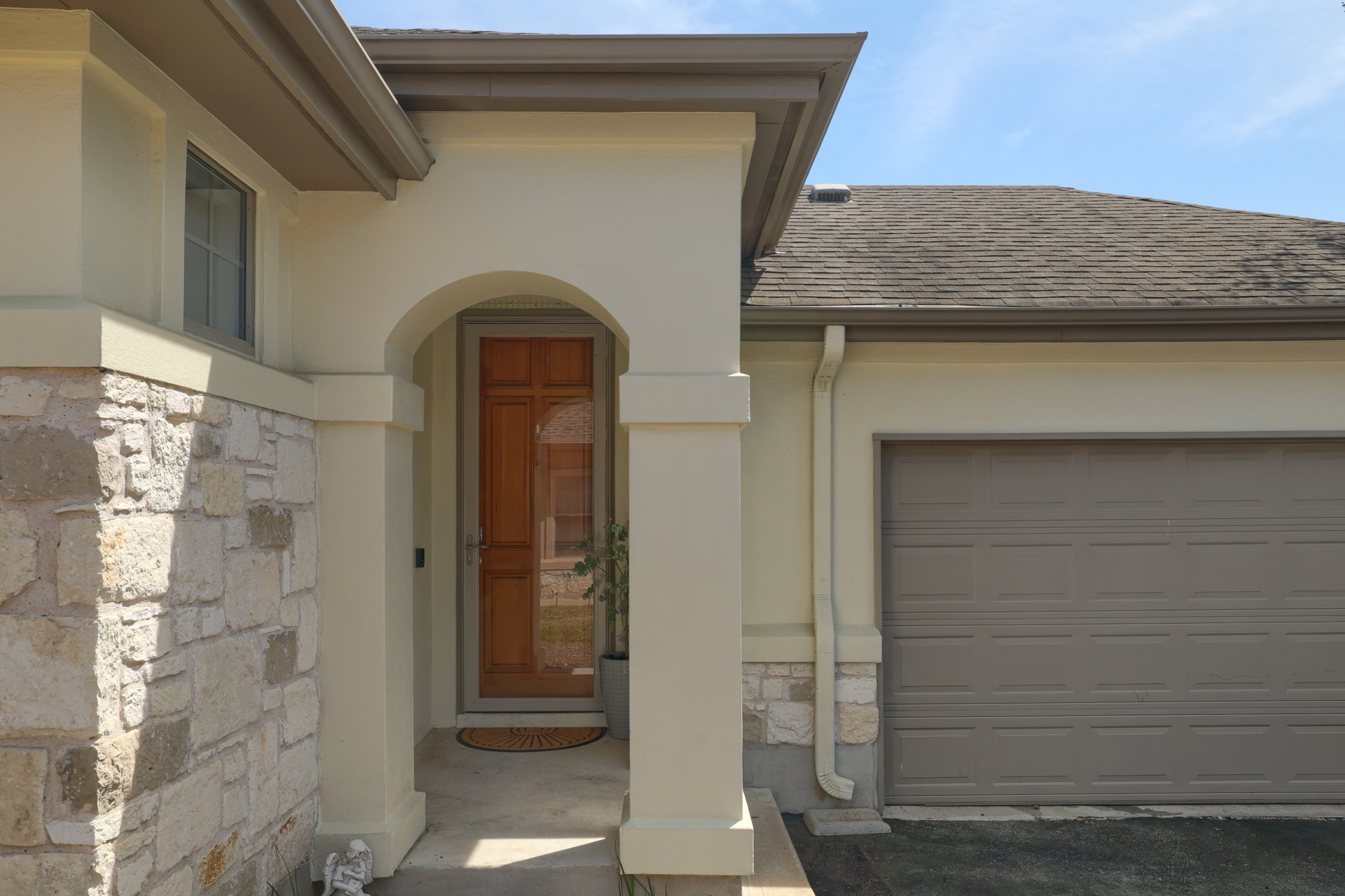 Located in the desirable Gardens of Balcones, this one-story stand-alone condo features a charming stone and stucco exterior and a thoughtfully designed layout. Inside, you’re welcomed by arched doorways, high ceilings, and an open-concept living space that flows seamlessly from the kitchen to the living room. Large, tall windows fill both the living and dining areas with abundant natural light, creating a bright and inviting atmosphere. The living room is anchored by a cozy gas log fireplace with an automatic switch, perfect for relaxing evenings at home. A versatile third bedroom offers flexibility for guests, a home office, or additional living space, complete with elegant French doors. Step outside to a covered back patio, fenced yard with turf. Tucked away in a quiet location, this home is part of a beautifully maintained community known for its charm and tranquility.