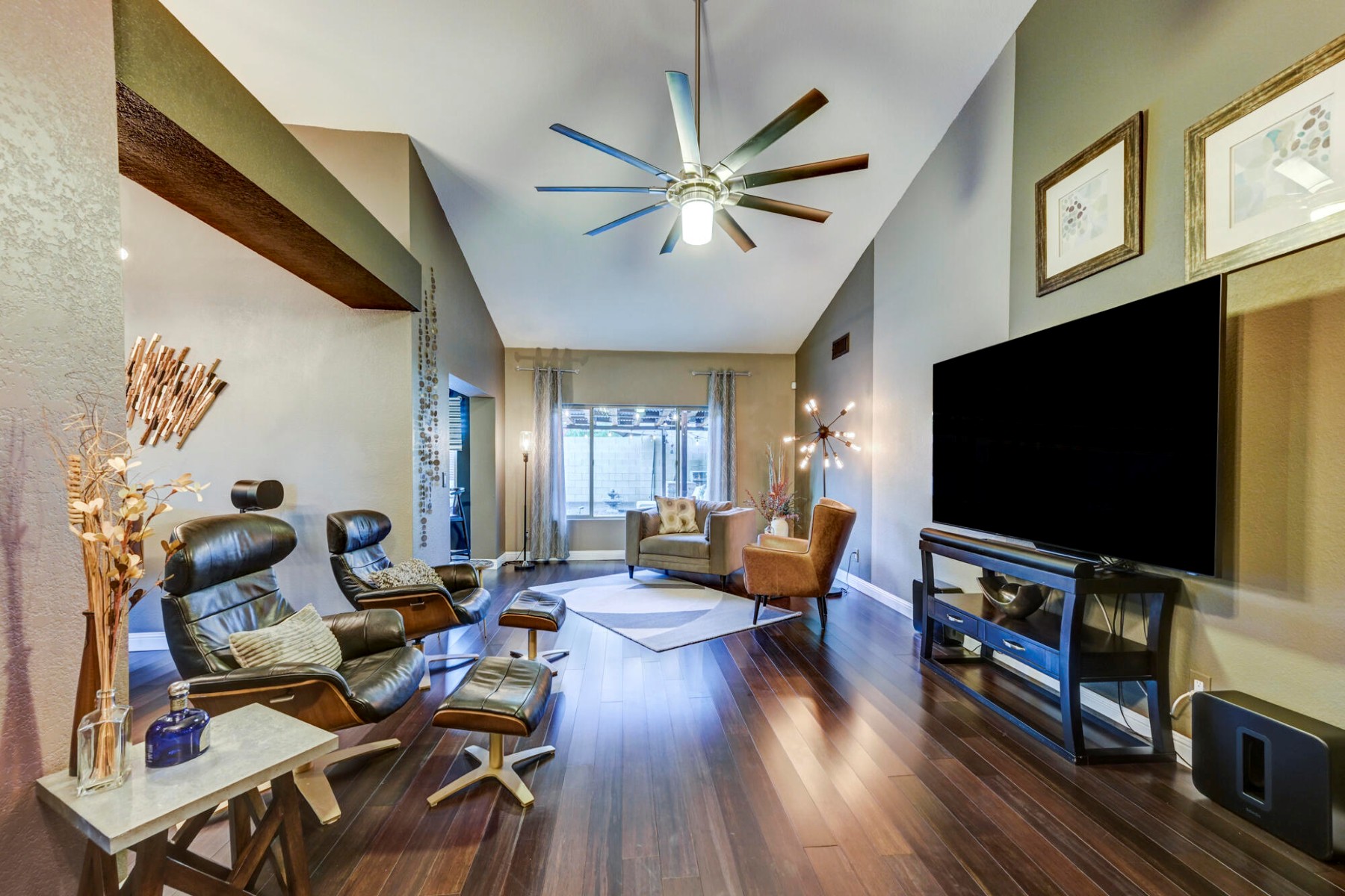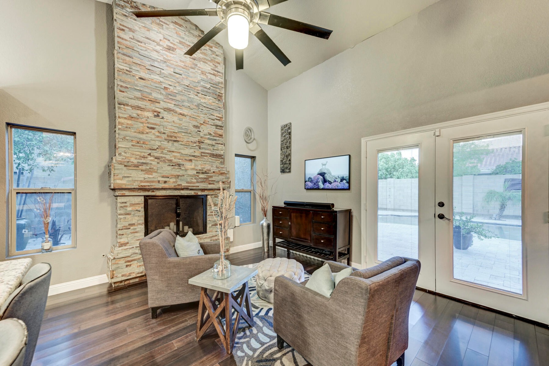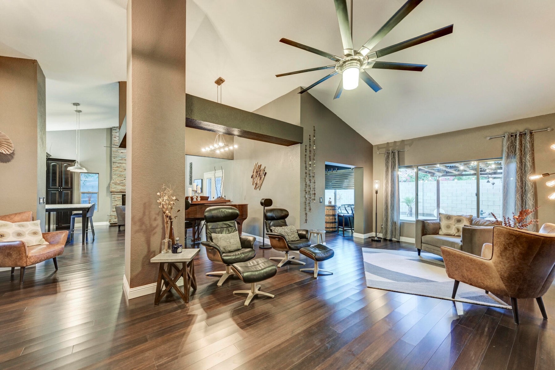 NO HOA in Tempe! Seller Open to Interior paint allowance. Discover the perfect blend of comfort and charm in this warm and inviting single-level 3-bedroom, 2-bath home. Vaulted ceilings and rich bamboo wood flooring create an open, airy feel, while the eat-in kitchen with breakfast bar seamlessly connects to the great room--making gatherings with family and friends effortless. Retreat to the serene primary suite, complete with a beautifully updated ensuite and spacious walk-in closet. Two additional bedrooms offer flexibility for guests, family, or a home office. Step outside and experience true Arizona living in your private north-facing backyard oasis--featuring a sparkling pool, expansive covered patio, and built-in BBQ--ideal for weekend entertaining or quiet evenings under the stars.