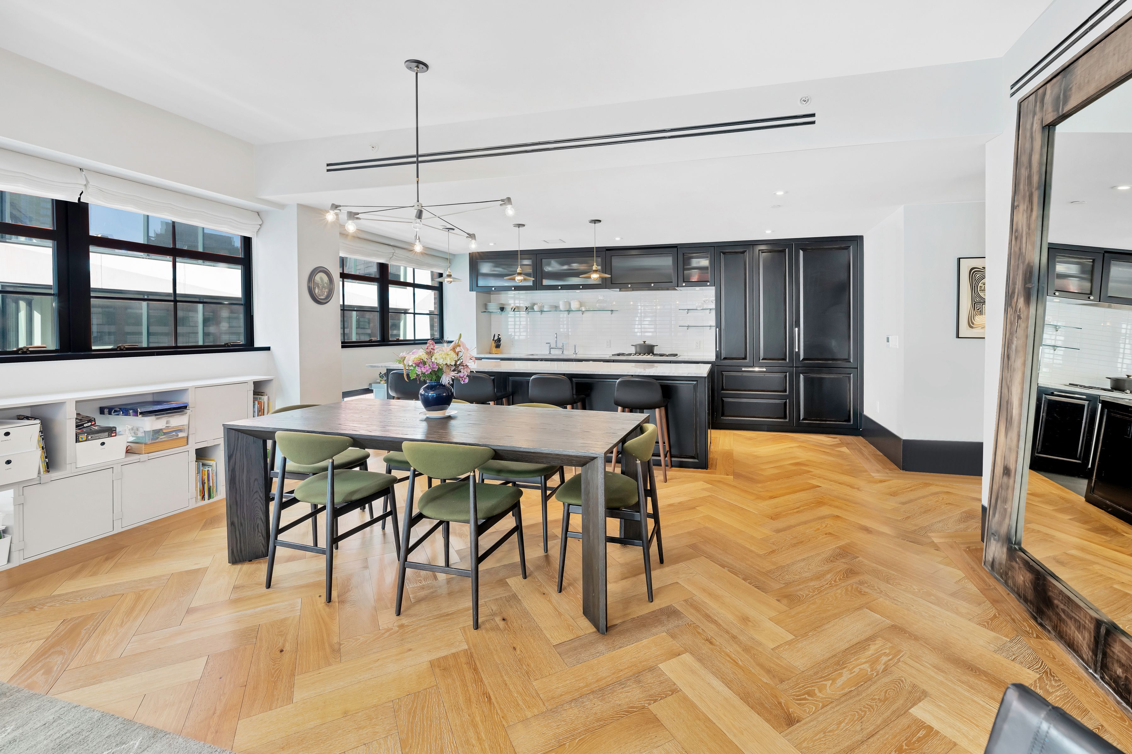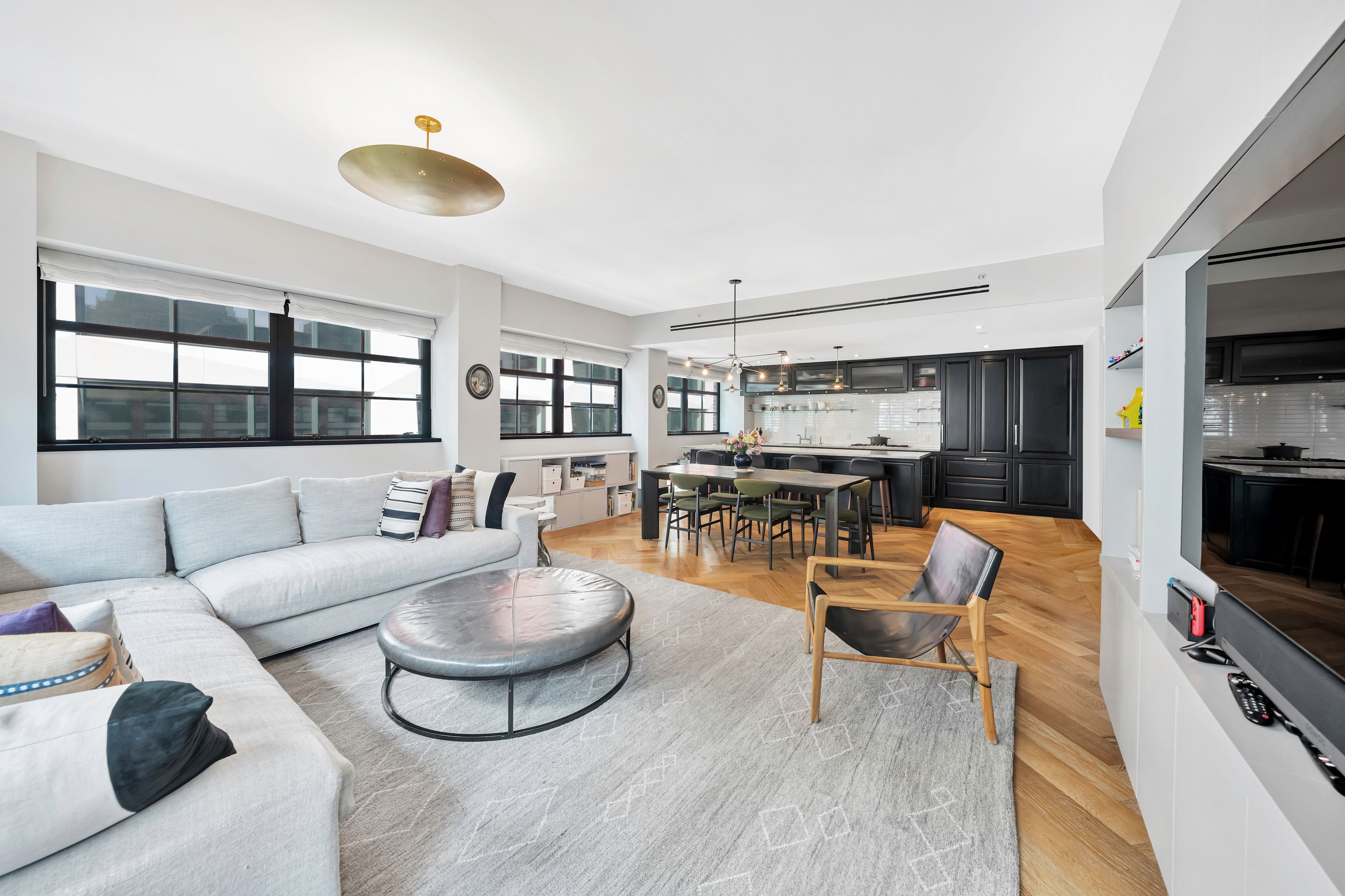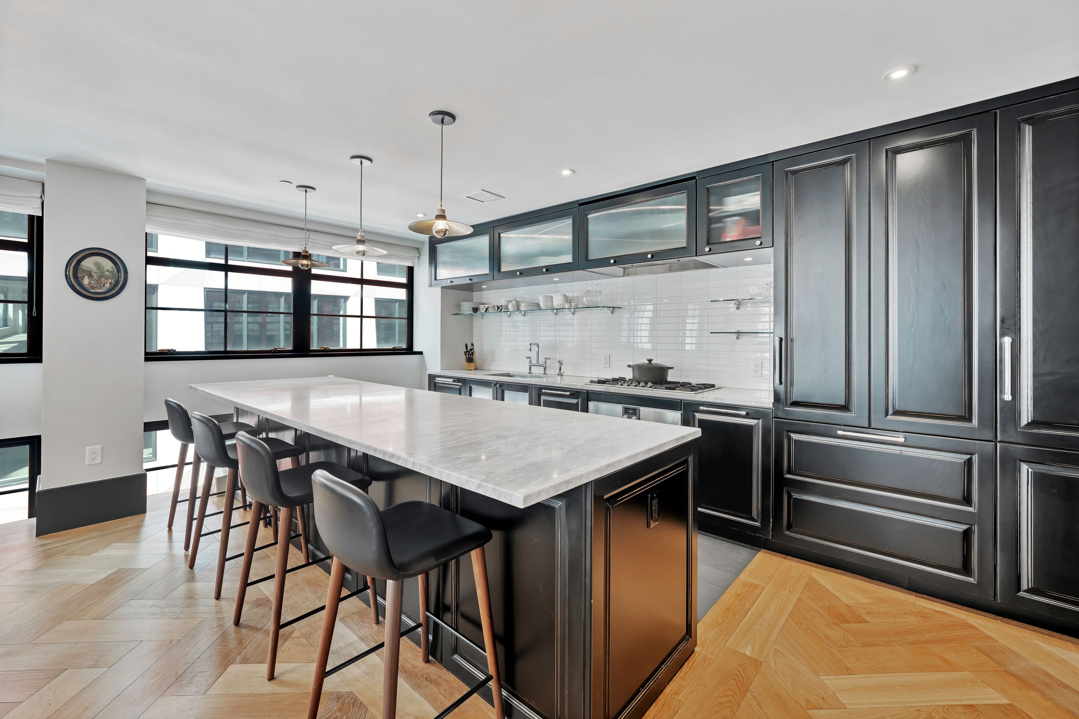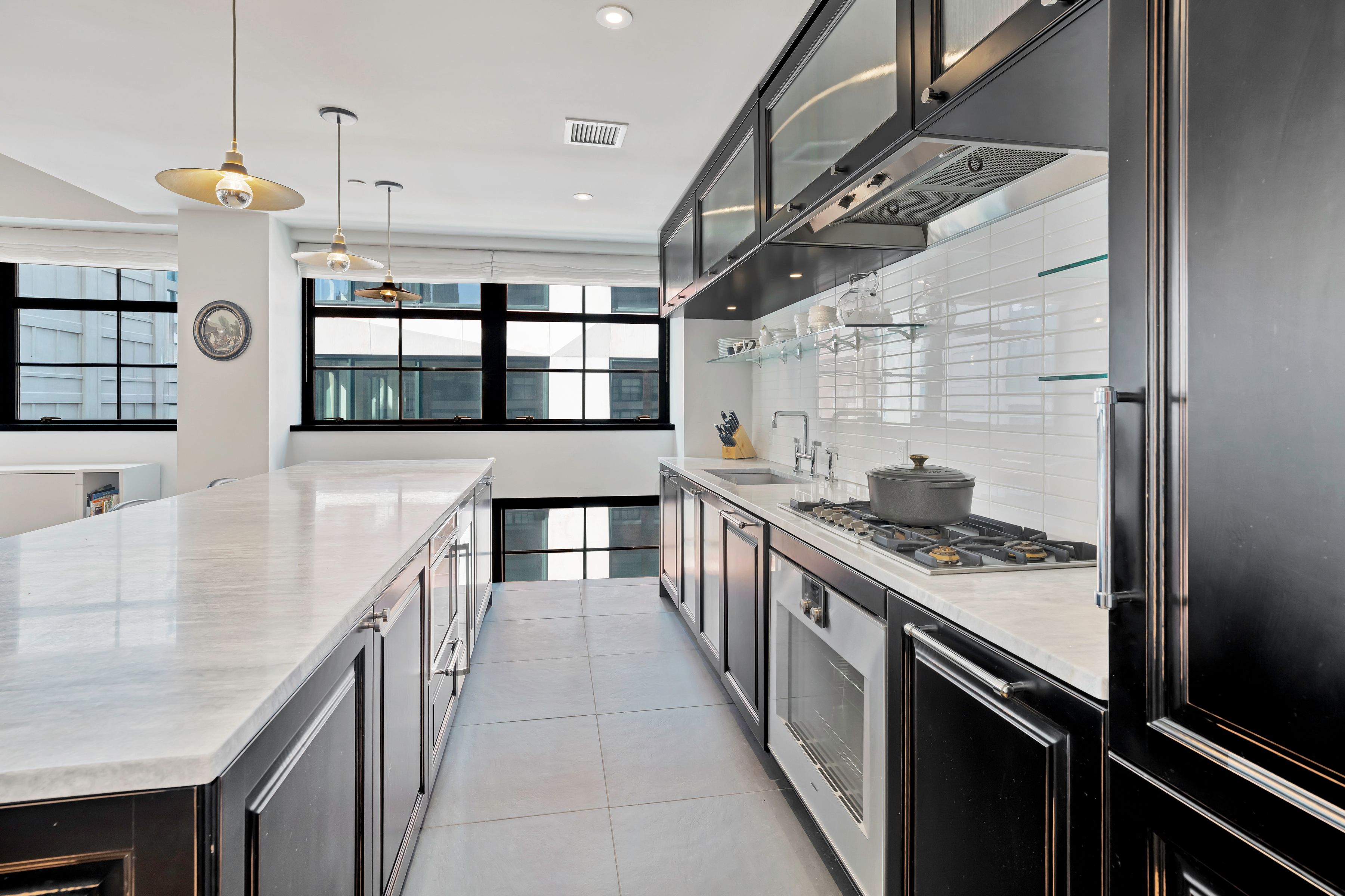 Spanning approximately 1,945 +/- square feet, this spacious and well-proportioned three-bedroom, three-and-a-half-bath home seamlessly blends refined luxury with a contemporary edge. A loft-like ambiance is thoughtfully integrated with modern design elements throughout. Originally transformed from a warehouse by the architectural firm ODA, the home reflects a distinctive level of design and craftsmanship. 5C is positioned on the northwest corner and is wrapped in striking casement windows, filling the space with abundant natural light. An inviting foyer with double-door closets welcomes you upon entry, leading to a gallery hallway just beyond, complete with an adjacent powder room. The expansive living and dining area features dual exposures, offering abundant natural light and open views, making it ideal for both entertaining and everyday living. The open chef’s kitchen is anchored by a striking La Rochelle Gris marble slab island and custom cabinetry by Aster Cucine. Fully integrated Gaggenau appliances, along with a wine refrigerator, complete this thoughtfully designed space suited for any culinary enthusiast. The generously sized primary bedroom is enhanced by custom-designed, fully fitted closets. Its en-suite bath is a true showpiece, featuring marble flooring and countertops, a double vanity with copper accents, and a glass-enclosed wet room complete with a rain shower and deep soaking tub. The second and third bedrooms are both well-proportioned and offer custom closets; one includes an en-suite bath, while the other is served by a full bathroom just outside. Both bathrooms are beautifully appointed with custom white oak vanities, nickel fixtures, and Tundra Gray honed marble countertops. Completing this exceptional home are elegant oak herringbone floors, central air conditioning, automatic shades, an in-unit washer and dryer, and abundant custom storage found throughout. Originally an industrial warehouse prior to its conversion in 2016, 51 Jay Street comprises 75 units across seven stories and features a fully attended lobby with polished concrete flooring and steel tracks inspired by the original rails that once carried goods throughout the building. Additional amenities include a full-time doorman, fitness center, residents’ lounge, children’s playroom, pet washroom, bicycle storage, parking, and an expansive private rooftop with areas for relaxing and entertaining, including an outdoor kitchen. 51 Jay Street is conveniently located just two blocks from Brooklyn Bridge Park and in close proximity to iconic Washington Street, Jane’s Carousel, and Time Out Market. Multiple transportation options are readily available, including the A, C, and F trains, as well as the New York East River Ferry/Water Taxi, making commuting seamless. Enjoy historic cobblestone streets, eclectic shops, cozy cafés, acclaimed restaurants, renowned art galleries, and everything DUMBO has to offer.