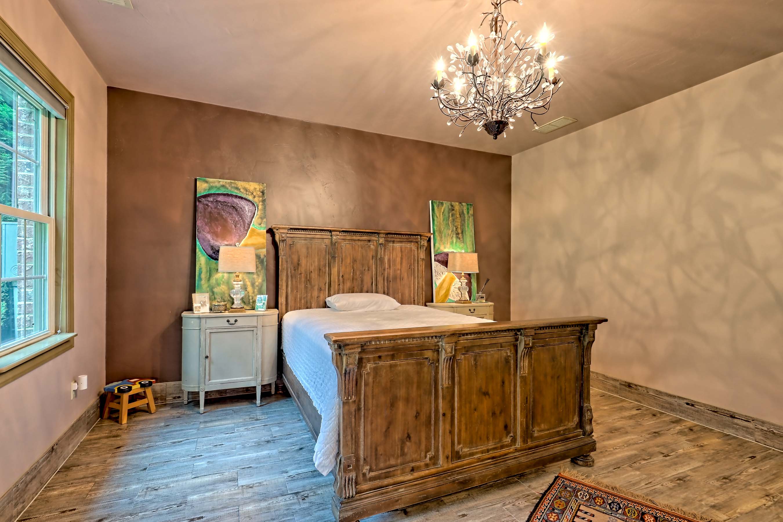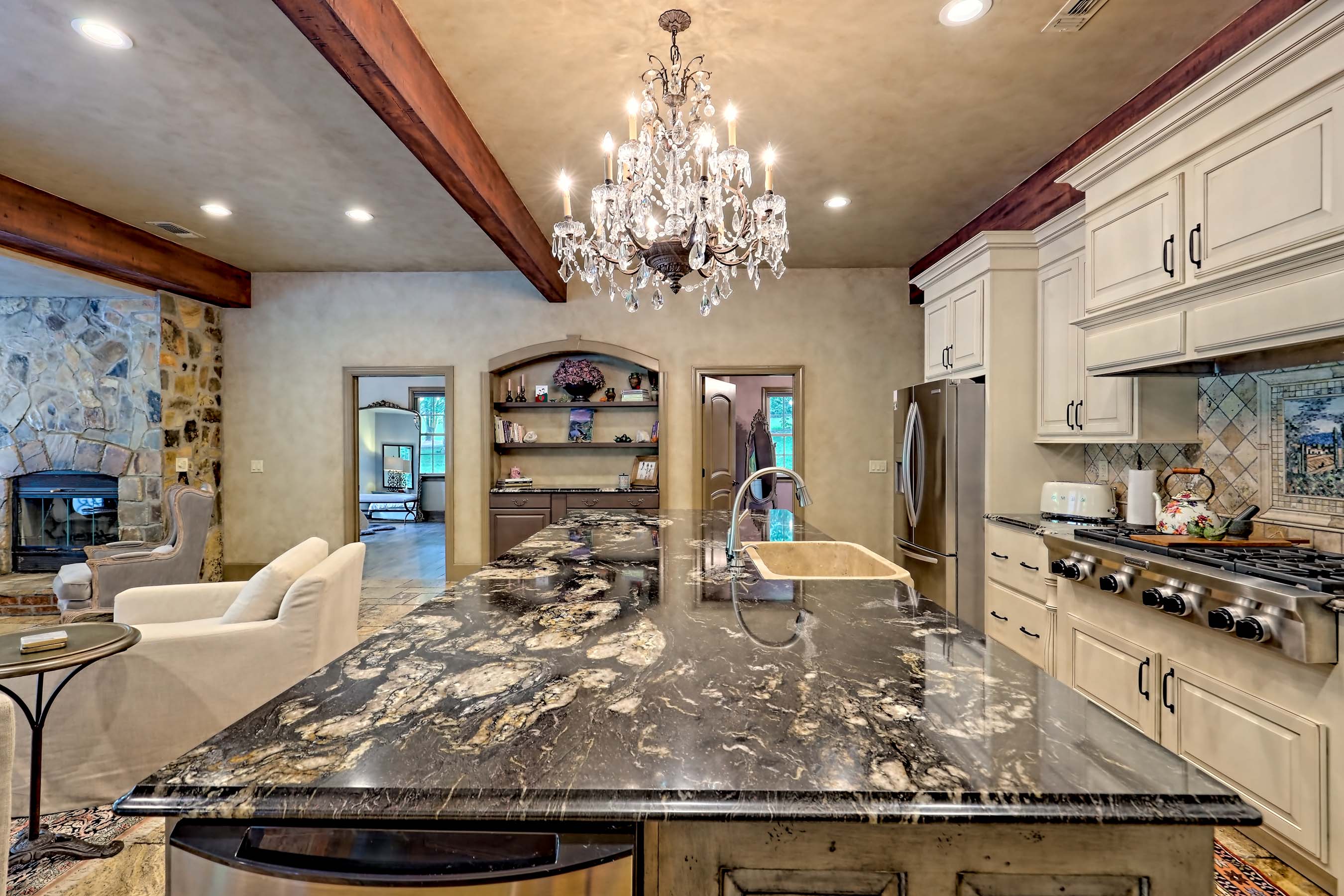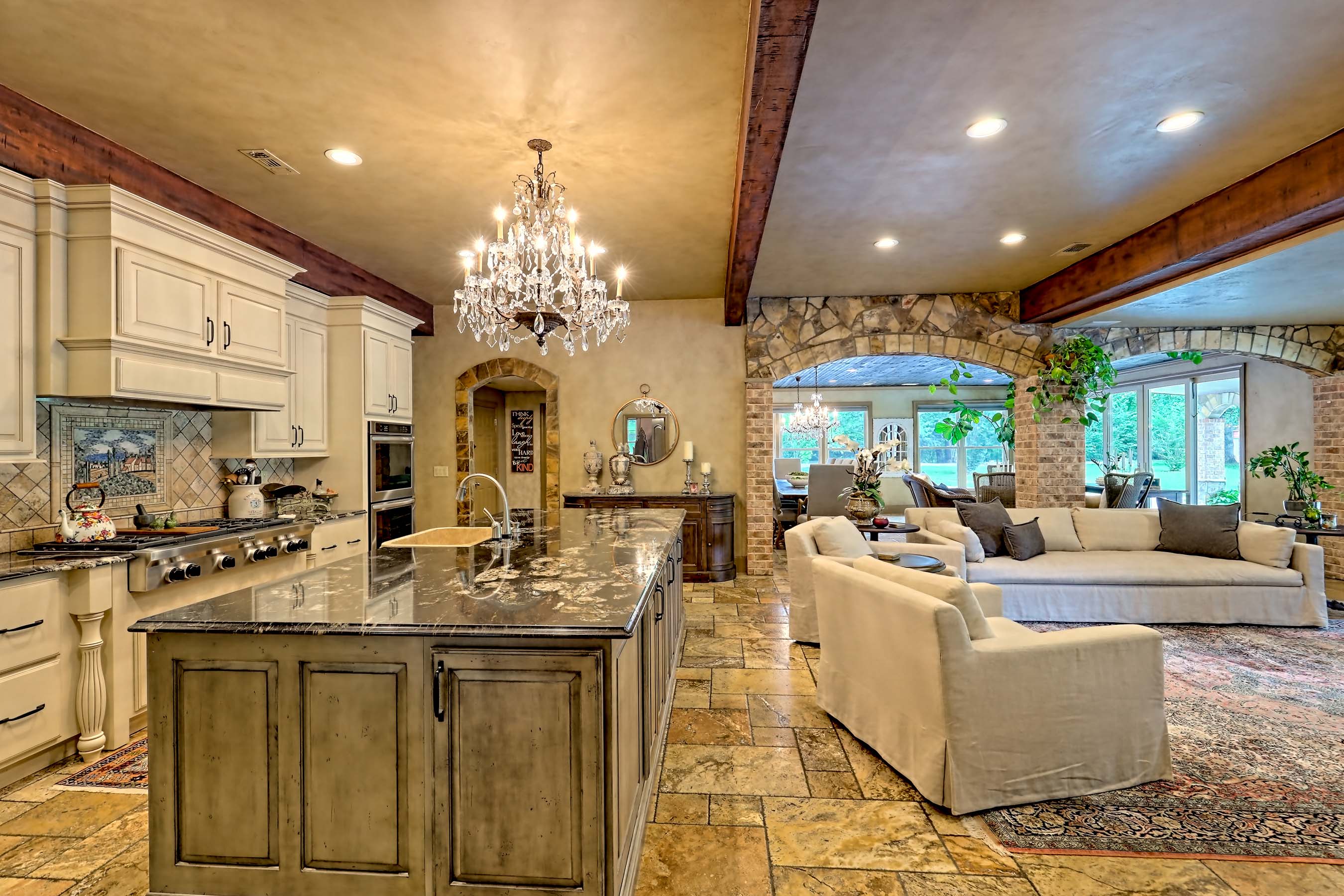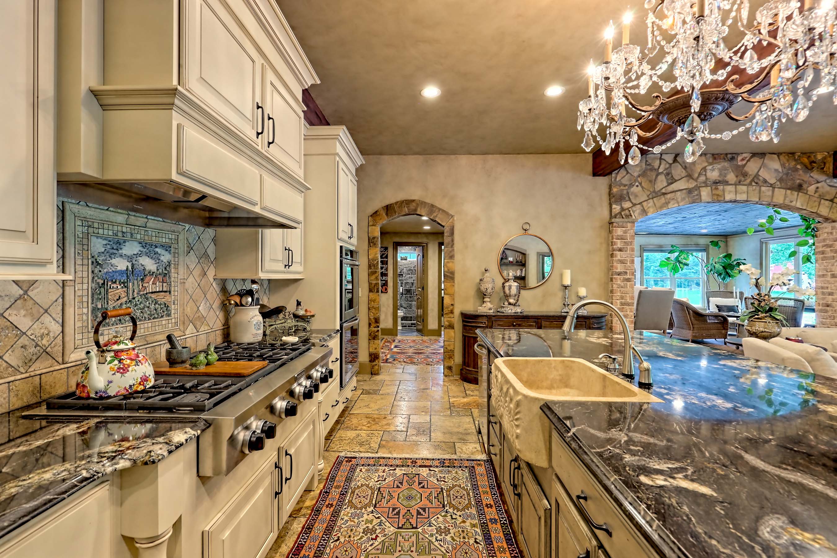 This exquisite Tuscan Villa is situated on nearly seven verdant acres nestled in one of Georgia's most beautiful valleys with Appalachian mountains surrounding it. Enter the level property through antique Italian iron gates fit for a palace. Expertly custom built with high-end finishes and top-of-the line systems, this enchanting home will transport you to Tuscany without a passport. Brick and stone accents throughout the interior (as well as the exterior construction), Versache stone floors, wood beamed ceilings, Venetian plaster wall finishes combine to create an old world look rarely found outside of Europe. The imported Italian stone floor tiles on the main level and the marble kitchen counter slabs cut in Butterfly pattern are exceptional. The open floor plan connects living, dining, and gathering spaces to the five-star chef's kitchen with commercial appliances and a wine cooler. Thirty guests for dinner are not a problem here! Gather round the stone fireplace in the keeping room while the chef prepares a feast or enjoy appetizers al fresco on the porch. Designed to accommodate large crowds, the sliding doors in the living room open to the covered front porch to invite nature in and expand the entertaining space. Two oversized bedrooms with shared marble bath are located on the main floor as well as the spacious, walk-in pantry off the kitchen with desk area and a conveniently located, multi-purpose mudroom with exterior door, a full bath and laundry room. Upstairs is a gracious-sized primary bedroom with a luxurious marble bath, a family room and extra-large recreation room with windows on three sides providing a spectacular Cinerama view of this idyllic natural setting and is perfect for game tables, stargazing, animal sightings, and more. A separate two-car garage with storage area and a Greenhouse building are located behind the house. The landscape has been carefully planted and meticulously maintained to enhance the beauty of the house. The green meadows are populated with mature hardwoods, fruit trees, exotic evergreens, and rare old-growth Chestnut trees. With multiple water features, this property presents more opportunities for everyone. The heart-shaped pond is available for water activities where the stunning iron gazebo at the pond water's edge invites observers or is the ideal place to slip away for romantic moments. The Little Tennessee River runs through the rear of the property with a deck strategically located for relaxing. There is also a creek that runs along the East side of the land to feed the pond. No need to call Delta Airlines to discover La Dolce Vita; enchantment awaits in Rabun County Georgia in Wolffork Valley.