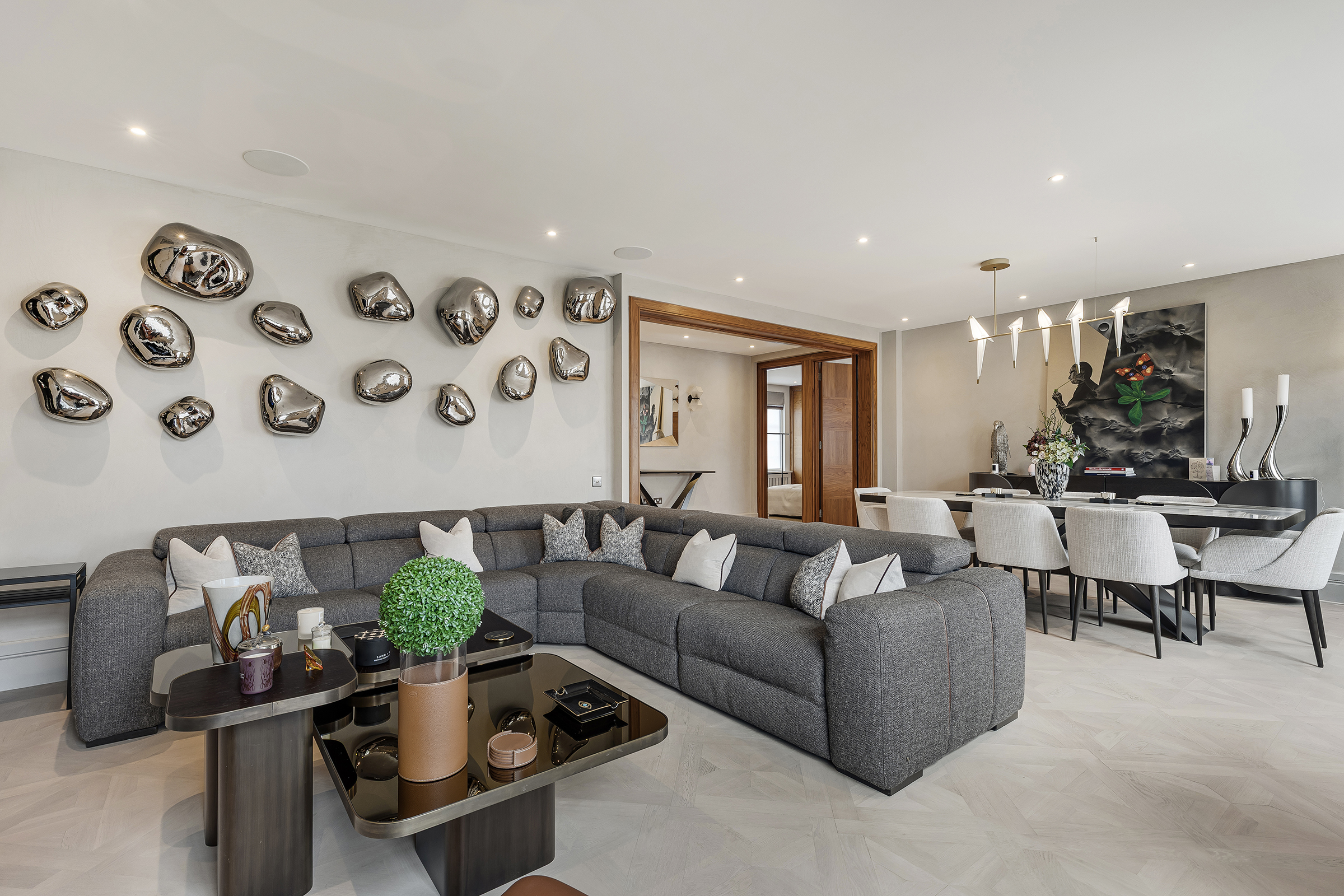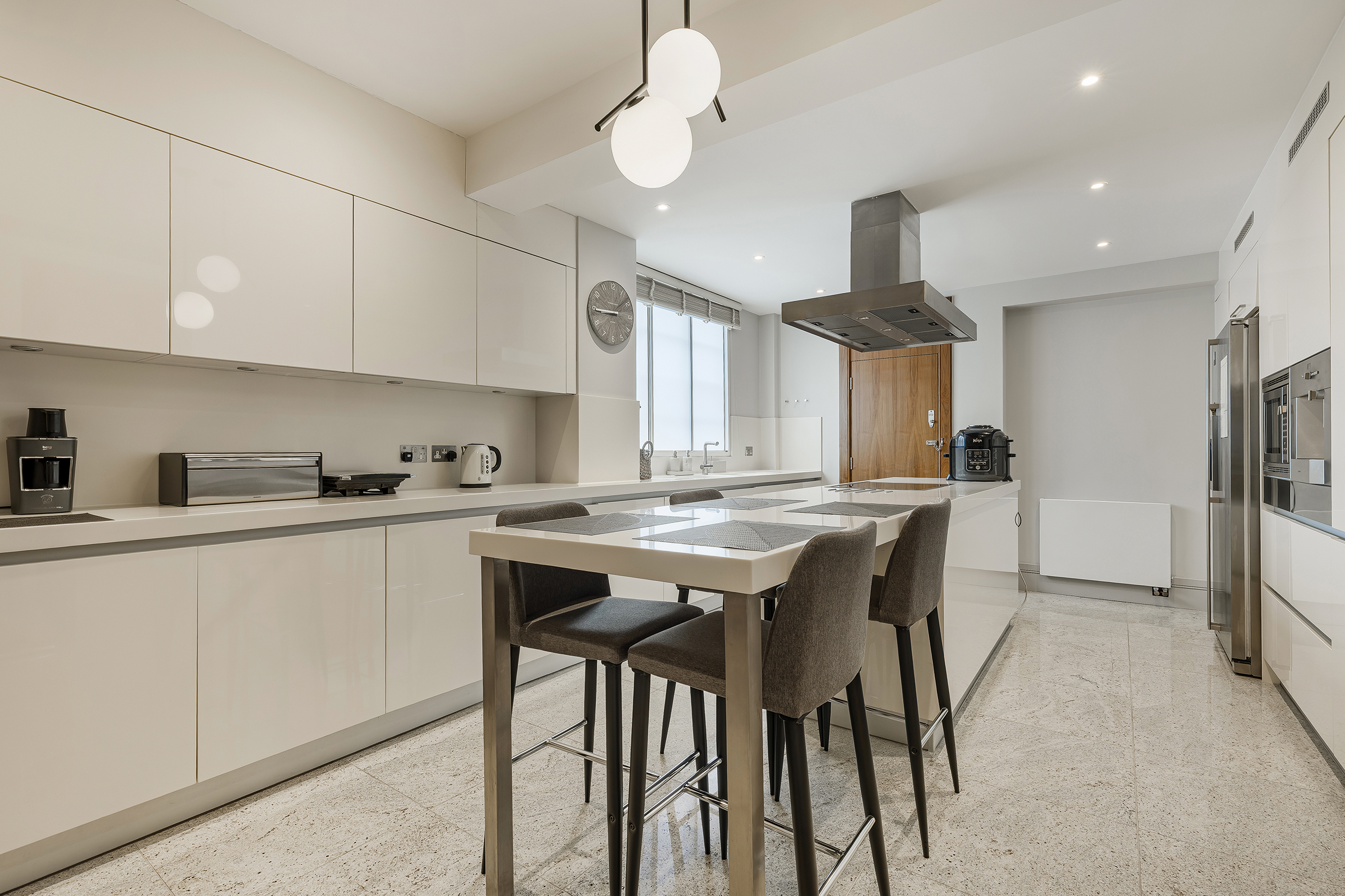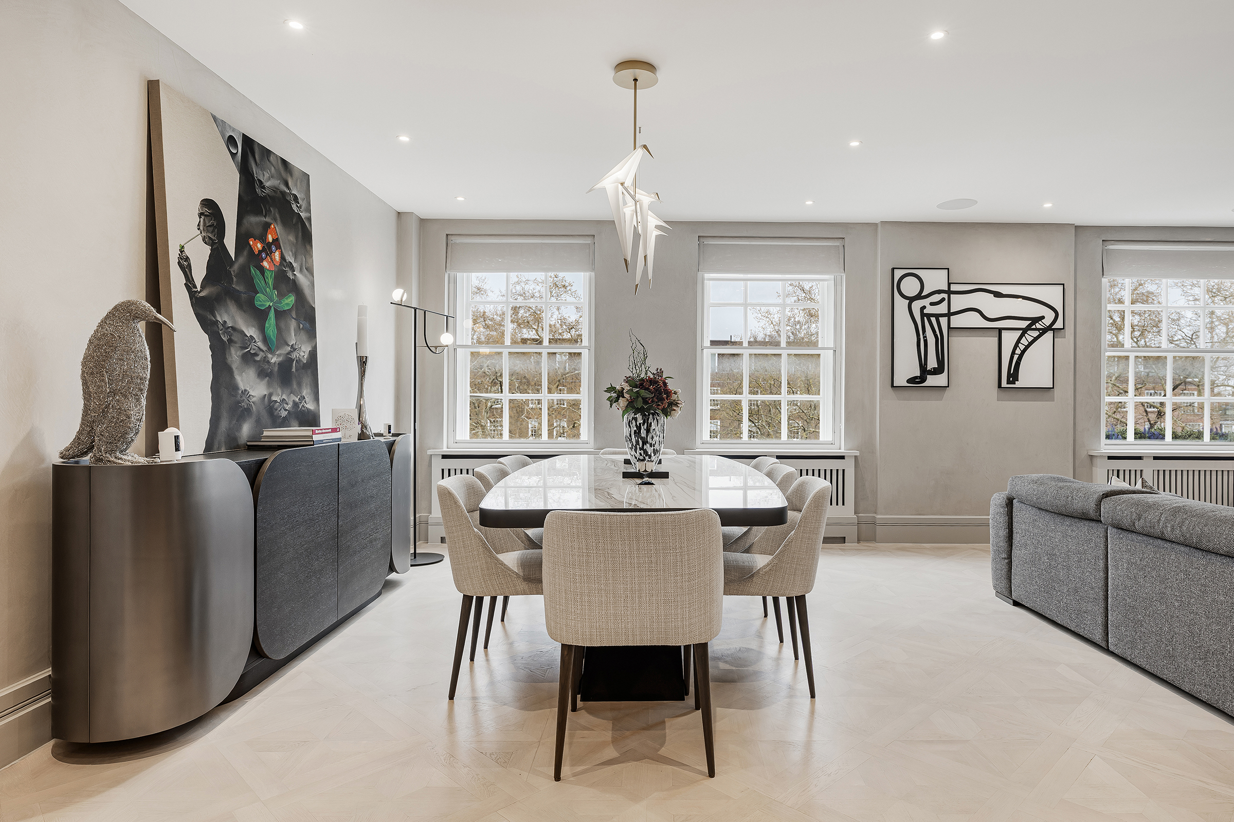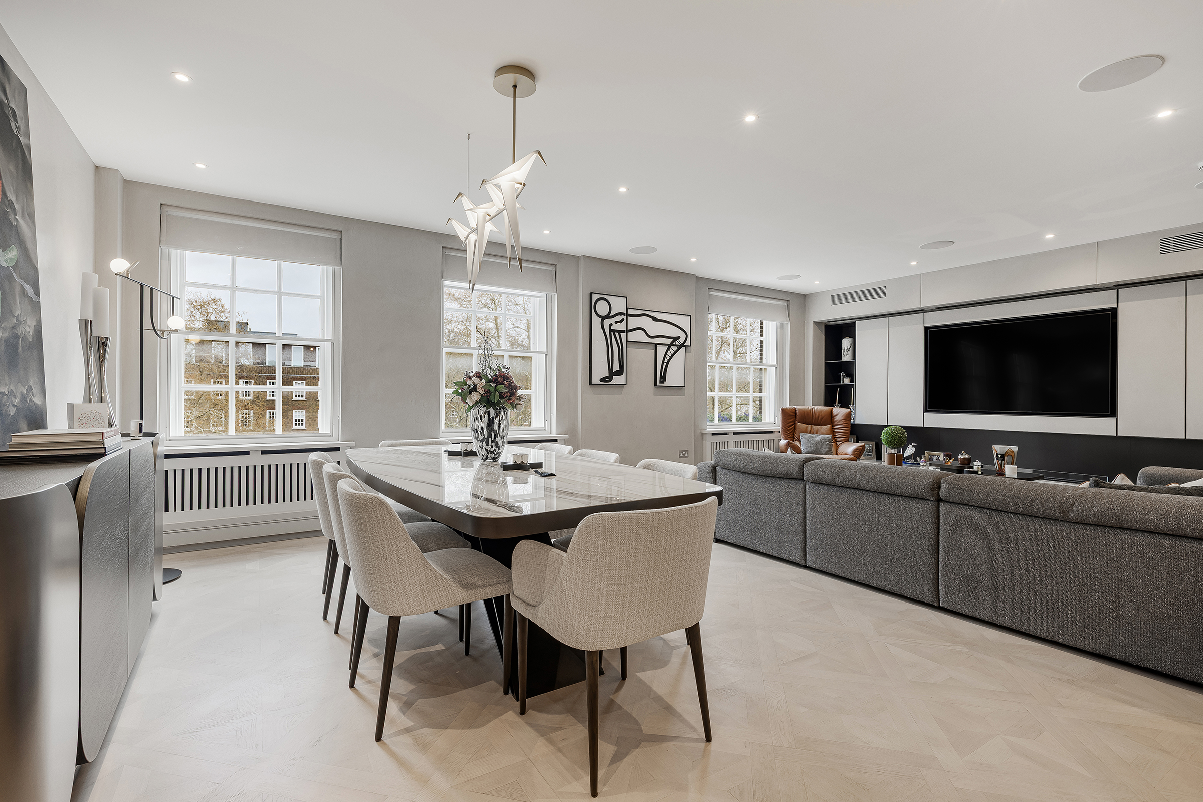 The heart of the apartment is a large double reception room, where clearly defined sitting and dining areas create an easy sense of flow. Broad windows draw in natural light and frame rooftop views, while the scale of the room lends itself equally well to everyday living and entertaining. There is plenty of space here for a long dining table, and the seating area feels particularly inviting, with bespoke media cabinetry and a more relaxed, informal atmosphere.Just off the main living space, the kitchen is designed as a true eat-in room rather than a purely functional one. Sleek, fully fitted and finished with clean contemporary lines, it has ample storage, integrated appliances and space for casual dining, making it as practical for family life as it is for hosting.