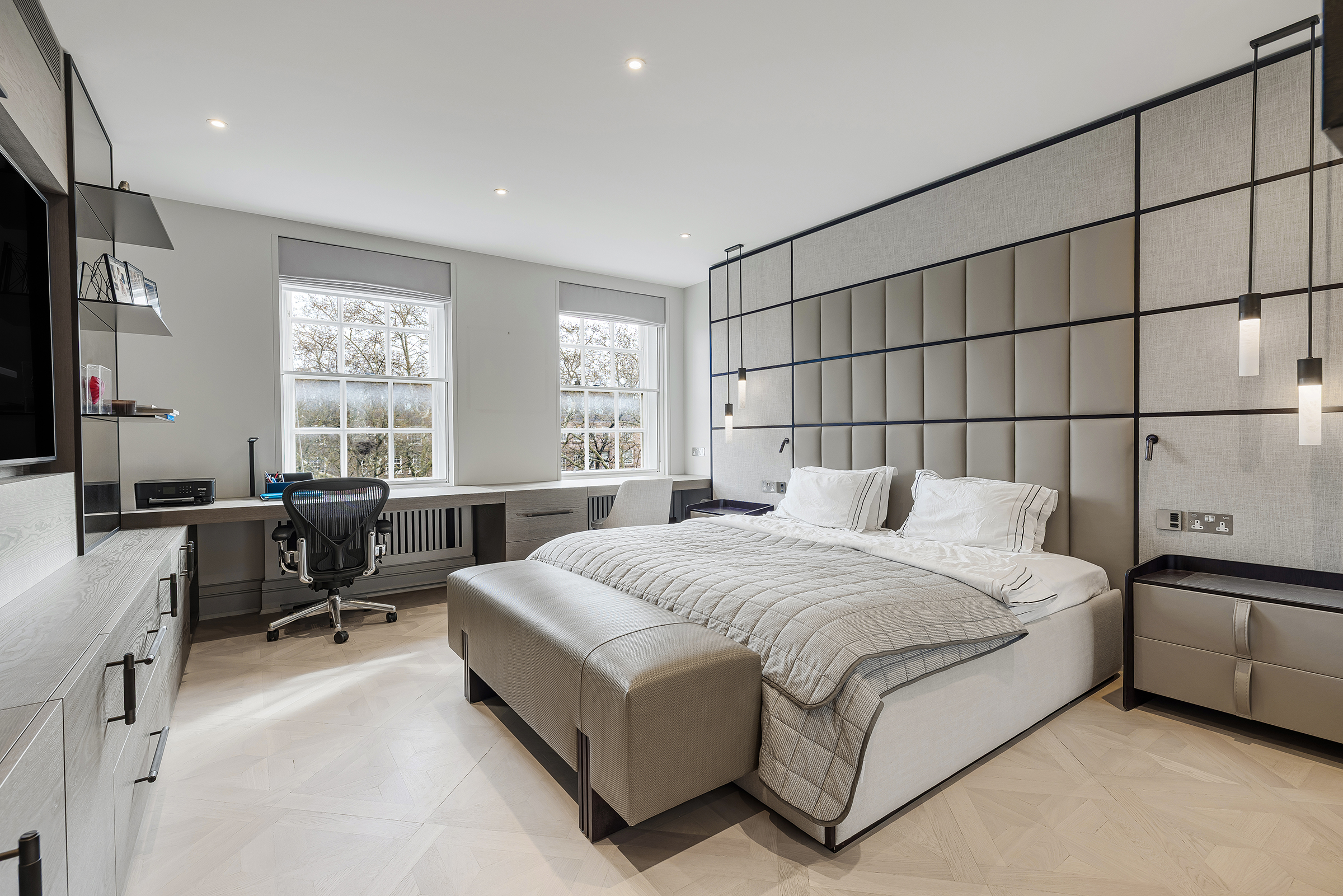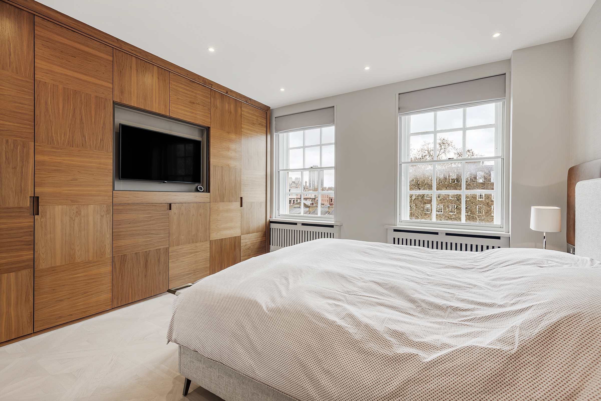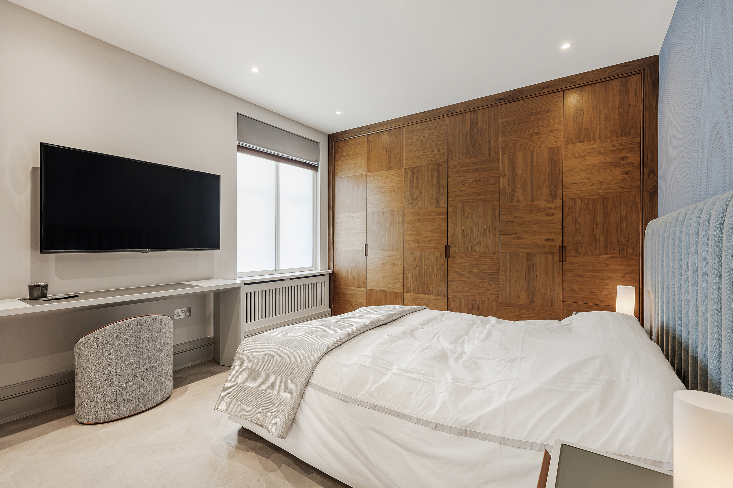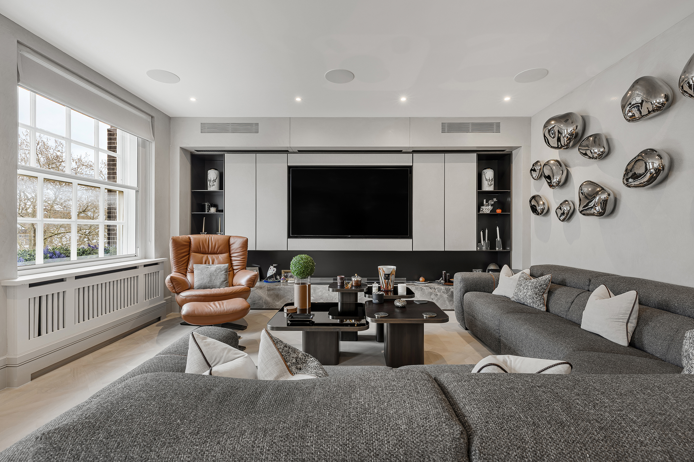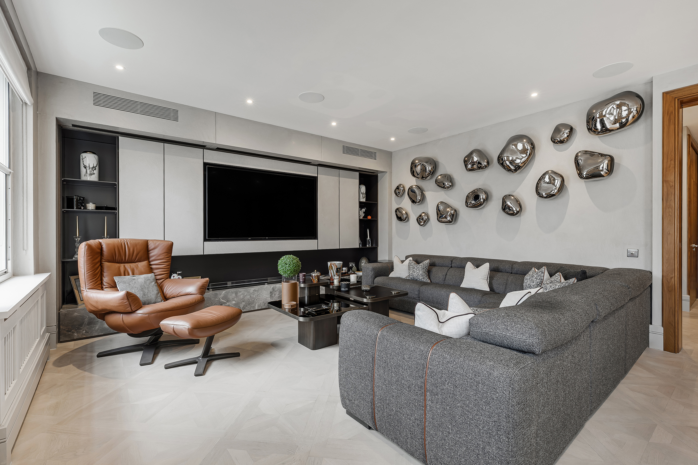 The heart of the apartment is a large double reception room, where clearly defined sitting and dining areas create an easy sense of flow. Broad windows draw in natural light and frame rooftop views, while the scale of the room lends itself equally well to everyday living and entertaining. There is plenty of space here for a long dining table, and the seating area feels particularly inviting, with bespoke media cabinetry and a more relaxed, informal atmosphere.Just off the main living space, the kitchen is designed as a true eat-in room rather than a purely functional one. Sleek, fully fitted and finished with clean contemporary lines, it has ample storage, integrated appliances and space for casual dining, making it as practical for family life as it is for hosting.