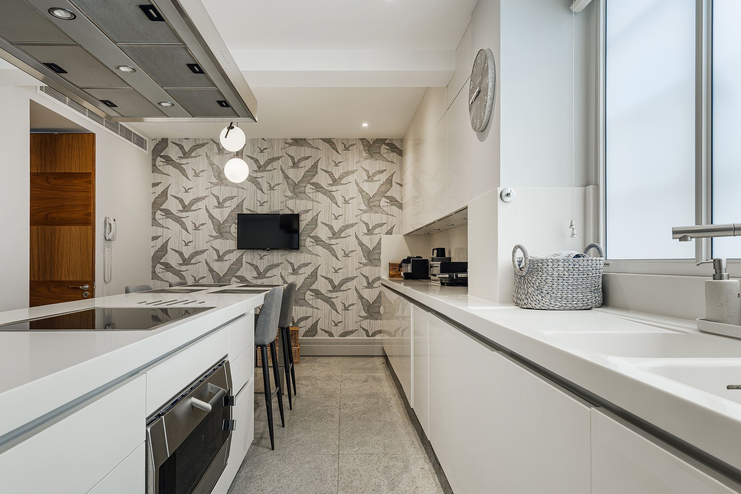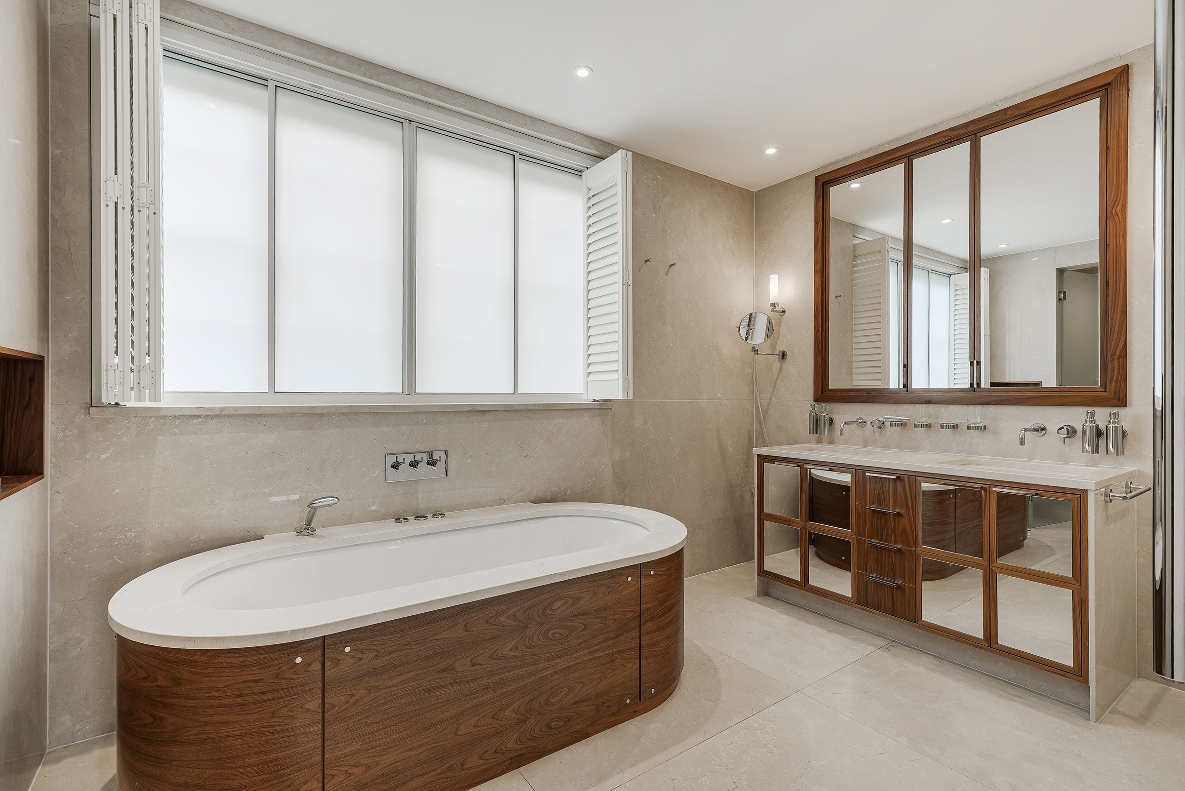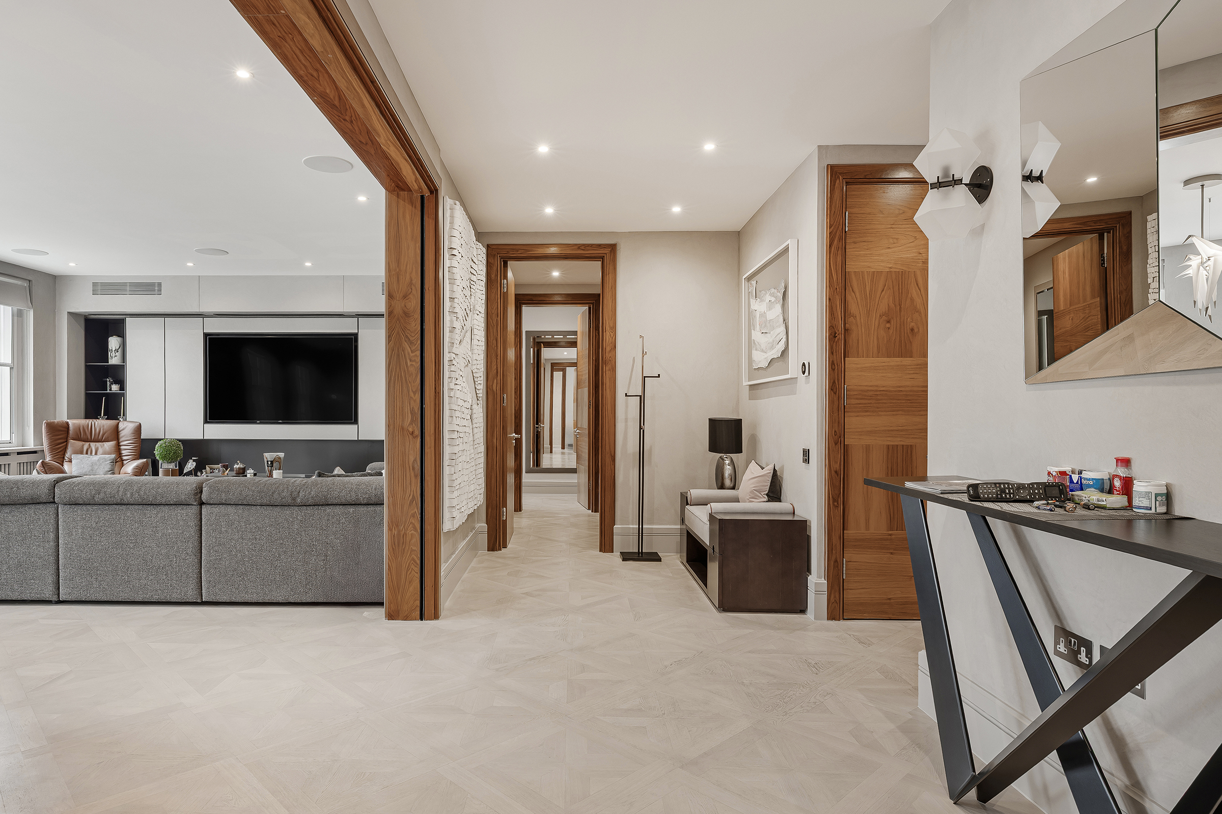 Throughout, the interiors have been finished with high-end fixtures and fittings, creating a home that feels cohesive, well considered and immediately comfortable. The overall effect is contemporary but not cold: elegant stone surfaces, rich wood detailing and well-balanced rooms give the apartment real presence.