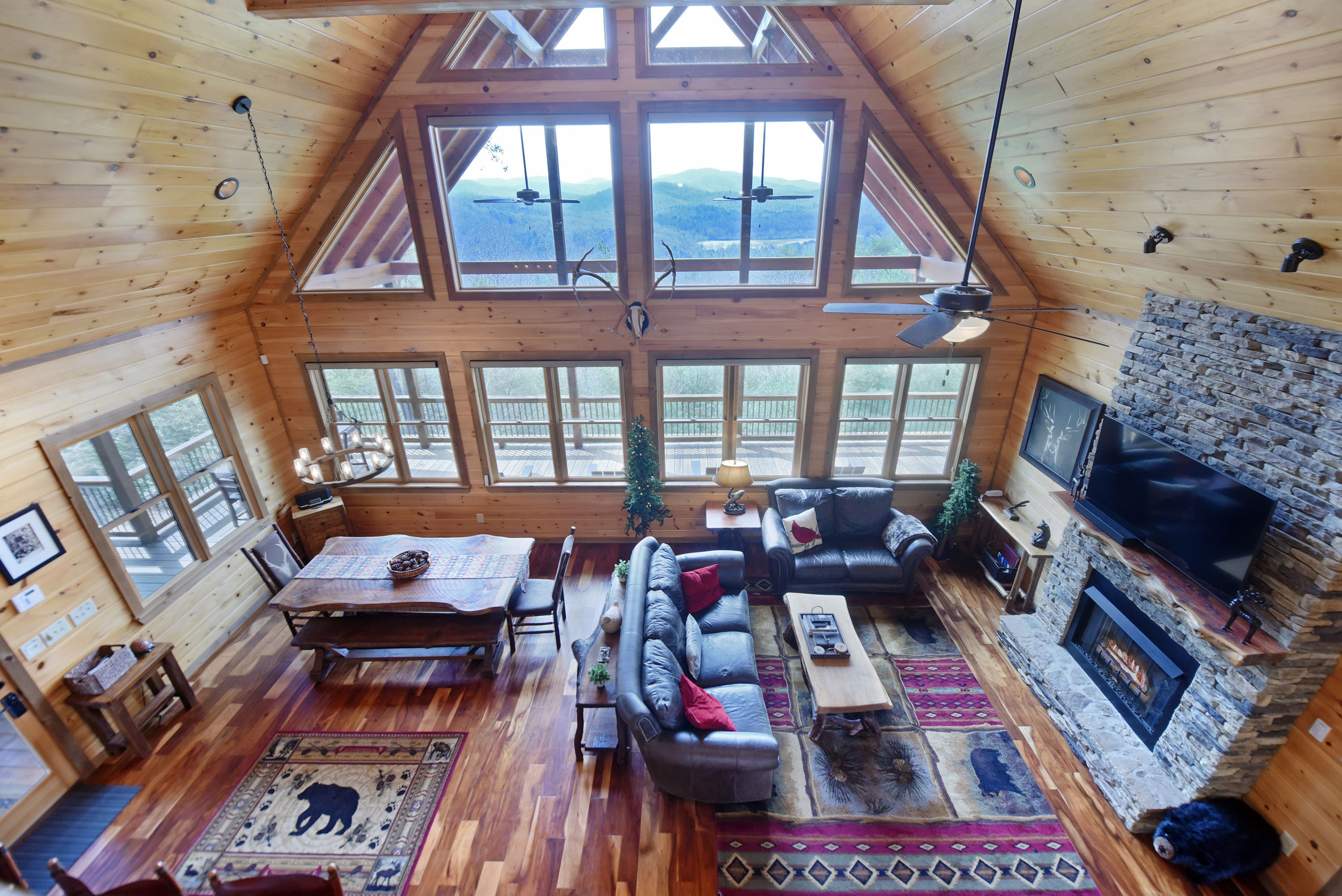 Perched high atop the mountain in the heart of the Aska Adventure Area, this richly appointed chalet captures the true spirit of rustic luxury & timeless mountain living. Nestled on a private cul-de-sac w/in a gated community, the setting offers unmatched peace & seclusion, surrounded by beautifully landscaped grounds & the natural beauty of the North Georgia mountains. Breathe in the crisp, clean air as you take in breathtaking, long-range mountain views that stretch endlessly into the horizon—an ever-changing backdrop filled with wildlife & quiet serenity. Crafted w/hand-hewn log siding & warm, natural finishes, the home welcomes you with an authentic yet refined mountain aesthetic. A dramatic wall of windows brings the outdoors in, filling the open-concept living spaces with light while perfectly framing the panoramic views. Gather around the glow of floor-to-ceiling stacked stone fireplaces in the main level great room, lower-level family room, or out on the inviting party porch; each space designed for comfort, connection & making memories. Step outside to expansive wrap-around decks & a private master balcony, where mornings begin with sunrise over the mountains & evenings end under a canopy of stars. Offered fully furnished w/high-end, thoughtfully curated pieces, this home is completely turnkey—ready for immediate enjoyment or a seamless investment opportunity. The cabin features two luxurious master ensuites on the main & upper levels, while the finished terrace level offers a spacious family room w/fireplace, wet bar, oversized bedroom, & full bath. Kitchen & baths showcase upgraded cabinetry & granite countertops, complemented by rich hardwood flooring throughout. Perfectly positioned just minutes to hiking, kayaking, tubing & fly fishing on the Toccoa River & a short drive to Downtown Blue Ridge’s dining, shopping, wineries, & breweries, this is where every sunrise feels like a retreat & every sunset settles in w/the warm glow of a true mountain escape.
