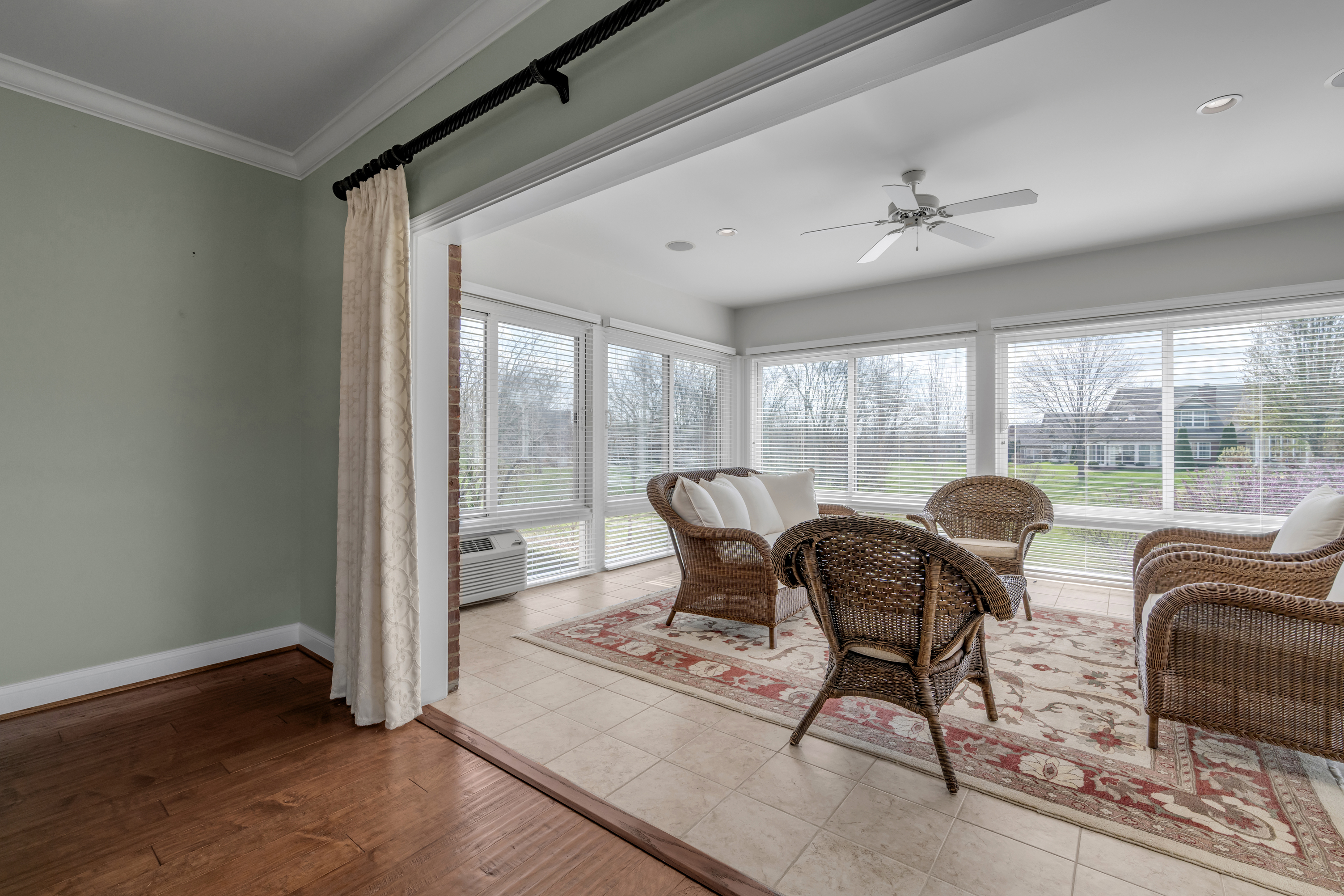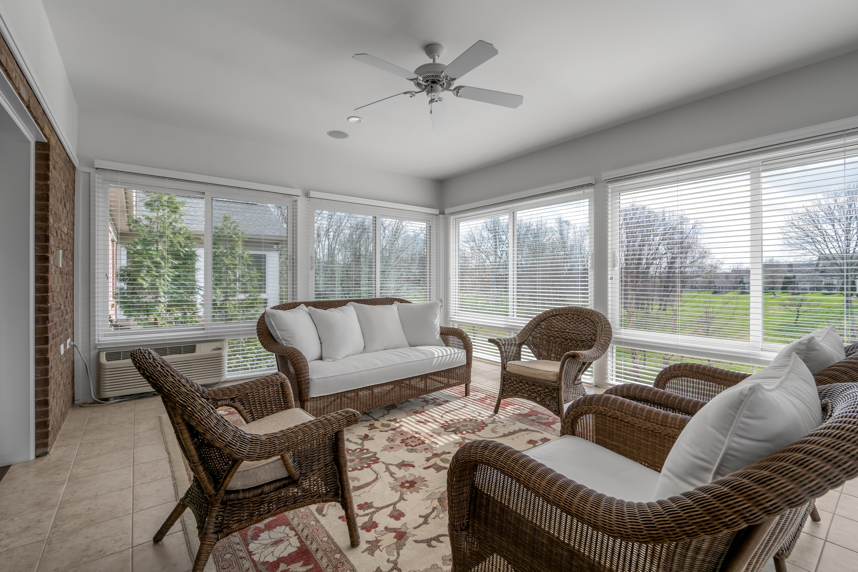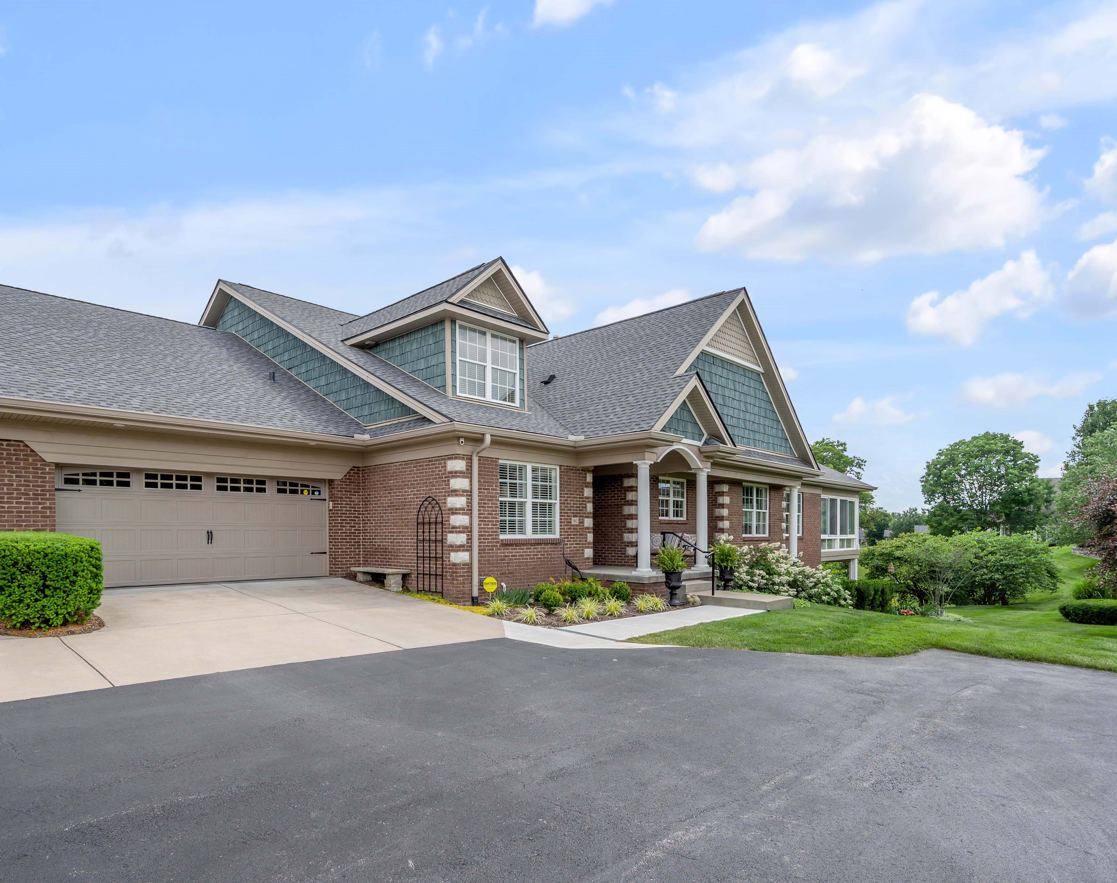 Discover exceptional condo living in this beautifully updated residence, tucked at the end of a private drive and surrounded by lush landscaping, green space, and easy access to the community pool. The setting offers a peaceful, low-maintenance lifestyle with a resort-like feel. Inside, freshly repainted interiors and hardwood floors set the tone. The main level features a flexible formal dining room—also ideal as a home office—and an open layout designed for both everyday living and entertaining. The kitchen is appointed with rich wood cabinetry, granite countertops, a gas range, and a generous island with bar seating, flowing seamlessly into the breakfast area, living room, and sunroom. The sunroom, with heated floors and expansive windows, brings in natural light and offers a comfortable space to relax year-round. The primary suite provides a quiet retreat with an en suite bath and walk-in closet. Upstairs, two spacious bedrooms each include their own en suite baths, offering comfort and privacy for guests. The walkout lower level adds even more living space with a family room, full bath, and a dedicated wine room, plus direct access to a covered patio with travertine tile. A rare highlight, the four-car garage includes a finished two-car bay ideal for a workshop, hobby space, or studio, with discreet access from a tiled driveway. Well-appointed and move-in ready, this home is designed for easy, lock-and-leave living without sacrificing space or quality.