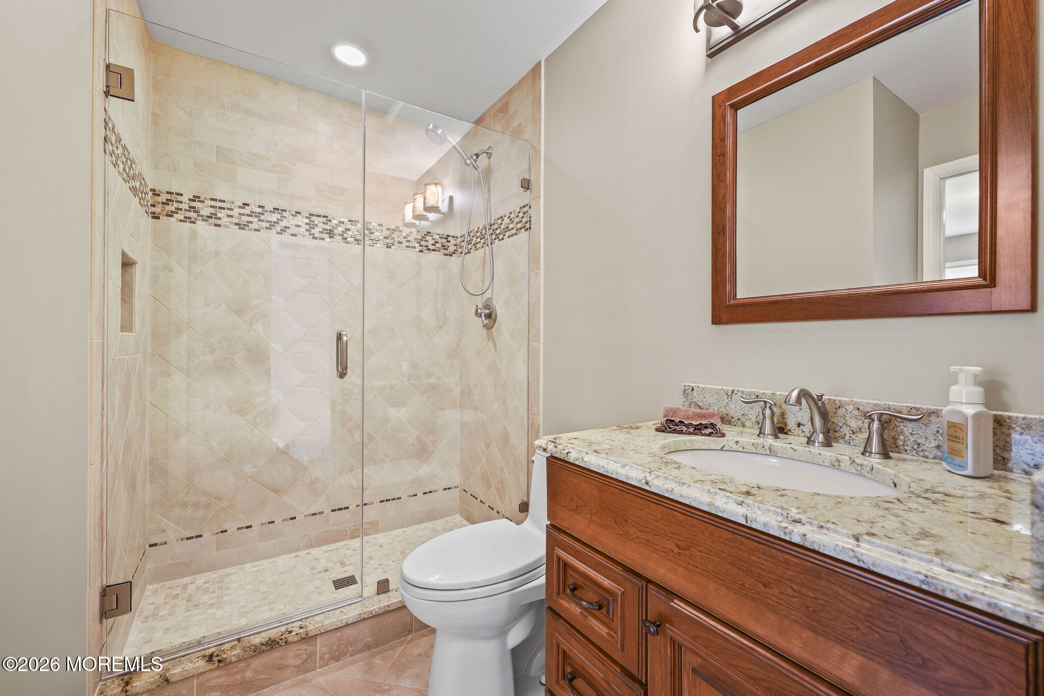 Spacious, bright, and meticulously maintained 5 bedroom, 3.5 bath colonial home situated in highly sought-after Manalapan Twp. Set within a tranquil private cul-de-sac community of distinguished homes, this property offers a versatile first-floor bedroom/office with a full bath, formal dining and living rooms, and a large den equipped with built-in surround sound and a gas fireplace. The elegantly updated kitchen features premium appliances, granite countertops, and an eat-in area with direct access to a beautifully fenced backyard, complete with a two-tier deck and an in ground Gunite heated pool. The upper floor includes a large main bedroom with vaulted ceilings, an expansive walk-in closet, and a fully remodeled bathroom featuring double sinks, a walk-in shower, and heated floors. There are three additional bedrooms and a full bathroom on this level. The finished basement provides ample space for entertainment, making it ideal for family gatherings, gaming, or movie nights. Additional amenities include a new roof installed in 2024, a two-car garage, a double-wide driveway, and generator hook-up. The home is ideally located with convenient access to bus routes to New York City, close proximity to Hawkins Park, Route 9 shopping and dining options, top rated schools and Route 18 leading to the Jersey Shore.