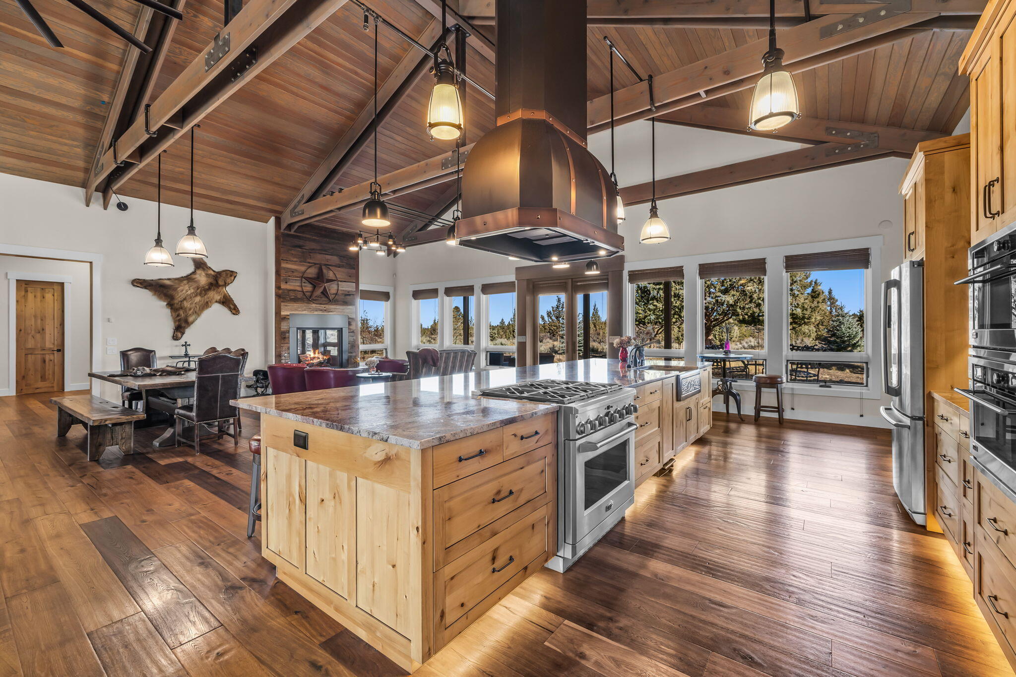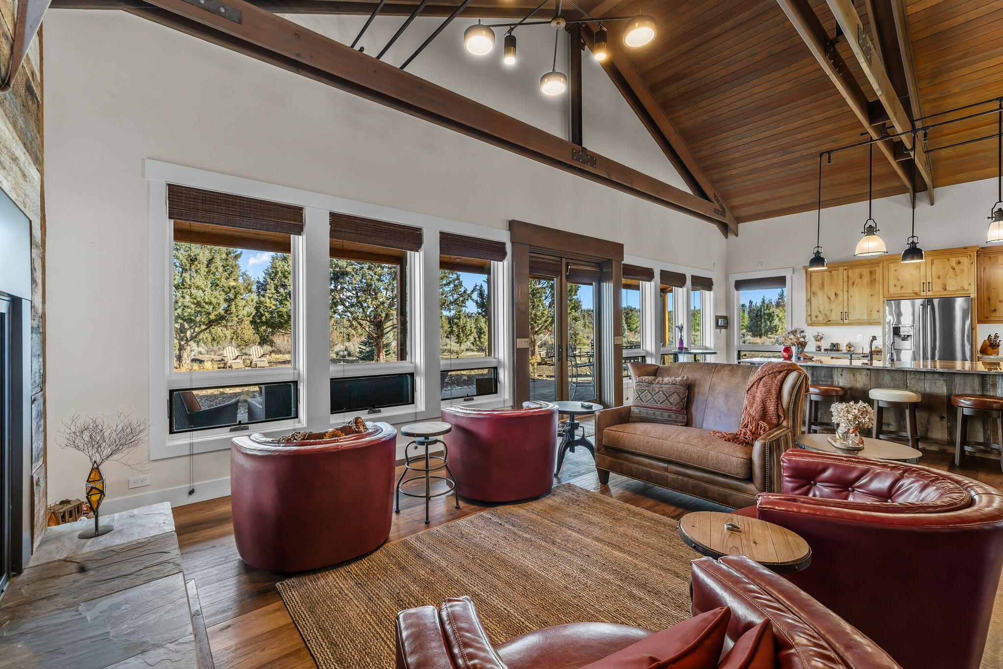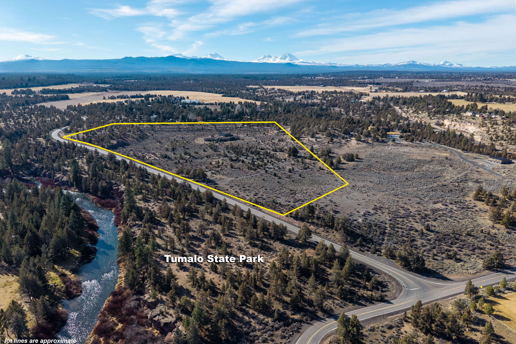 Serene privacy awaits behind the gated entry of this elegant single level home, offering 25+ acres of peace surrounded by nature, located across street from Deschutes River, Tumalo State Park & Cascades Academy. Interiors artfully blend a Lodge Style home w/ Ranch Architecture & warm High Desert ambiance. Surrounded by walls of glass framing natural views & bathing interiors in abundant light; the entry of this stunning home welcomes you to effortless luxury. Wood flooring leads to dramatic great room, where living area, dining space & chef's kitchen flow seamlessly together, complemented by a separate fireside lounge designed for relaxed conversation. Primary suite features cozy fireside sitting area & access to the outdoors; perfect for enjoying sunrises & evenings beneath the stars. Spa-like bath offers dual vanities, Japanese soaking tub & spacious shower. 2 en-suite guestrooms (one currently serving as an office) & laundry complete the interiors. 3,000sq.ft. detached heated shop.