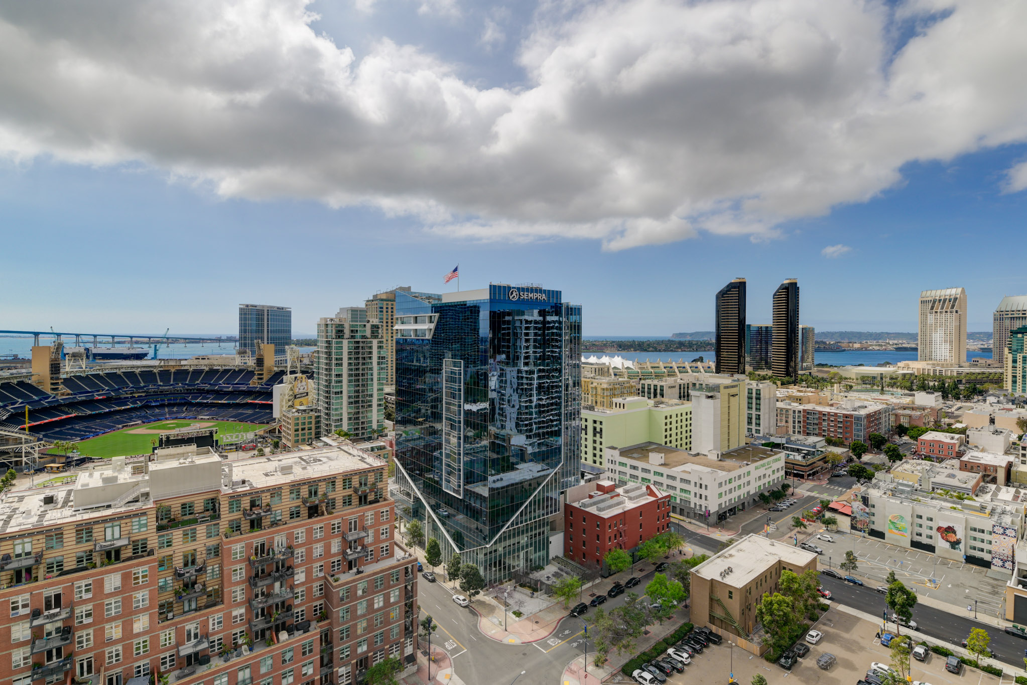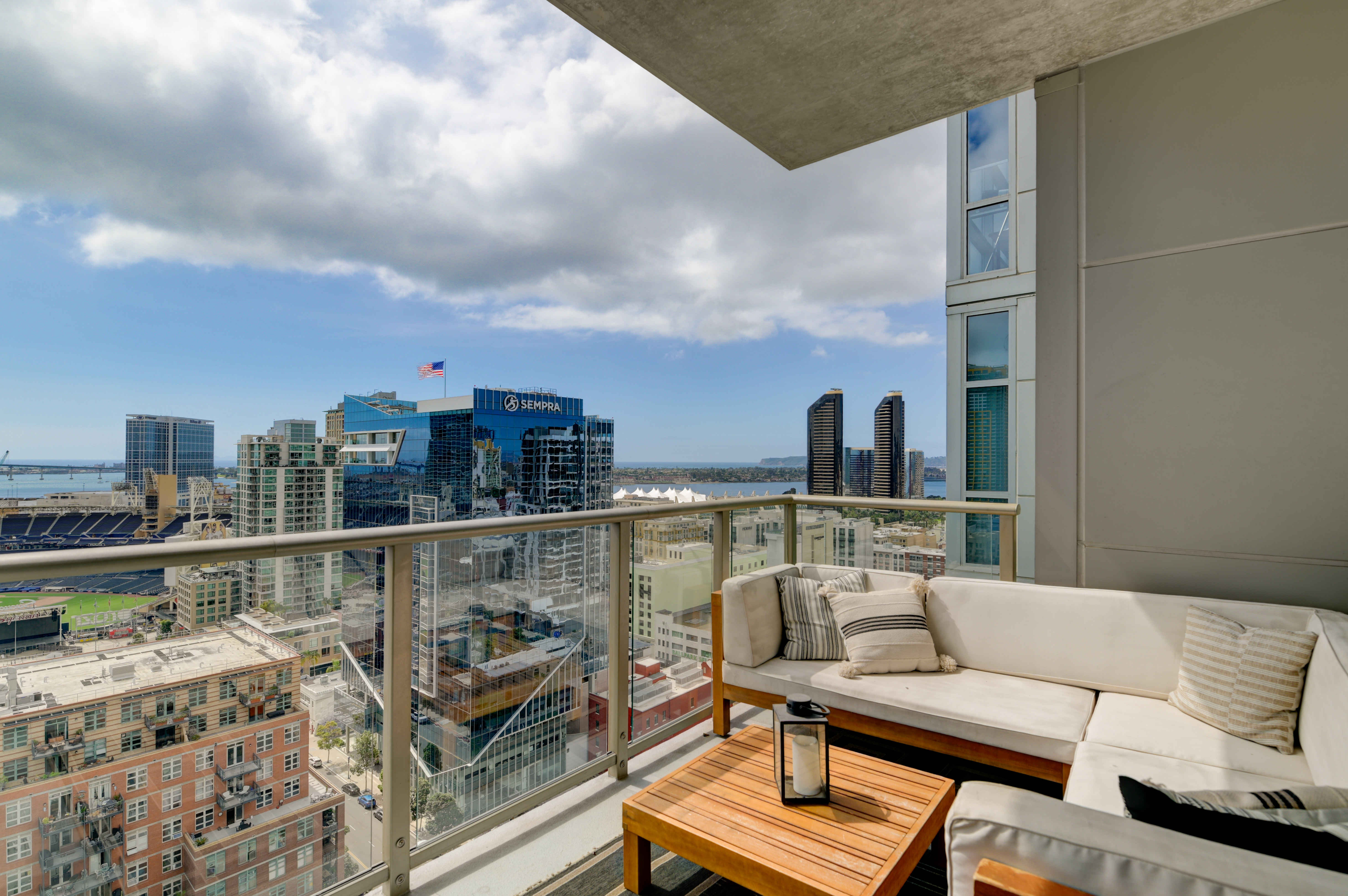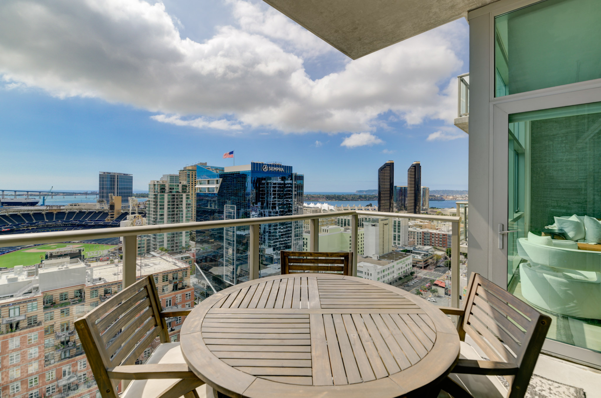 Experience extraordinary panoramic views from this exceptional residence, offering sweeping vistas of Petco Park, Coronado, the Bay, Point Loma and Ocean placing San Diego’s iconic skyline at center stage. Two private balconies provide the perfect setting to enjoy sunrise coffee or evening sunsets framed by the city lights or enjoy watching baseball at Petco Park and live shows at Gallagher Square. Designer upgrades incl. brand new $30K luxury laminate wide plank floors, motorized shades, renovated bathrooms & a beautifully renovated Chef's kitchen with sleek cabinetry, stainless steel appliances & a contemporary backsplash. New microwave & dishwasher. The open-concept design seamlessly connects the living, dining & kitchen spaces, for entertaining & everyday living with option to easily convert dining space into a second bedroom where closet has been thoughtfully installed already. Primary suite with balcony access, blackout motorized shades & spacious walk-in closet. Two secured parking spaces & storage unit add convenience and peace of mind, while resort-style amenities—including a lap pool, spa, fitness center, full kitchen, fire pits and pizza oven. Multiple lounge areas and four dedicated barbecue stations. Ideally located with immediate access to the vibrant Gaslamp Quarter, Little Italy dining scene, The Rady Shell waterfront concert & event venue and this residence also places baseball enthusiasts moments from the action at Petco Park. A rare opportunity to own a view-driven urban retreat combining modern sophistication with premier lifestyle access.