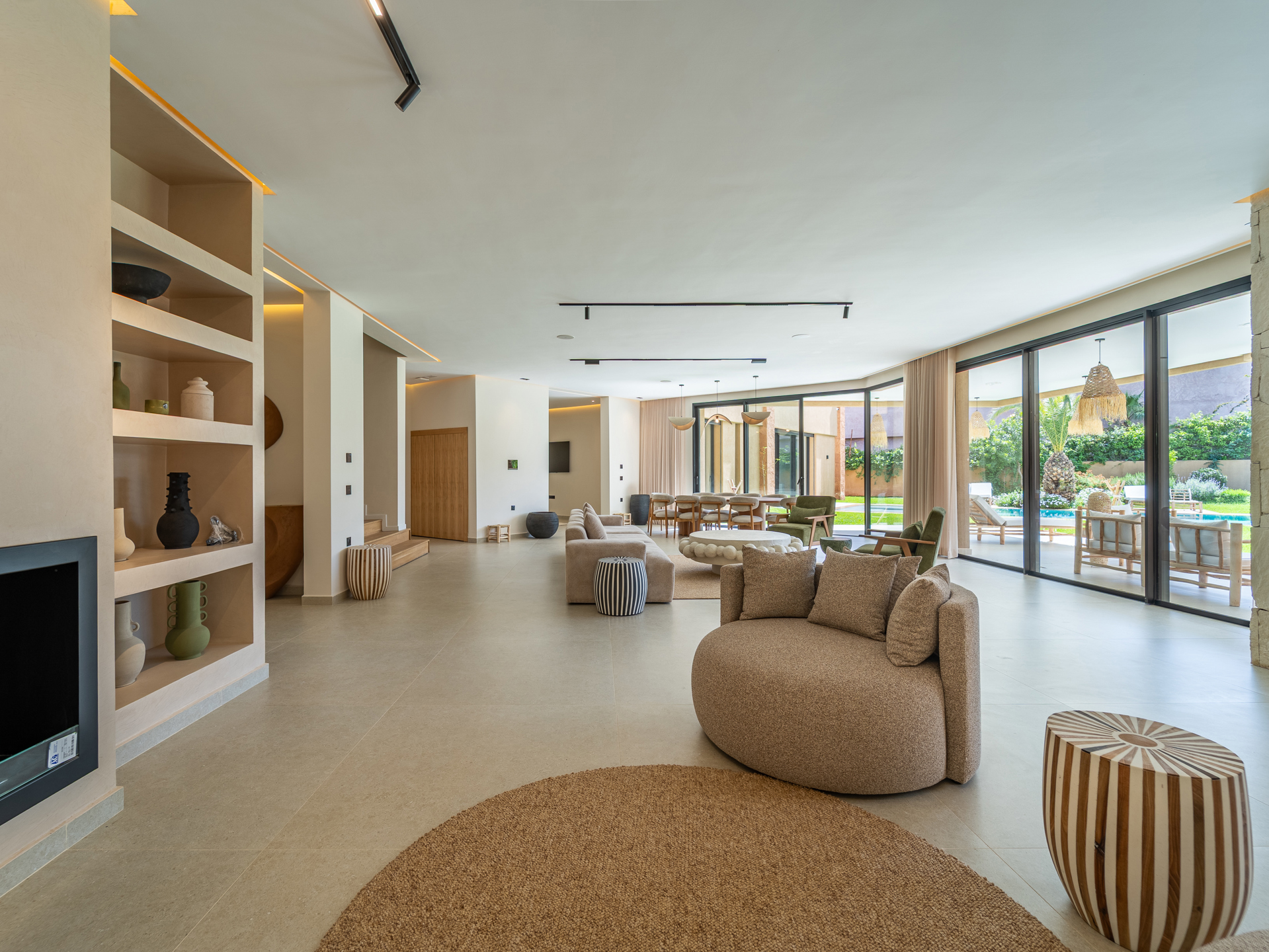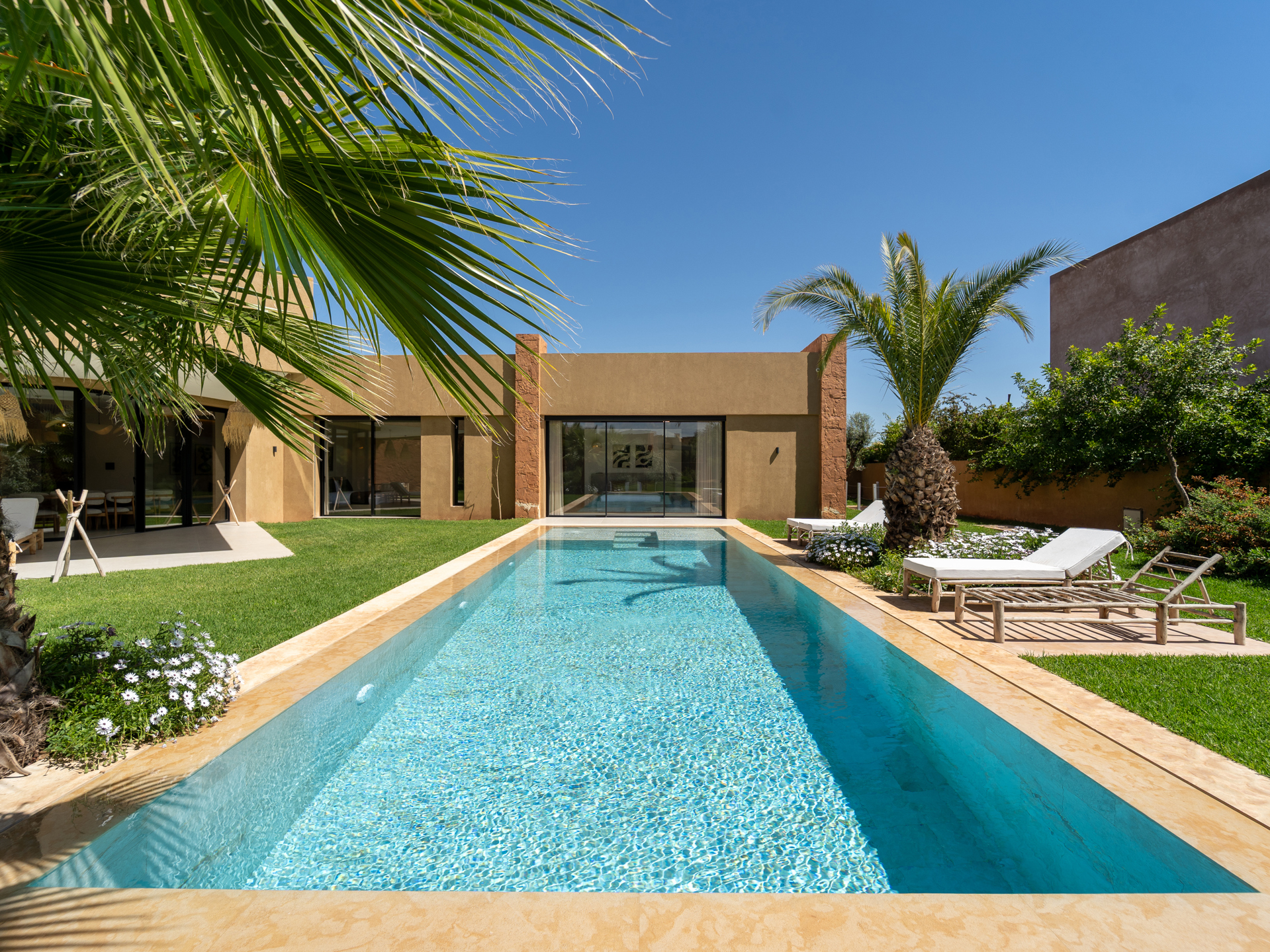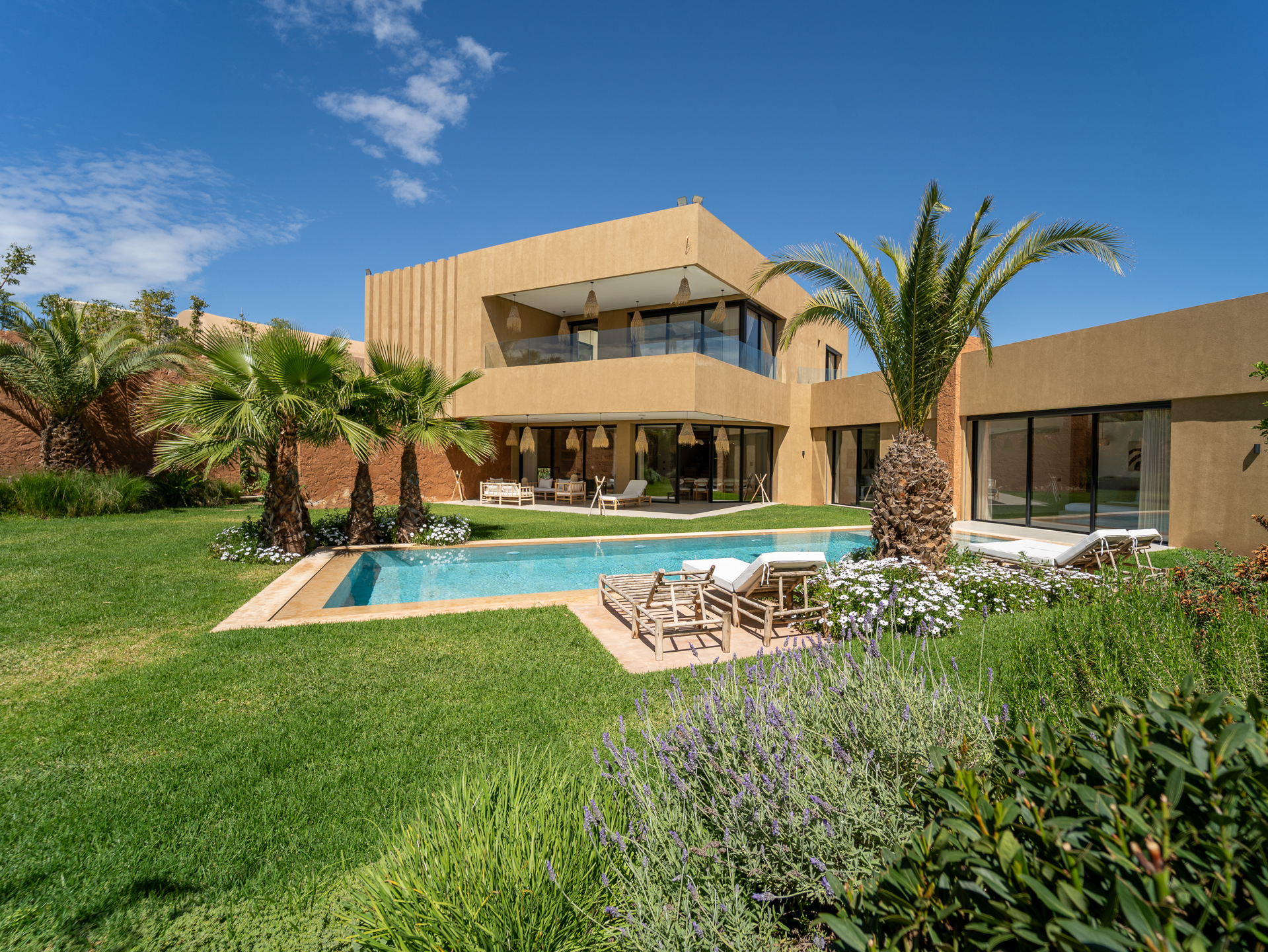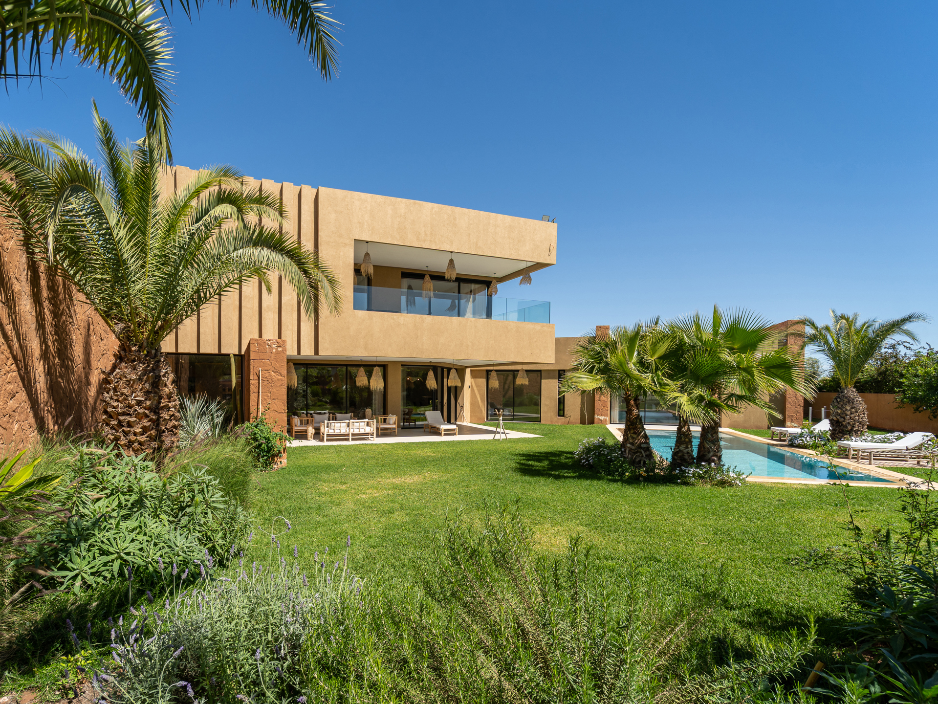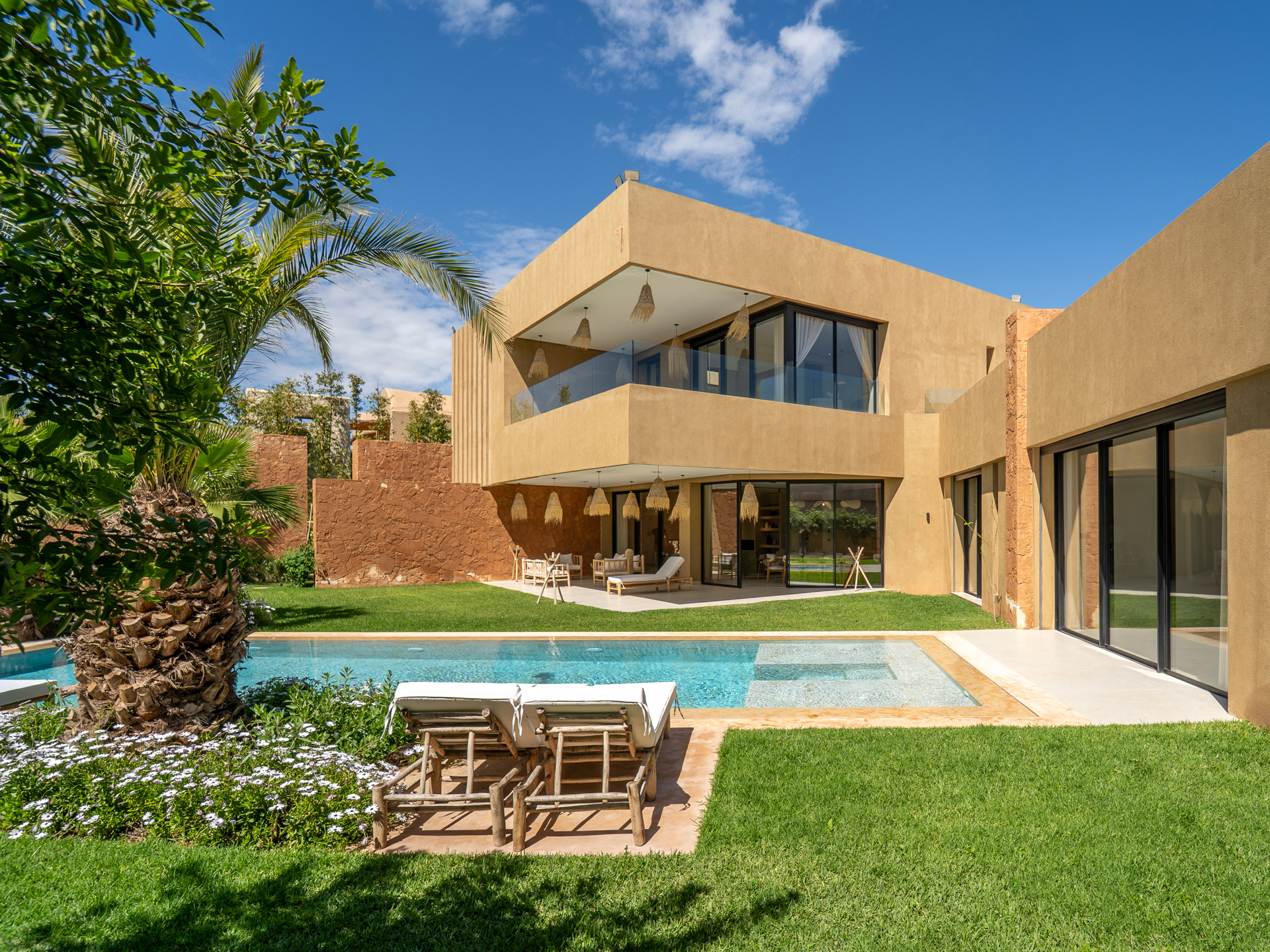 Nestled in the heart of the prestigious Amelkis Golf Resort, this contemporary villa of 565 sqm, built on a 1,500 sqm plot, embodies modern elegance and a refined lifestyle, just a few minutes from the center of Marrakech. Sold fully furnished, the property stands out for the quality of its materials and finishes: double-glazed aluminum joinery, integrated home automation, ducted LG air conditioning, high-end fittings (Hansgrohe, Geberit, Legrand), Italian tiling, and fine European oak wood. The villa offers generous reception areas including a living room with a fireplace, a dining room, a TV lounge, and a fully equipped kitchen with an outdoor dining area, barbecue, and staff quarters. It features 5 suites, including 2 on the ground floor with direct access to the garden and swimming pool, and 3 upstairs, including a sumptuous master suite with an indoor garden, a large walk-in closet, a full bathroom, and a terrace with views of the Atlas Mountains. The outdoor areas are beautifully landscaped and include a heated saltwater pool, spacious terraces, and a covered parking area. Designed for optimal comfort, the villa also benefits from high-performance insulation, pre-installation for solar panels, and top-quality technical features, making this property an ideal residence combining modernity, comfort, and exclusivity. Located just minutes from central Marrakech, Amelkis Resort is one of the most sought-after residential estates in the region, secure and organized around its internationally renowned golf course, offering a rare, მშვიდ, and green living environment. For further information, please contact David Montérin at +212 6 71 43 72 27.