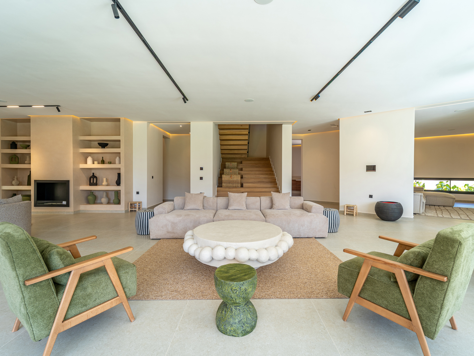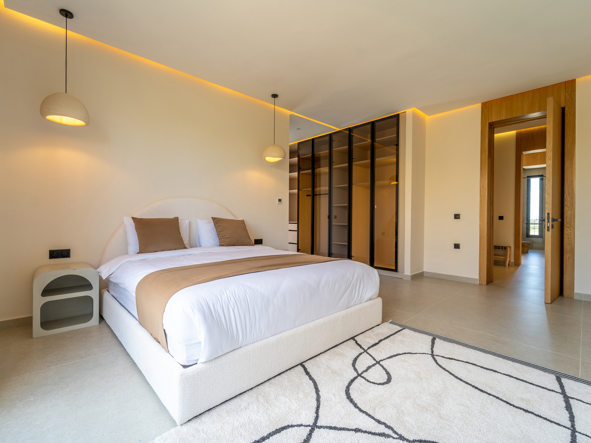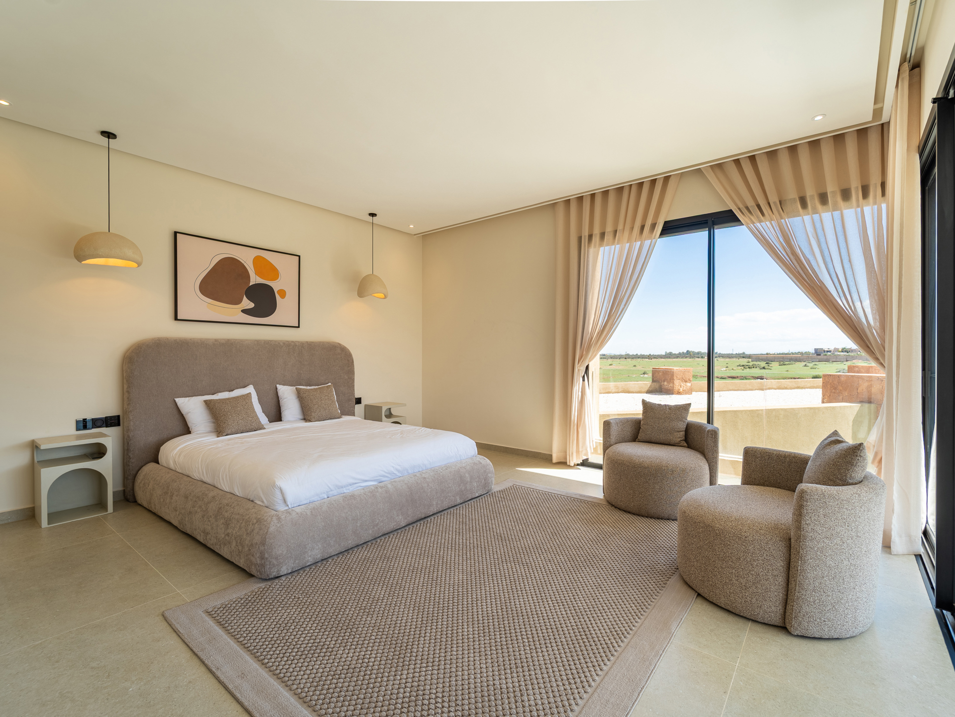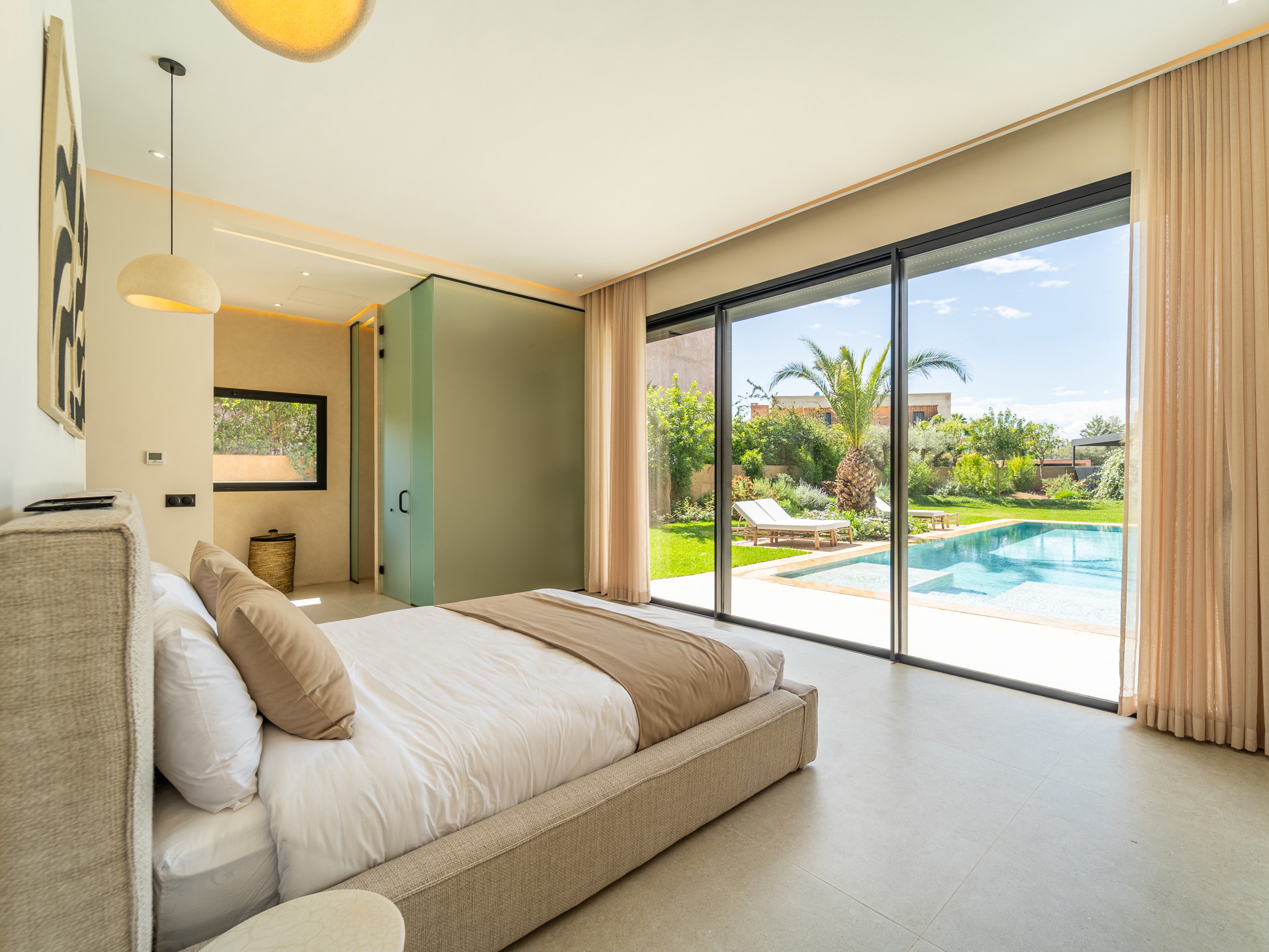 Nestled in the heart of the prestigious Amelkis Golf Resort, this contemporary villa of 565 sqm, built on a 1,500 sqm plot, embodies modern elegance and a refined lifestyle, just a few minutes from the center of Marrakech. Sold fully furnished, the property stands out for the quality of its materials and finishes: double-glazed aluminum joinery, integrated home automation, ducted LG air conditioning, high-end fittings (Hansgrohe, Geberit, Legrand), Italian tiling, and fine European oak wood. The villa offers generous reception areas including a living room with a fireplace, a dining room, a TV lounge, and a fully equipped kitchen with an outdoor dining area, barbecue, and staff quarters. It features 5 suites, including 2 on the ground floor with direct access to the garden and swimming pool, and 3 upstairs, including a sumptuous master suite with an indoor garden, a large walk-in closet, a full bathroom, and a terrace with views of the Atlas Mountains. The outdoor areas are beautifully landscaped and include a heated saltwater pool, spacious terraces, and a covered parking area. Designed for optimal comfort, the villa also benefits from high-performance insulation, pre-installation for solar panels, and top-quality technical features, making this property an ideal residence combining modernity, comfort, and exclusivity. Located just minutes from central Marrakech, Amelkis Resort is one of the most sought-after residential estates in the region, secure and organized around its internationally renowned golf course, offering a rare, მშვიდ, and green living environment. For further information, please contact David Montérin at +212 6 71 43 72 27.