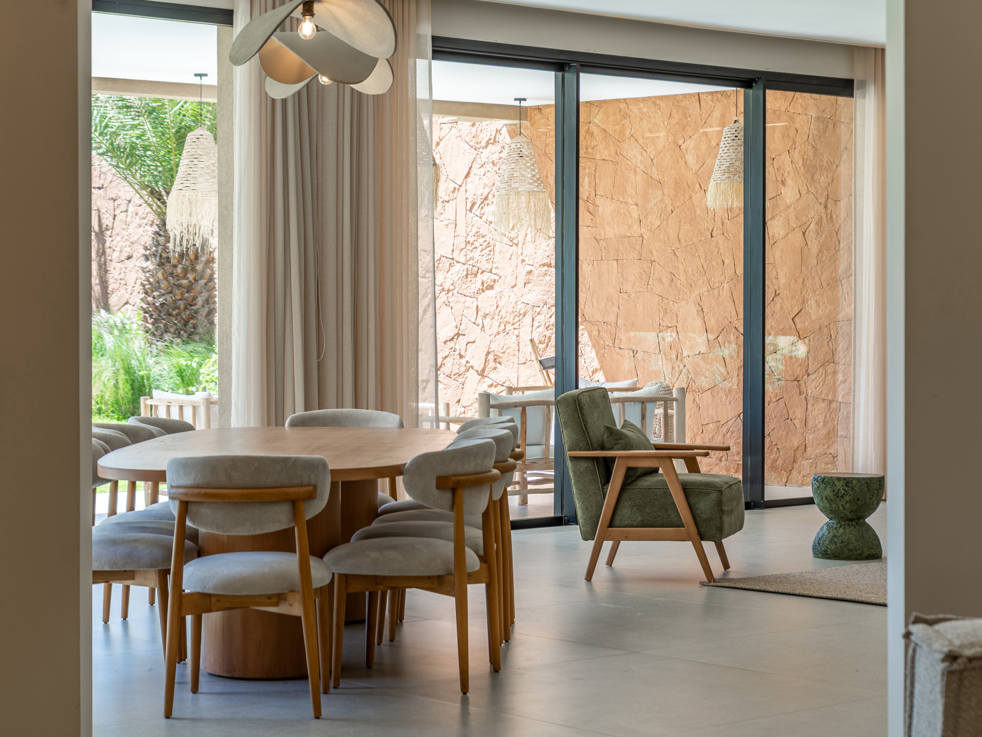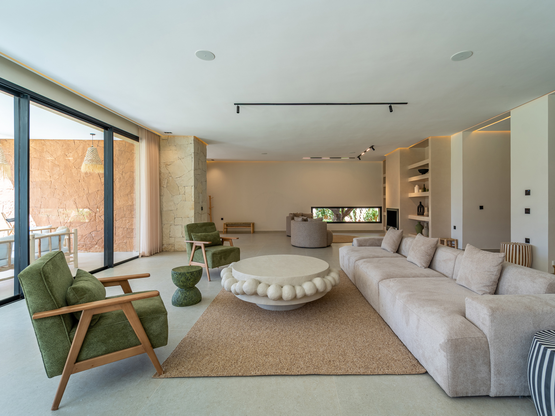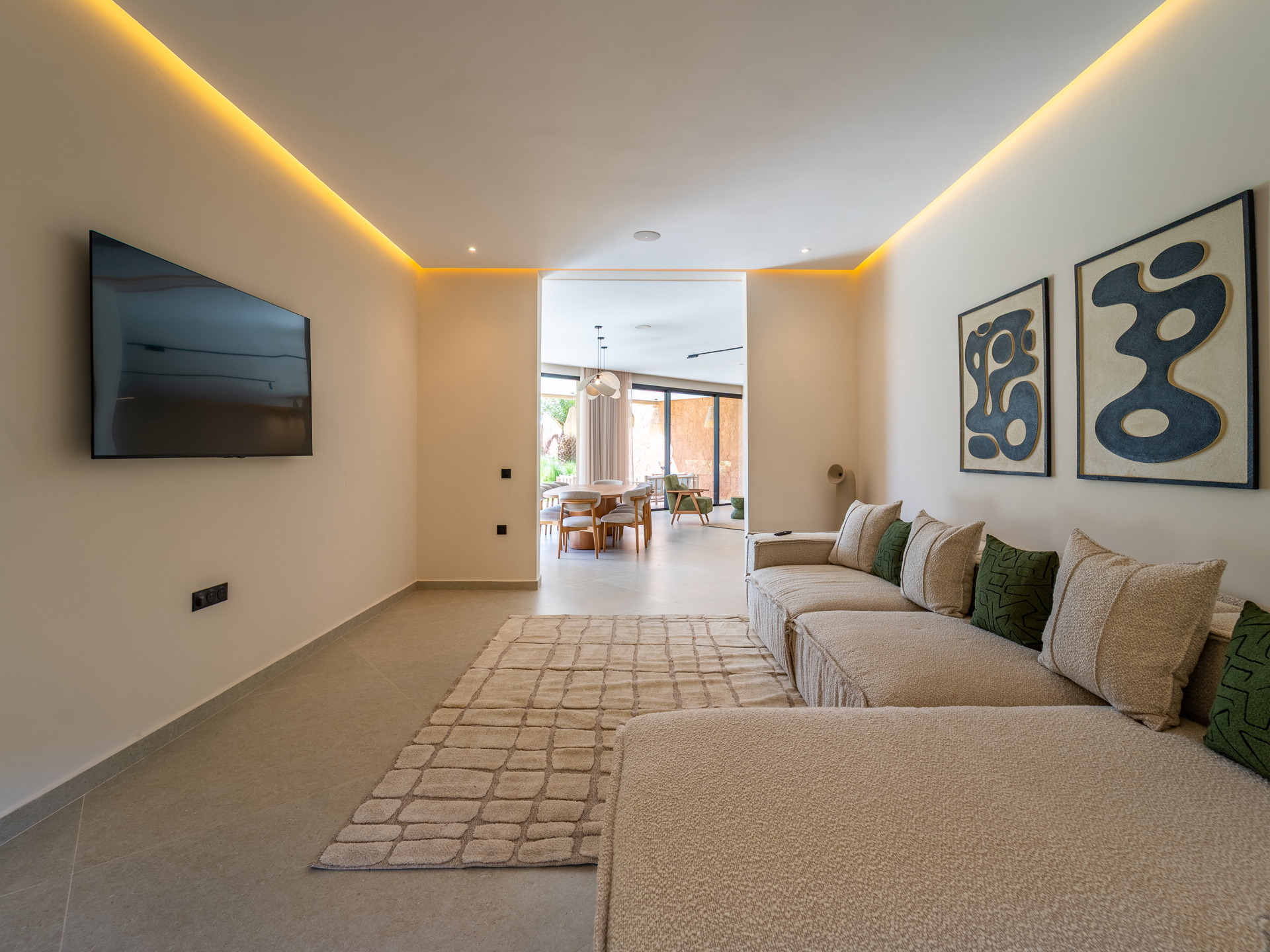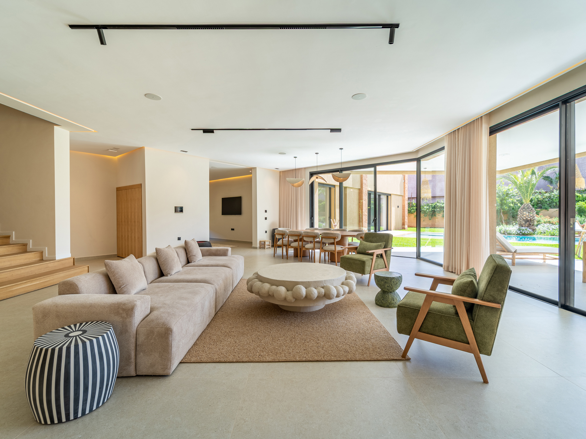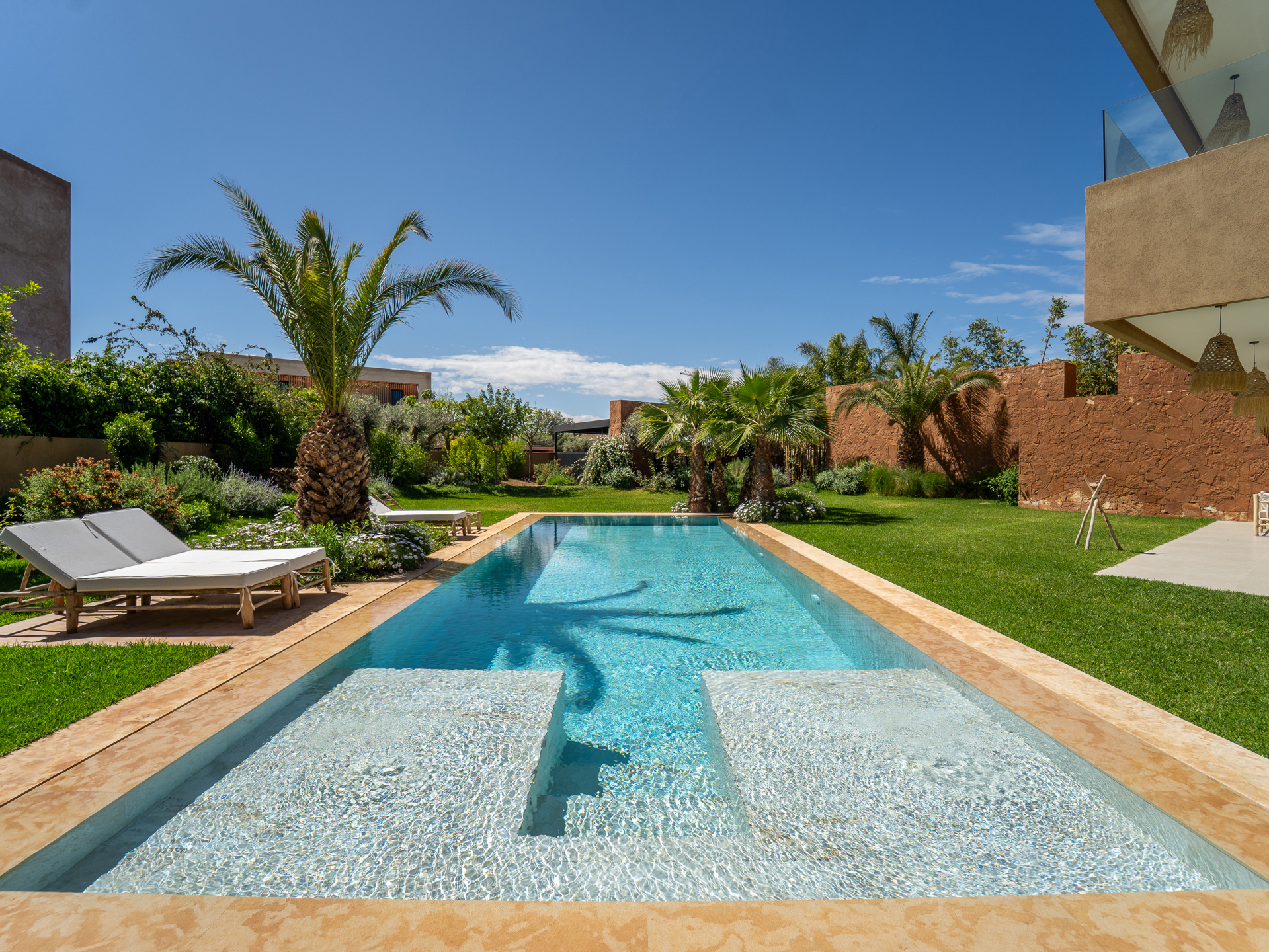 Nestled in the heart of the prestigious Amelkis Golf Resort, this contemporary villa of 565 sqm, built on a 1,500 sqm plot, embodies modern elegance and a refined lifestyle, just a few minutes from the center of Marrakech. Sold fully furnished, the property stands out for the quality of its materials and finishes: double-glazed aluminum joinery, integrated home automation, ducted LG air conditioning, high-end fittings (Hansgrohe, Geberit, Legrand), Italian tiling, and fine European oak wood. The villa offers generous reception areas including a living room with a fireplace, a dining room, a TV lounge, and a fully equipped kitchen with an outdoor dining area, barbecue, and staff quarters. It features 5 suites, including 2 on the ground floor with direct access to the garden and swimming pool, and 3 upstairs, including a sumptuous master suite with an indoor garden, a large walk-in closet, a full bathroom, and a terrace with views of the Atlas Mountains. The outdoor areas are beautifully landscaped and include a heated saltwater pool, spacious terraces, and a covered parking area. Designed for optimal comfort, the villa also benefits from high-performance insulation, pre-installation for solar panels, and top-quality technical features, making this property an ideal residence combining modernity, comfort, and exclusivity. Located just minutes from central Marrakech, Amelkis Resort is one of the most sought-after residential estates in the region, secure and organized around its internationally renowned golf course, offering a rare, მშვიდ, and green living environment. For further information, please contact David Montérin at +212 6 71 43 72 27.