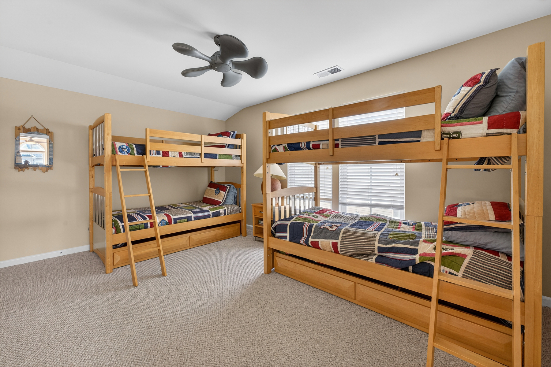 The home offers multiple well-appointed bedrooms, including a bright and serene primary suite with large windows, a private full bath, and a walk-in closet. Additional bedrooms provide flexibility for guests, work-from-home needs, or growing households, including a bunk room setup that maximizes space and functionality. Upstairs, a versatile loft area serves as the perfect secondary living space, media room, or private retreat.