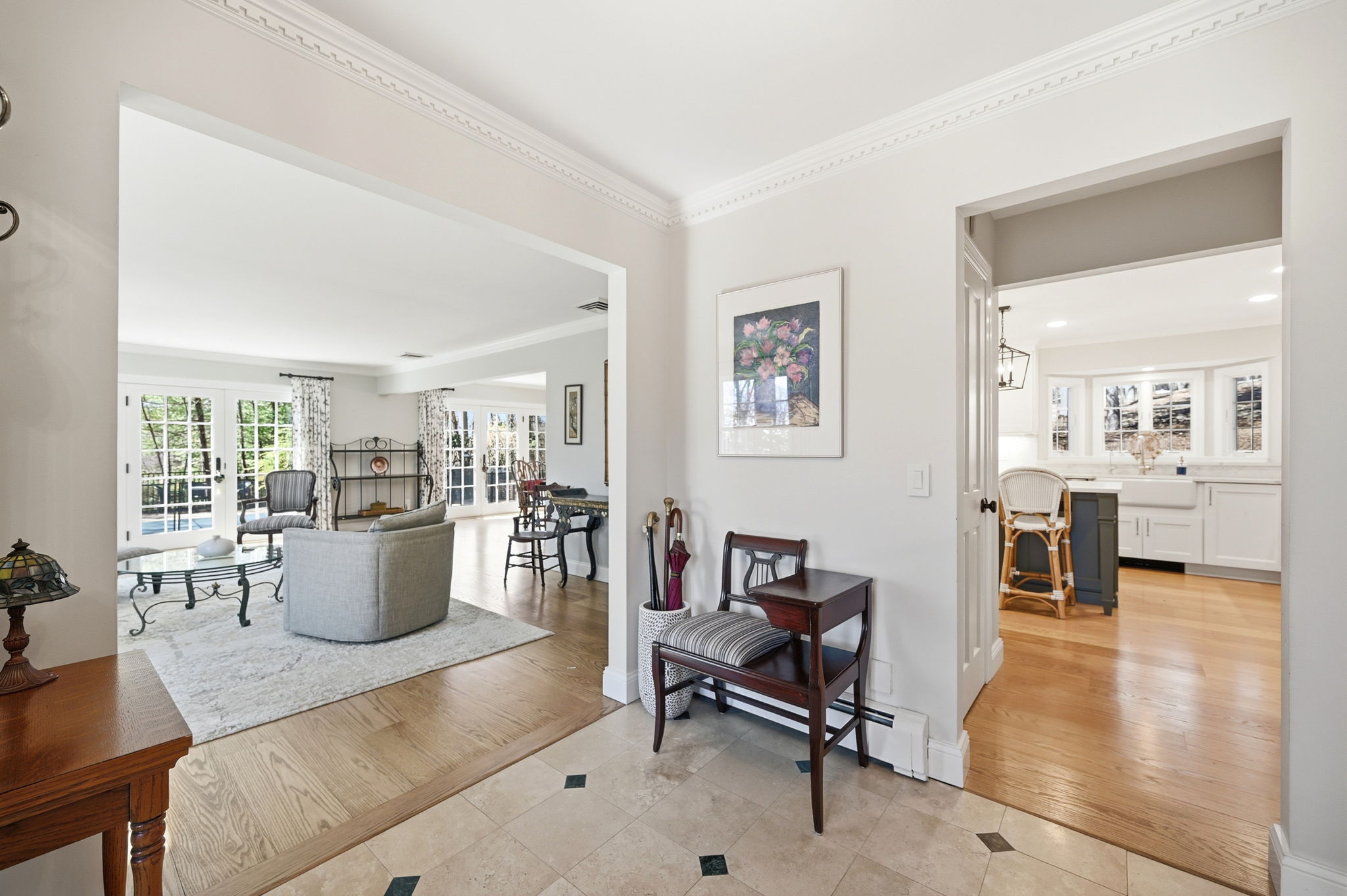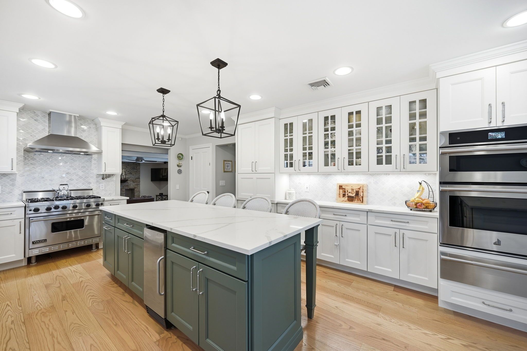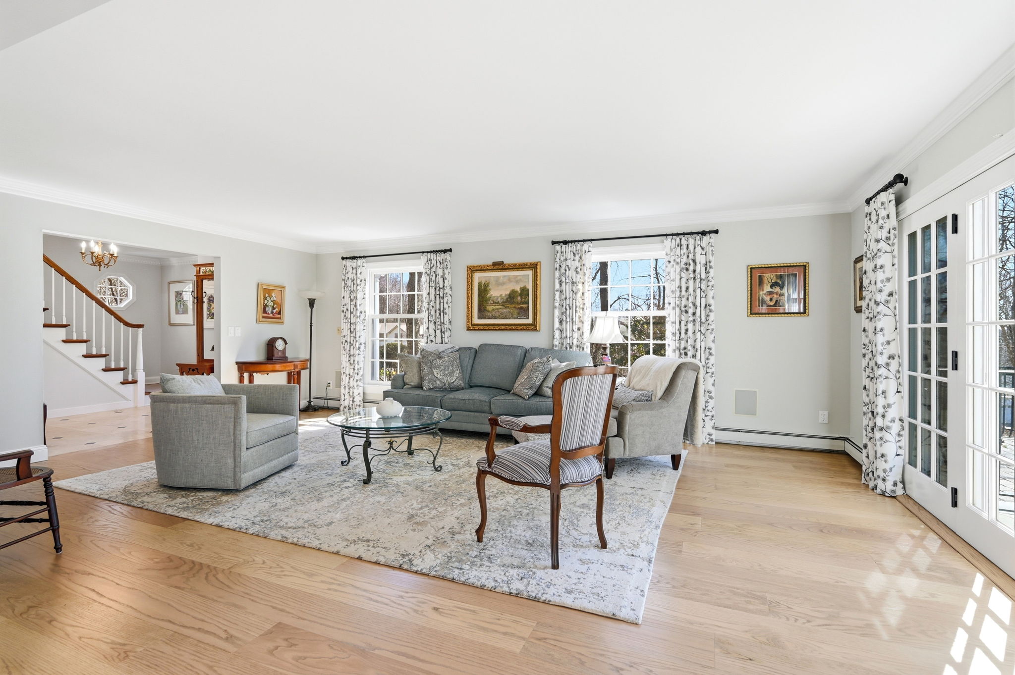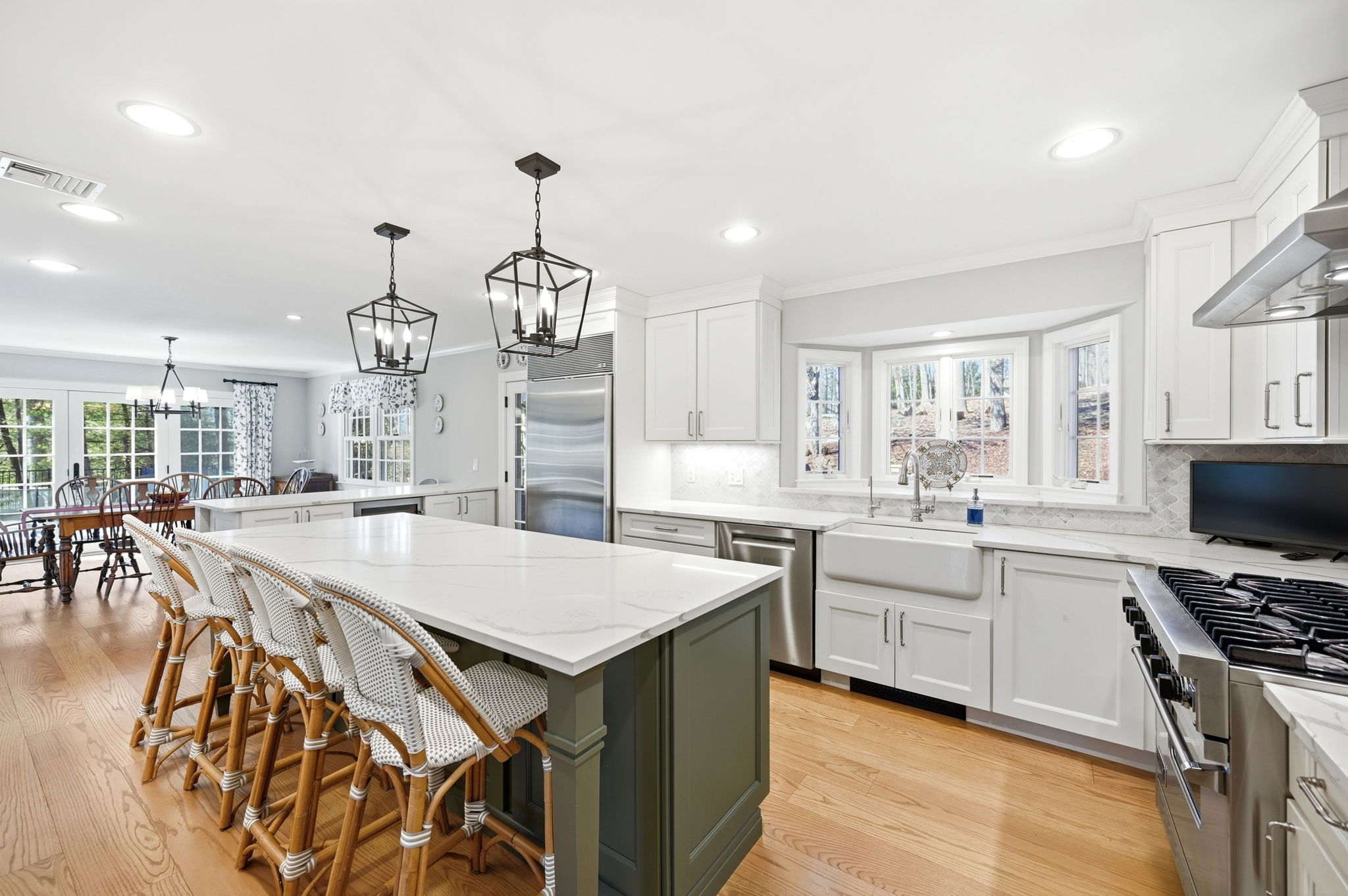 Updated Colonial with extended family suite. Open living room, dining room w/wide 8" wood floors & Sliding glass door to salt water in-ground pool. Beautifully renovated upscale kitchen w/large island, Viking Stove plus wall oven, warming tray, microwave, ice maker, wine cooler, farm sink w/door to deck & brick patio. Sunken Family Room w/stone Fireplace & HW floor, Powder Room, Laundry Room. 2nd floor features Primary Bedroom w/walk-in closet & Primary Bath. Freshly painted extended family or ensuite with full bath, kitchenette, walk-in closet and expansion possibilities. Finished basement adds to more living space with recreation room, office and great storage. Multi-zone gas heat, two zone C/A, central vac (not in extended family addition) U/G Sprinklers, Built-in Mahogany Cabinet w/speaker system. Many details and all on a cul-de-sac location!