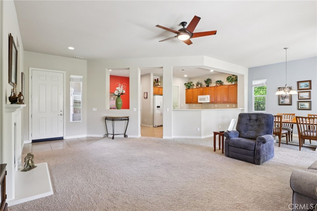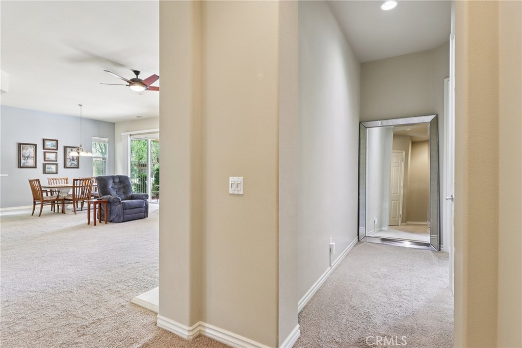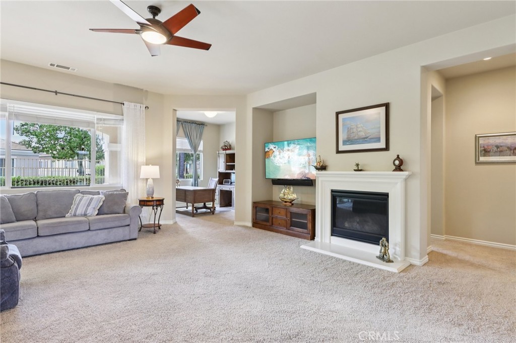 Perfectly positioned within the highly desirable 55+ Solera Diamond Valley community, this exceptional single-story home offers one of the best locations available. Tucked away on a quiet cul-de-sac, bordering a park, and just a short stroll to the community clubhouse, the setting is hard to beat. Step inside and you're immediately greeted by a thoughtfully designed layout and quality finishes throughout. This popular San Carlos floor plan is known for its bright, open-concept design and includes two bedrooms, two bathrooms, plus a versatile office/den. Soaring 10-foot ceilings and 8-foot raised-panel doors add to the home's spacious feel. The kitchen is designed for both everyday living and entertaining, featuring a center island, breakfast nook, upgraded appliances, and a gas cooktop. It flows seamlessly into the inviting living room, where a fireplace creates the perfect ambiance for cooler evenings. The primary suite offers a comfortable retreat with a generously sized walk-in closet, while the laundry room is equipped with added cabinetry and a deep utility sink for functionality. Outside, enjoy a beautifully finished concrete patio - ideal for relaxing or hosting - along with an extended two-car garage providing additional space. Residents of this vibrant community enjoy access to a resort-style clubhouse featuring a state-of-the-art fitness center with indoor walking track, library, billiards room, meeting spaces, theater, indoor pool, two outdoor pools, and courts for bocce ball, tennis, and pickleball. A full calendar of social events and activities makes it easy to stay active and connected.