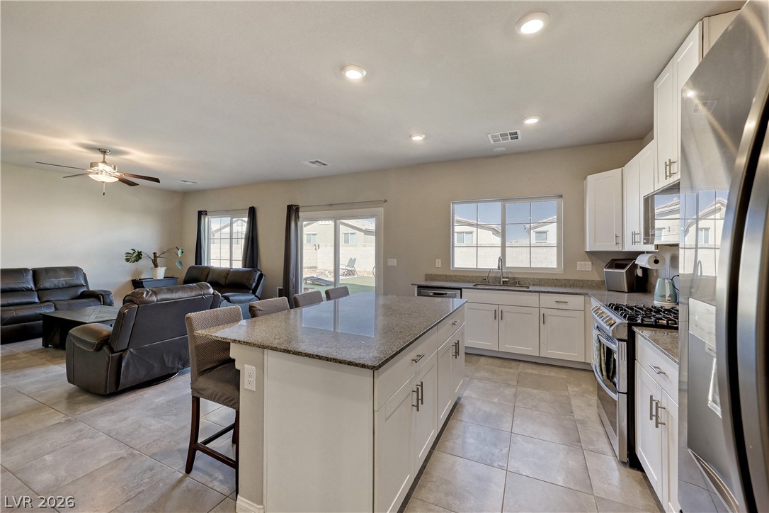 Welcome to 7908 Stone Forest, a spacious 2,950 sq ft N. Las Vegas home offering 5 bedrooms & 3 full baths in a bright, open layout designed for modern living. Located in a gated community and conveniently close to parks, recreation, shopping, and dining, this residence combines privacy with easy access to nearby amenities. The kitchen features stainless steel appliances, granite counters, and white cabinetry, creating a crisp, inviting workspace. A generous loft provides flexible room for entertainment, work, or relaxation. The primary suite includes a thoughtfully custom organized walk-in closet and a well-appointed ensuite bath. Outdoors, the large backyard is ideal for low maintenance enjoyment with a pavered patio and synthetic turf, perfect for year-round use. With ample living space and functional upgrades throughout, including solar panels, this home blends comfort, style, and convenience in a desirable North Las Vegas location. Best of all, it has a 2.75% assumable VA loan.