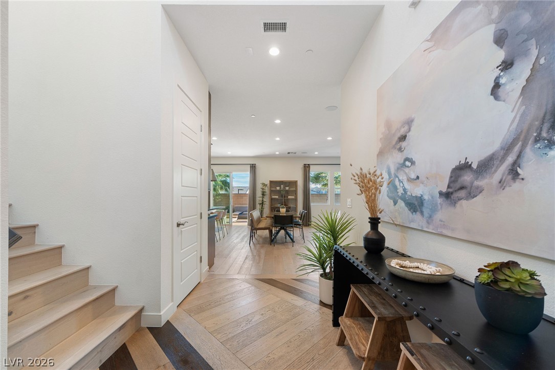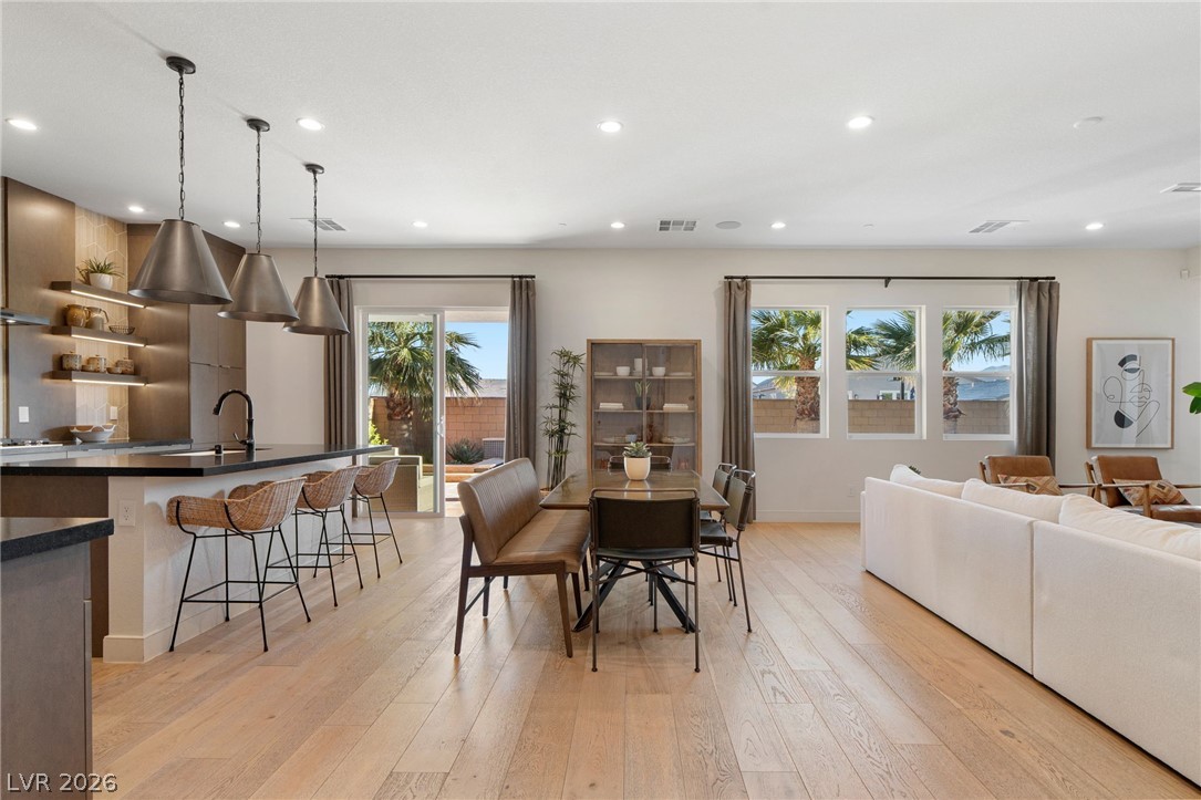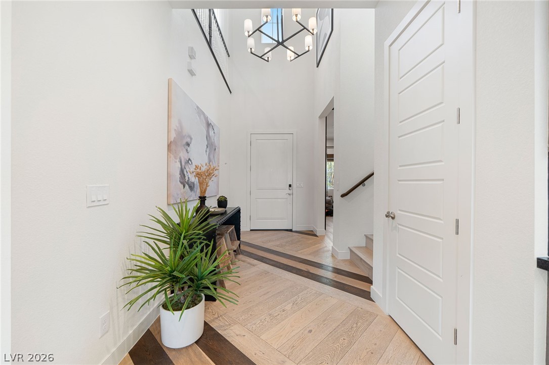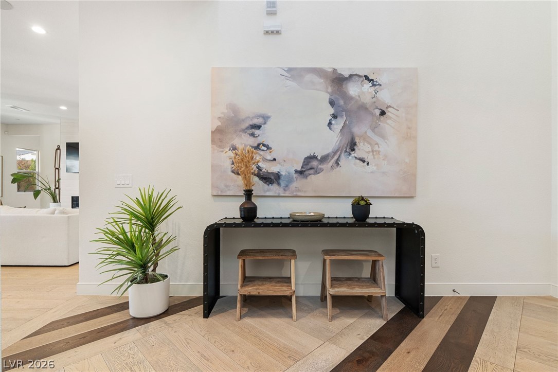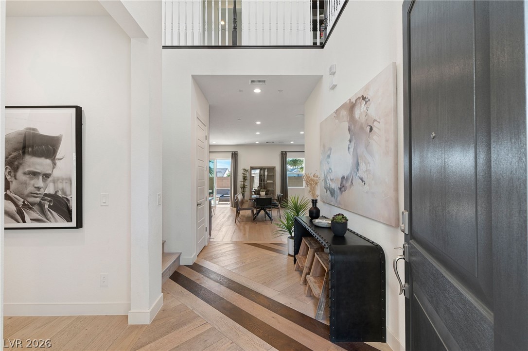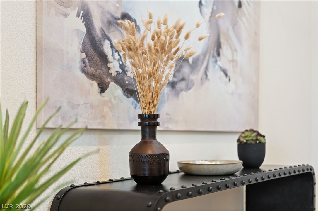 Experience elevated living in this former Toll Brothers model home in Skye Canyon, showcasing over $420,000 in thoughtfully curated upgrades. A grand vaulted foyer and expansive windows fill the home with natural light, highlighting white oak hardwood floors and refined designer finishes throughout. The open concept layout centers around a striking chef's kitchen with quartz countertops, a full height textured backsplash, two tone black stainless appliances, and floating shelving, seamlessly flowing into an inviting great room. The home also offers a private office, downstairs guest suite, and a spacious loft. The primary suite is a true retreat with a spa inspired shower and blackout blinds for complete comfort. Outside, a beautifully finished backyard features travertine decking, a custom water feature, and a built in BBQ, perfect for entertaining. Ideally located near Skye Canyon Community Center. SID fully paid, this home delivers a refined living experience from start to finish.