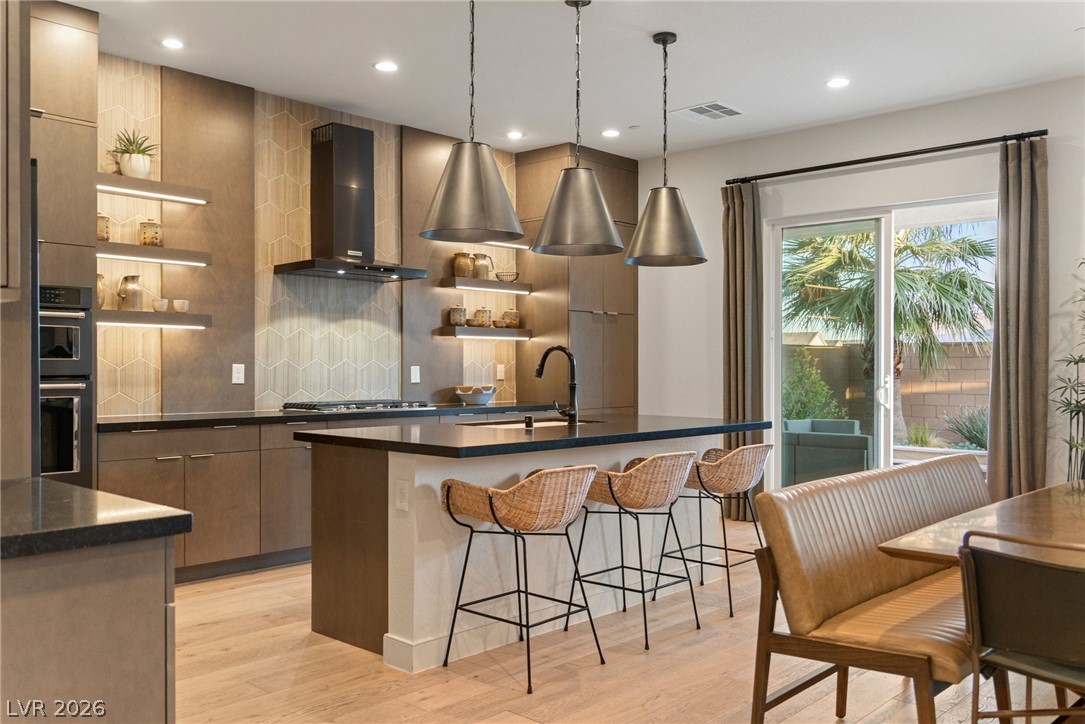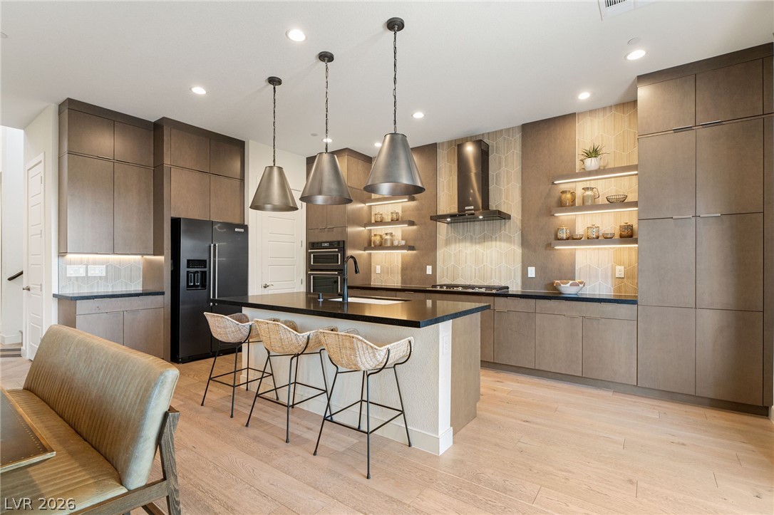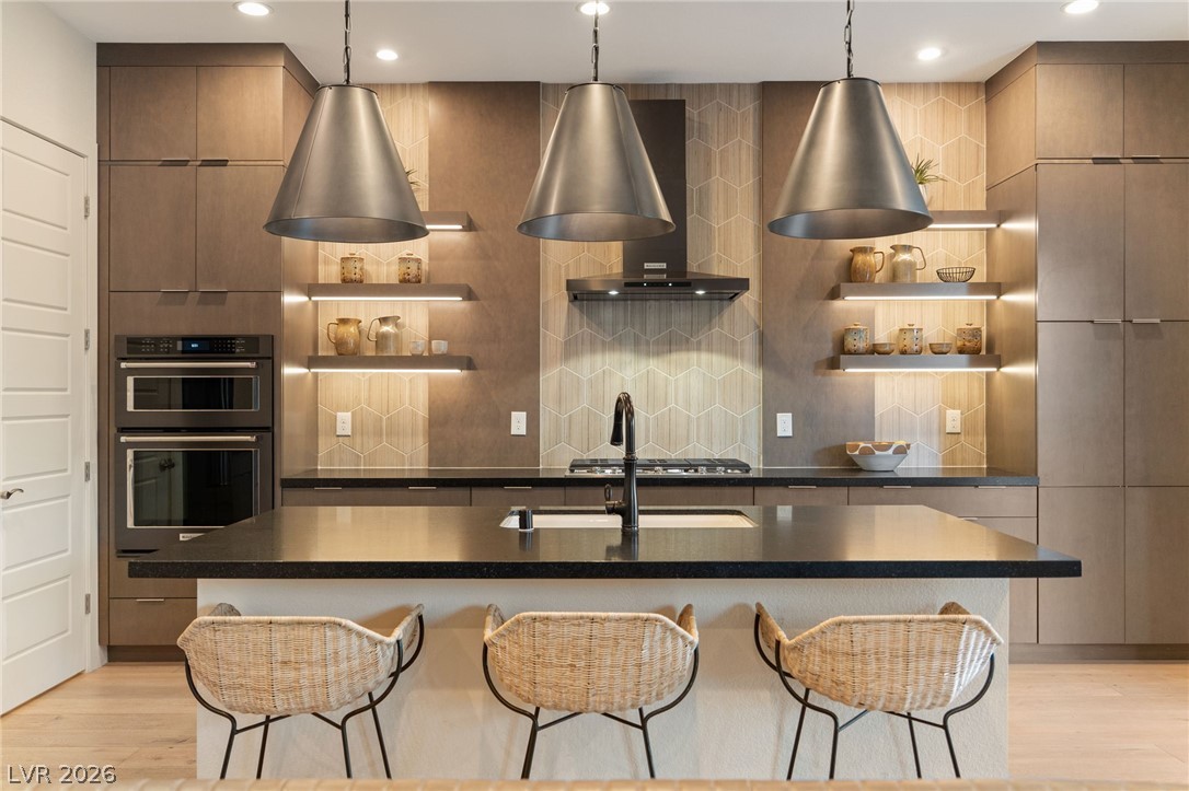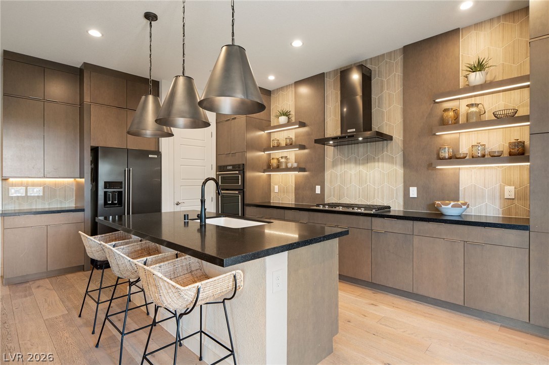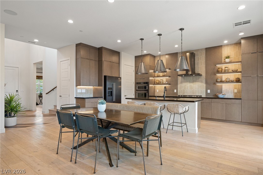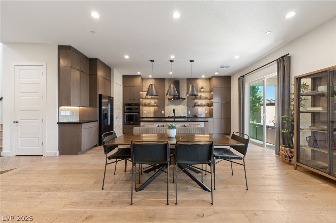 Experience elevated living in this former Toll Brothers model home in Skye Canyon, showcasing over $420,000 in thoughtfully curated upgrades. A grand vaulted foyer and expansive windows fill the home with natural light, highlighting white oak hardwood floors and refined designer finishes throughout. The open concept layout centers around a striking chef's kitchen with quartz countertops, a full height textured backsplash, two tone black stainless appliances, and floating shelving, seamlessly flowing into an inviting great room. The home also offers a private office, downstairs guest suite, and a spacious loft. The primary suite is a true retreat with a spa inspired shower and blackout blinds for complete comfort. Outside, a beautifully finished backyard features travertine decking, a custom water feature, and a built in BBQ, perfect for entertaining. Ideally located near Skye Canyon Community Center. SID fully paid, this home delivers a refined living experience from start to finish.