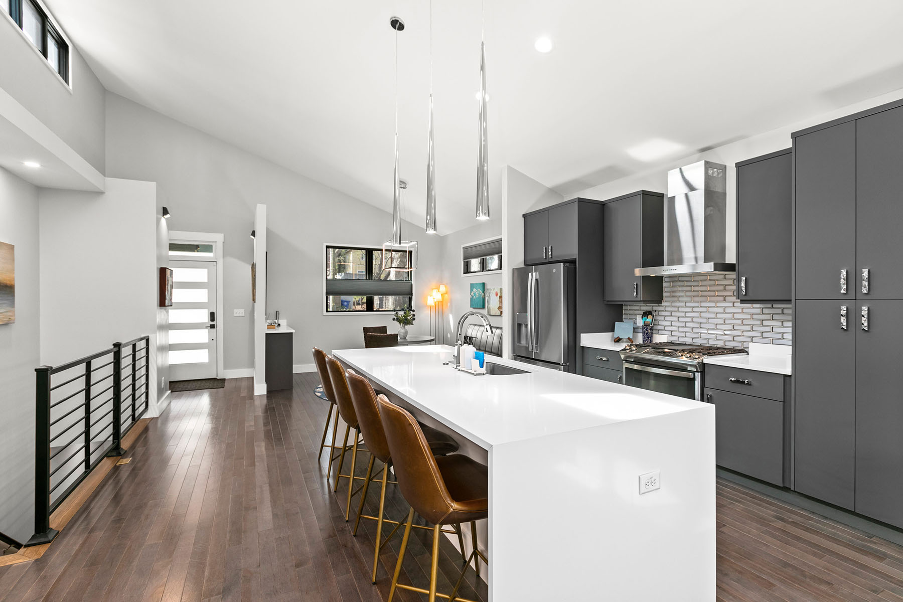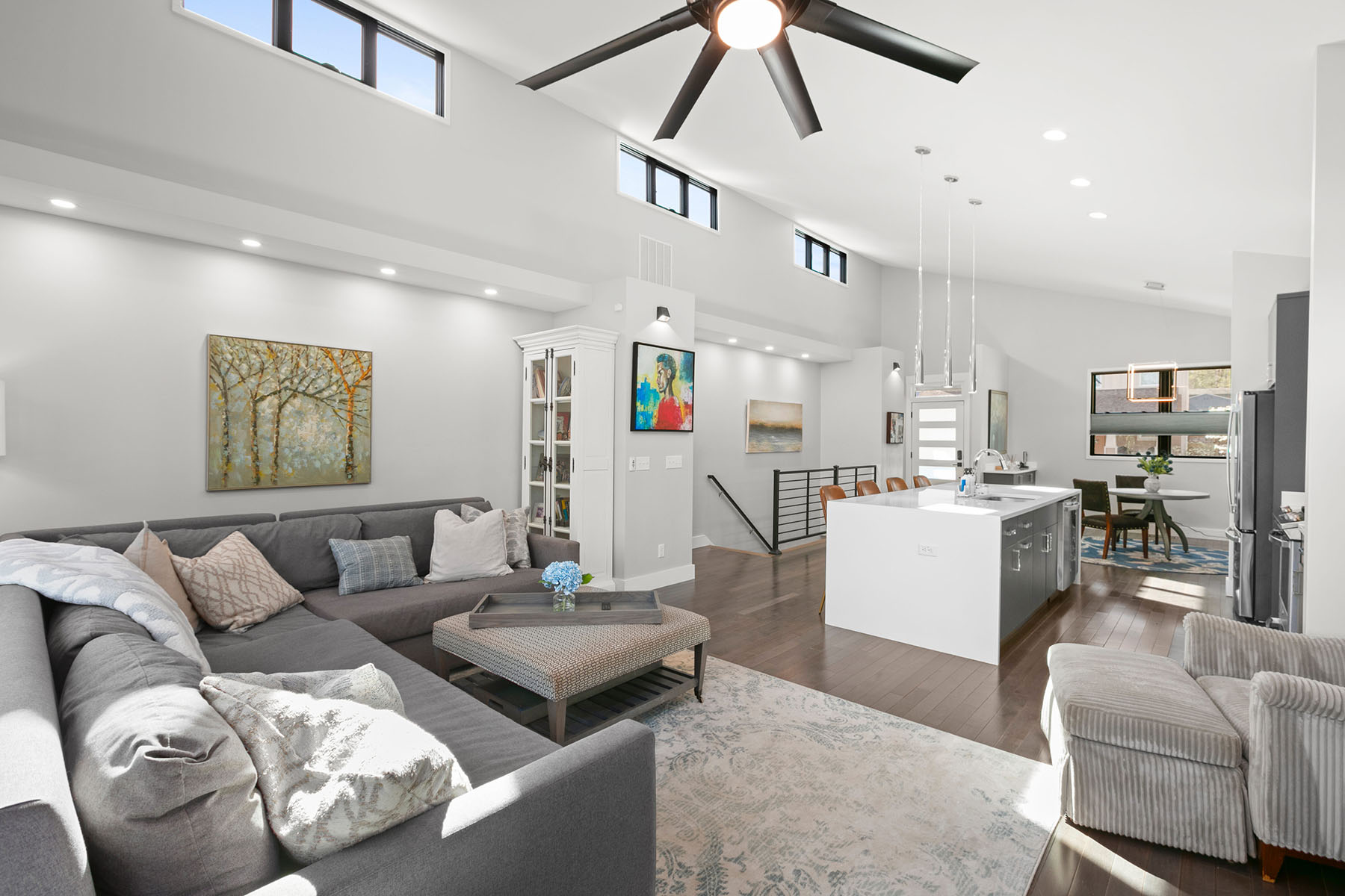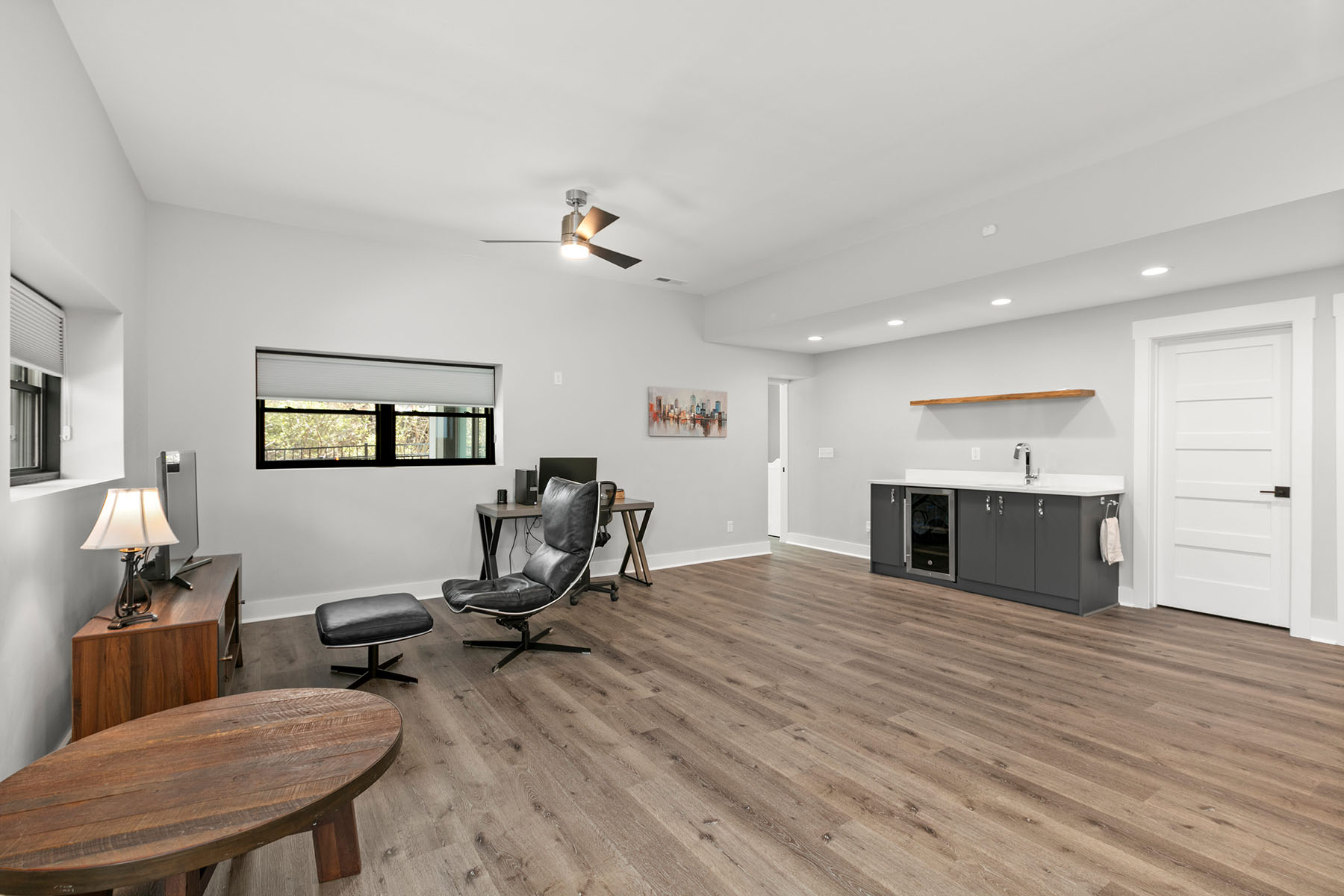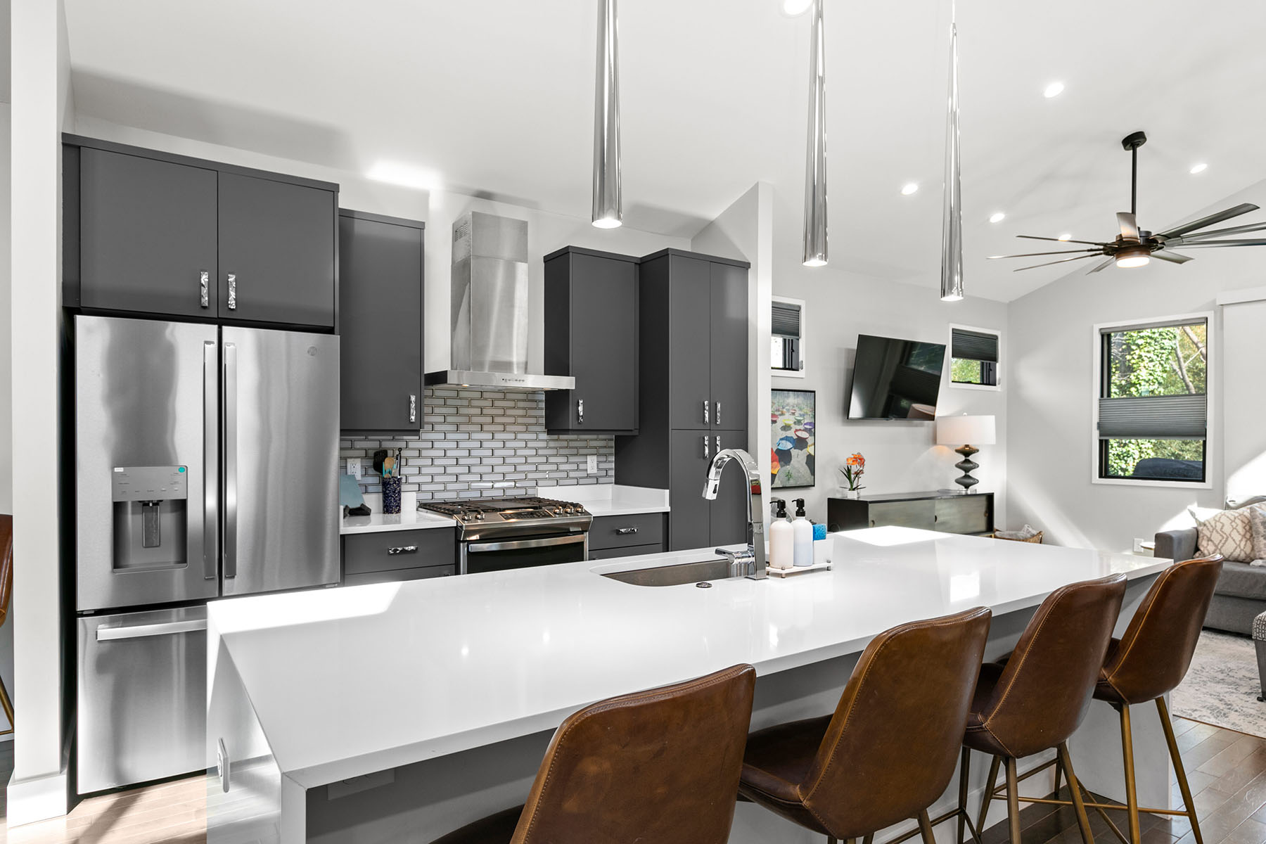 In the heart of sought-after West Asheville, this green-built luxurious modern residence epitomizes upscale living. Within proximity to an array of exceptional restaurants, shops, galleries and breweries, this property offers the ultimate in main-level living, boasting an open-concept design featuring a stunning white quartz waterfall island, high-end fixtures, custom blinds and soaring ceilings. Abundant natural light fills the home thanks to the generous number of windows throughout, creating a bright and inviting atmosphere. The exterior spaces are equally impressive, featuring two composite decks with elegant horizontal railings, one accessible from the main living area and the other a private porch off the primary suite. The primary suite is further enhanced by a double quartz vanity and an expansive stone and tile shower ensuite. The fully fenced, level yard provides a serene retreat, complete with private side door access to the terrace level and beautifully landscaped rock work. The terrace level presents a versatile space, ideal for a spacious playroom or media room, home office, family room with a wet bar and wine fridge, full bathroom, fourth bedroom, laundry area and workout space. Additionally, there is another hookup for a stackable washer and dryer upstairs for added convenience. This property could also be utilized as an extended-stay guest suite, a source of income through long-term rental, or a homestay, presenting a multitude of possibilities for the discerning buyer (subject to verification).