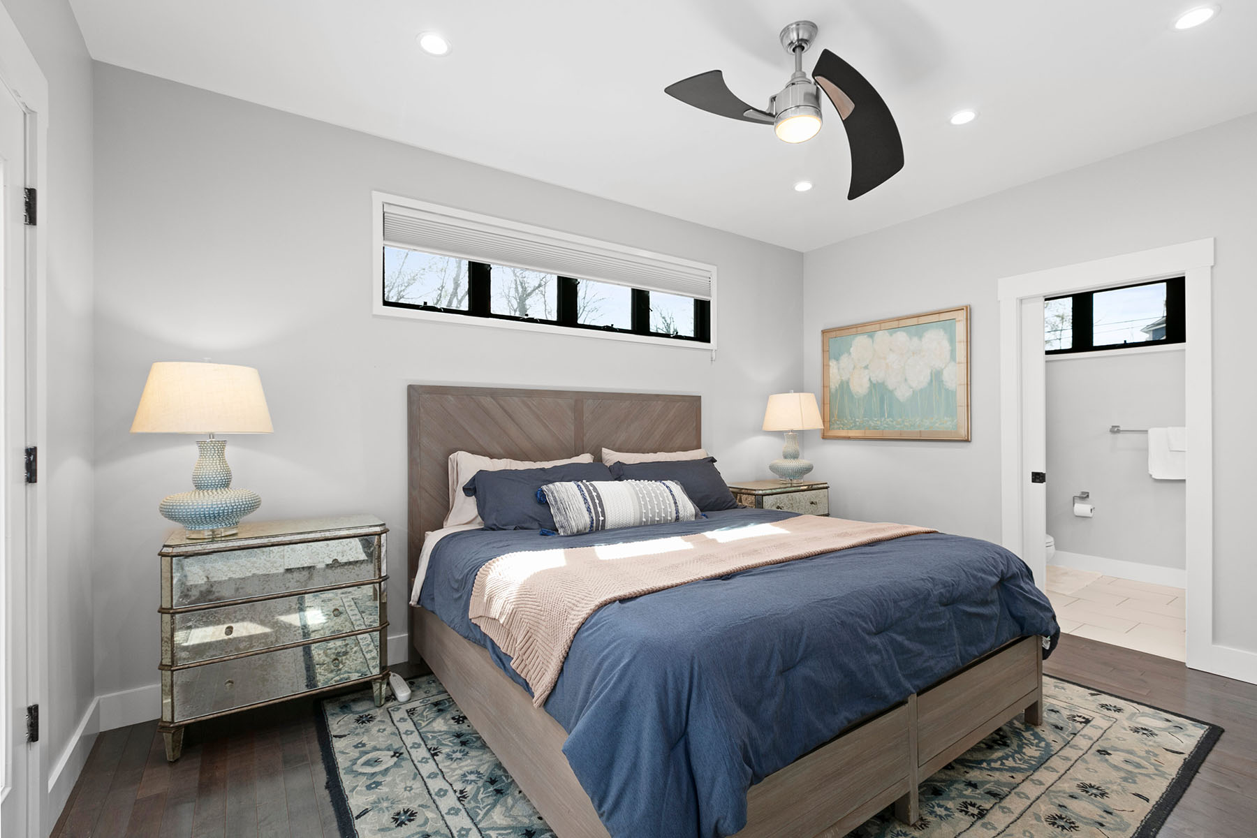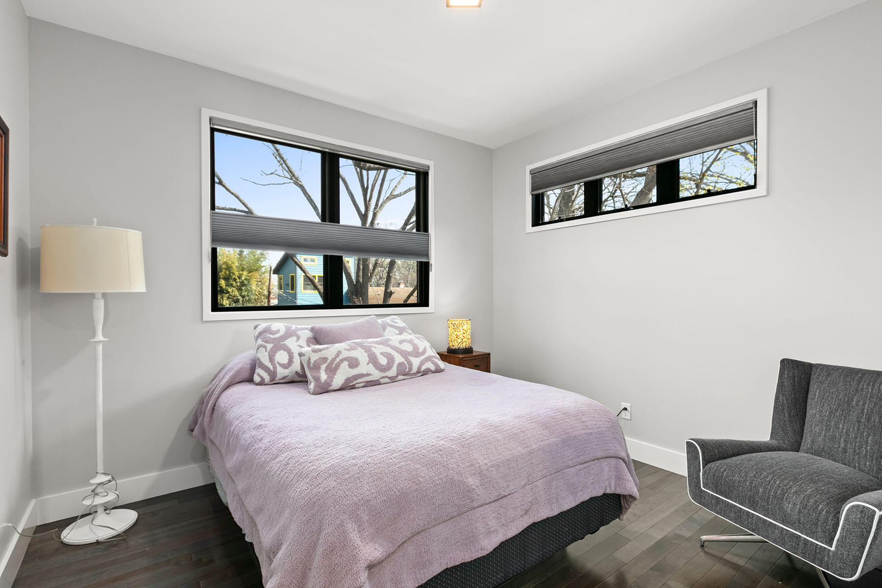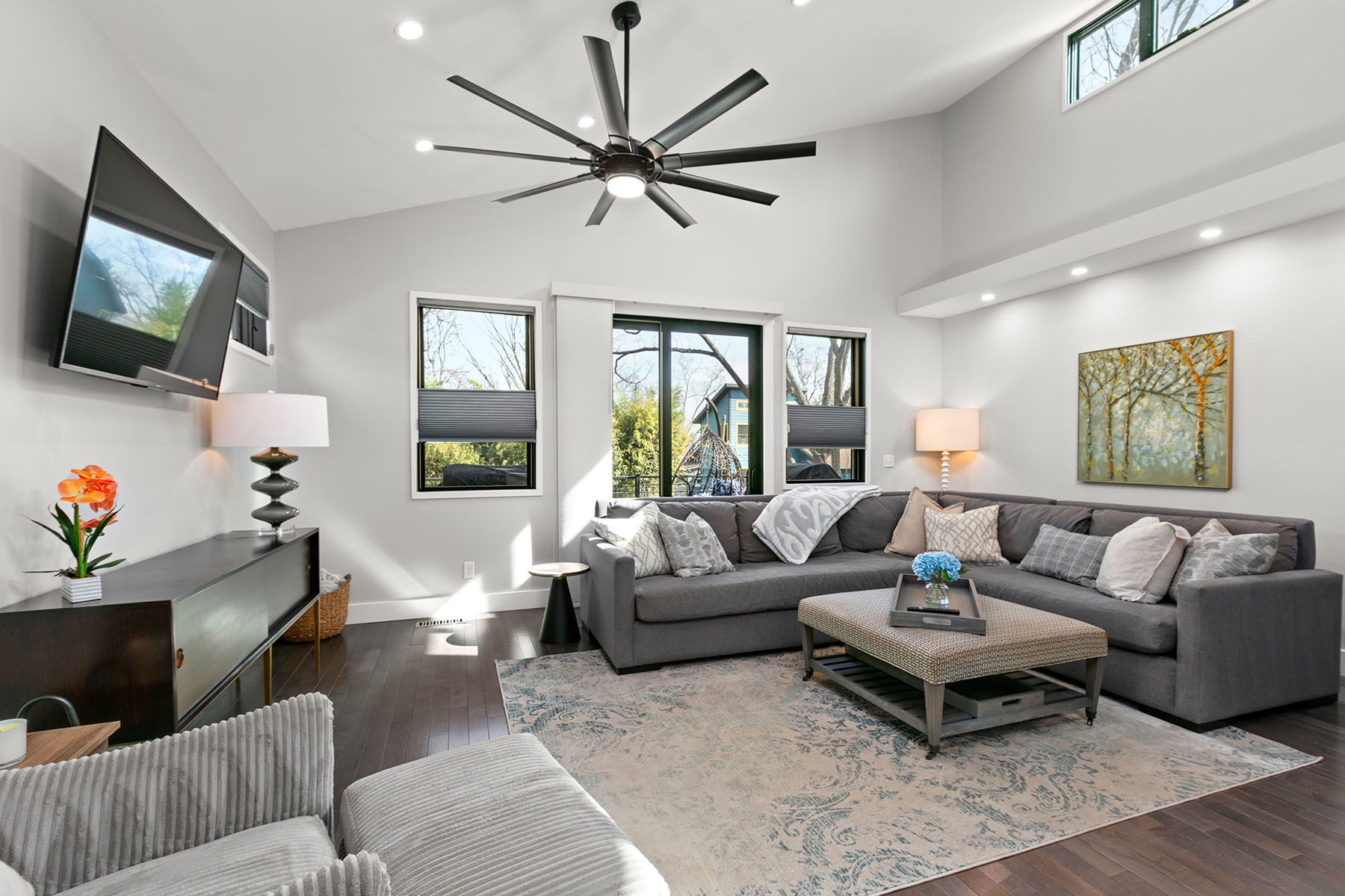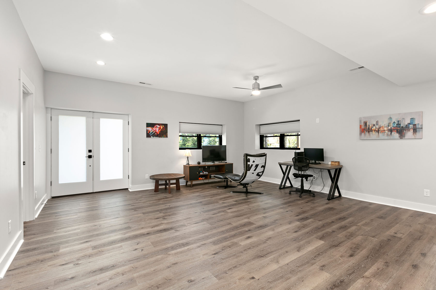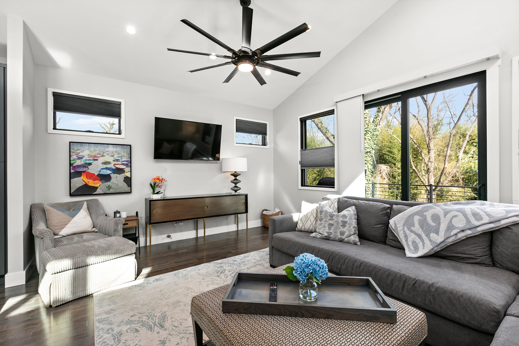 In the heart of sought-after West Asheville, this green-built luxurious modern residence epitomizes upscale living. Within proximity to an array of exceptional restaurants, shops, galleries and breweries, this property offers the ultimate in main-level living, boasting an open-concept design featuring a stunning white quartz waterfall island, high-end fixtures, custom blinds and soaring ceilings. Abundant natural light fills the home thanks to the generous number of windows throughout, creating a bright and inviting atmosphere. The exterior spaces are equally impressive, featuring two composite decks with elegant horizontal railings, one accessible from the main living area and the other a private porch off the primary suite. The primary suite is further enhanced by a double quartz vanity and an expansive stone and tile shower ensuite. The fully fenced, level yard provides a serene retreat, complete with private side door access to the terrace level and beautifully landscaped rock work. The terrace level presents a versatile space, ideal for a spacious playroom or media room, home office, family room with a wet bar and wine fridge, full bathroom, fourth bedroom, laundry area and workout space. Additionally, there is another hookup for a stackable washer and dryer upstairs for added convenience. This property could also be utilized as an extended-stay guest suite, a source of income through long-term rental, or a homestay, presenting a multitude of possibilities for the discerning buyer (subject to verification).