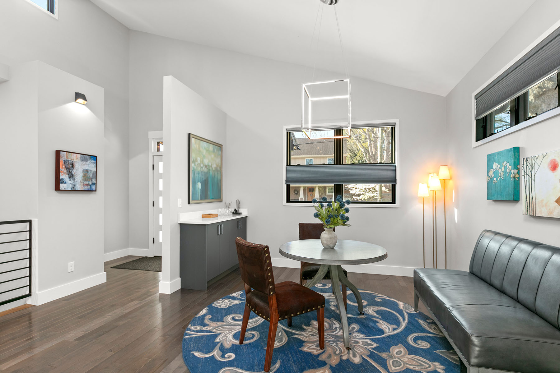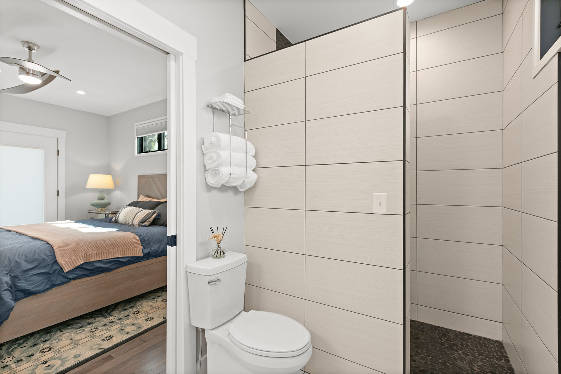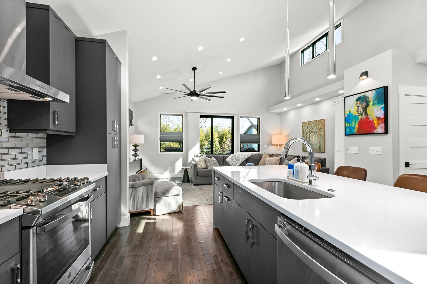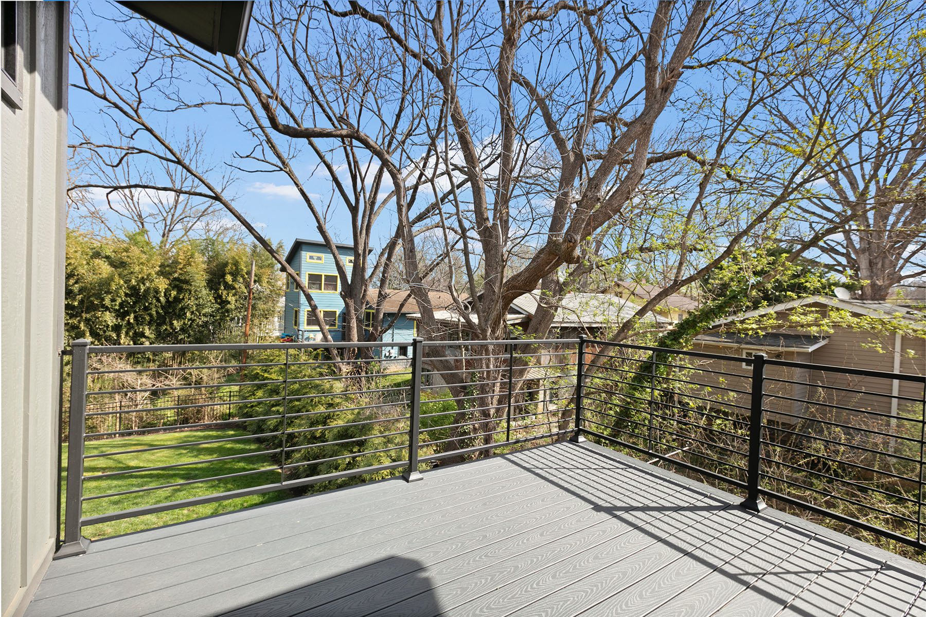 In the heart of sought-after West Asheville, this green-built luxurious modern residence epitomizes upscale living. Within proximity to an array of exceptional restaurants, shops, galleries and breweries, this property offers the ultimate in main-level living, boasting an open-concept design featuring a stunning white quartz waterfall island, high-end fixtures, custom blinds and soaring ceilings. Abundant natural light fills the home thanks to the generous number of windows throughout, creating a bright and inviting atmosphere. The exterior spaces are equally impressive, featuring two composite decks with elegant horizontal railings, one accessible from the main living area and the other a private porch off the primary suite. The primary suite is further enhanced by a double quartz vanity and an expansive stone and tile shower ensuite. The fully fenced, level yard provides a serene retreat, complete with private side door access to the terrace level and beautifully landscaped rock work. The terrace level presents a versatile space, ideal for a spacious playroom or media room, home office, family room with a wet bar and wine fridge, full bathroom, fourth bedroom, laundry area and workout space. Additionally, there is another hookup for a stackable washer and dryer upstairs for added convenience. This property could also be utilized as an extended-stay guest suite, a source of income through long-term rental, or a homestay, presenting a multitude of possibilities for the discerning buyer (subject to verification).