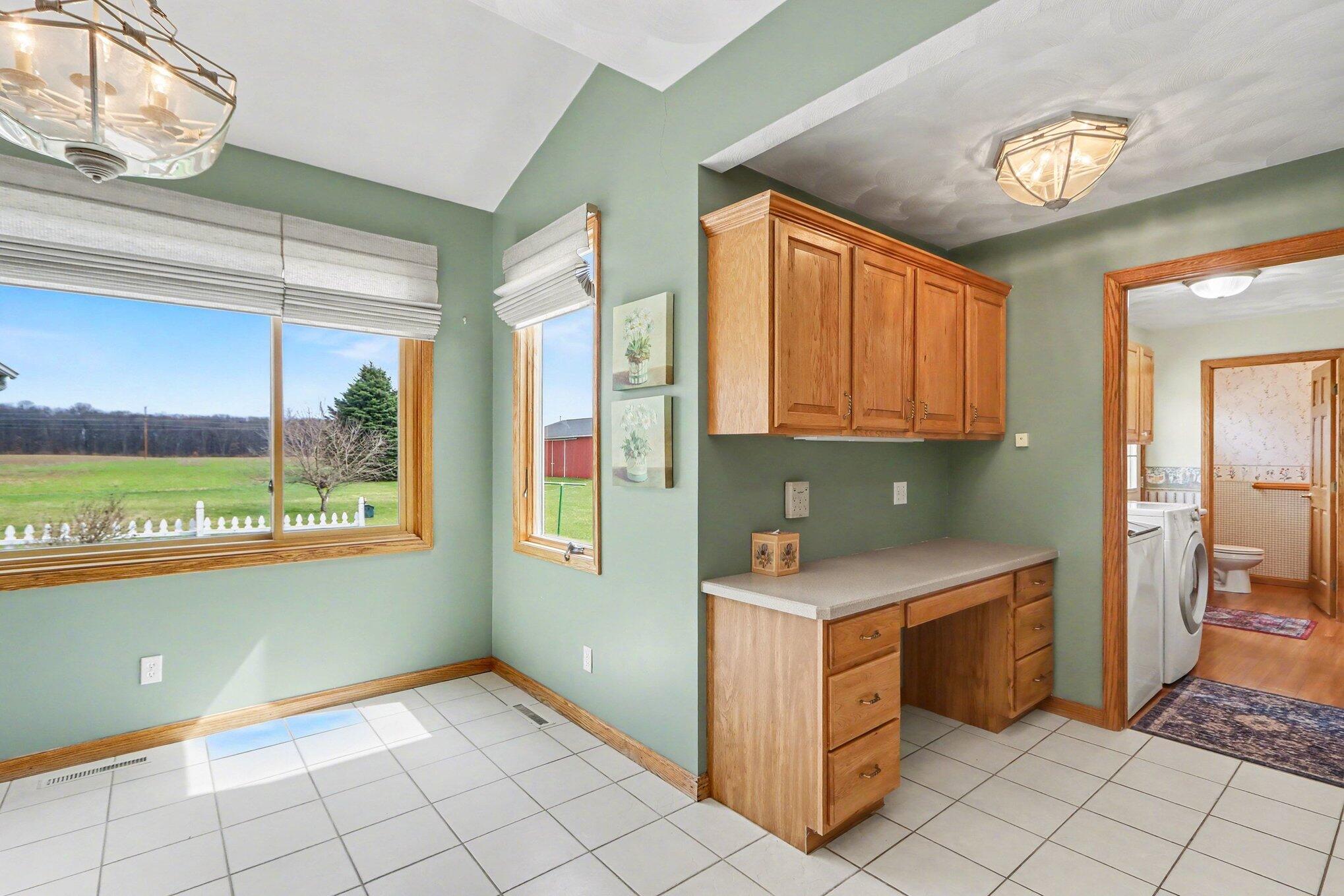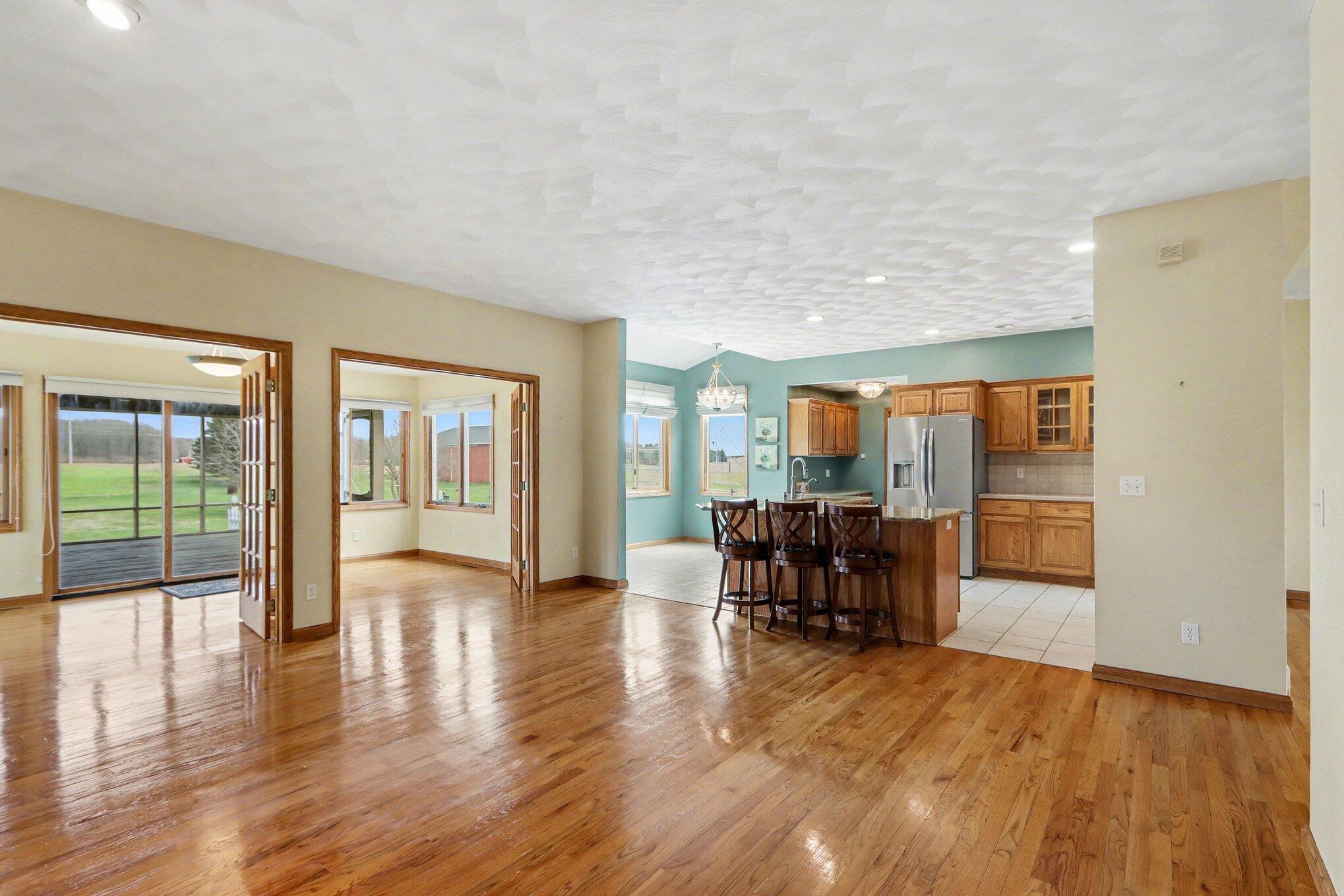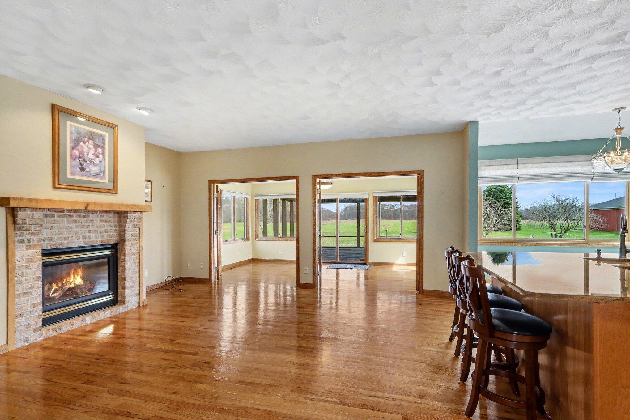 Beautifully maintained 4-bedroom, 3.5-bath ranch situated on 17 scenic acres, offering an exceptional combination of space, comfort, and privacy. This well-appointed home features an inviting covered front porch, thoughtful floor plan, and quality finishes throughout. The main level showcases hardwood flooring, a spacious living room with fireplace, and an open-concept layout that flows seamlessly into the kitchen and dining area. The kitchen is well-equipped with granite countertops, abundant cabinetry, a center island with seating, and picturesque views of the surrounding property. A vaulted screened porch provides the perfect place to unwind and take in the peaceful setting. The primary suite offers a private retreat with dual vanities, a soaking tub, and separate shower. Additional bedrooms are generously sized and provide flexibility for guests, office space, or additional living needs. The finished walkout lower level adds impressive versatility with a large open living area, second kitchen, and direct exterior access, making it ideal for entertaining, multi-generational living, or guest accommodations. Outside, the property features a 60x40 pole barn with concrete floors, expansive yard space, and a beautiful mix of open acreage and natural privacy. Whether you are looking for room to roam, hobby space, or added storage, this property offers endless possibilities. A rare opportunity to own a beautifully cared-for home with acreage, functionality, and a peaceful country setting. Call Clint for your private showing today! 269-317-0127