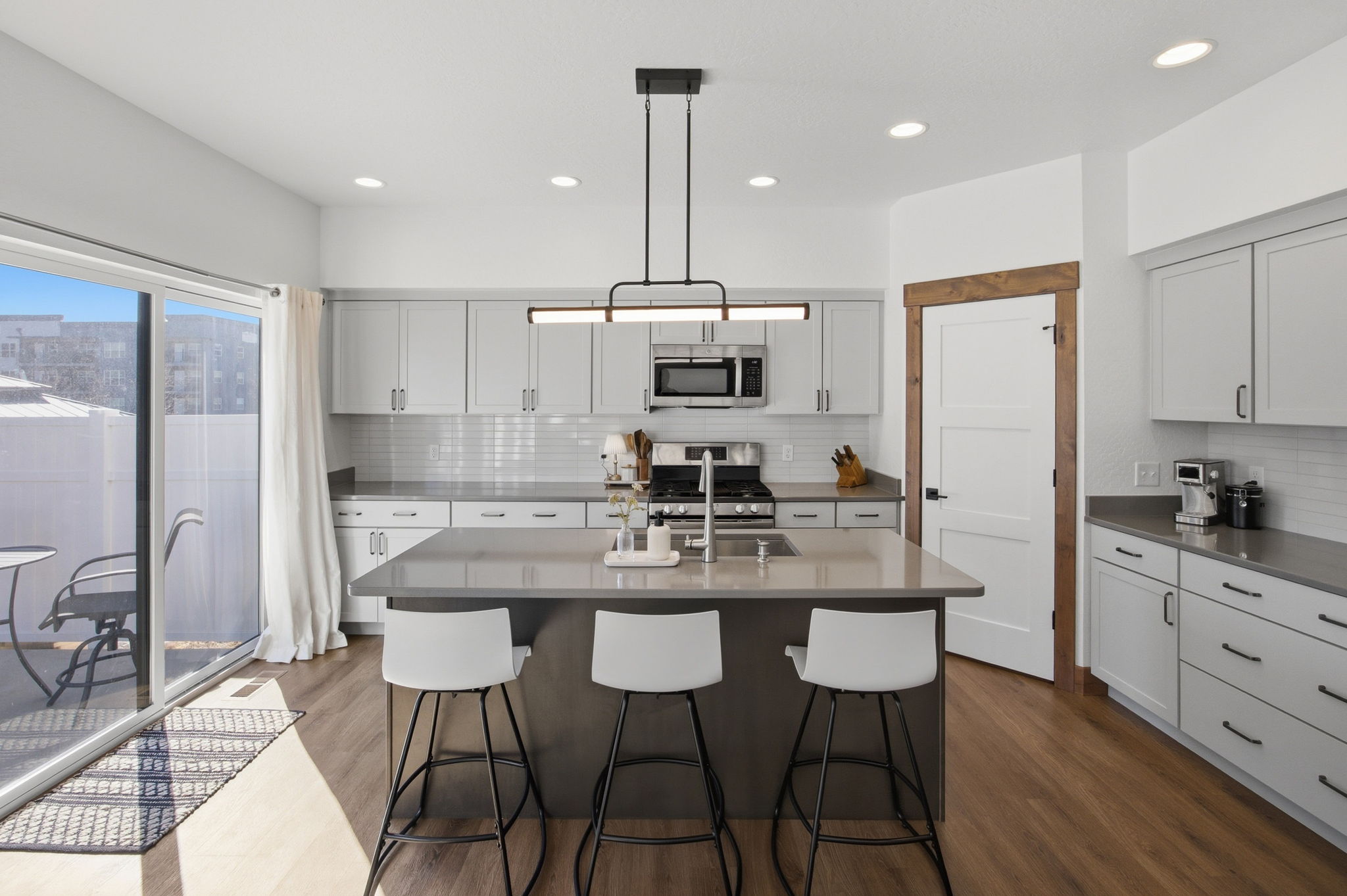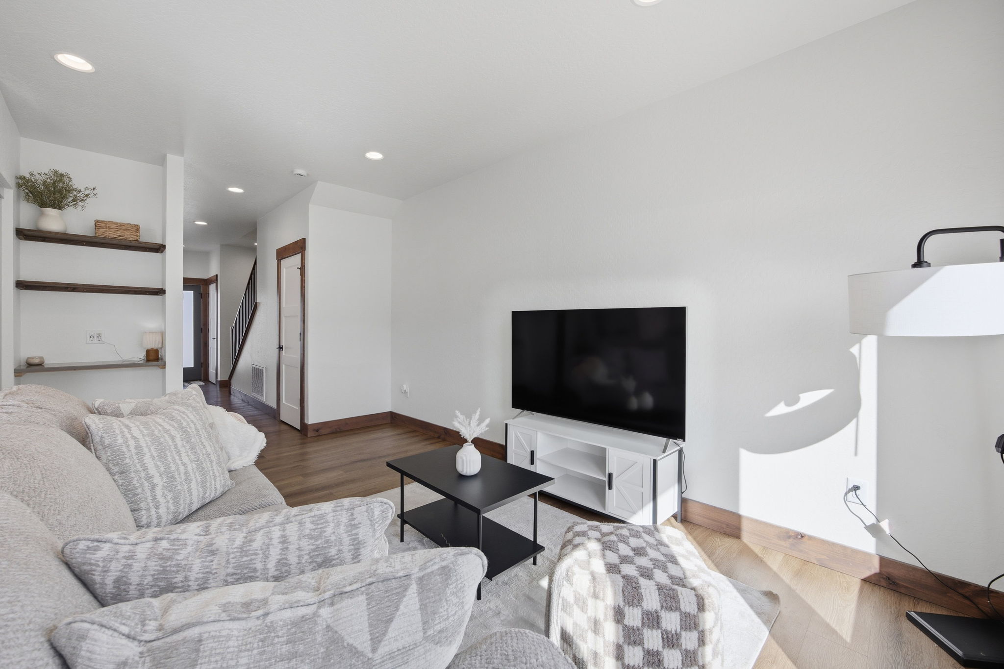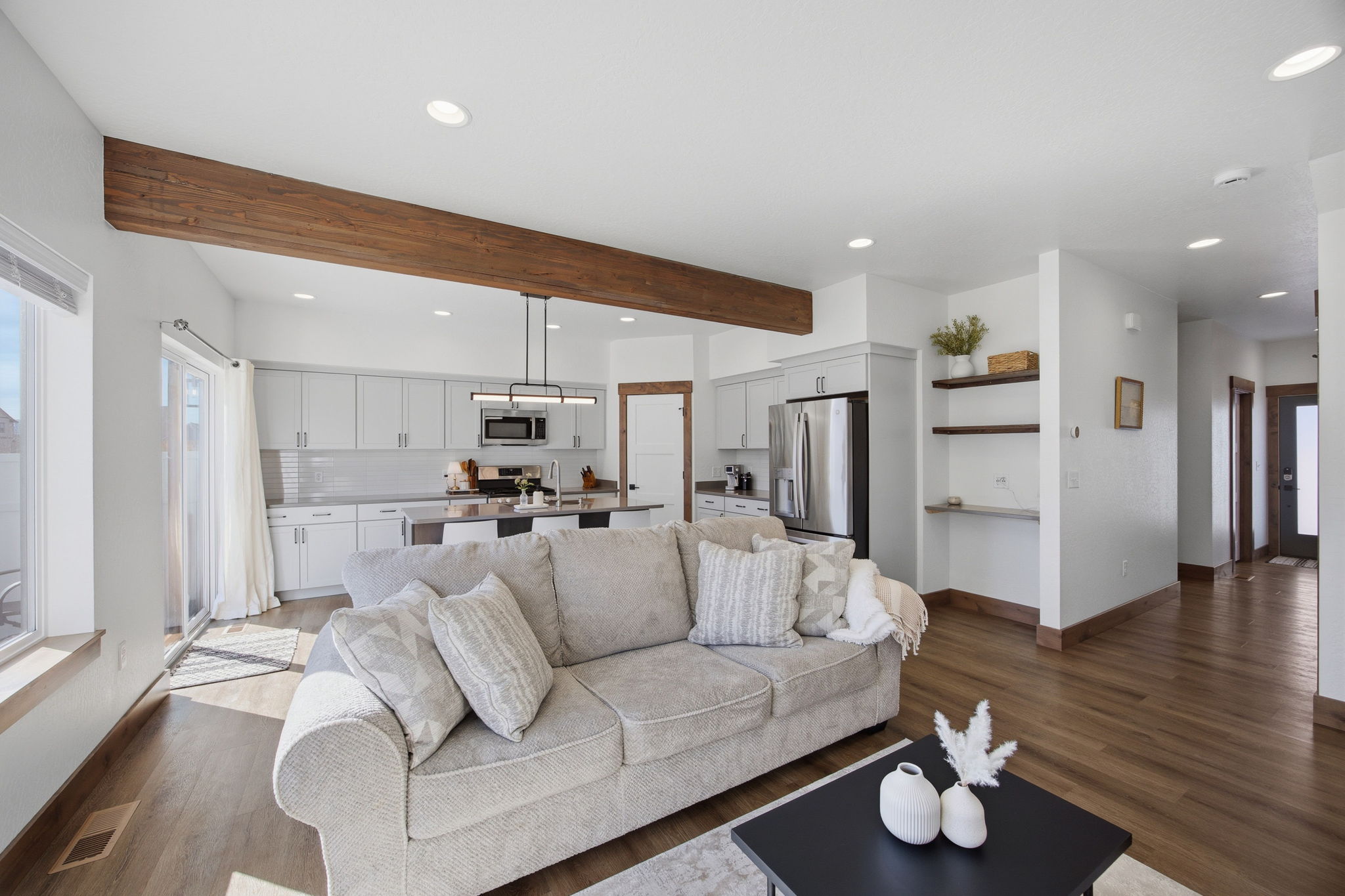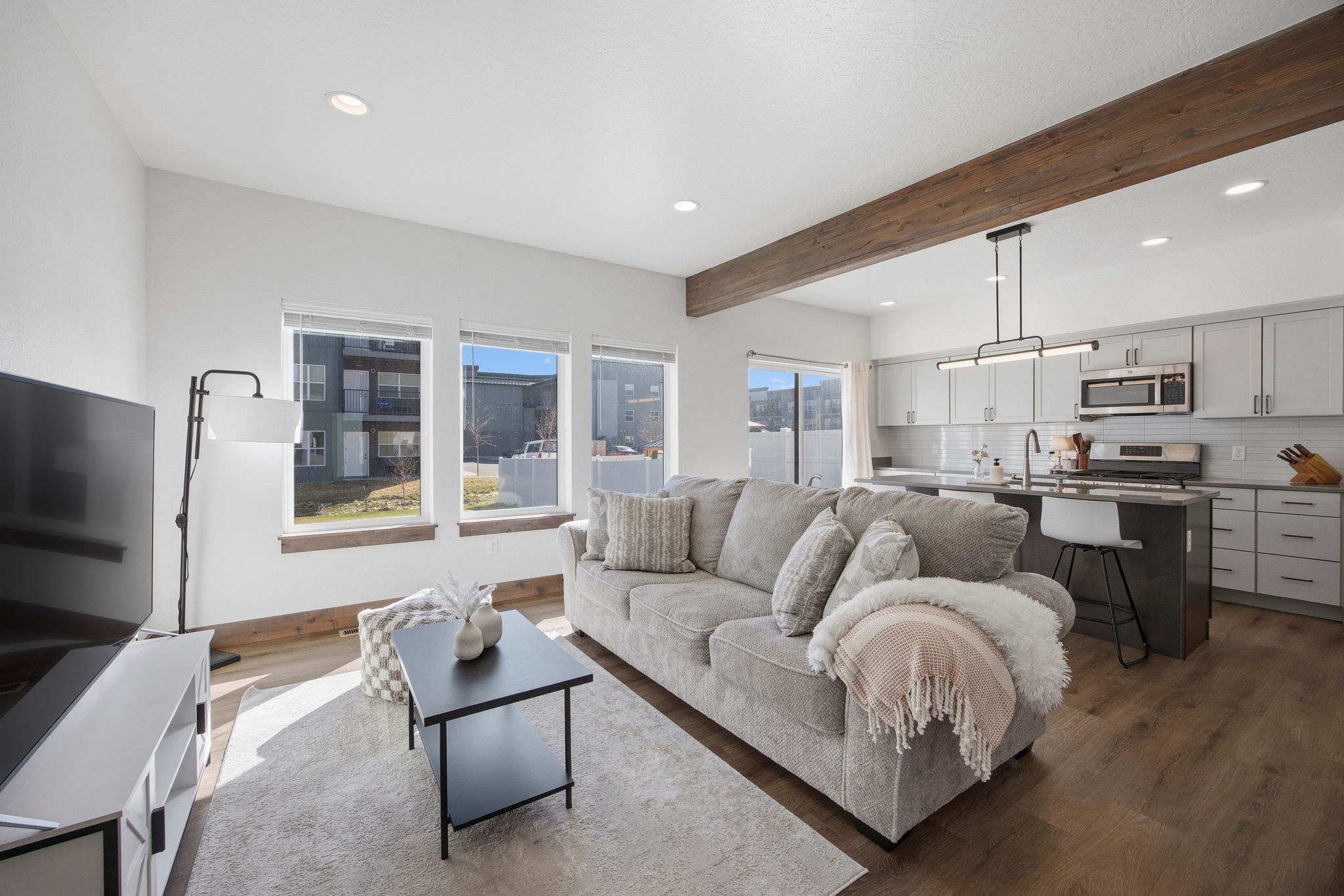 Discover contemporary living at its finest in this 2024 townhome by Beauchamp Construction, in the Hellgate Elementary School District. This residence represents the pinnacle of warm modern design that is sophisticated, functional, and most importantly, ready for immediate occupancy. The main level features tall ceilings and an open concept designed for everyday comfort. A convenient entryway closet and powder room keep guests entirely on the main floor, making hosting effortless. The kitchen stuns with its stainless steel appliances, quartz countertops, stack tile backsplash, corner pantry, and integrated refuse cabinet in the working island. The large windows flood the space with natural light and offer access to the East-facing patio that overlooks the landscaped, irrigated backyard. Upstairs, the home reveals its thoughtful layout with two additional spacious bedrooms, a full bathroom, large linen closet, and dedicated laundry room with storage to maximize functionality. Down the hallway is the primary suite that offers an element of privacy and is complemented by a walk-in closet with built-in organization and features an ensuite with dual-sink quartz vanity, spacious shower, and Moen brushed nickel fixtures. Additional amenities include an attached heated garage, climate control with Ecobee technology, Ring doorbell, alder trim and luxury vinyl plank flooring throughout along with peace of mind with a transferrable warranty through December 2034. No need to wait, secure your key to Remington Flats today!